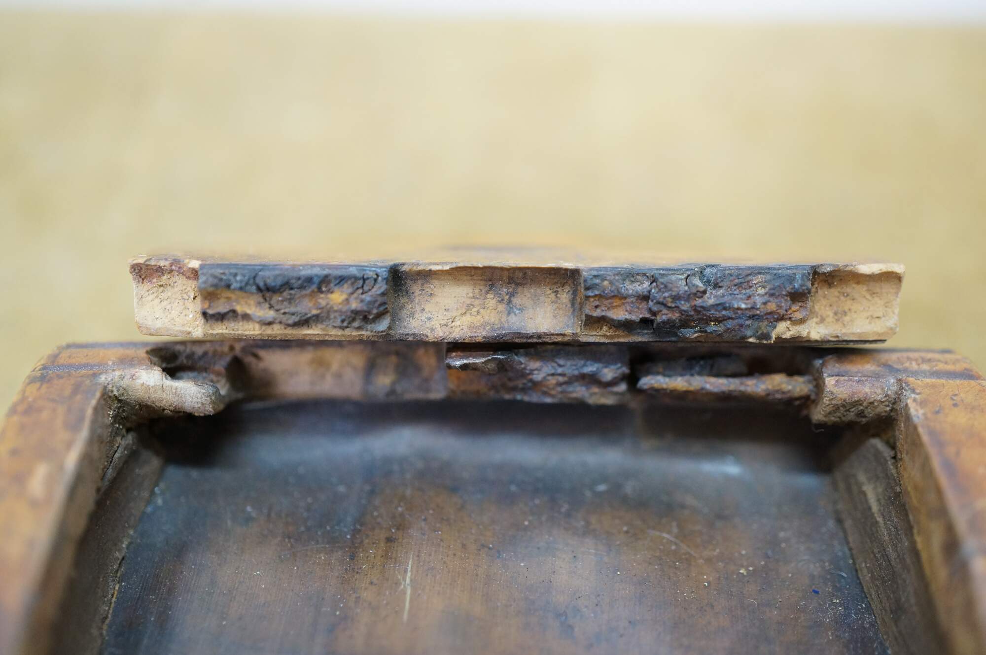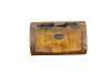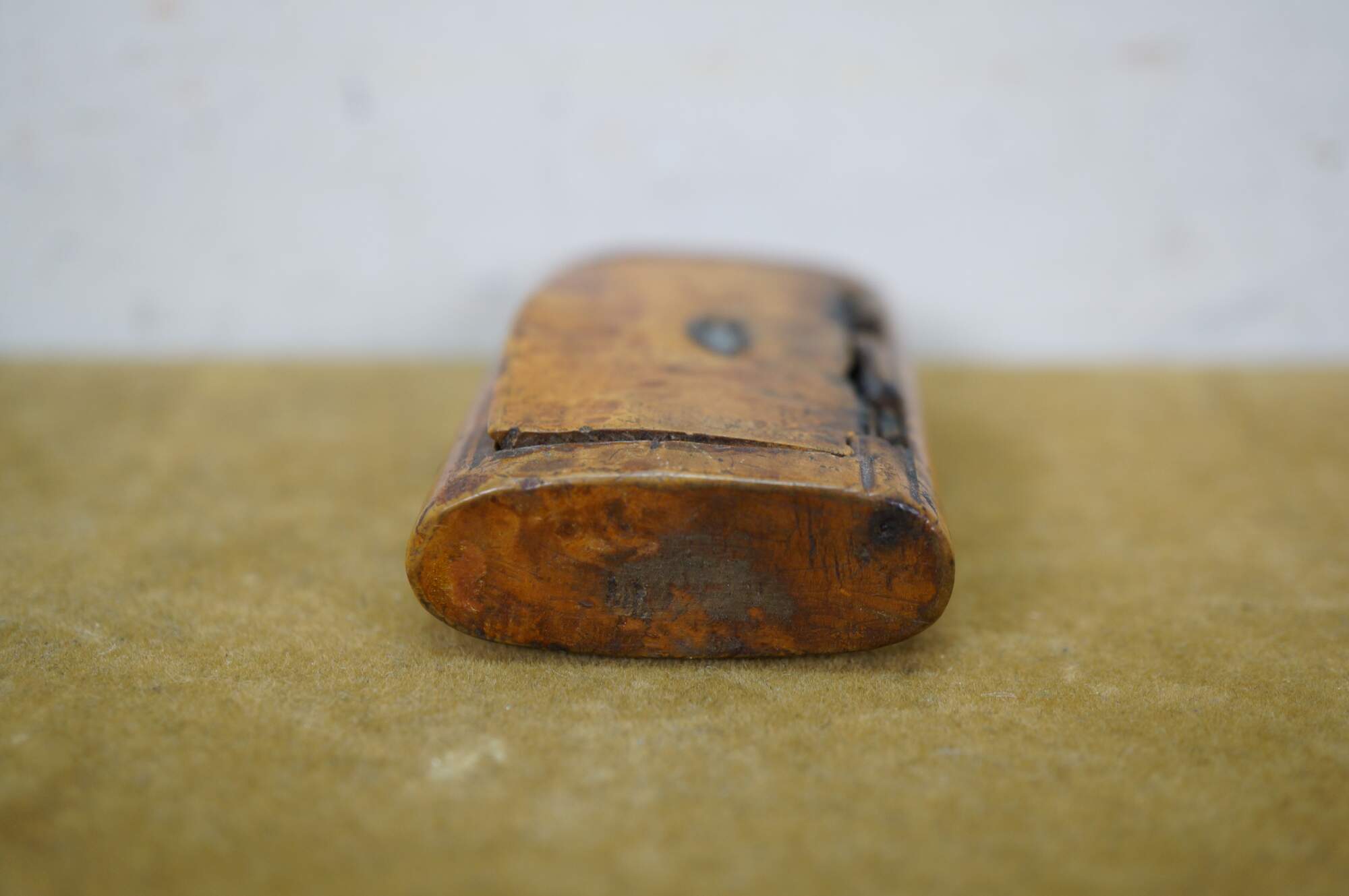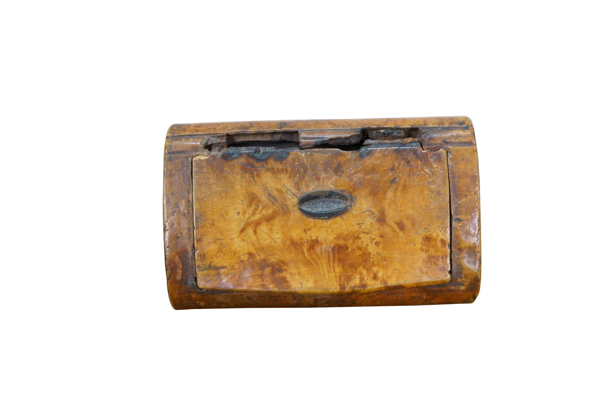 Circa 19th century burl wood snuff box. Small rectangular shape with slightly domed, flip top lid, inlaid with an almond / oval shape resembling a coffee bean.