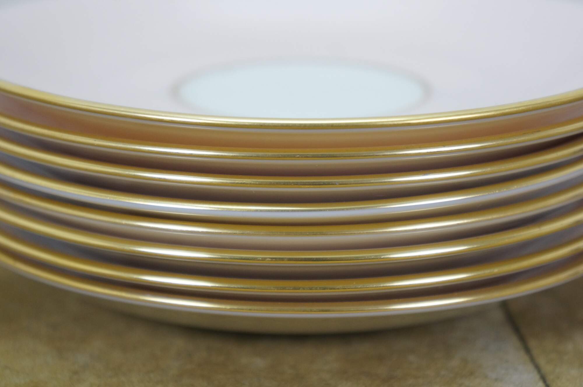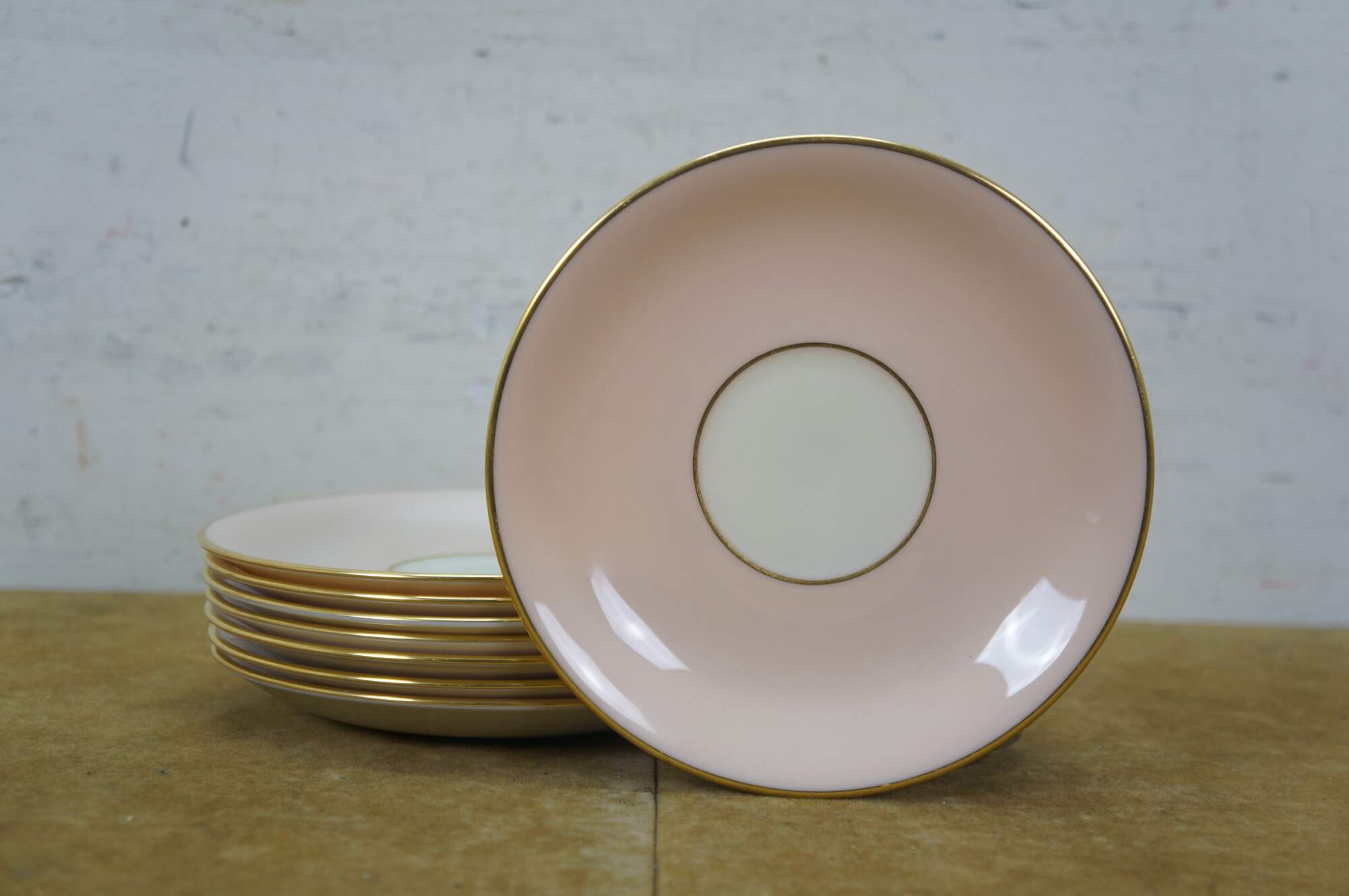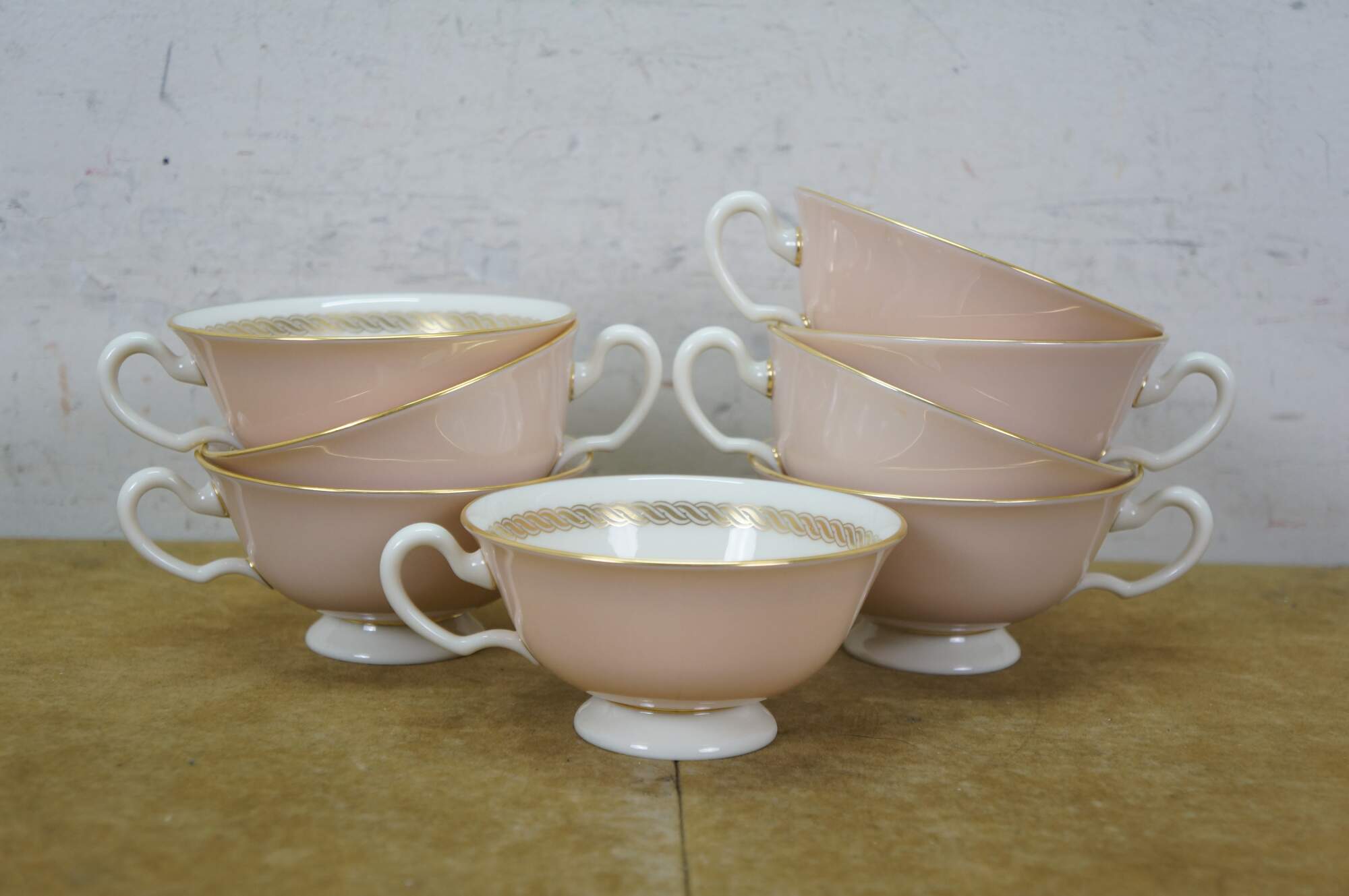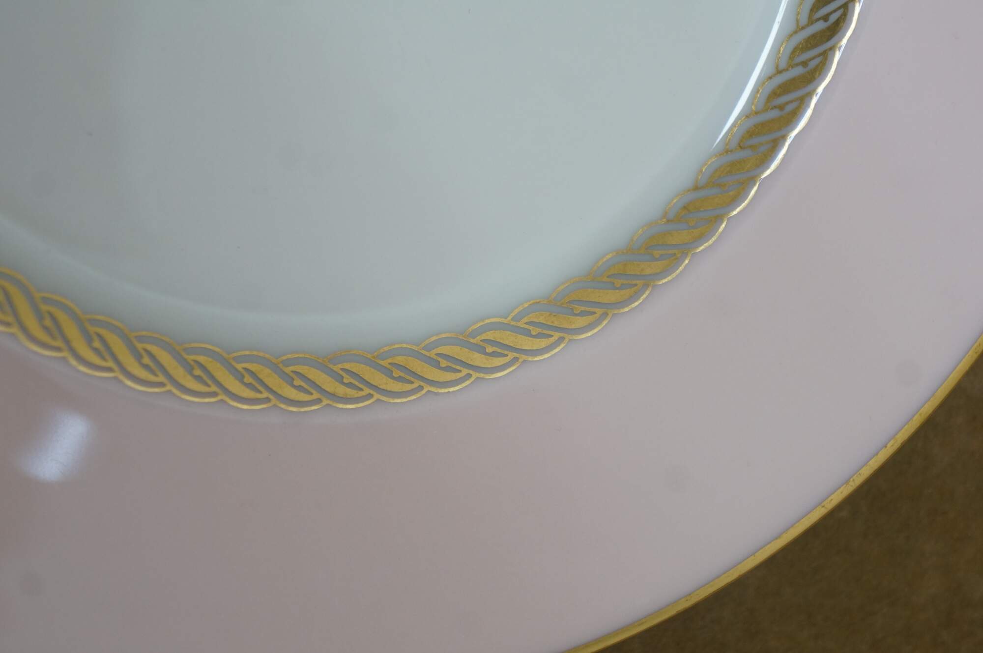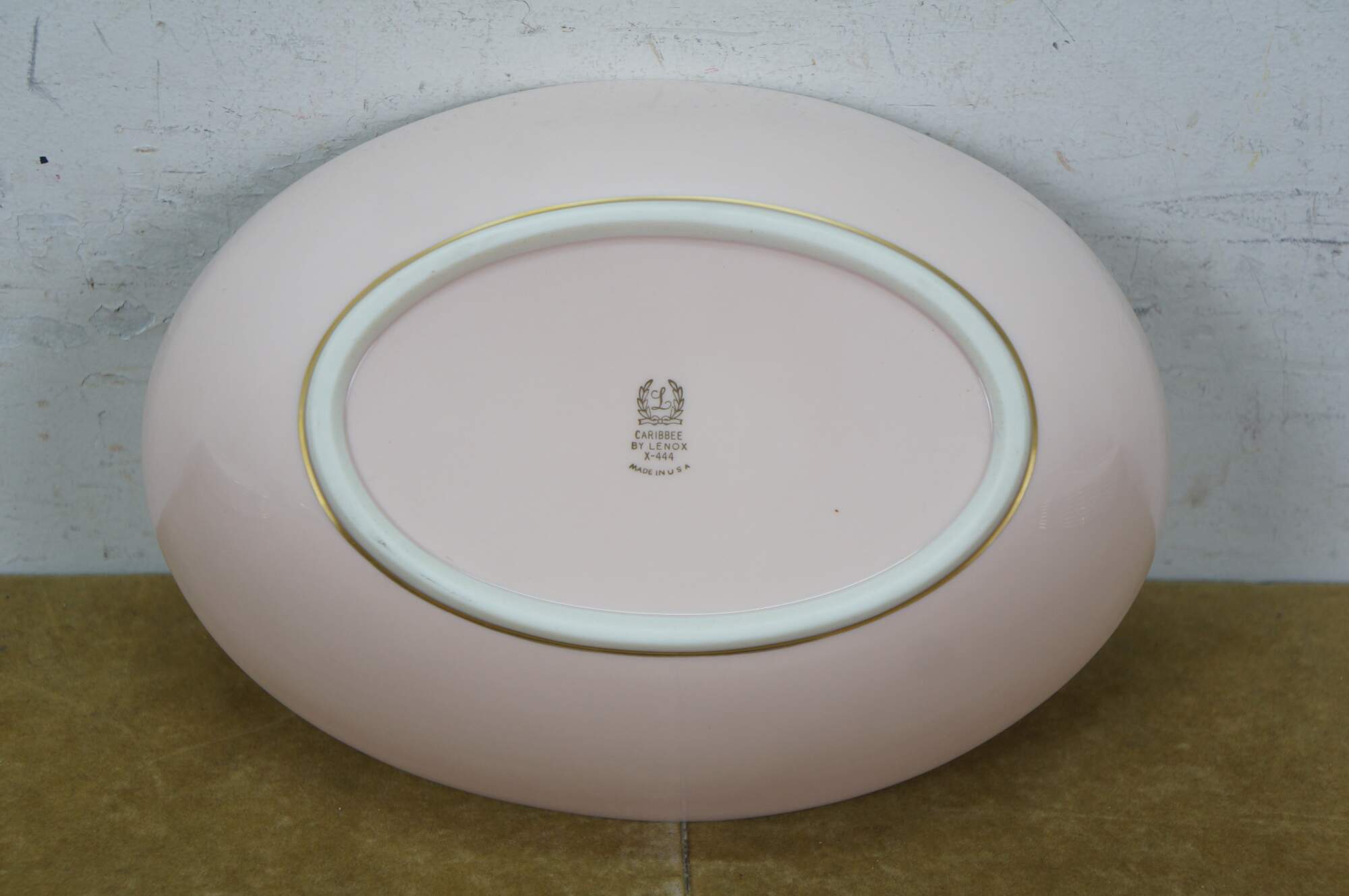 33 pieces of Caribbee by Lenox, number X-444 porcelain dinnerware. Includes: Oval Serving Dish, 8 Dessert / Salad Plates, 8 Bread Plates, 8 Saucers, 8 Teacups. White and shell pink with gilt rope twist details. Service for 8.