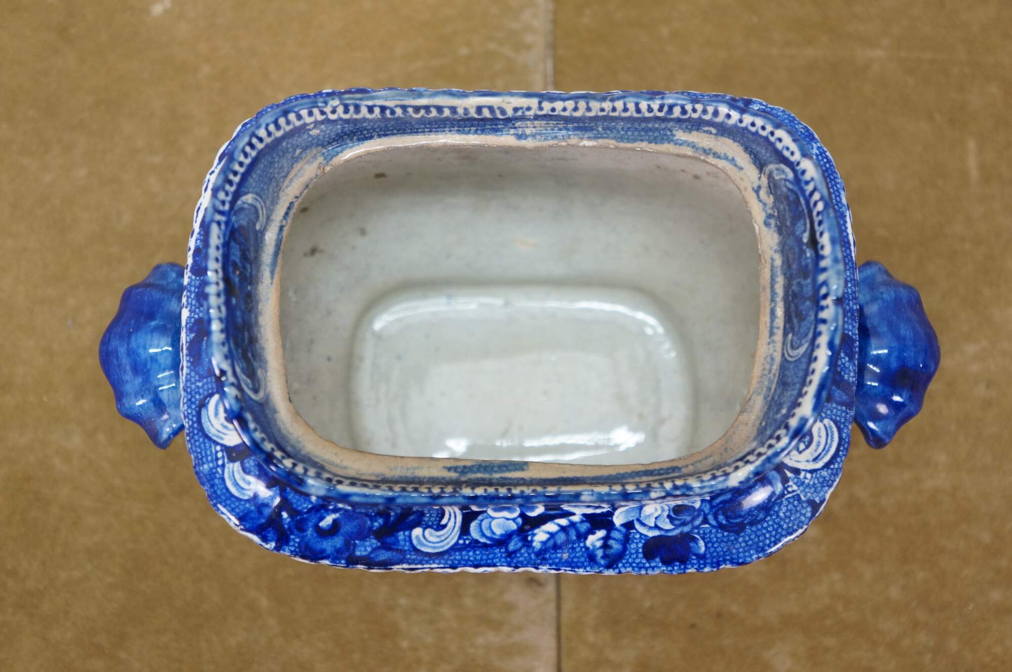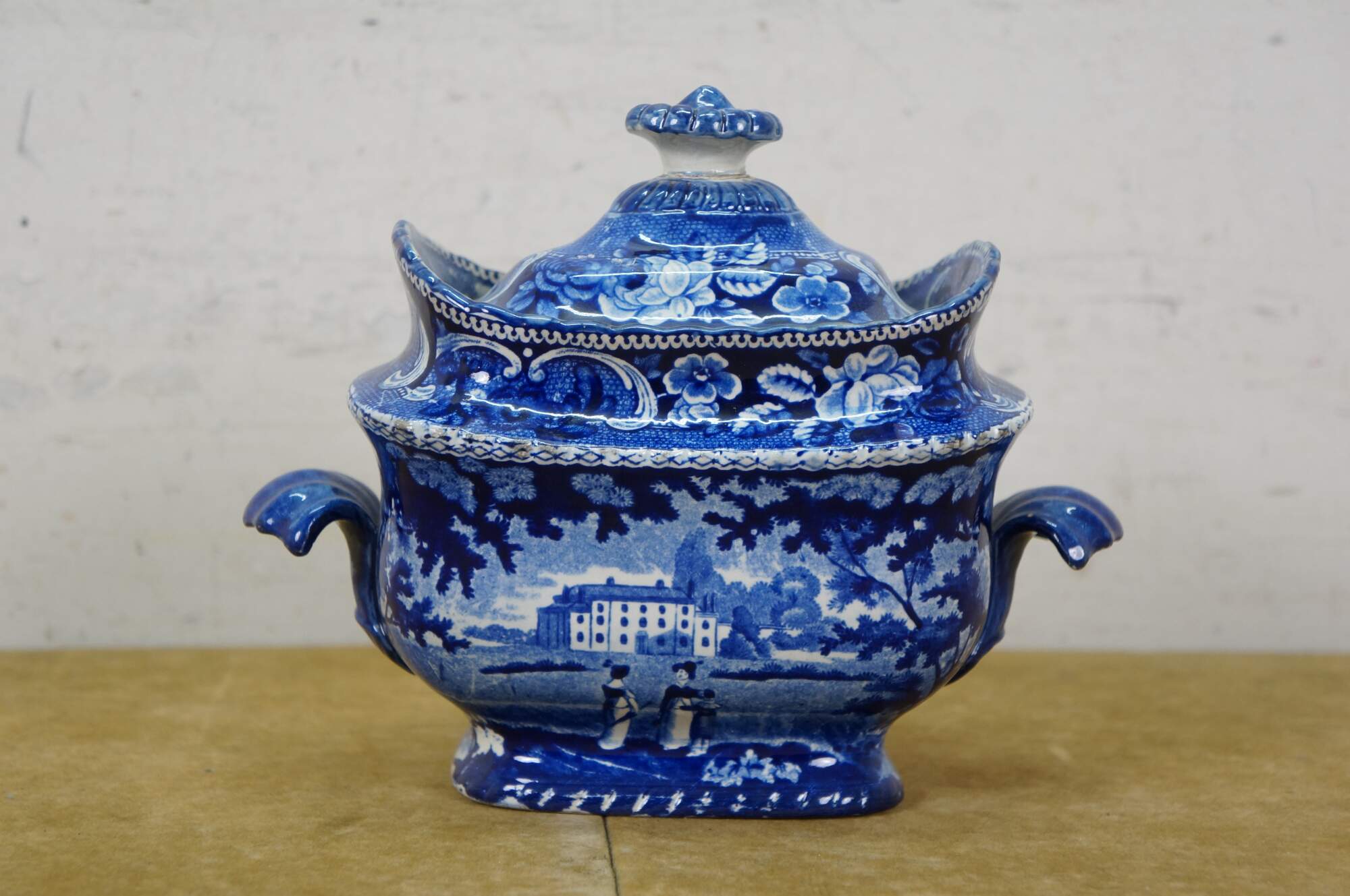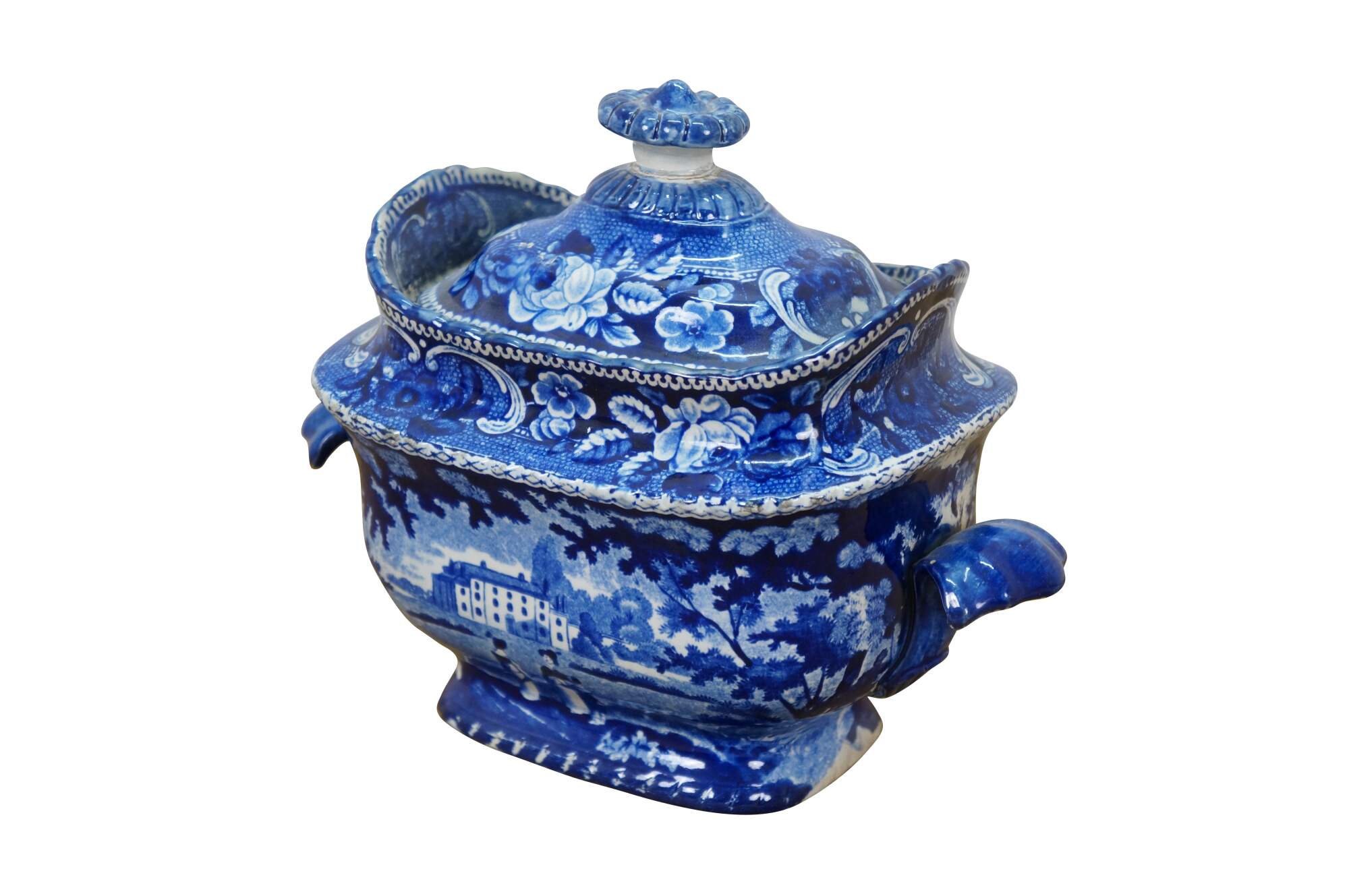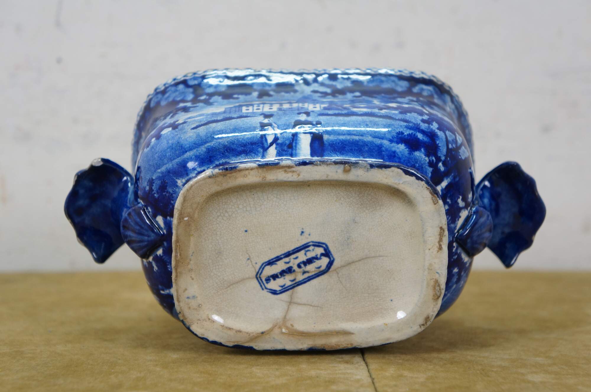 19th century flow blue and white ironstone china sugar bowl / tureen with lid. Chinoiserie inspired rectangular shape with flower shaped finial and leaf shaped handles, featuring floral and foliate designs and a landscape with manor house and figures in Regency era clothing on the sides. Marked Stone China on base.