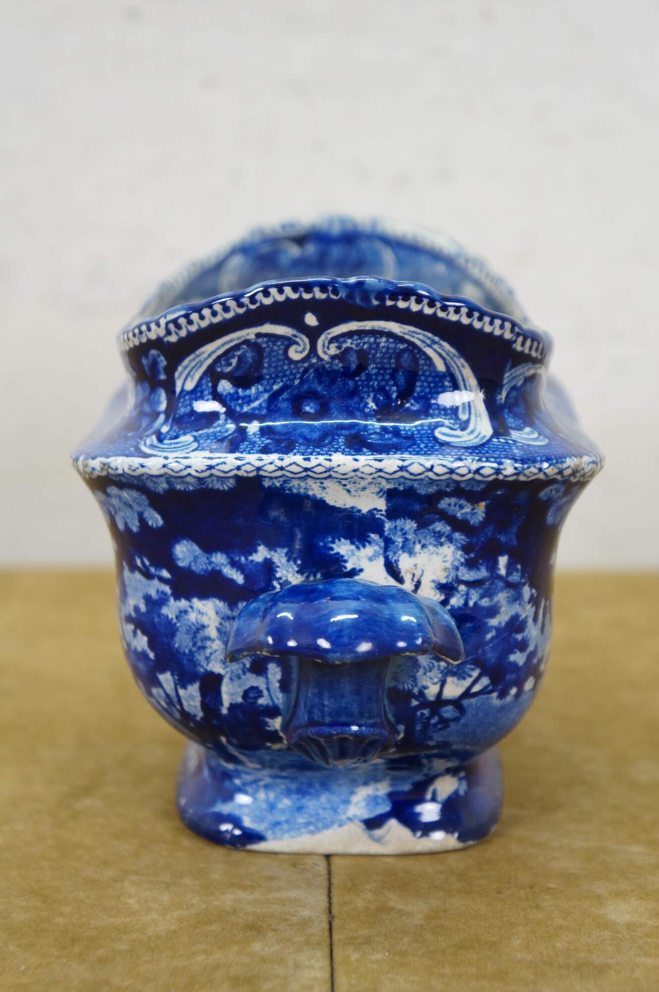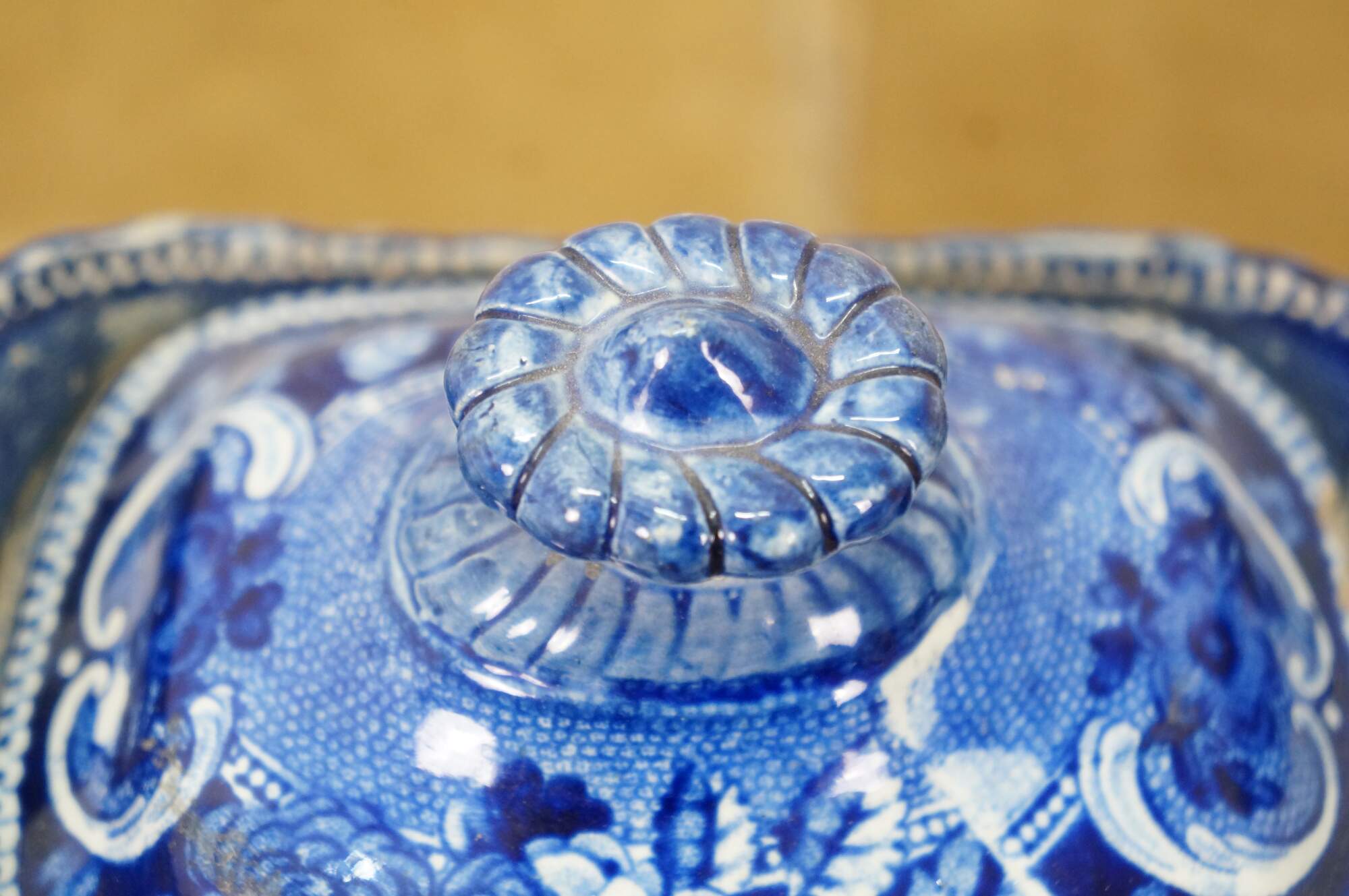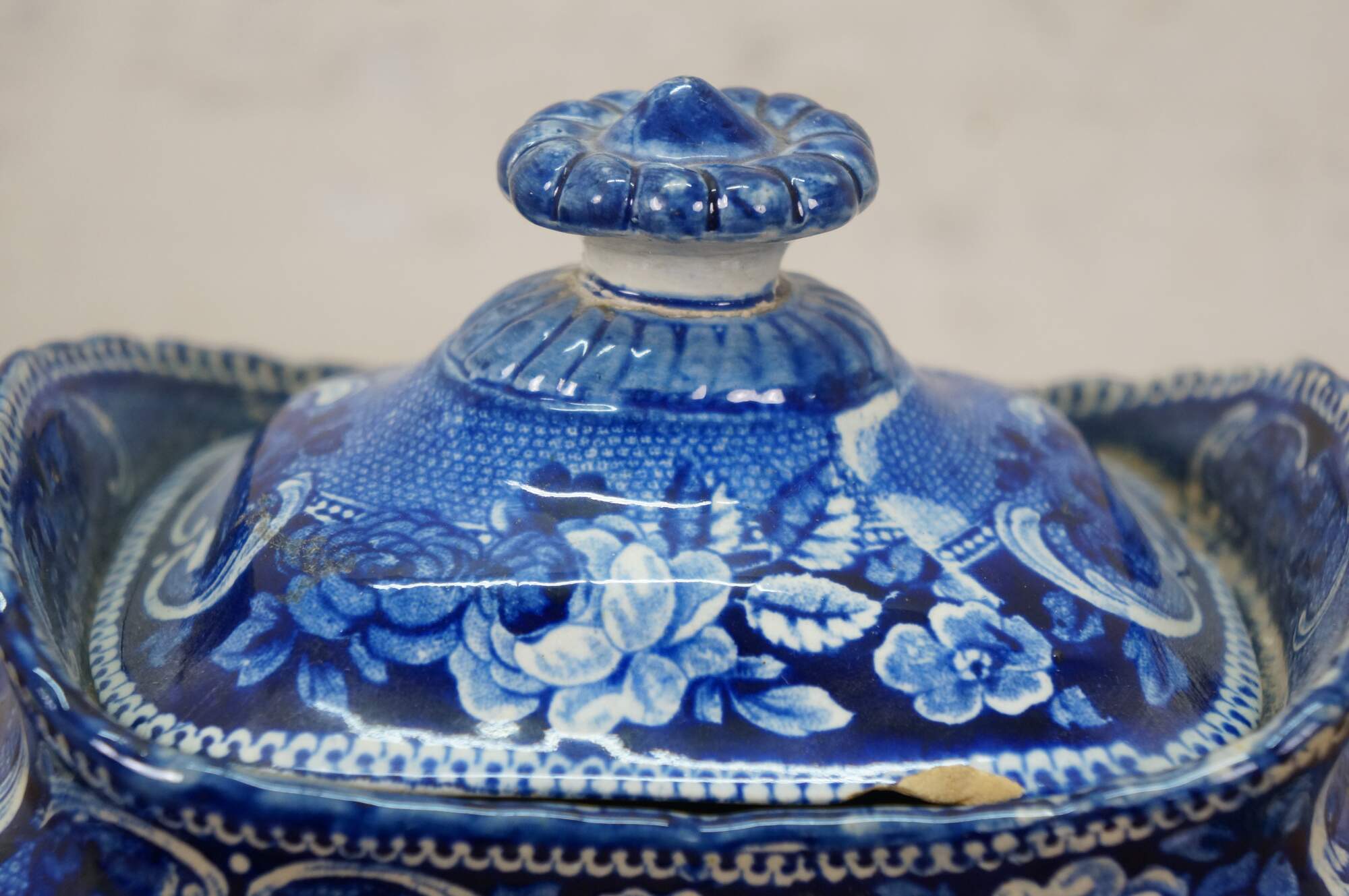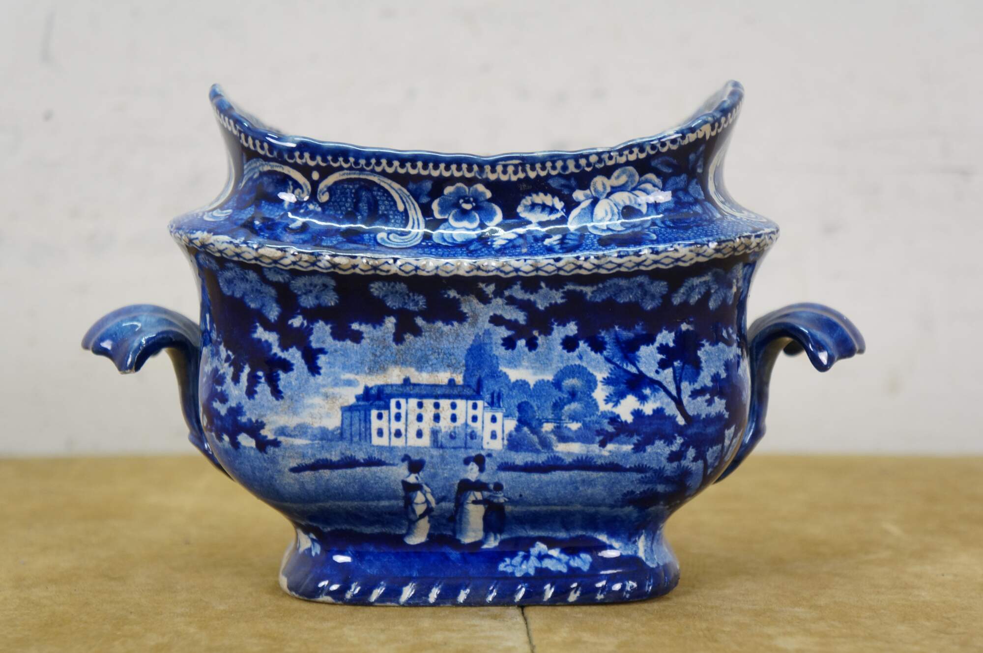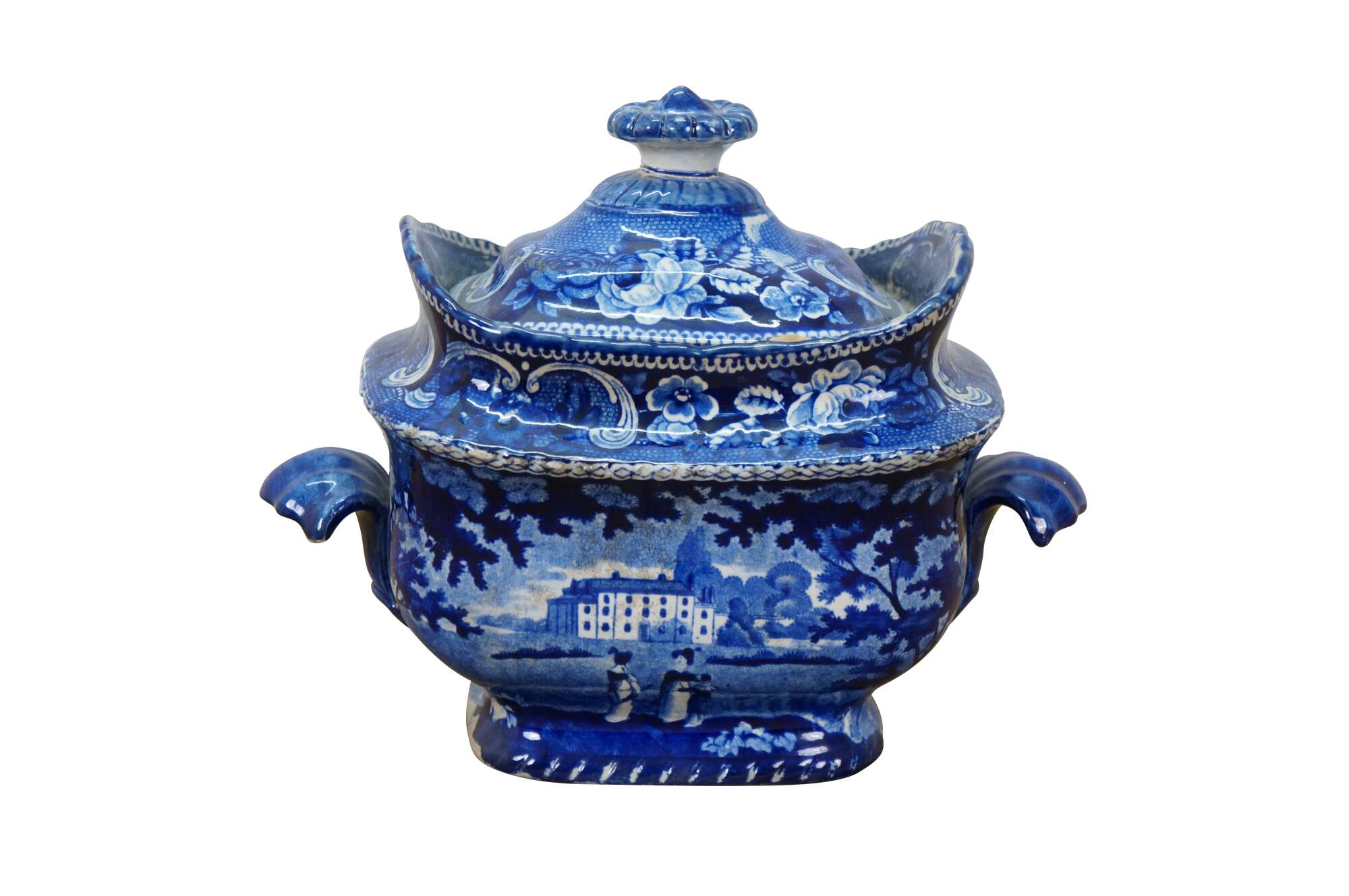 19th century flow blue and white ironstone china sugar bowl / tureen with lid. Chinoiserie inspired rectangular shape with flower shaped finial and leaf shaped handles, featuring floral and foliate designs and a landscape with manor house and figures in Regency era clothing on the sides. Marked Stone China on base.