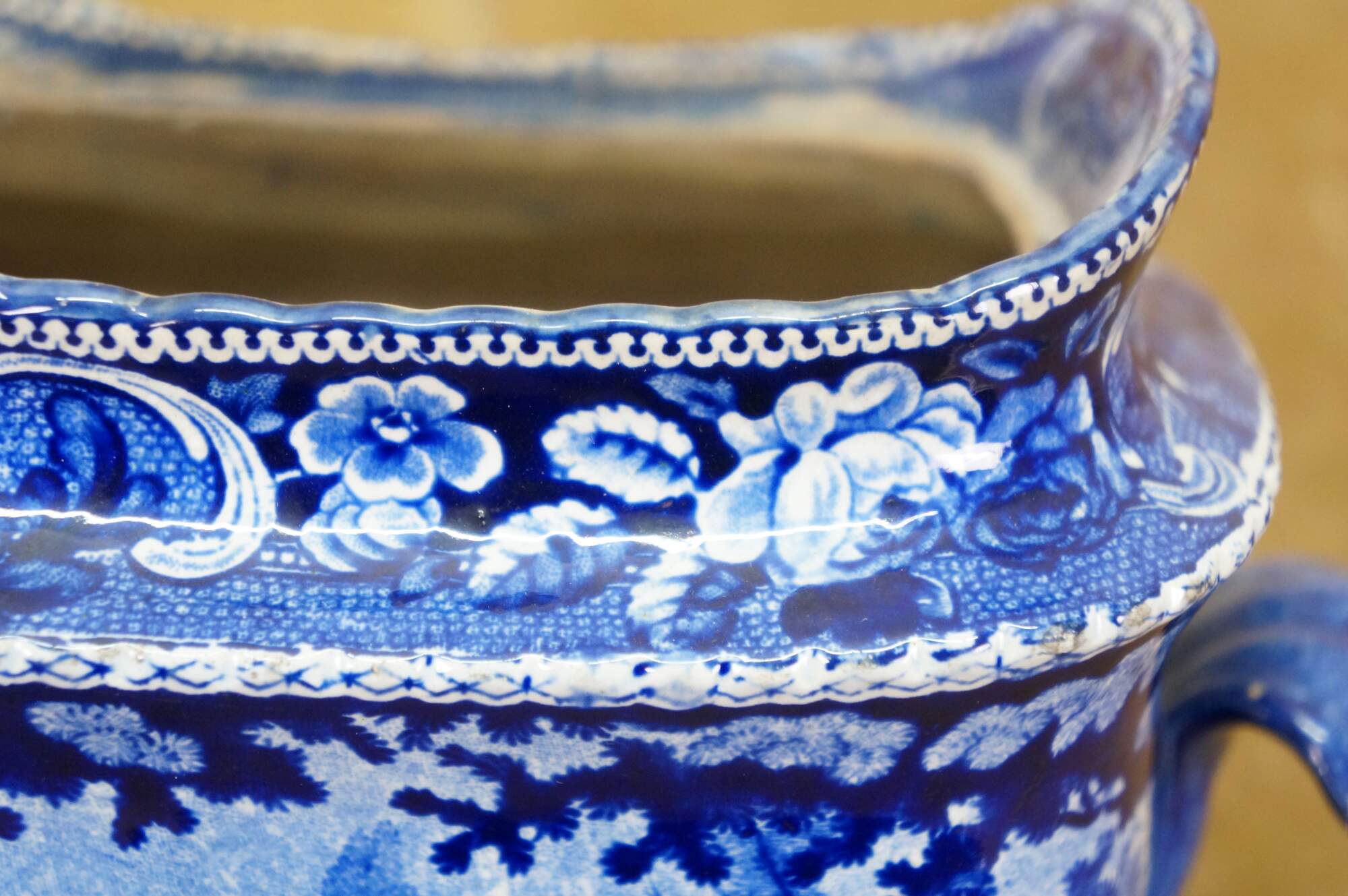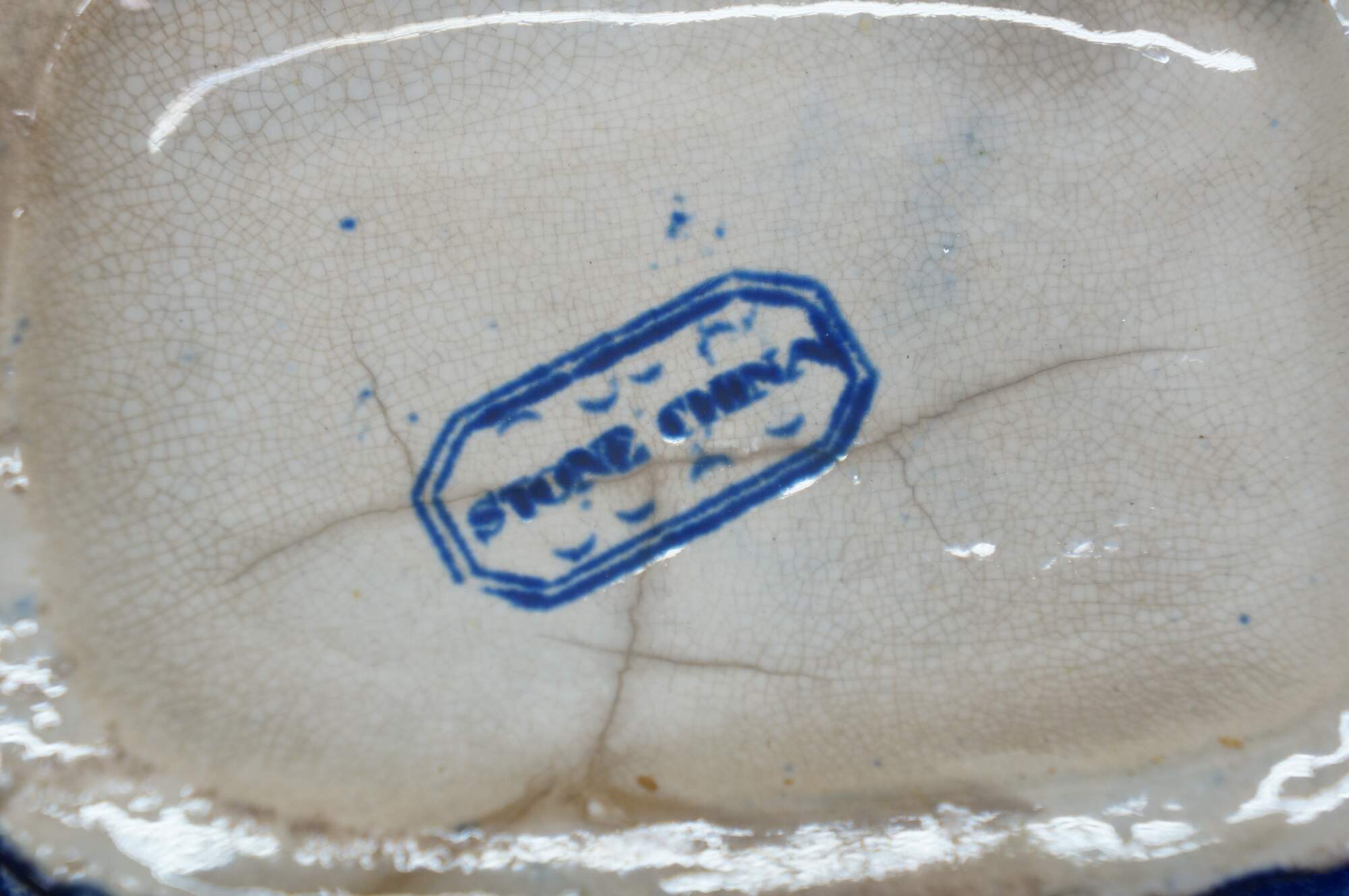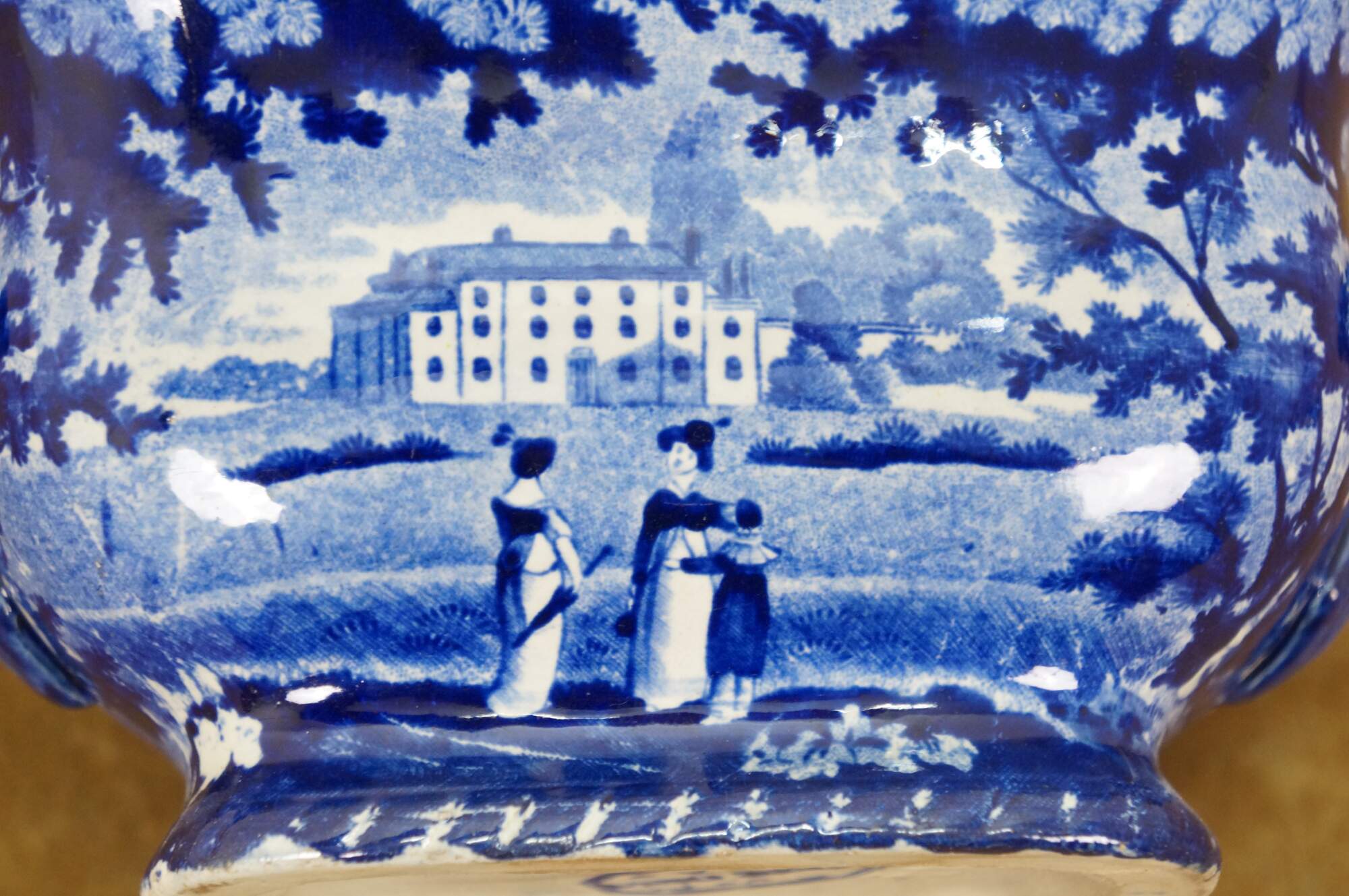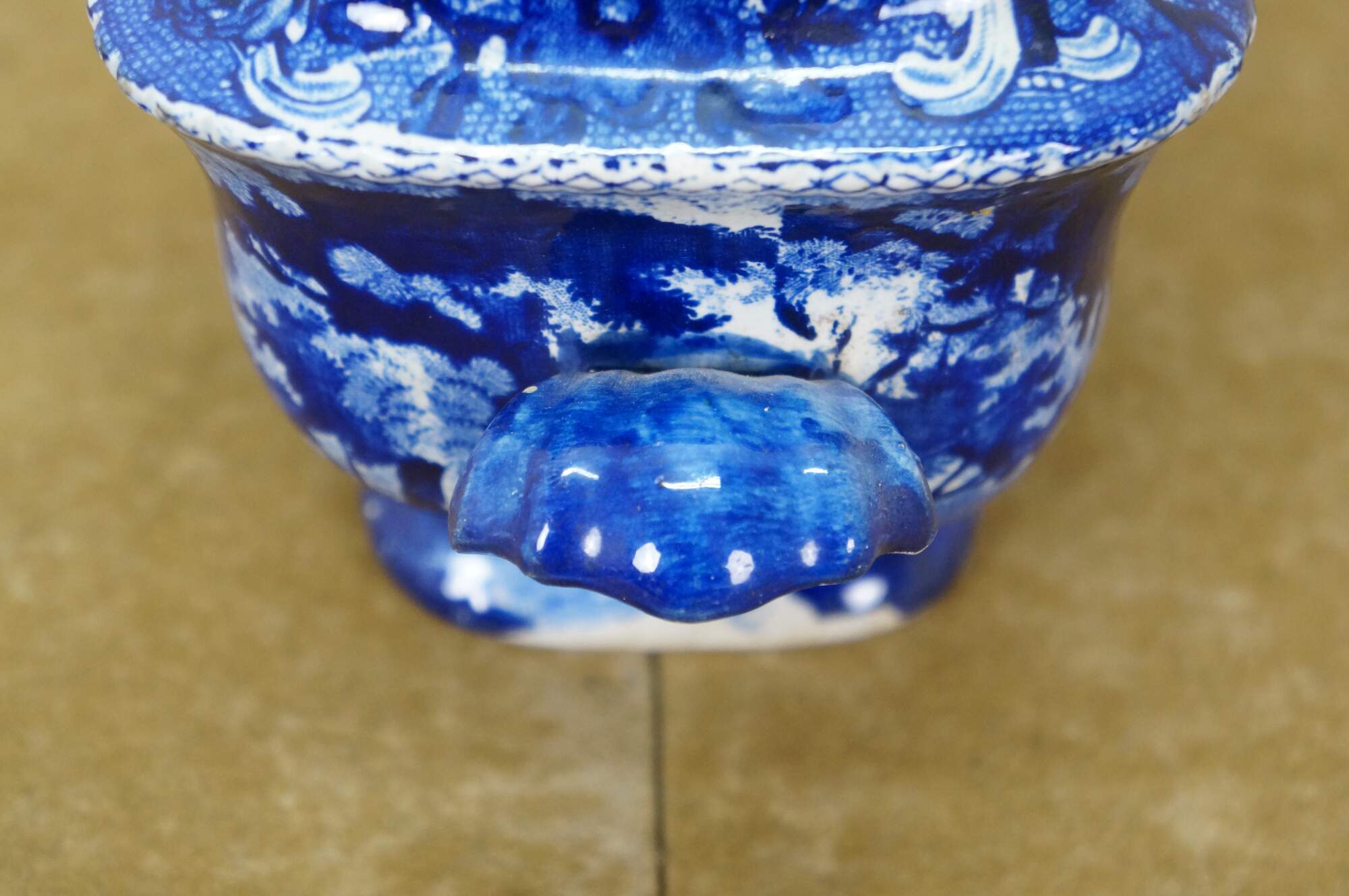 19th century flow blue and white ironstone china sugar bowl / tureen with lid. Chinoiserie inspired rectangular shape with flower shaped finial and leaf shaped handles, featuring floral and foliate designs and a landscape with manor house and figures in Regency era clothing on the sides. Marked Stone China on base.