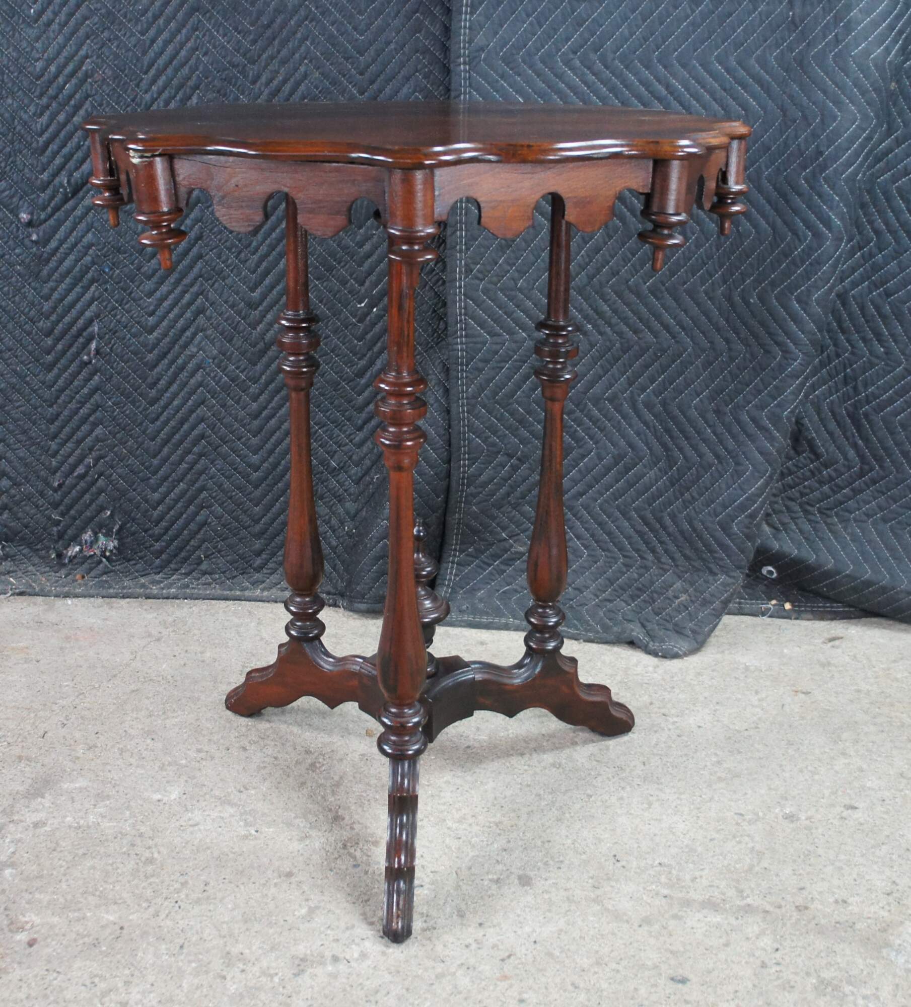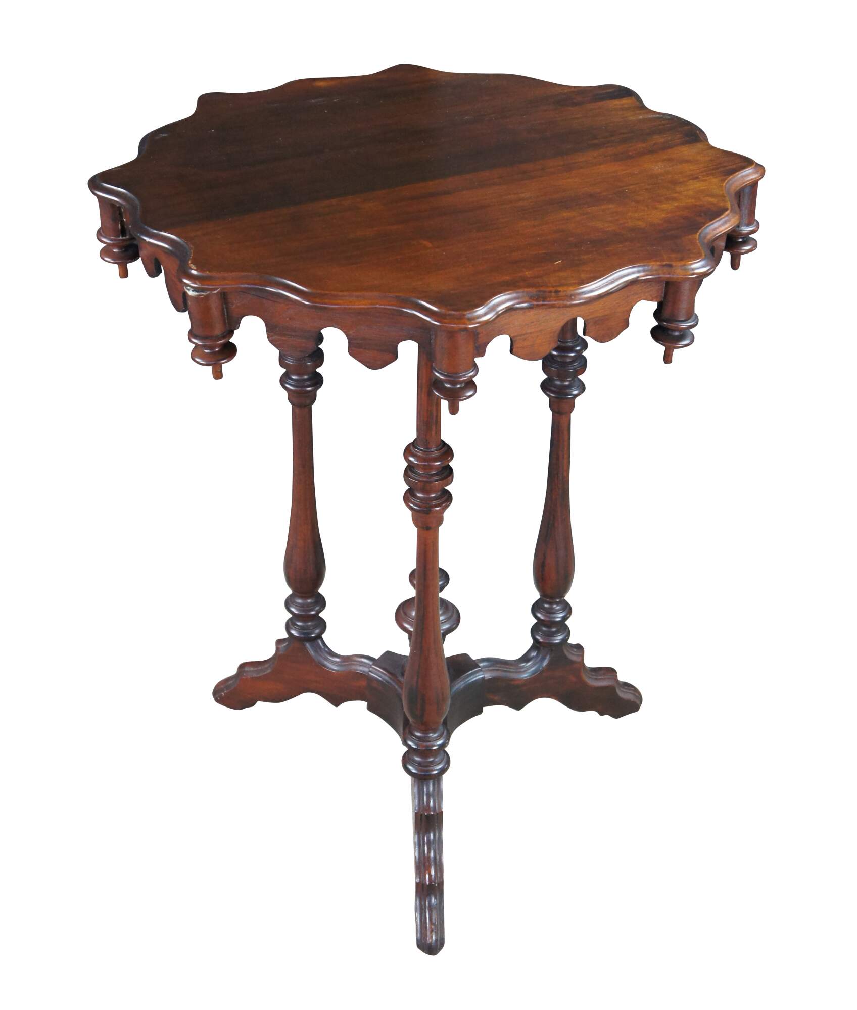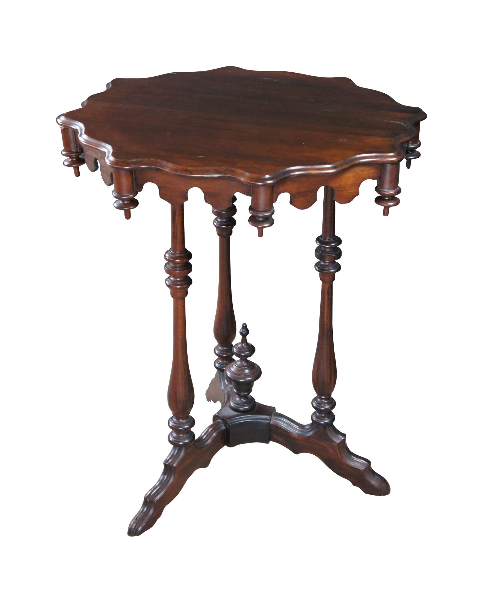 Antique Victorian Gothic Revival style pedestal table. Made of walnut featuring scalloped form with turned supports, trophy shaped drop finials and pedestal base.