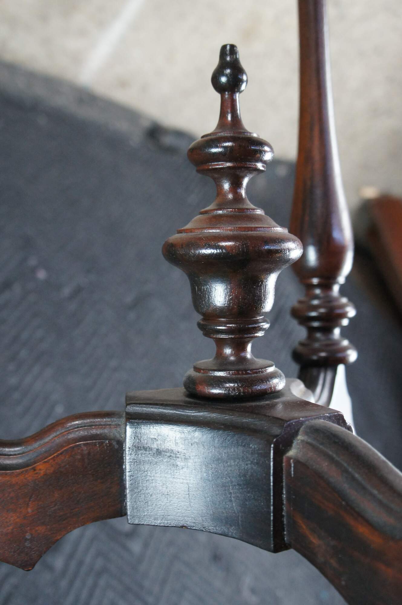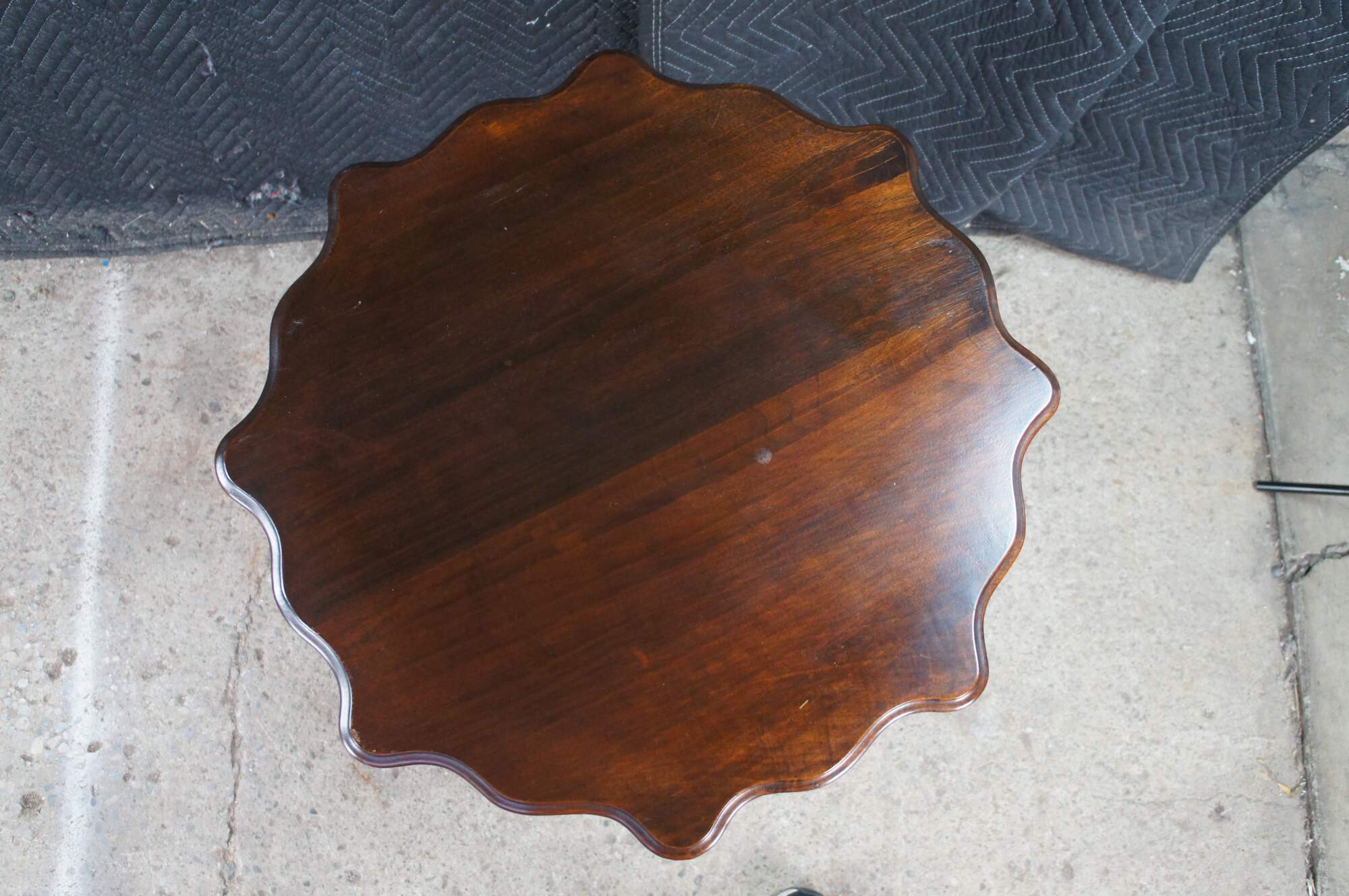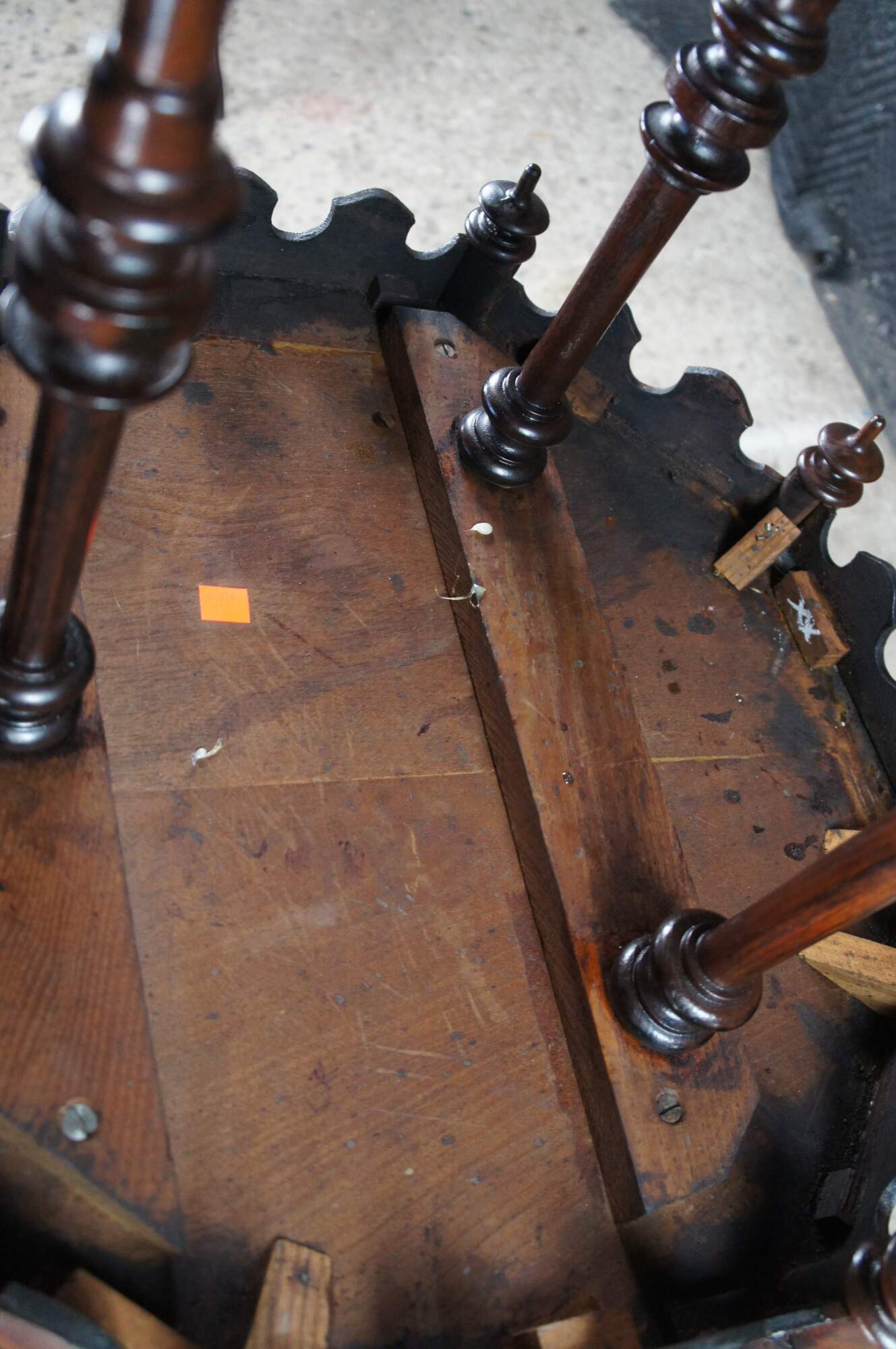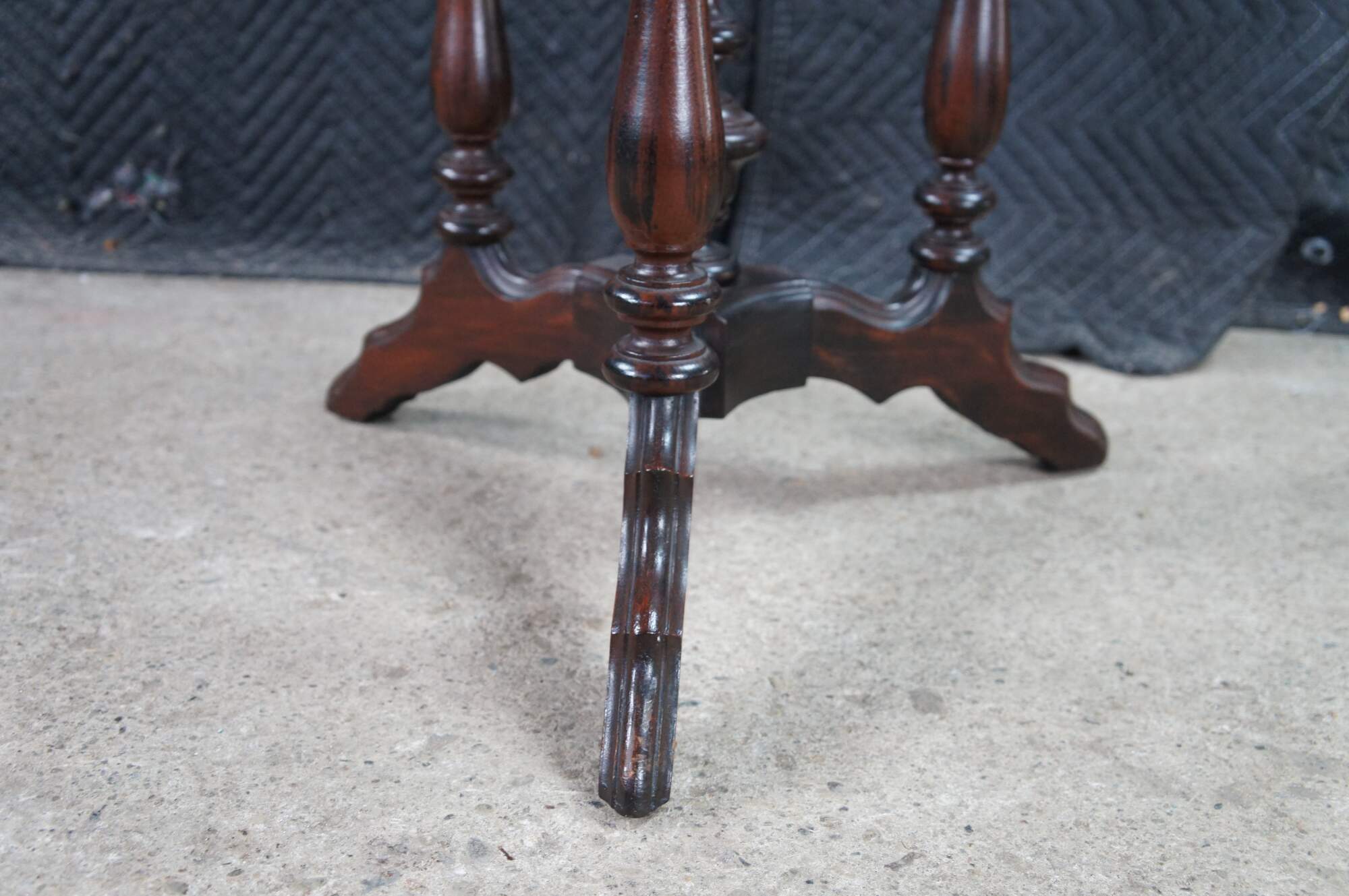 Antique Victorian Gothic Revival style pedestal table. Made of walnut featuring scalloped form with turned supports, trophy shaped drop finials and pedestal base.