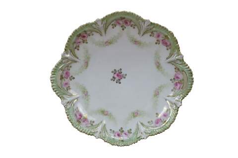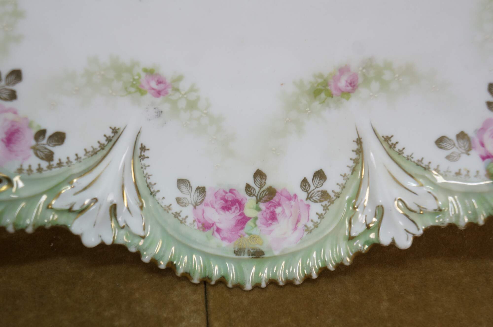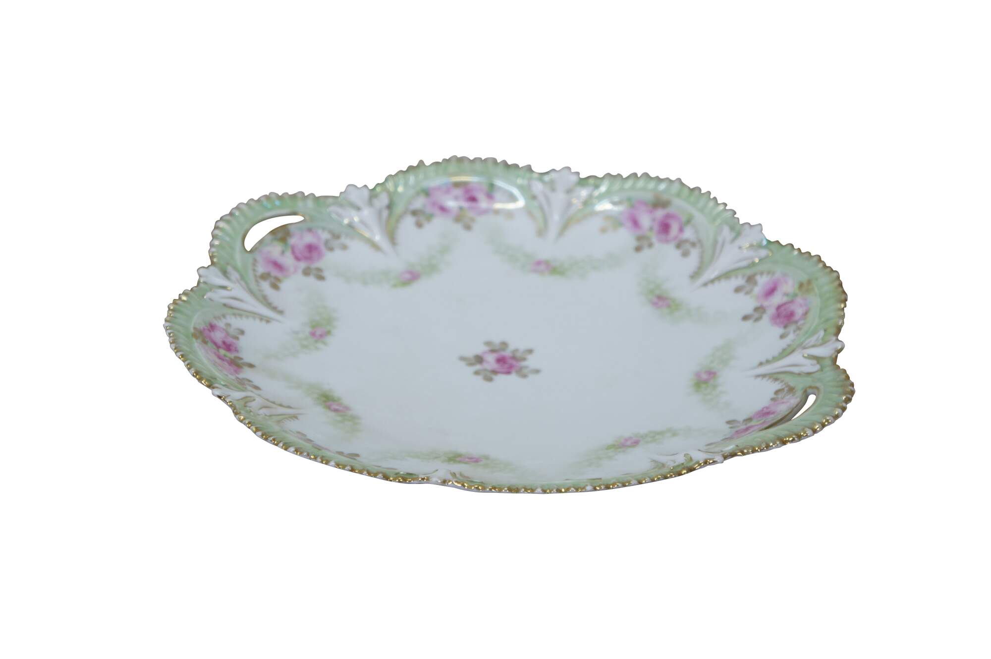 Late 19th to early 20th century porcelain serving plate / dish by RS Prussia. Round scalloped edge platter with two pierced handles, decorated with a soft green edge and swags of pink roses trimmed with gilt.