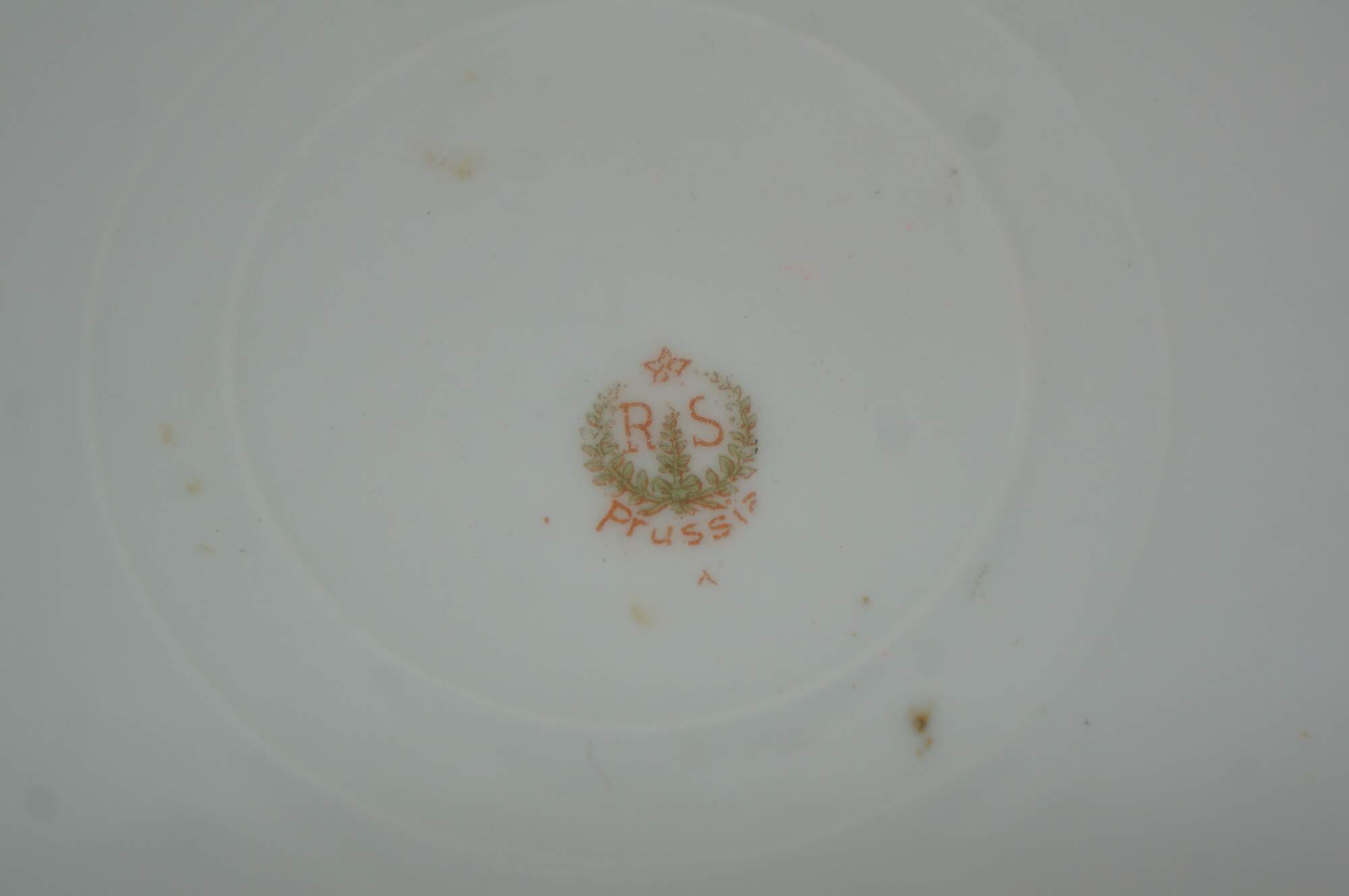 "RS Prussia was founded in 1896 by Reinhold Schlegelmilch, and later co-owned with his two sons, Ehrhard and Arnold. (Between 1861 and 1882 there were three porcelain factories started in the city of Suhl (in what is today Germany, then Prussia) by persons with the last name Schlegelmilch. Erdmann S. in 1861; Reinhold S. in 1869 and Carl S. in 1882. Until recently, it was thought all the Schlegelmilchs were family related. They were not.) From the time of founding up to 1892, it appears that little porcelain was exported to America from Reinhold's factory. Objects in several mold patterns used between 1889 and 1892 are known to be marked with the RS "Arrow" mark. Beginning 1893, US wholesale firms began to import larger quantities of china tableware from Europe, and almost all was from Reinhold's factory. Arnold took over an existing porcelain factory in Tillowitz in 1894, and continued to run it as part of the Reinhold Schlegelmilch enterprise until he died in 1934. From approximately 1895-1900 that the R. S. "Wing" trademark was used. Reinhold's products from the 1900-1905 period were noted as being among the best to be made in Europe. Unfortunately, public taste began to change about 1905. By 1910, simple shapes predominate in all catalogs, wholesale and retail, and Reinhold's products were largely replaced by china from both Japan and other European firms. Reinhold's products made after 1910 are frequently referred to as R. S. Germany, owing to a change in trademark. When the hostilities of WWI began in earnest, the Suhl factory was effectively shut down, owing to a lack of skilled labor. The manufacture of porcelain in Tillowitz continued through WWII. Although the plant survived undamaged, much of the equipment used to make porcelain was removed upon Russian occupation. Today, the factory still stands, but the major product is china dinnerware." (Source: RS Prussia / Real or Repro / Kovels)