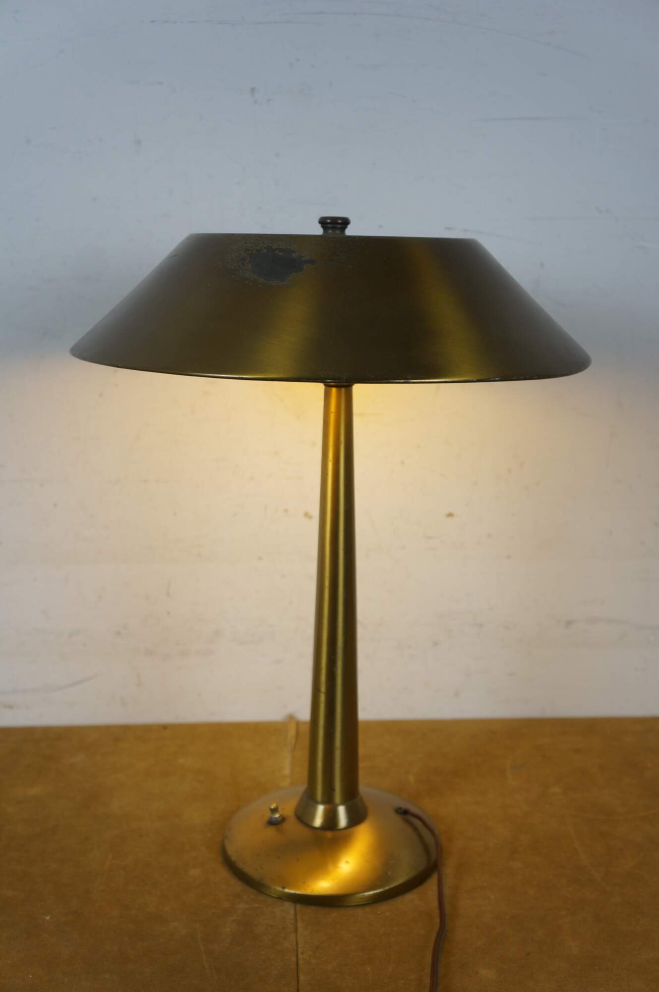 Mid 20th century brushed brass two light table / desk lamp featuring sleek, classic mid century modern styling with round base and tapered column leading up to a flat topped mushroom cap / UFO shaped brass shade.