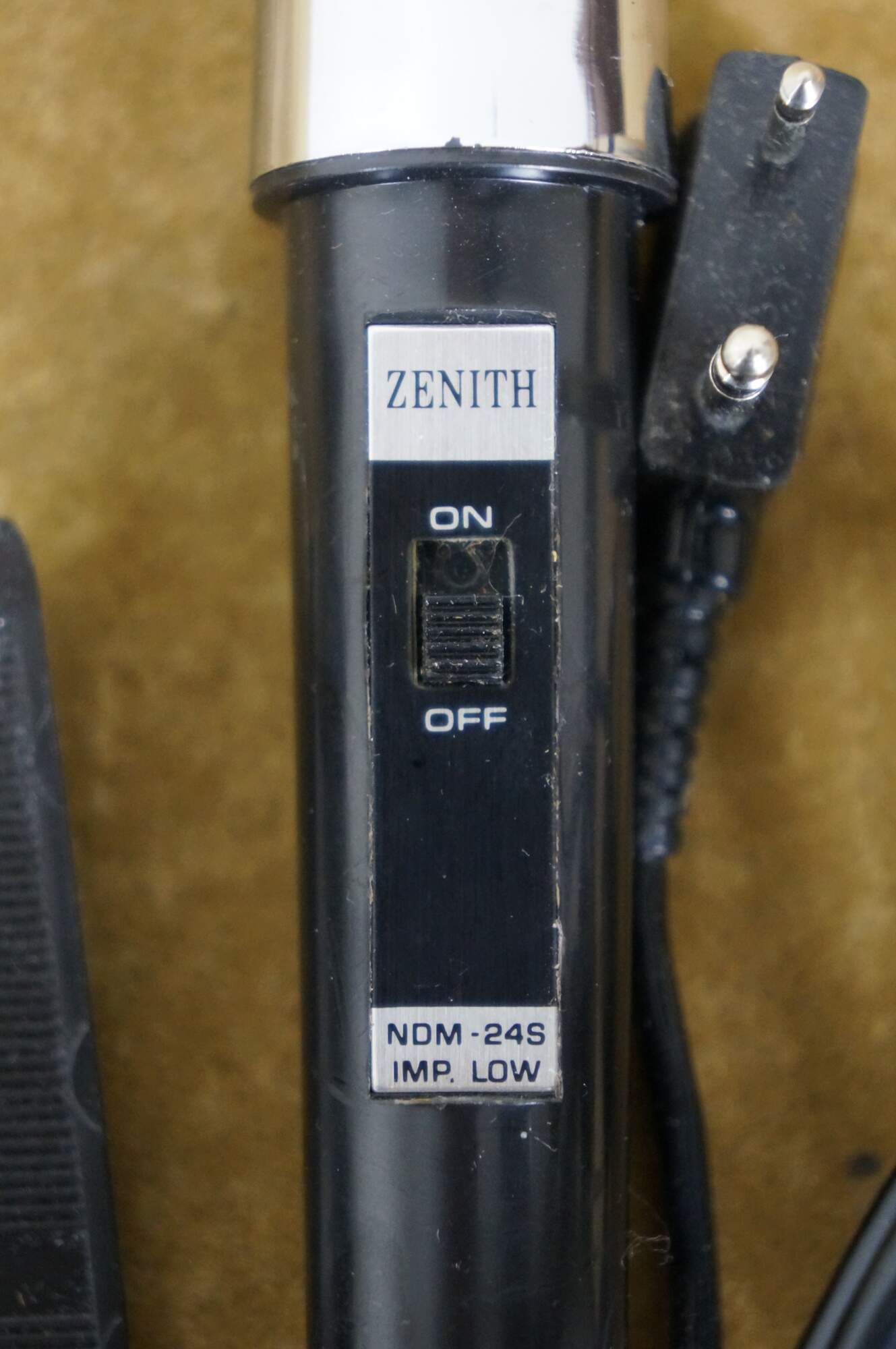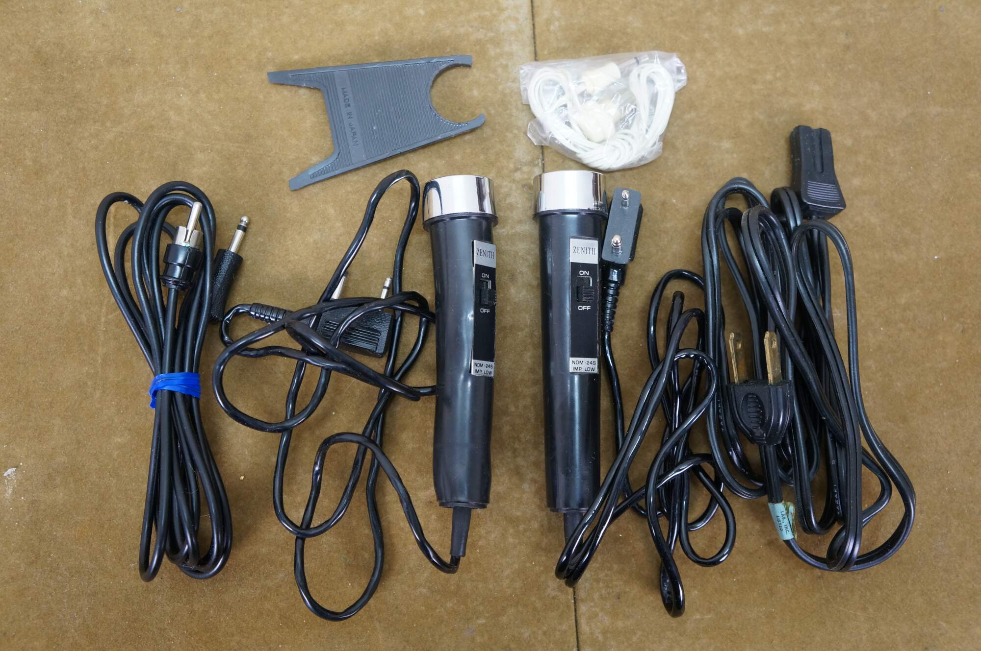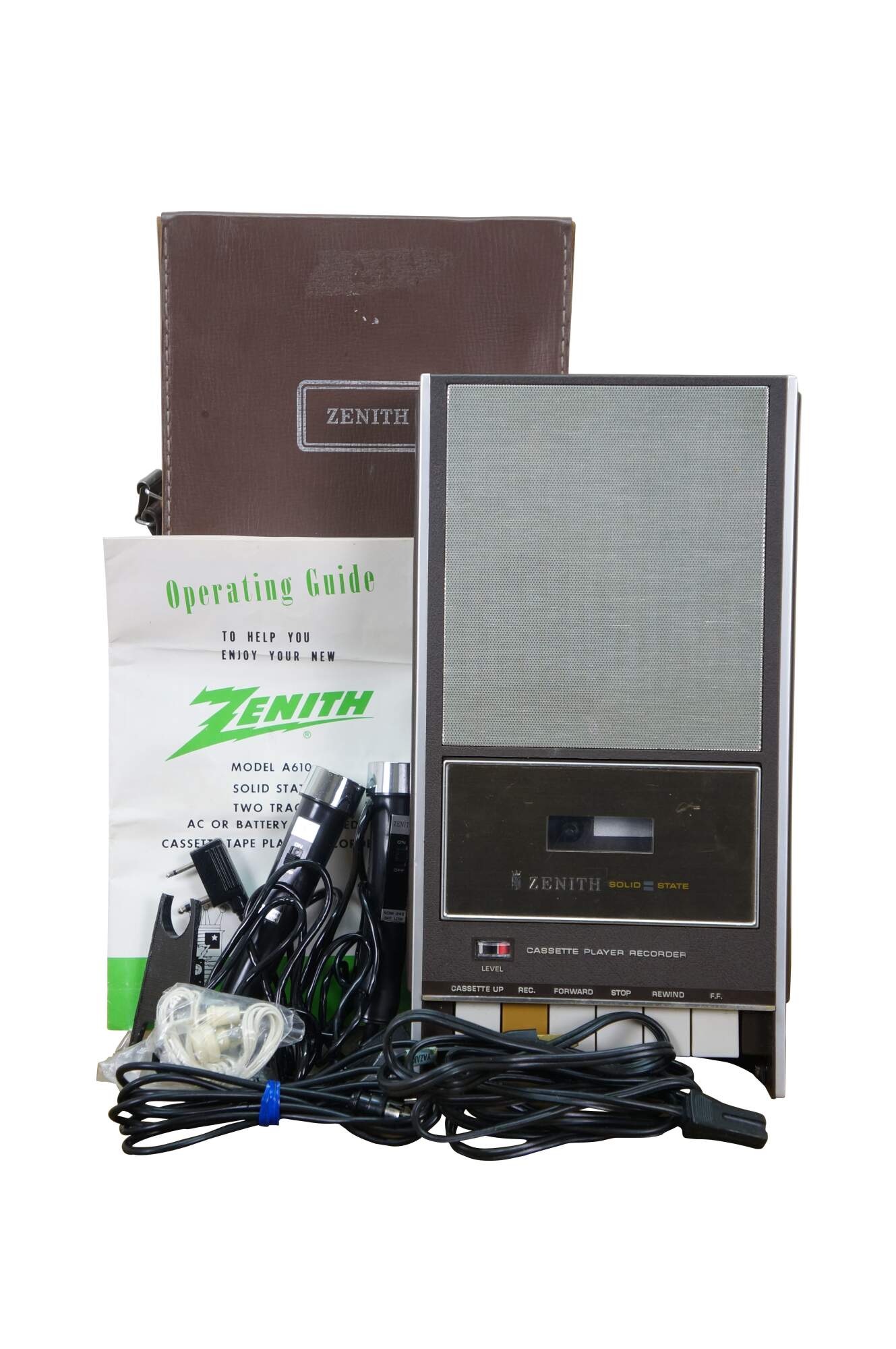 Vintage 20th century Zenith Model A-610J Solid State Two Track AC or Battery Operated (4 D Cell) Cassette Tape Player / Recorder. DC6v 400mA AC 120V 60Hz 50mA. Includes brown leather case, 2 Zenith NDM-24S Imp. Low microphones, microphone stand, ear bud, power cable, auxiliary cable, and Operating Guide.
