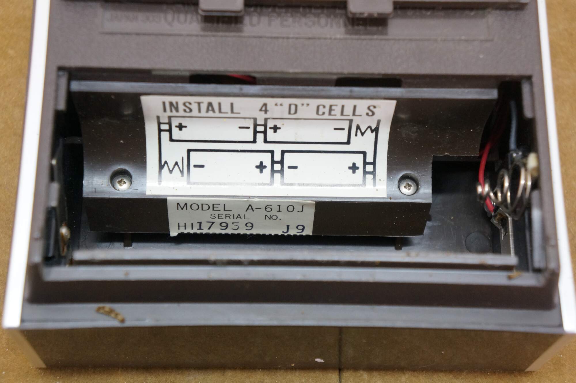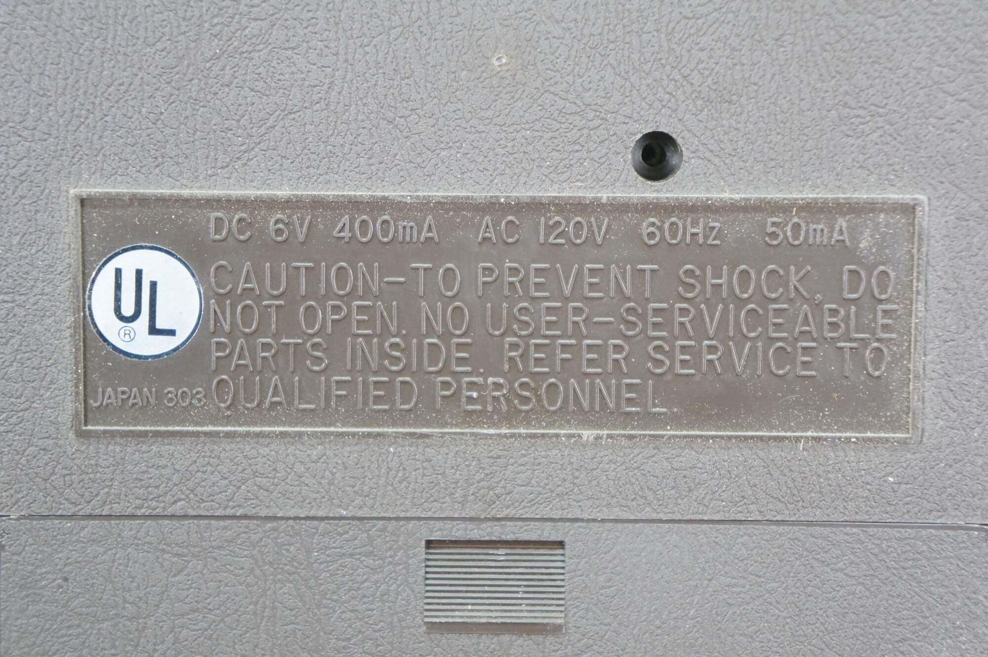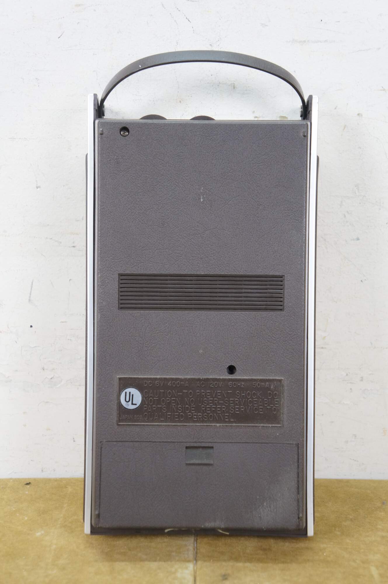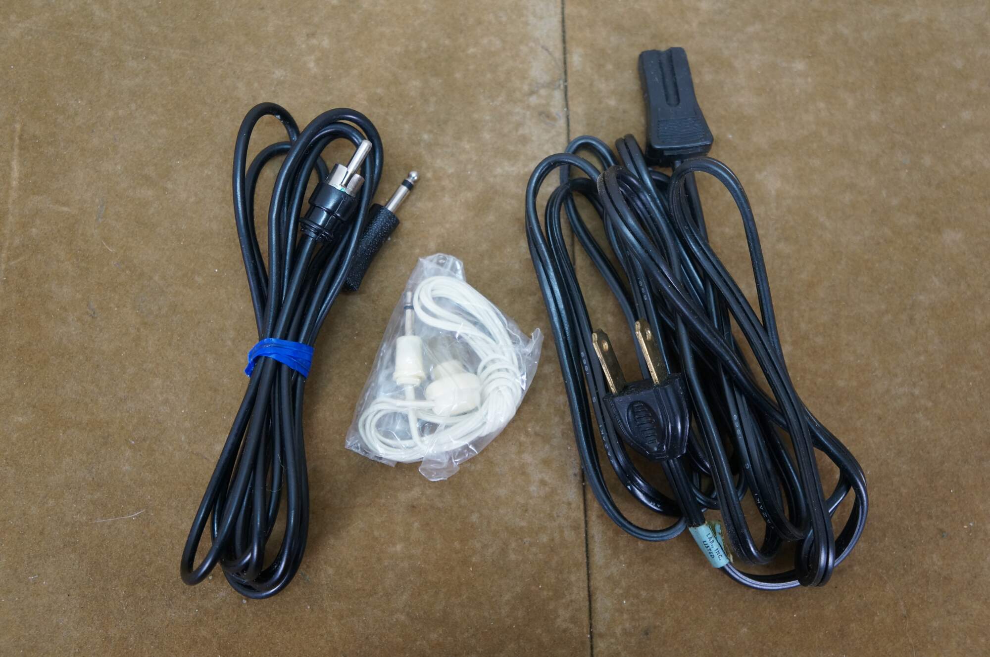 Vintage 20th century Zenith Model A-610J Solid State Two Track AC or Battery Operated (4 D Cell) Cassette Tape Player / Recorder. DC6v 400mA AC 120V 60Hz 50mA. Includes brown leather case, 2 Zenith NDM-24S Imp. Low microphones, microphone stand, ear bud, power cable, auxiliary cable, and Operating Guide.