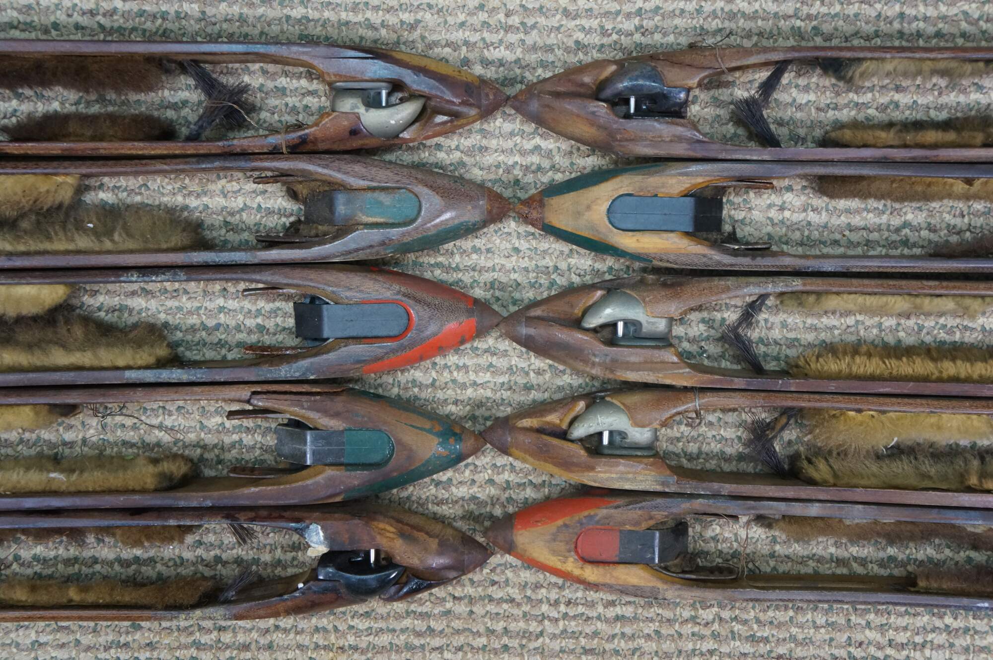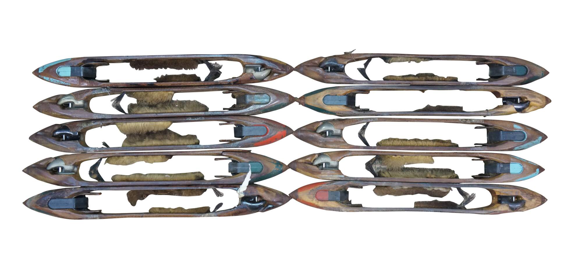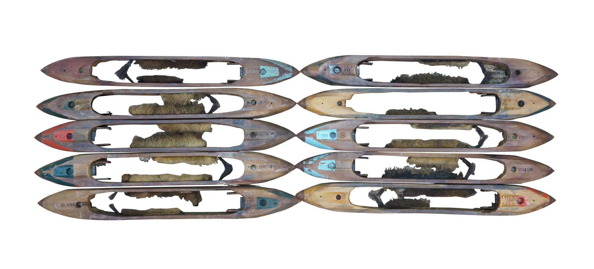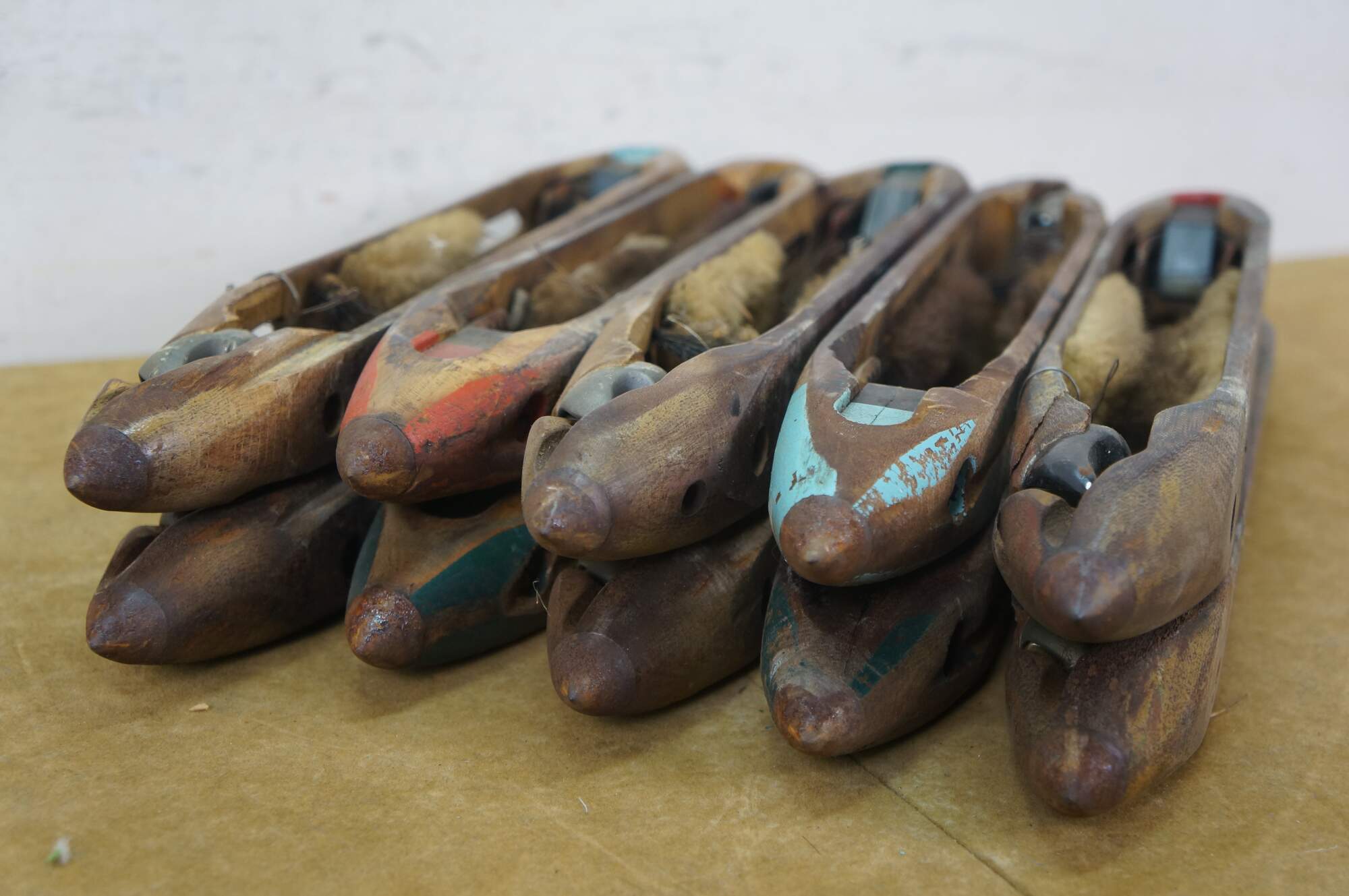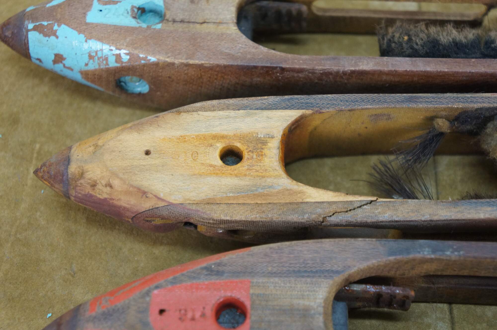 Collection of 10 antique 20th century boat shuttles / flying shuttles. Made of wood with metal tops and mechanism with strips of fur and small brushes lining the spool compartment / opening.