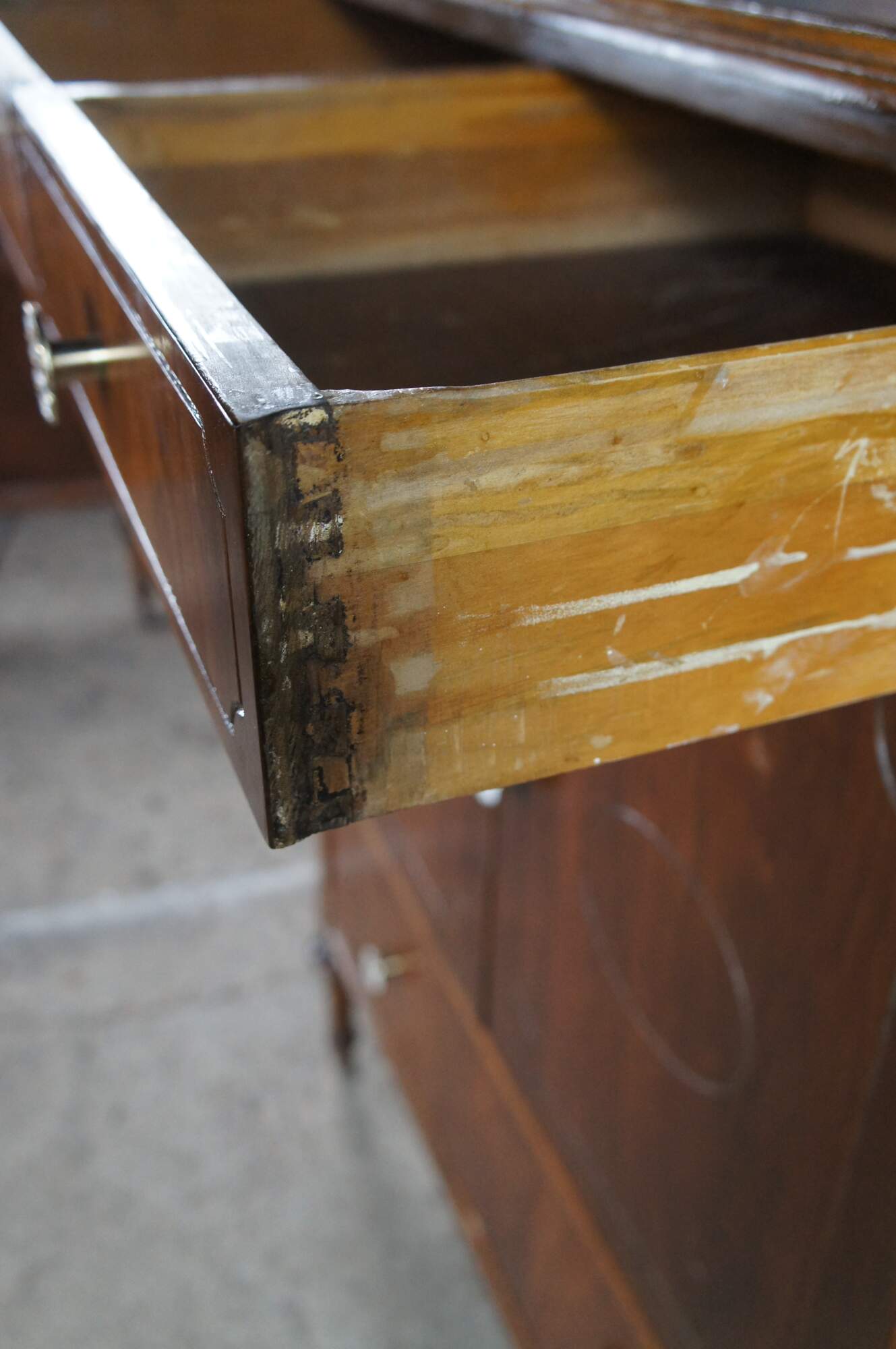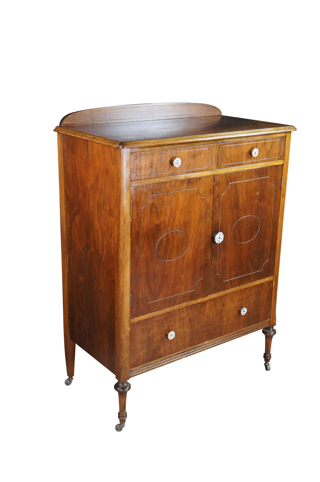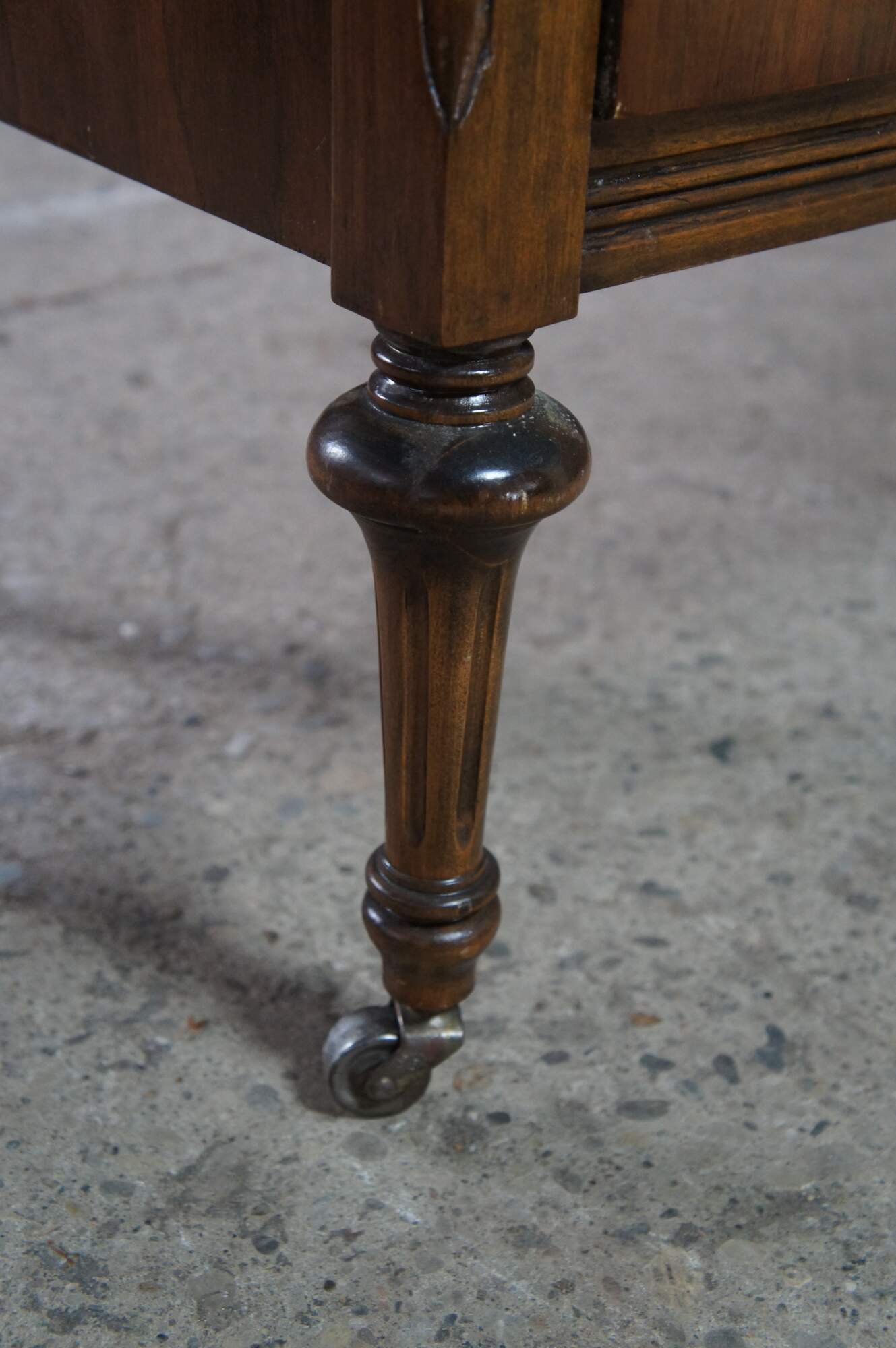 Antique Victorian gentleman's chest. Made of walnut featuring three drawers concealed behind paneled doors, flanked by multiple drawers, and supported by turned tapered fluted legs on casters.