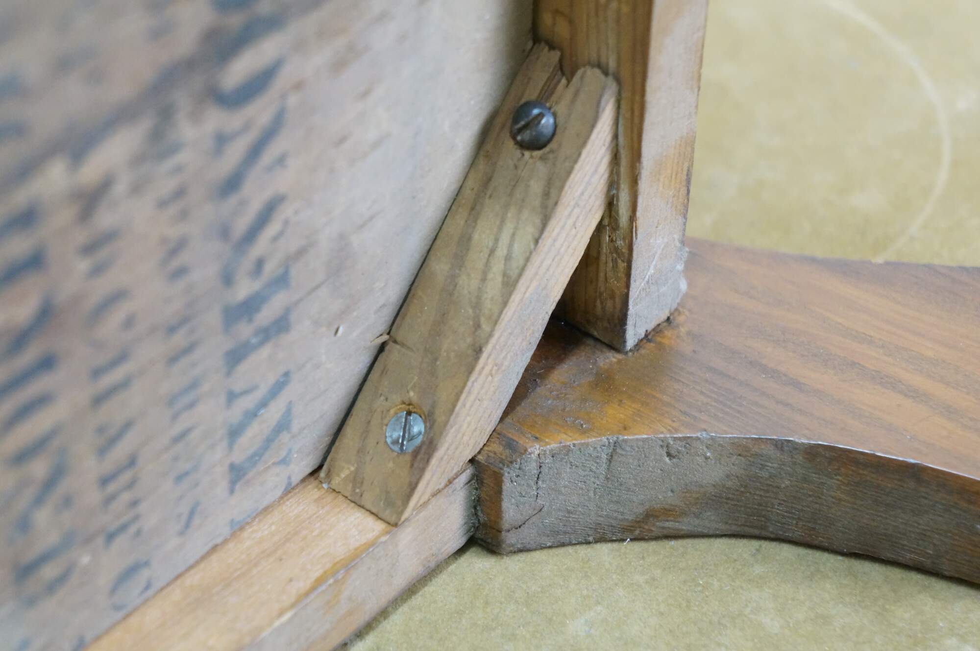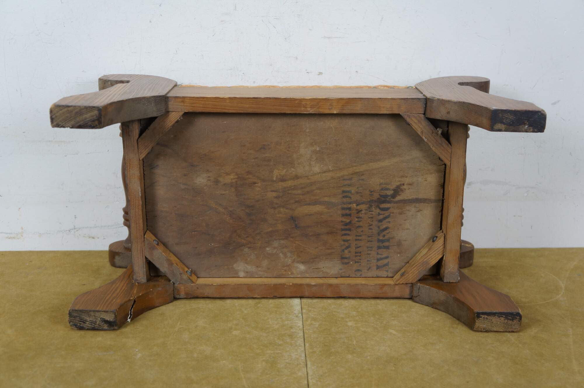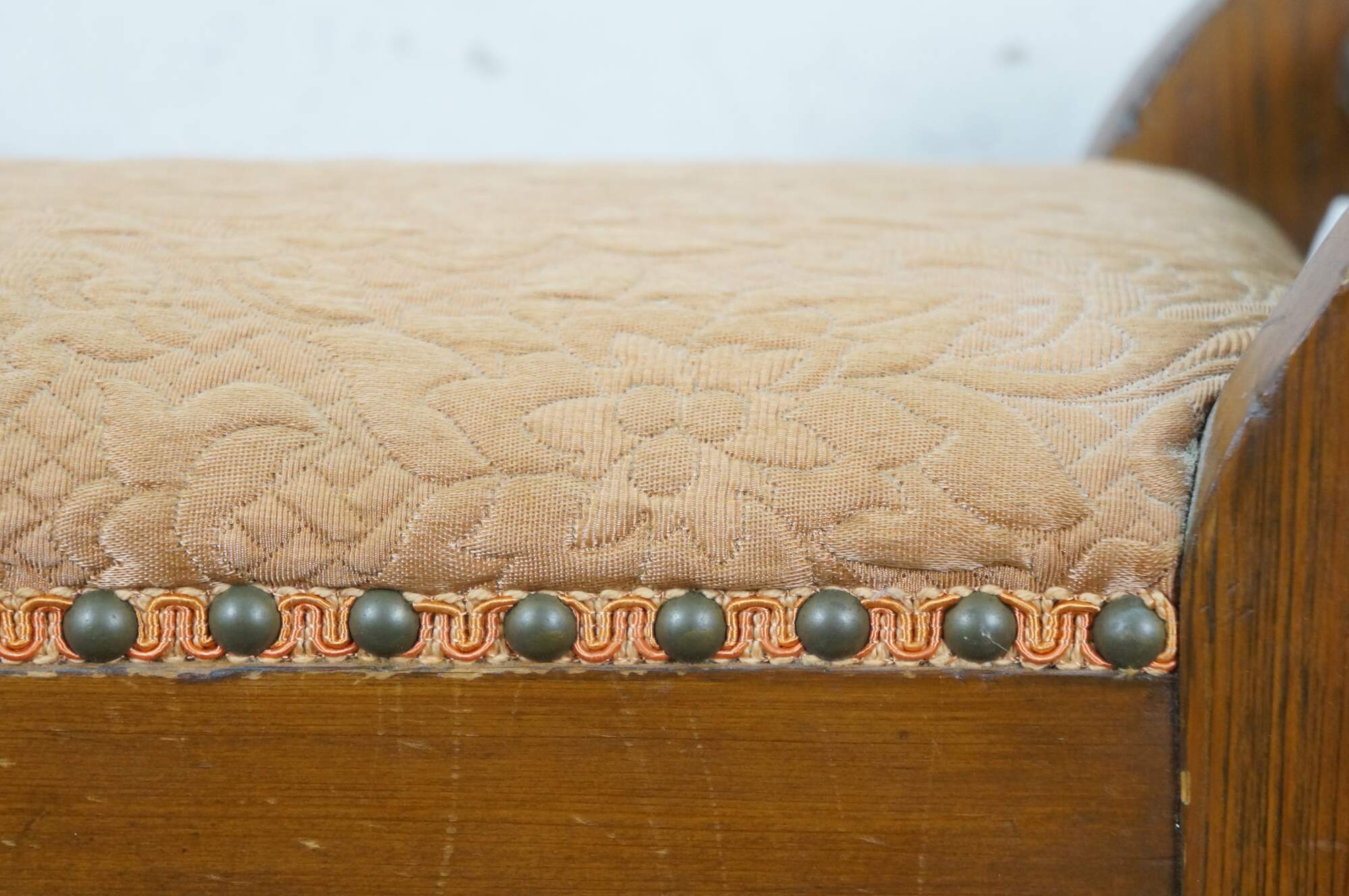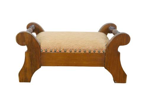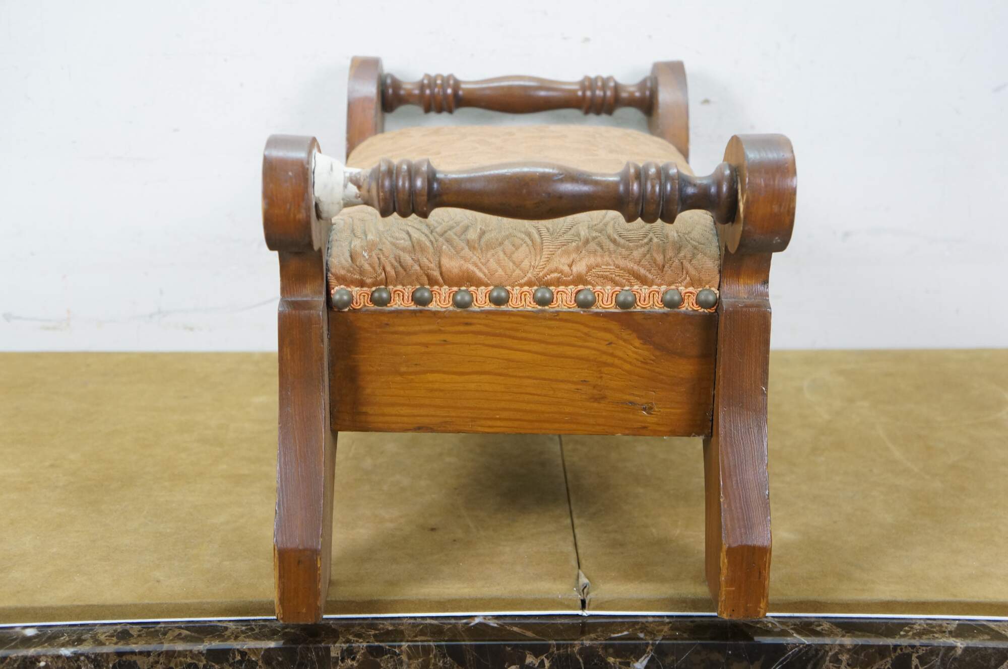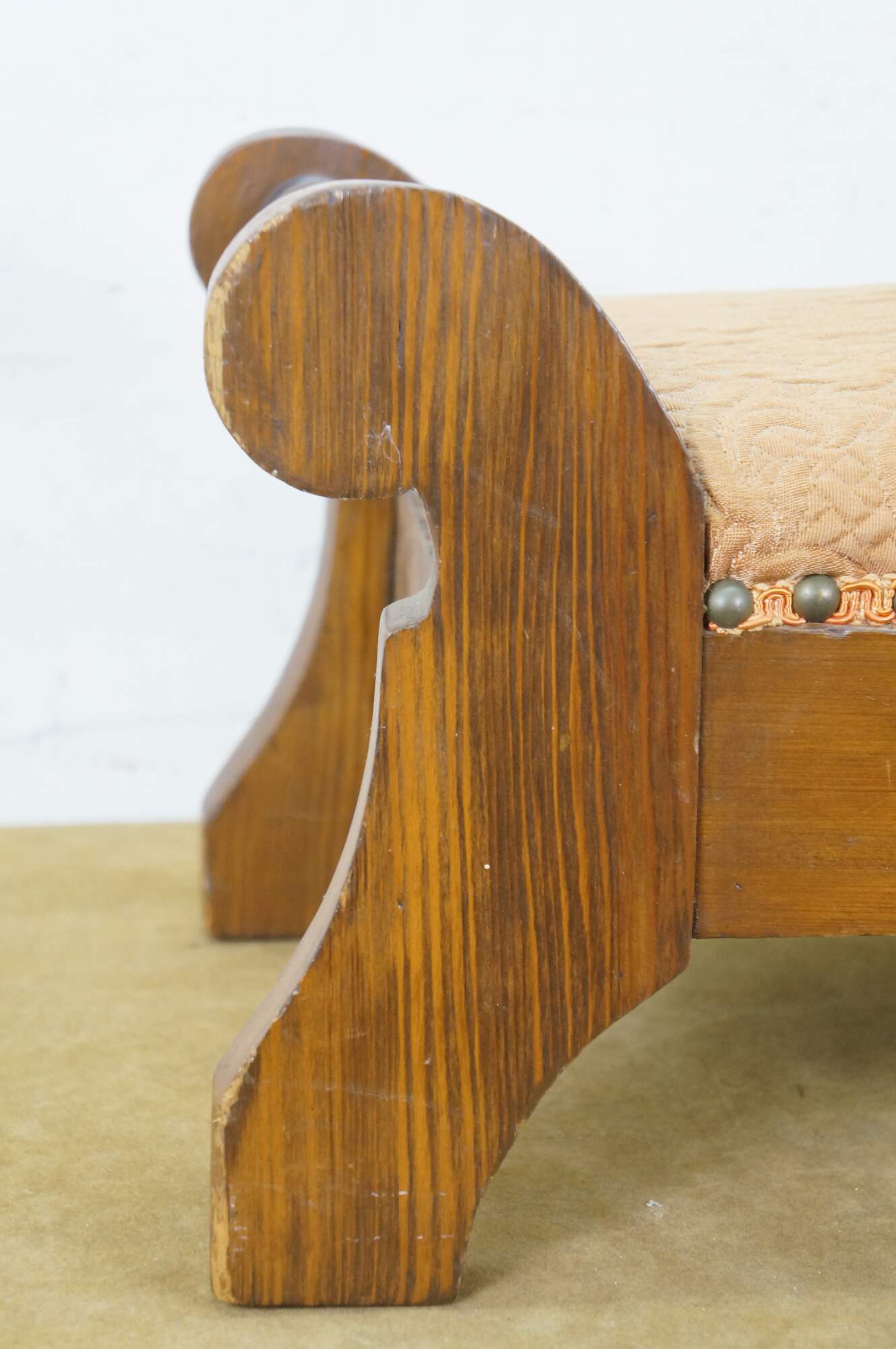 Antique Early American pine foot stool / foot rest - rectangular sleigh shaped frame with turned wood handles, top upholstered in peach tufted floral fabric and nail head trim.