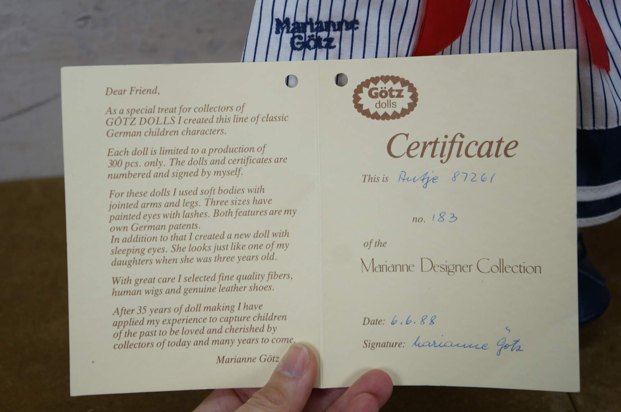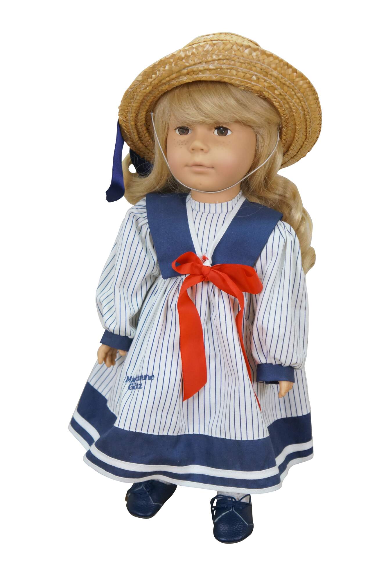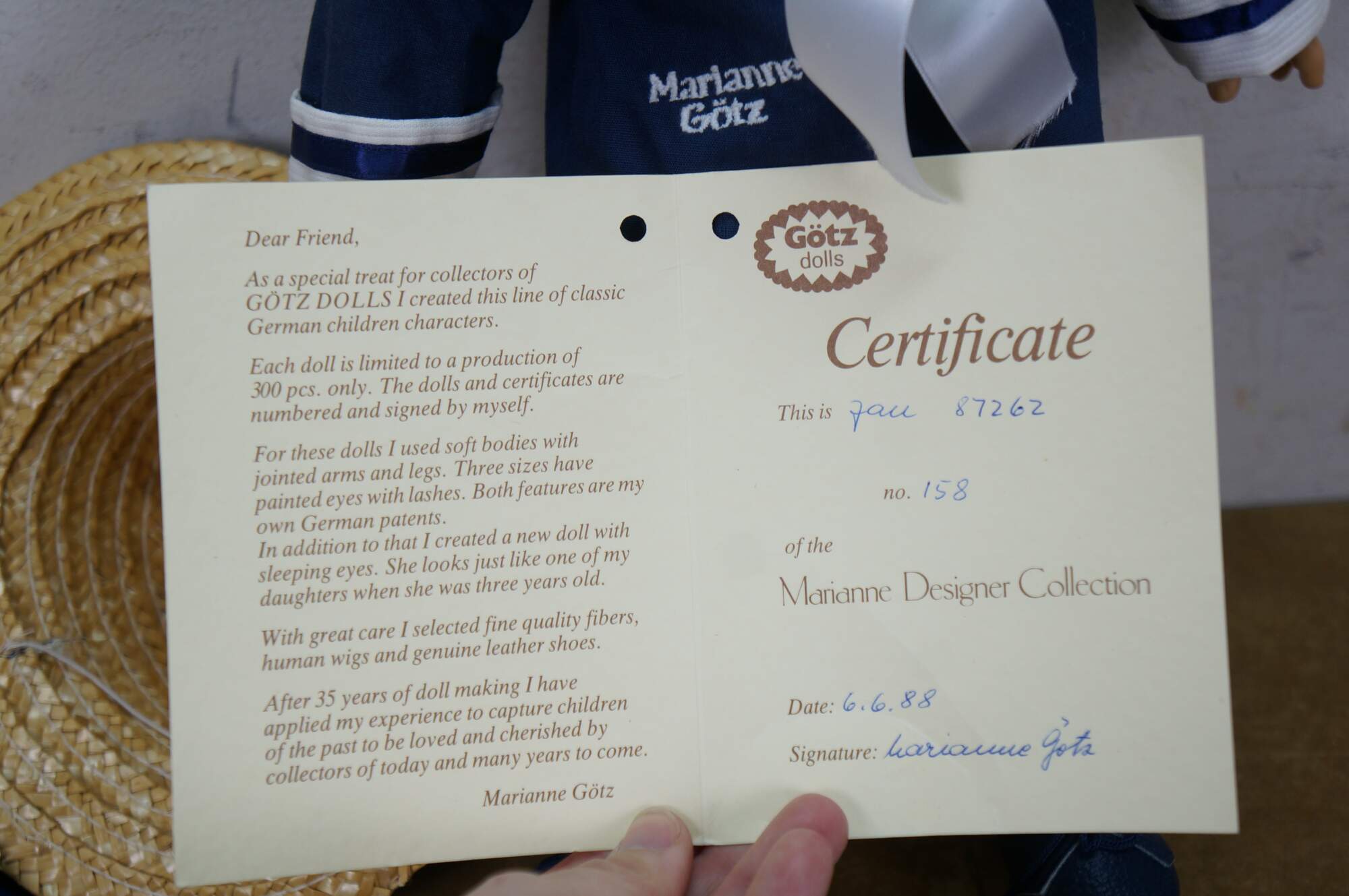 Pair of 1988 limited edition signed German Marianne Gotz dolls, No. 183 and 158 out of 300. Hard vinyl heads, arms, and legs with stuffed cotton bodies. Both dressed in blue and white sailor suits, white socks, blue leather shoes, and straw hats. Boy doll has brown hair and blue sleep eyes with applied lashes. Girl doll has blonde hair, brown sleep eyes with applied lashes, and painted freckles. Signed and numbered on bodies. Includes Certificates of Authenticity.