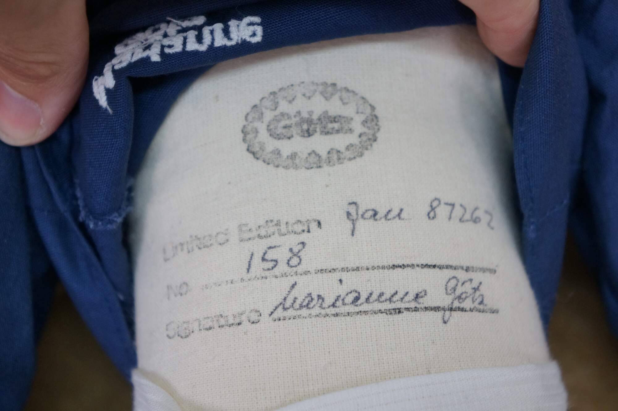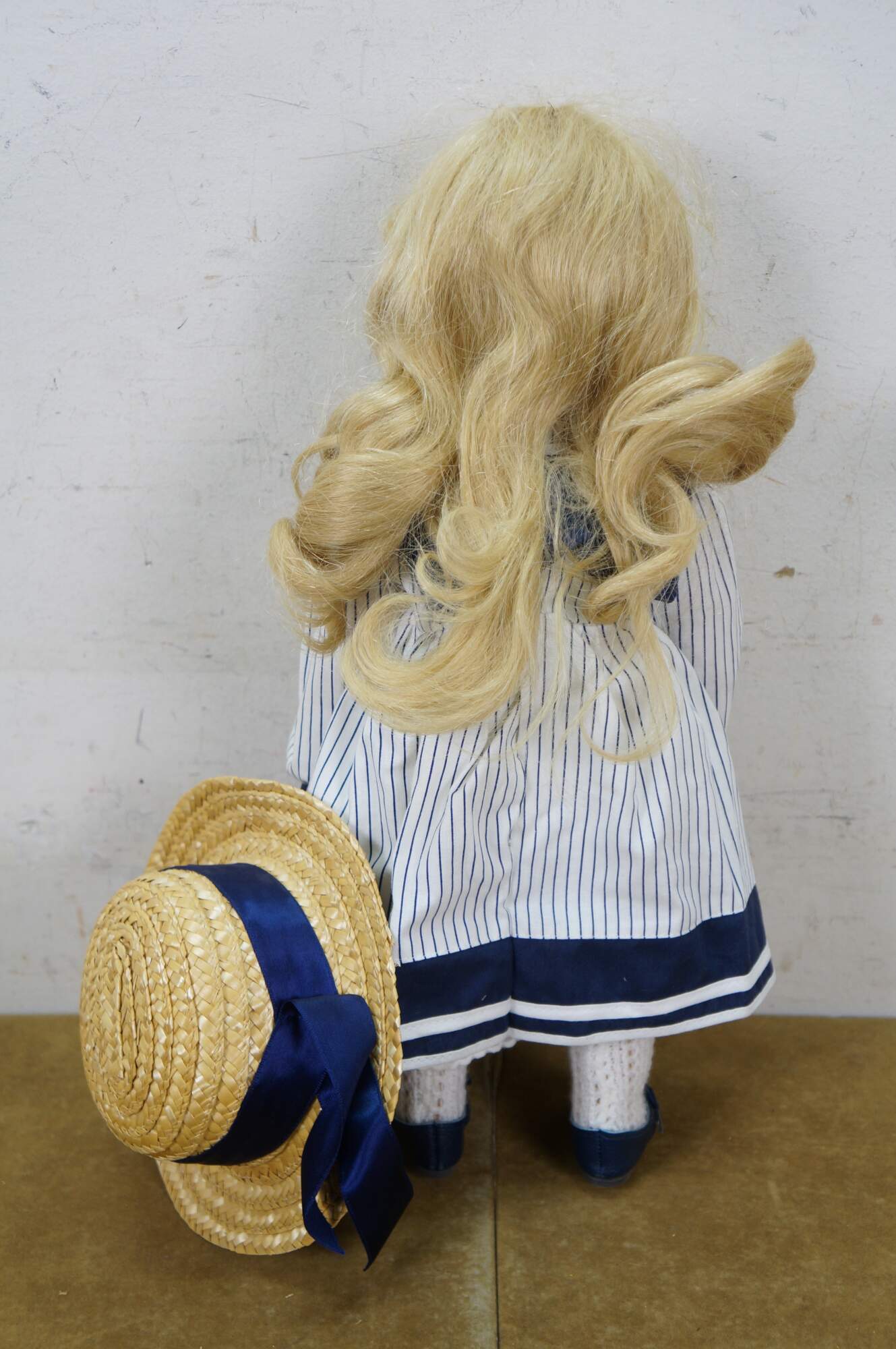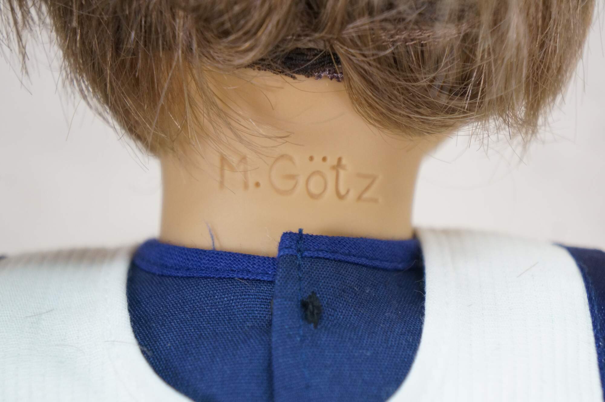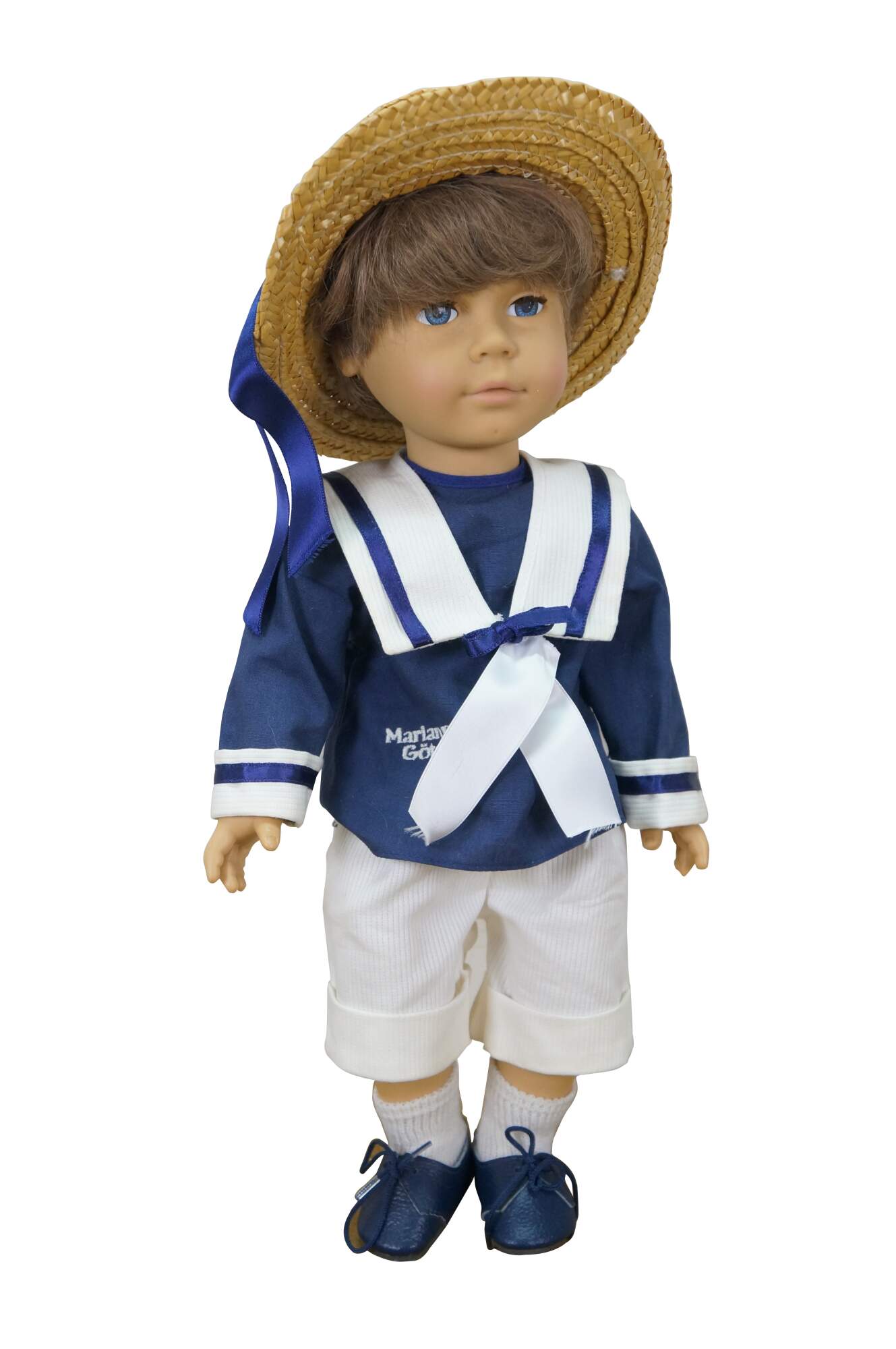 Pair of 1988 limited edition signed German Marianne Gotz dolls, No. 183 and 158 out of 300. Hard vinyl heads, arms, and legs with stuffed cotton bodies. Both dressed in blue and white sailor suits, white socks, blue leather shoes, and straw hats. Boy doll has brown hair and blue sleep eyes with applied lashes. Girl doll has blonde hair, brown sleep eyes with applied lashes, and painted freckles. Signed and numbered on bodies. Includes Certificates of Authenticity.