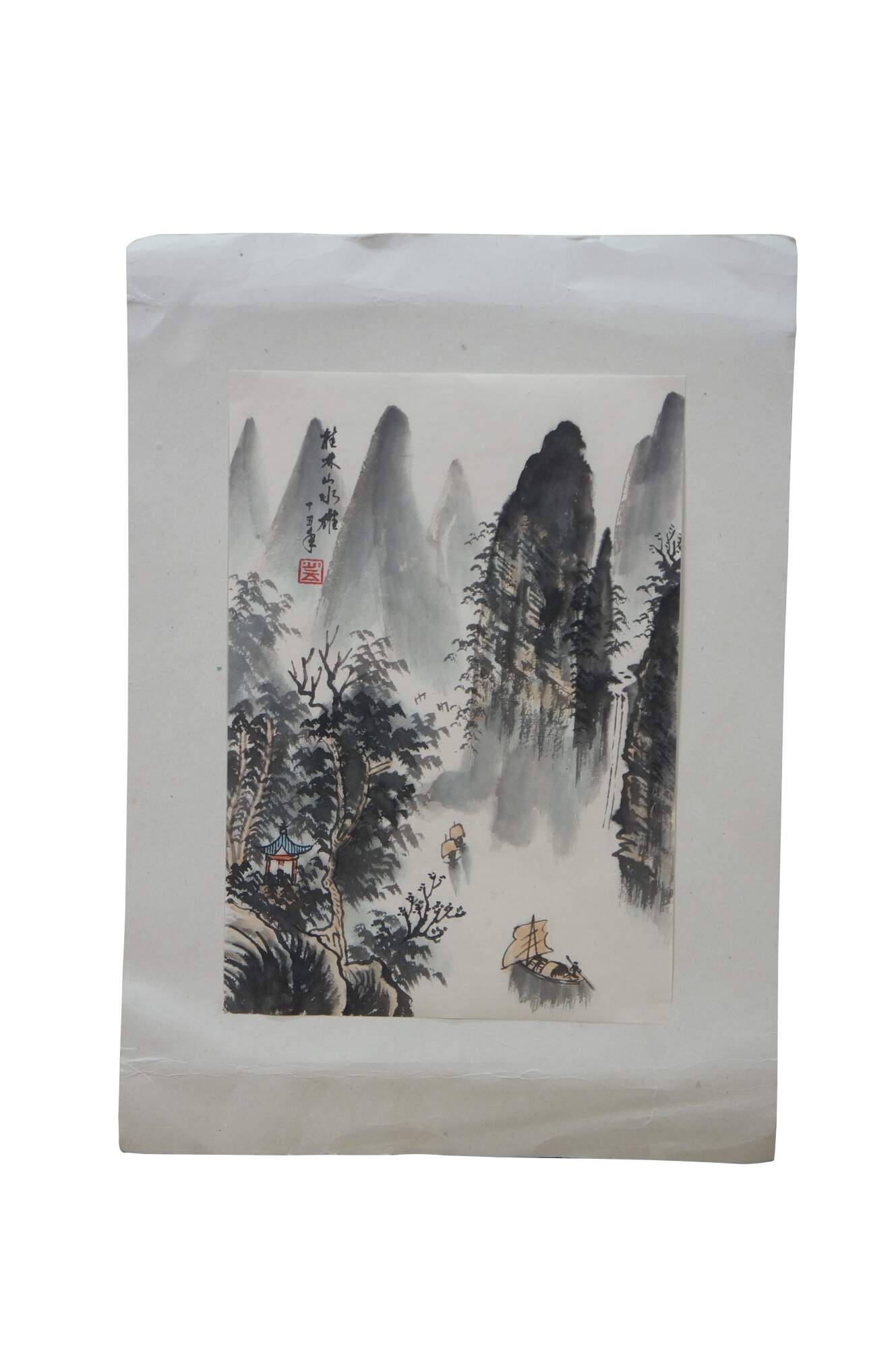 Vintage 20th century Chinese watercolor on paper painting showing a black and white landscape of mountains touched with color and water with a pair of sail boats and red and blue pagoda. Text and red signature seal at top left.