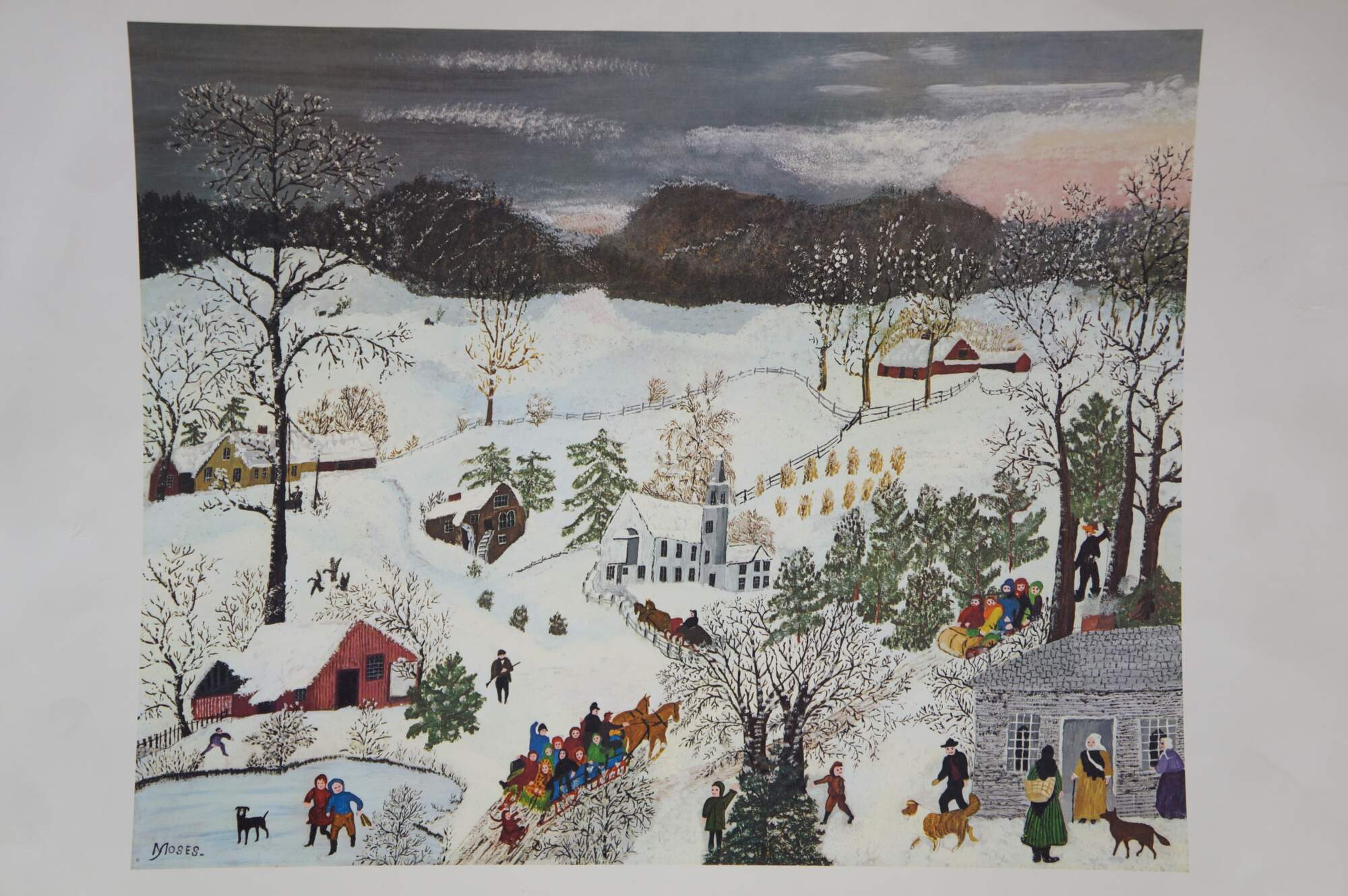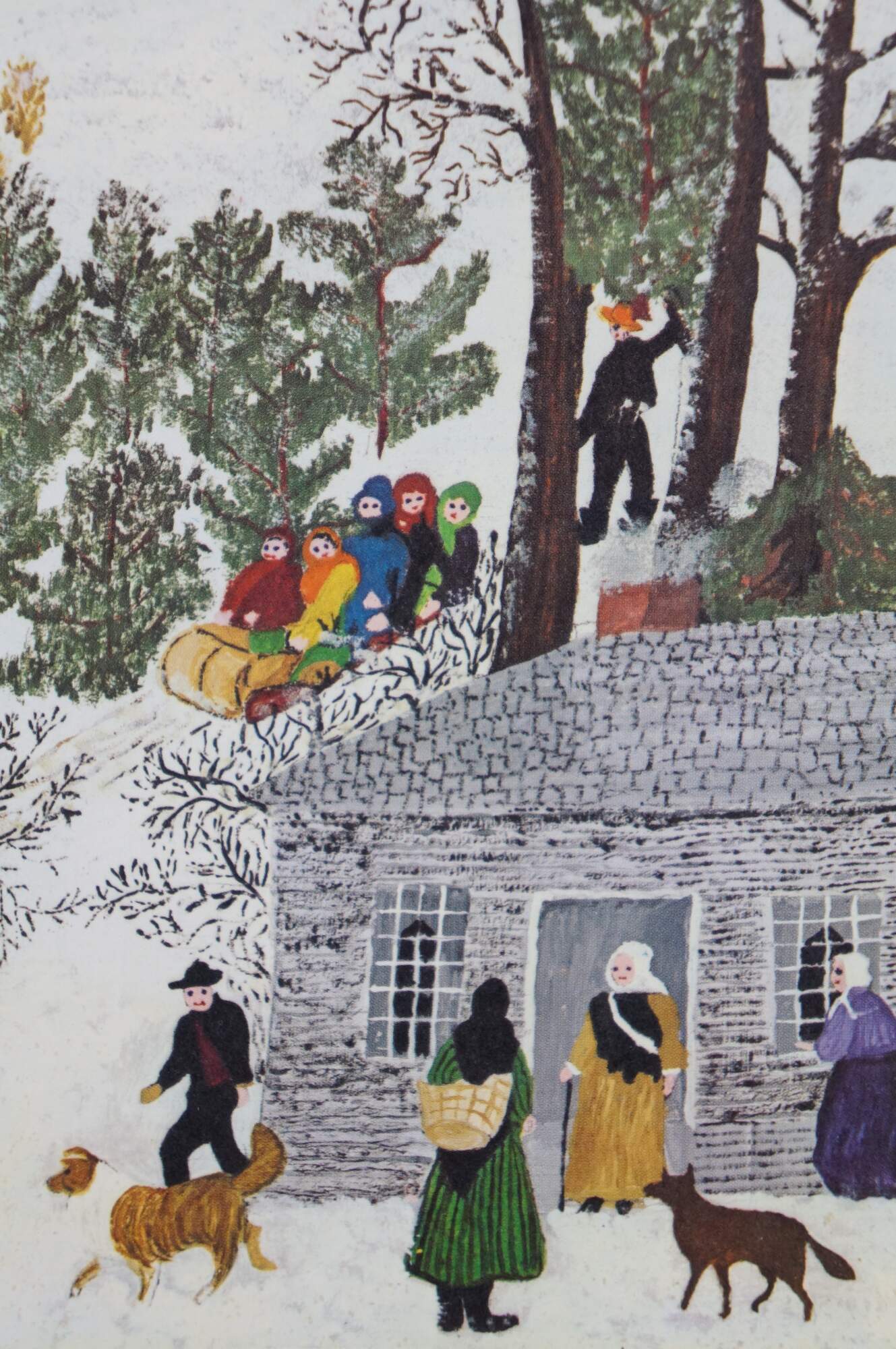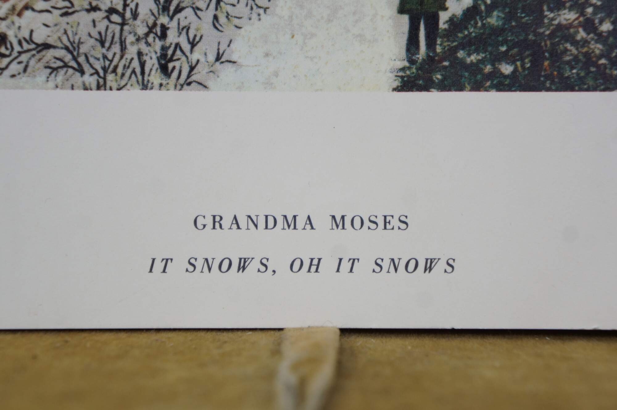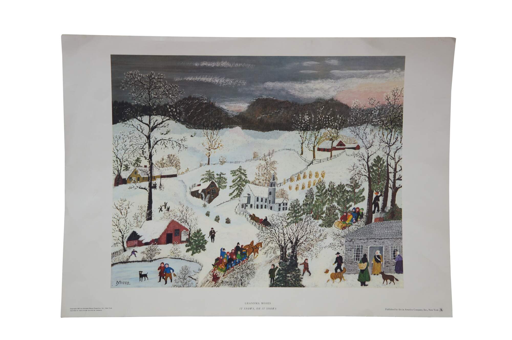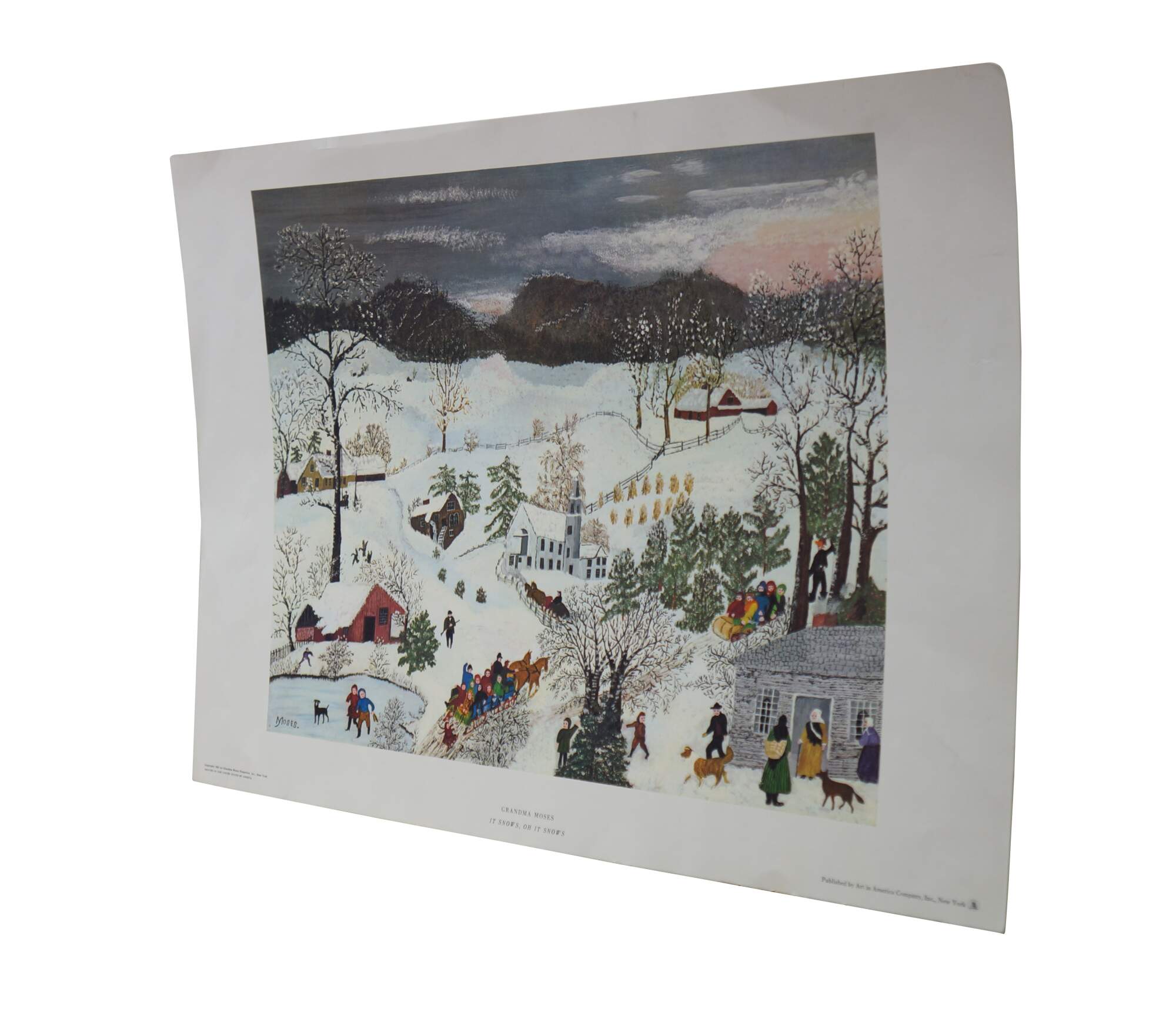 Vintage print on cardstock of "It Snows, Oh It Snows" by Grandma Moses. This busy landscape scene of classic Americana shows a hilly, snow covered village full of figures sledding, ice skating, riding in sleighs and paying visits. Copyright 1951 by Grandma Moses Properties, Inc, New York - Printed in the United States of America - Published by Art in America Company, Inc, New York.
