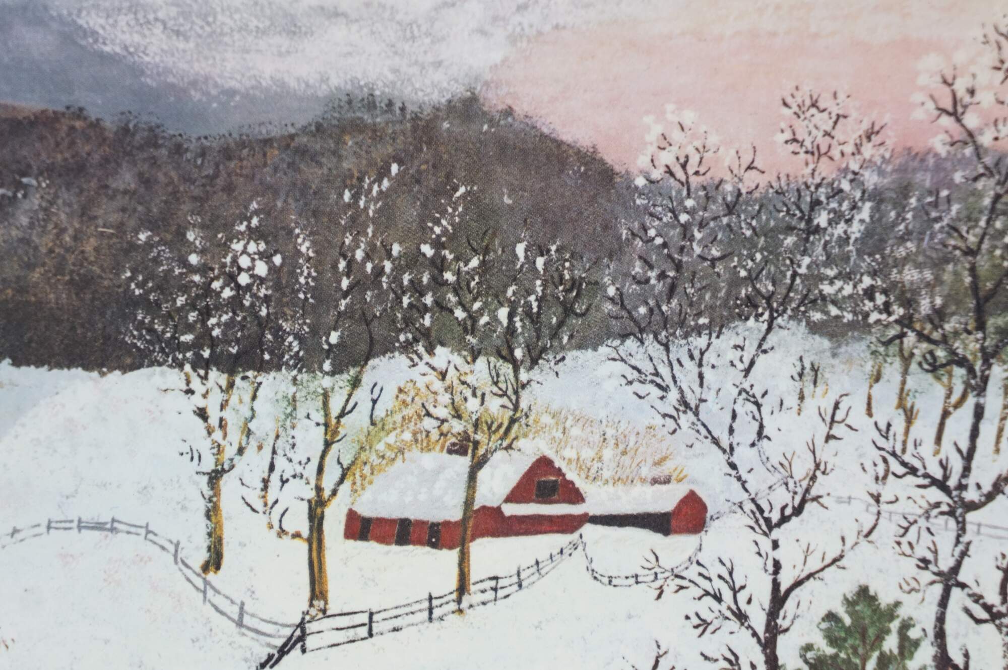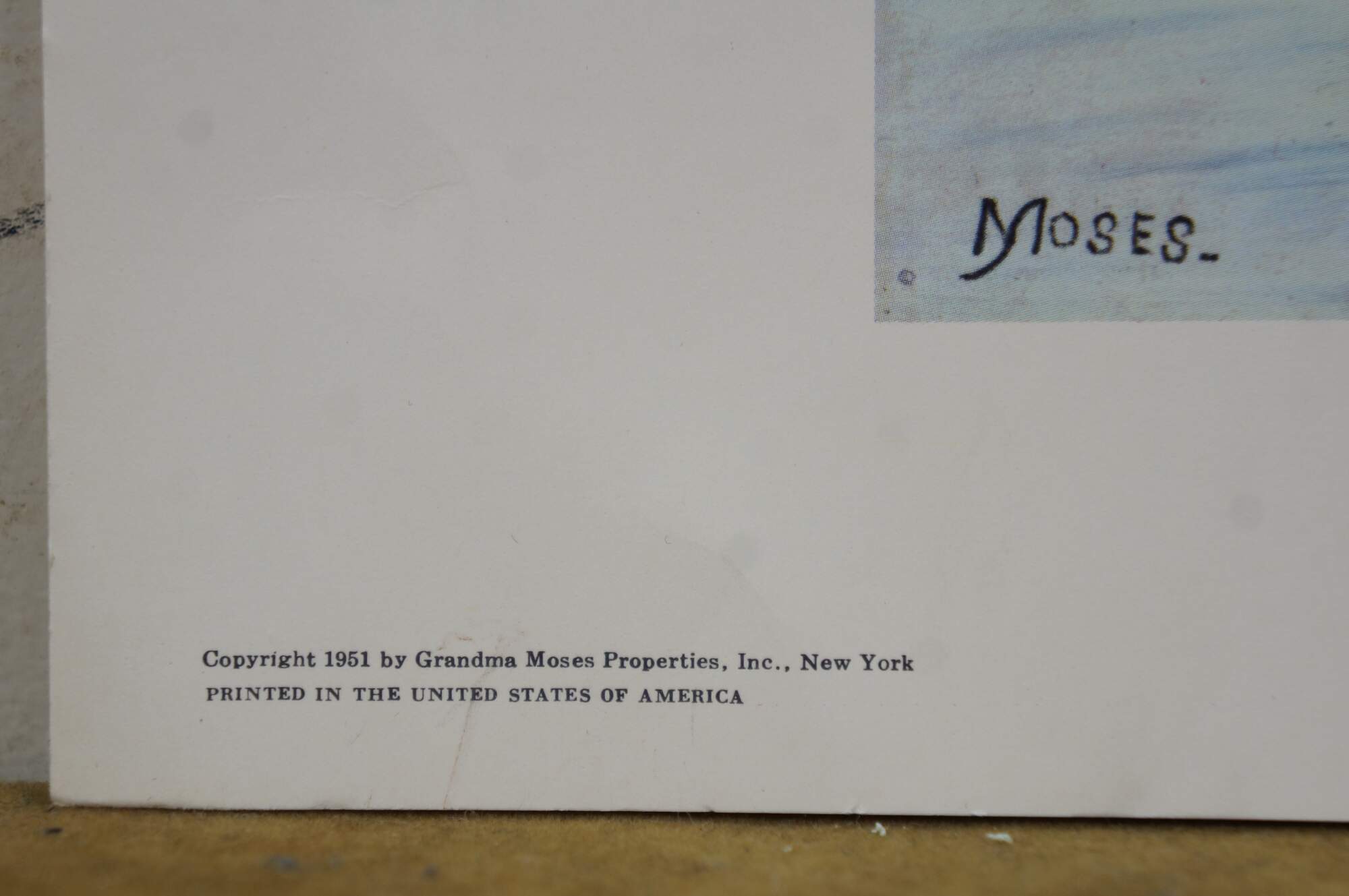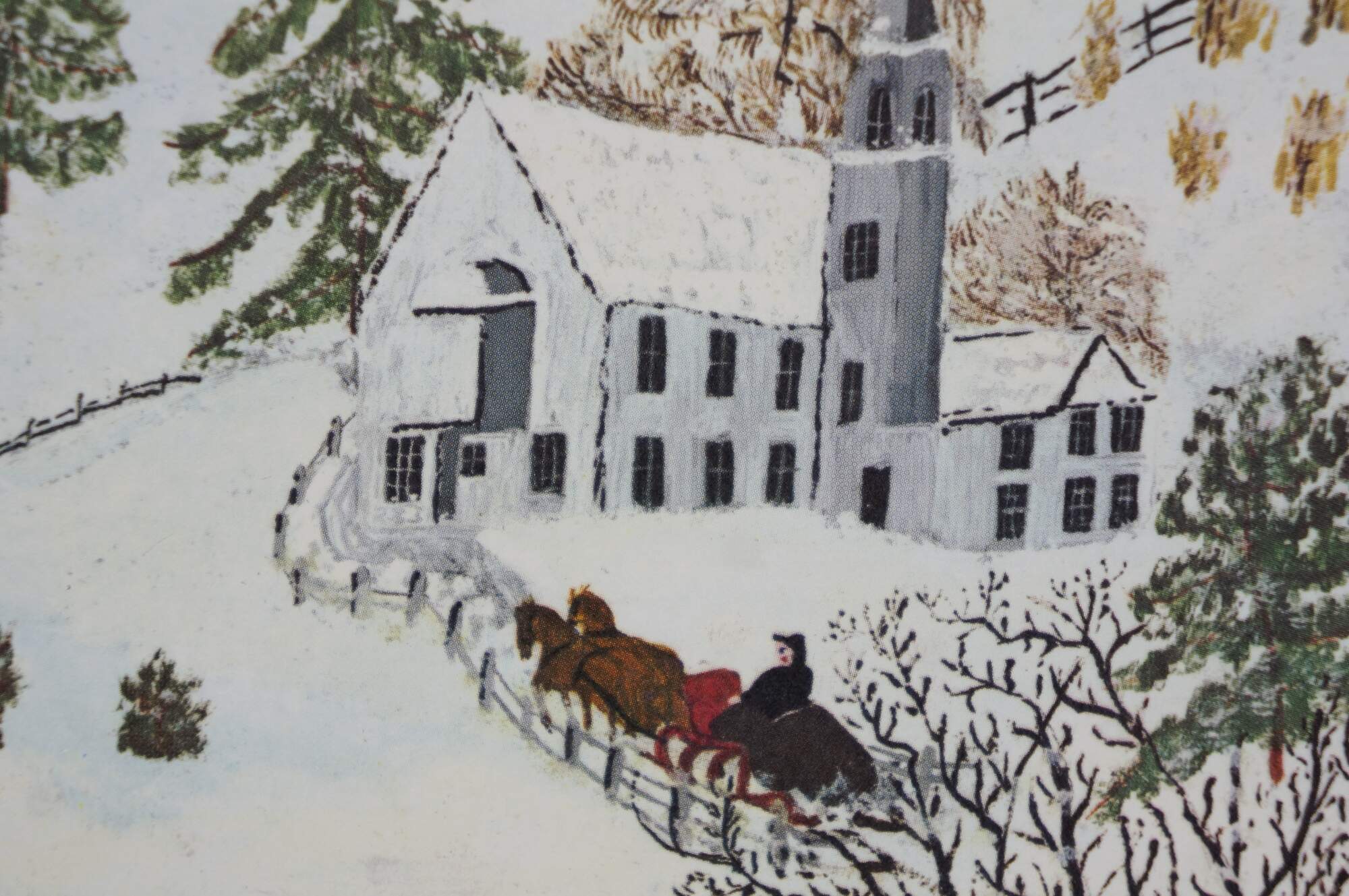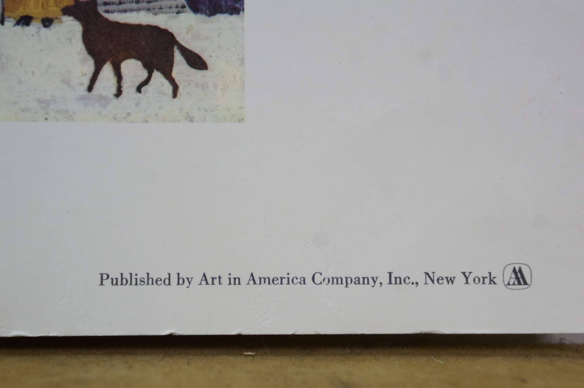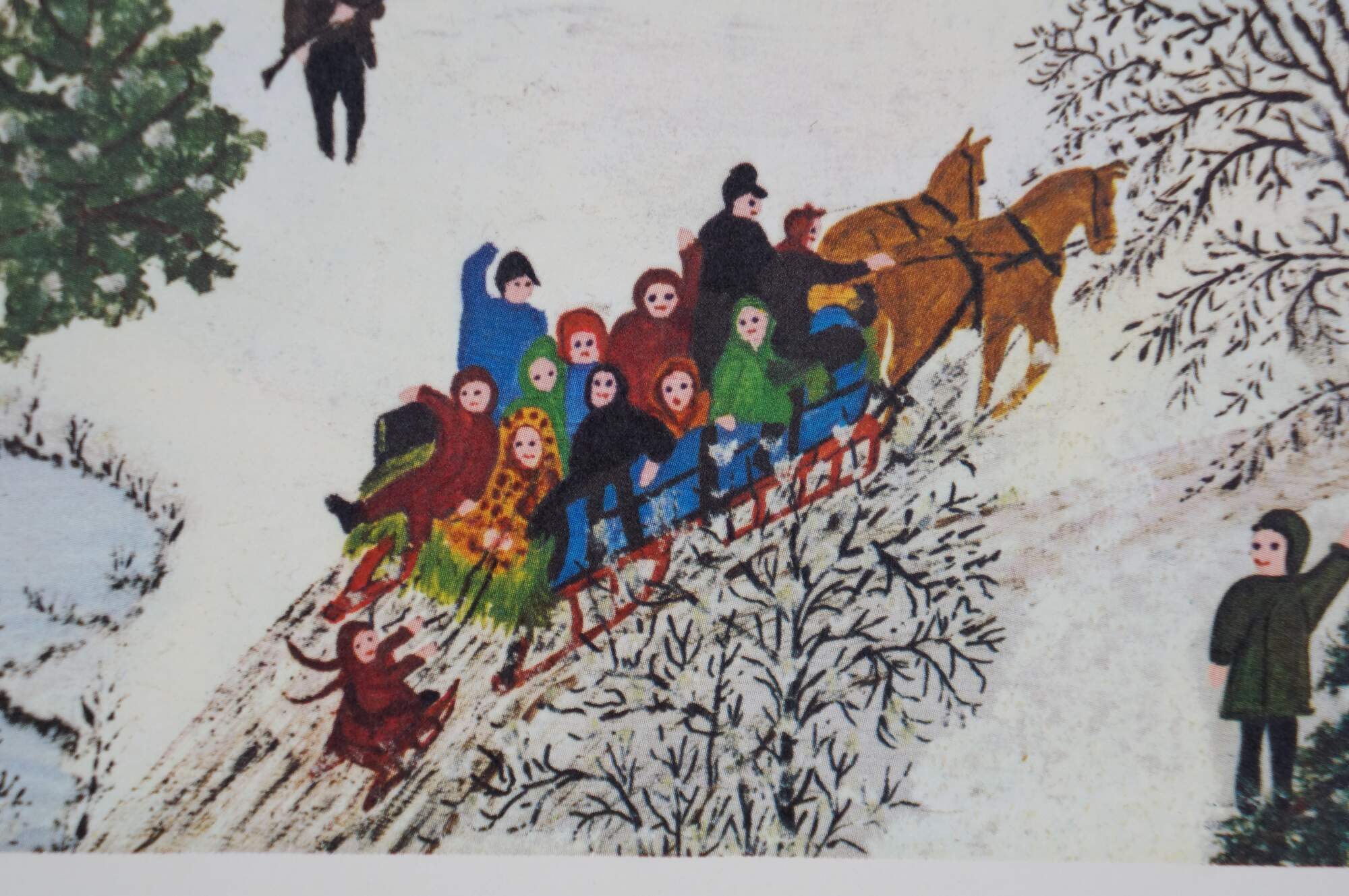 Vintage print on cardstock of "It Snows, Oh It Snows" by Grandma Moses. This busy landscape scene of classic Americana shows a hilly, snow covered village full of figures sledding, ice skating, riding in sleighs and paying visits. Copyright 1951 by Grandma Moses Properties, Inc, New York - Printed in the United States of America - Published by Art in America Company, Inc, New York.