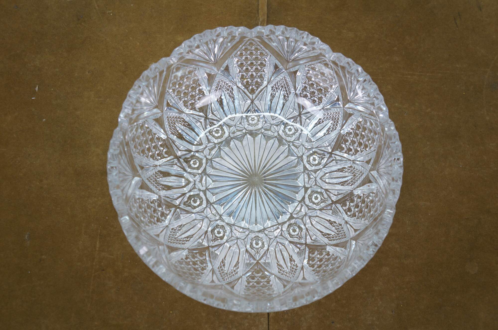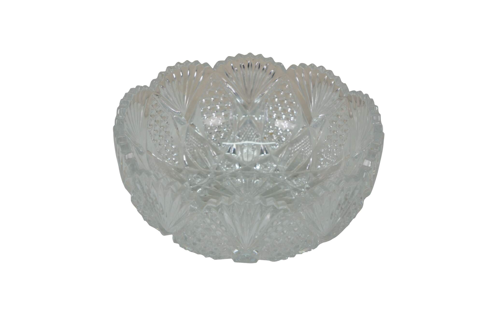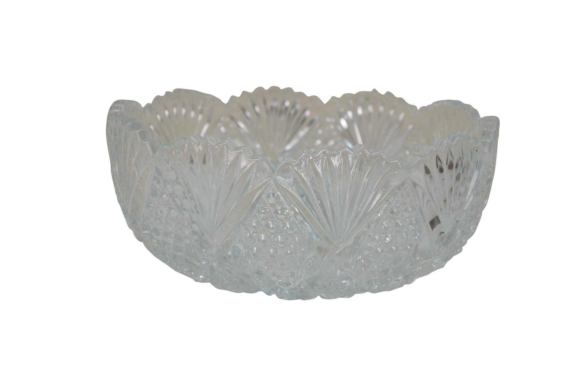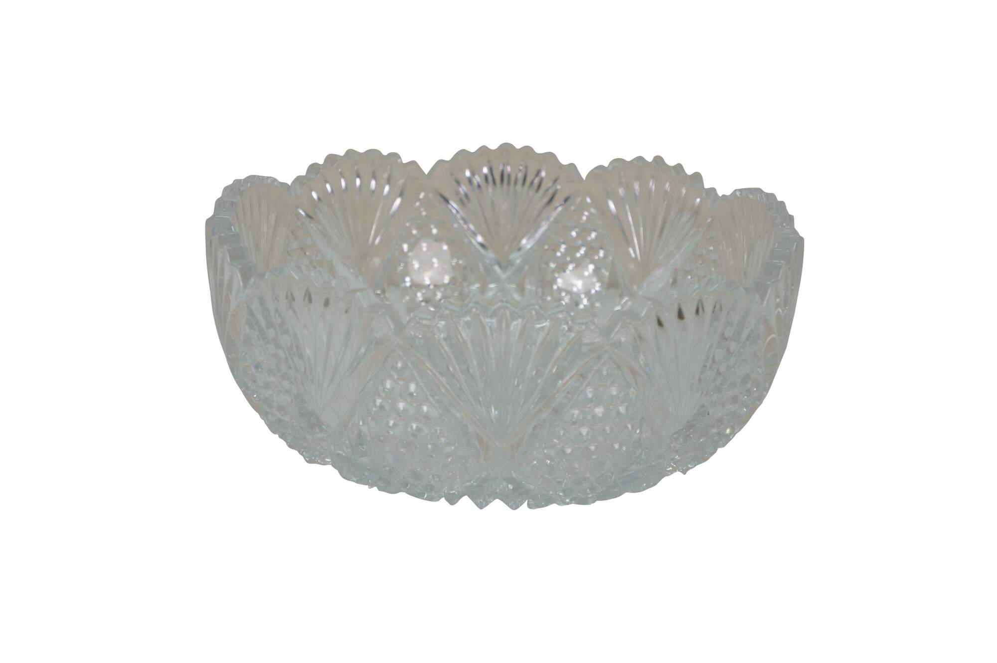 Early to mid 20th century cut crystal serving bowl, round form with scalloped edge and sawtooth rim, cut with a sunburst at the center, surrounded by a flower like design trimmed with fan shapes.