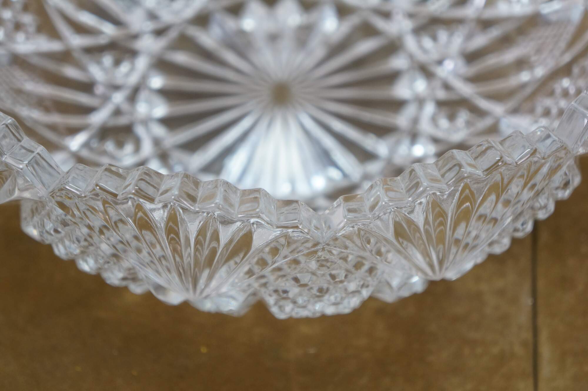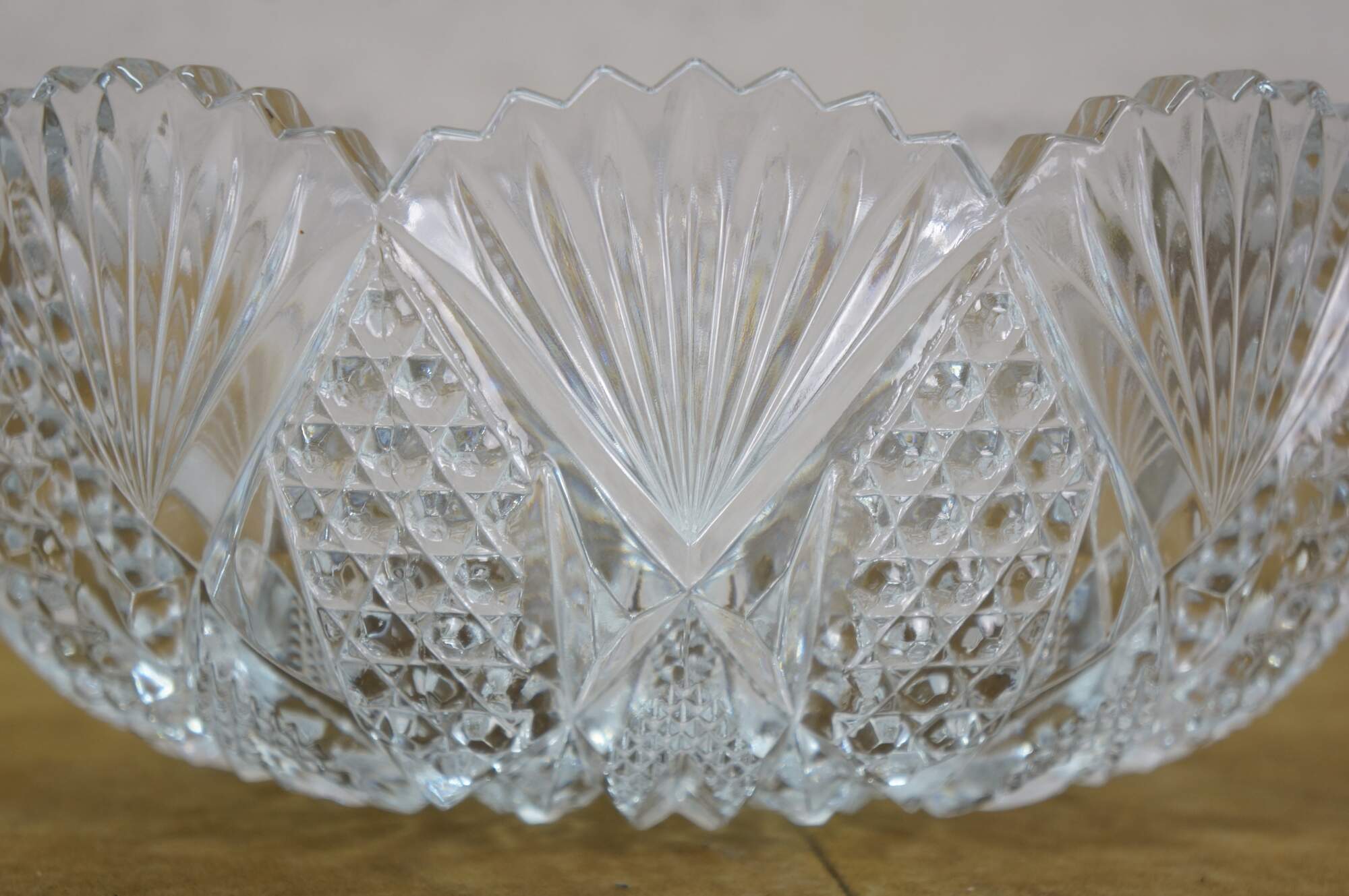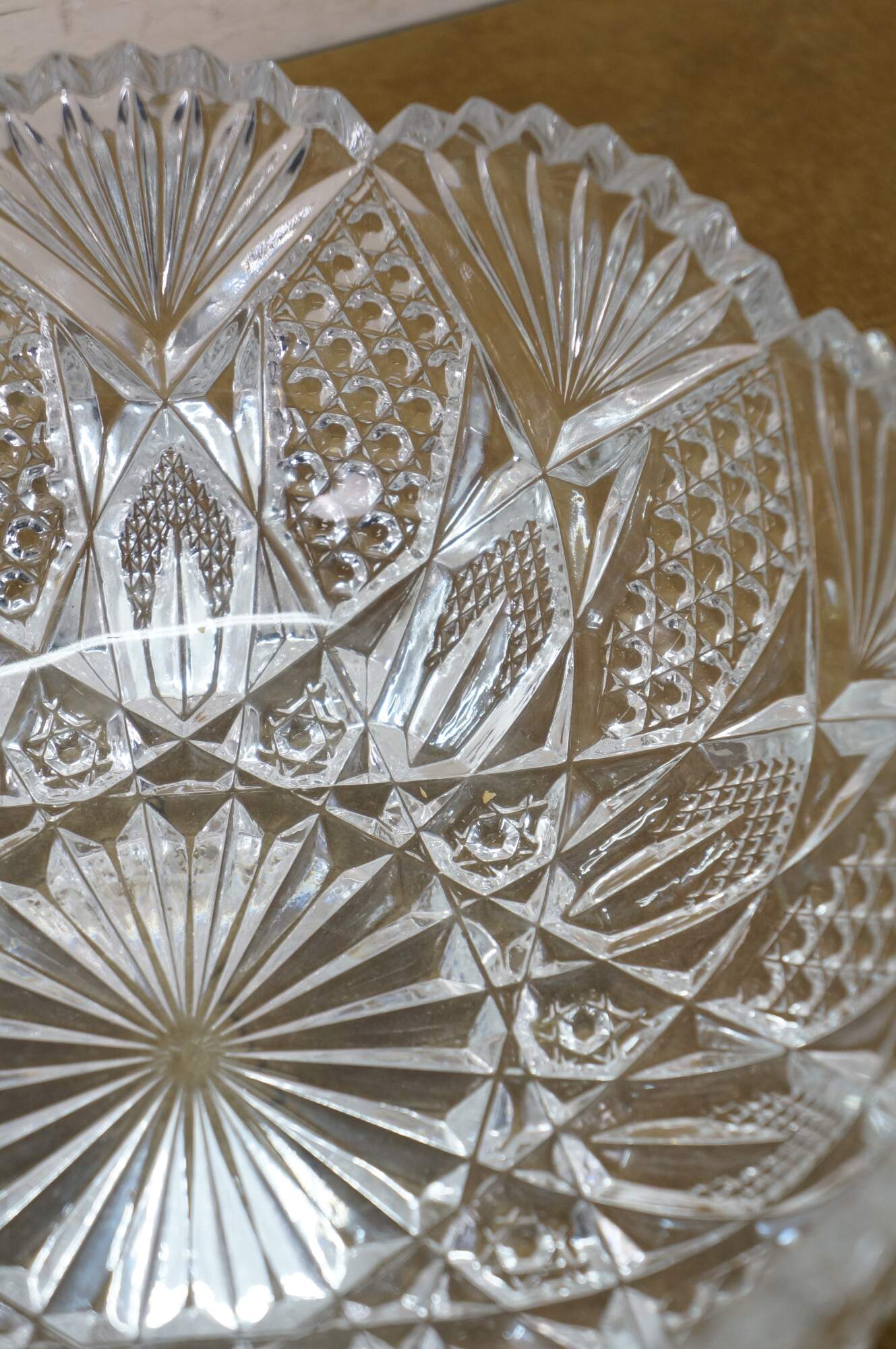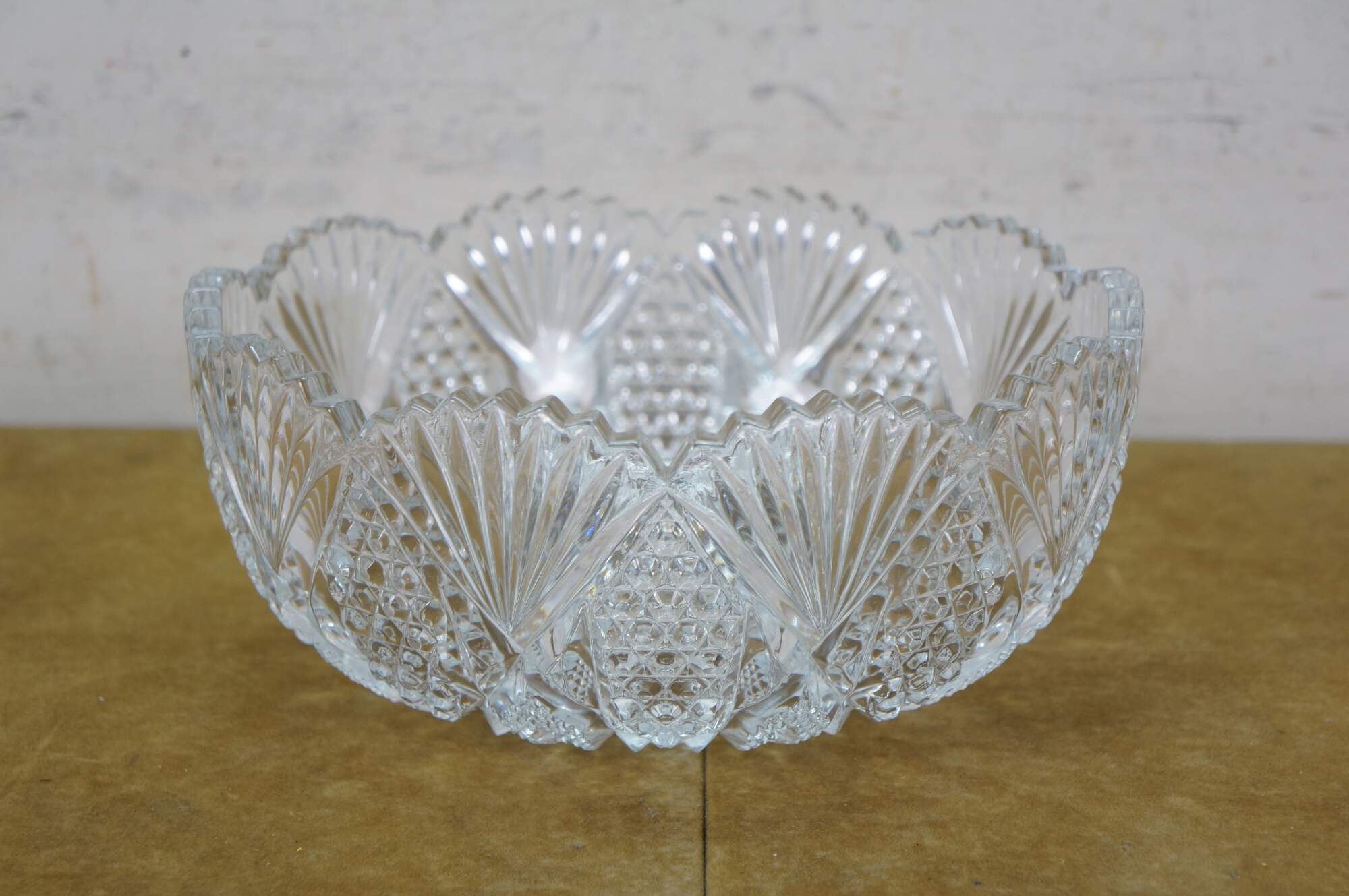 Early to mid 20th century cut crystal serving bowl, round form with scalloped edge and sawtooth rim, cut with a sunburst at the center, surrounded by a flower like design trimmed with fan shapes.