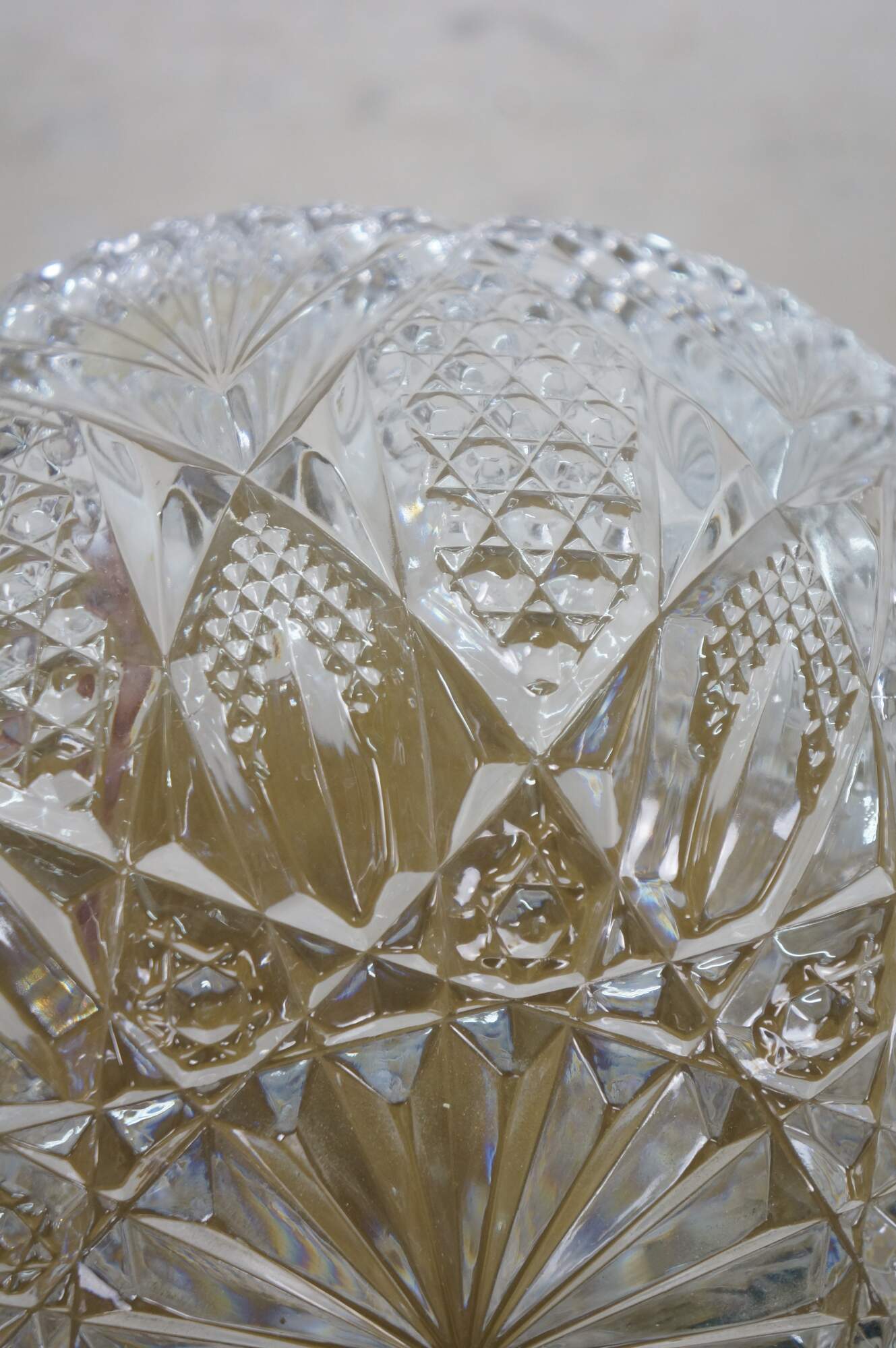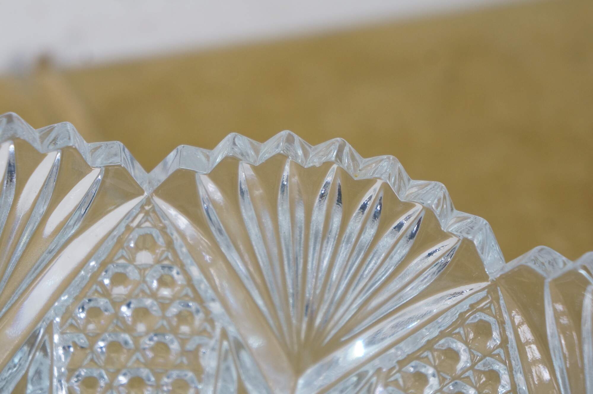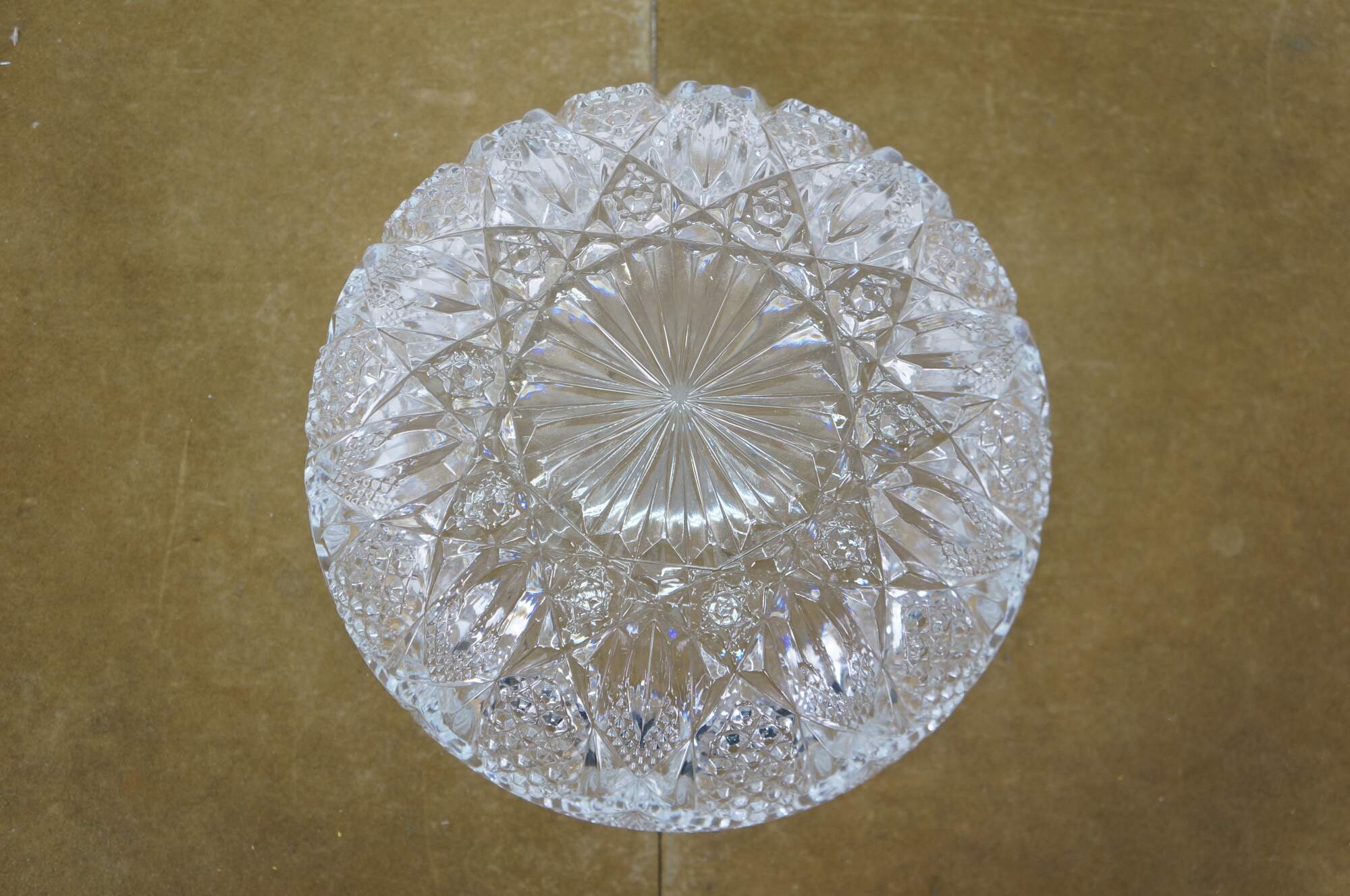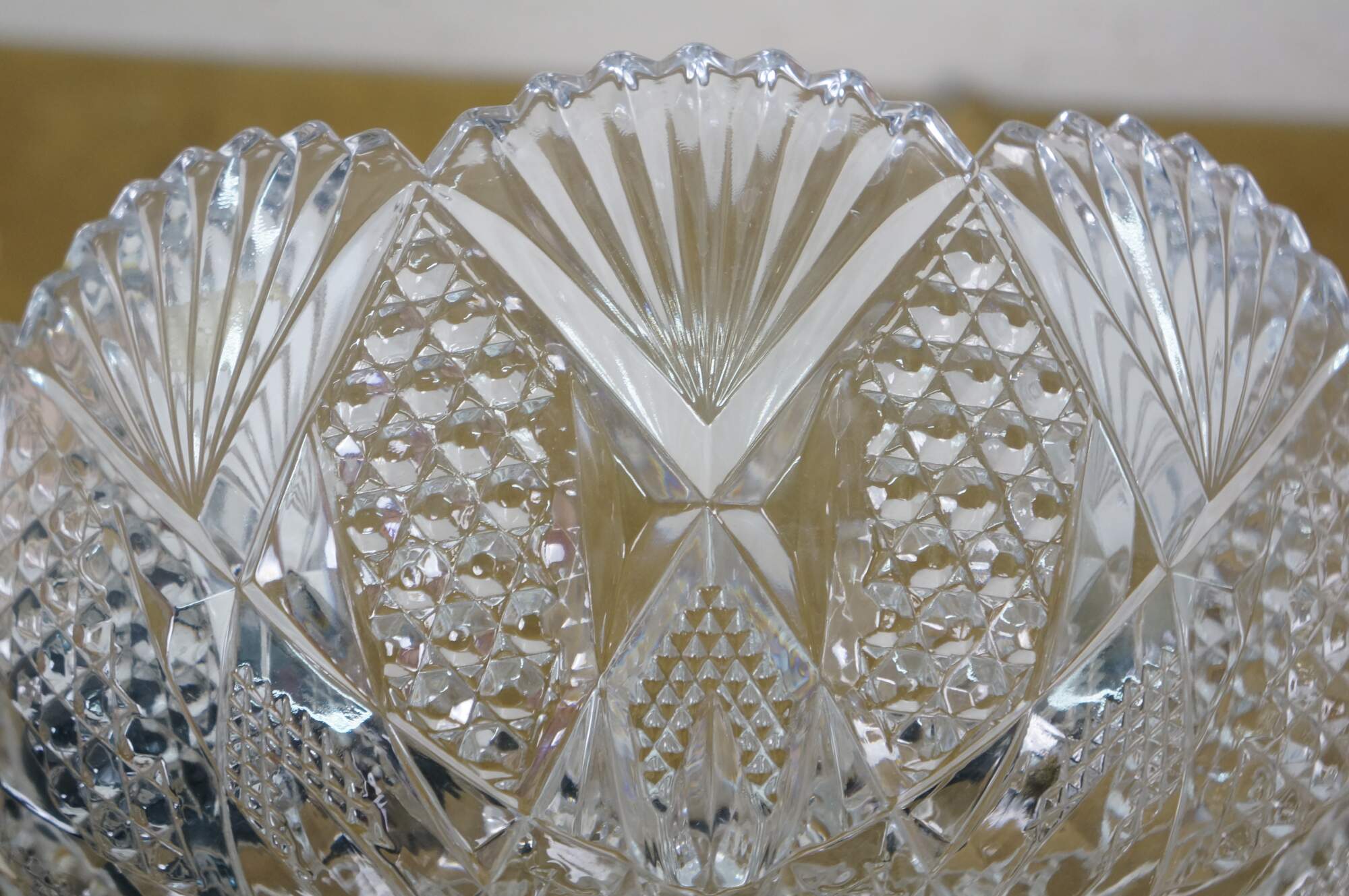 Early to mid 20th century cut crystal serving bowl, round form with scalloped edge and sawtooth rim, cut with a sunburst at the center, surrounded by a flower like design trimmed with fan shapes.