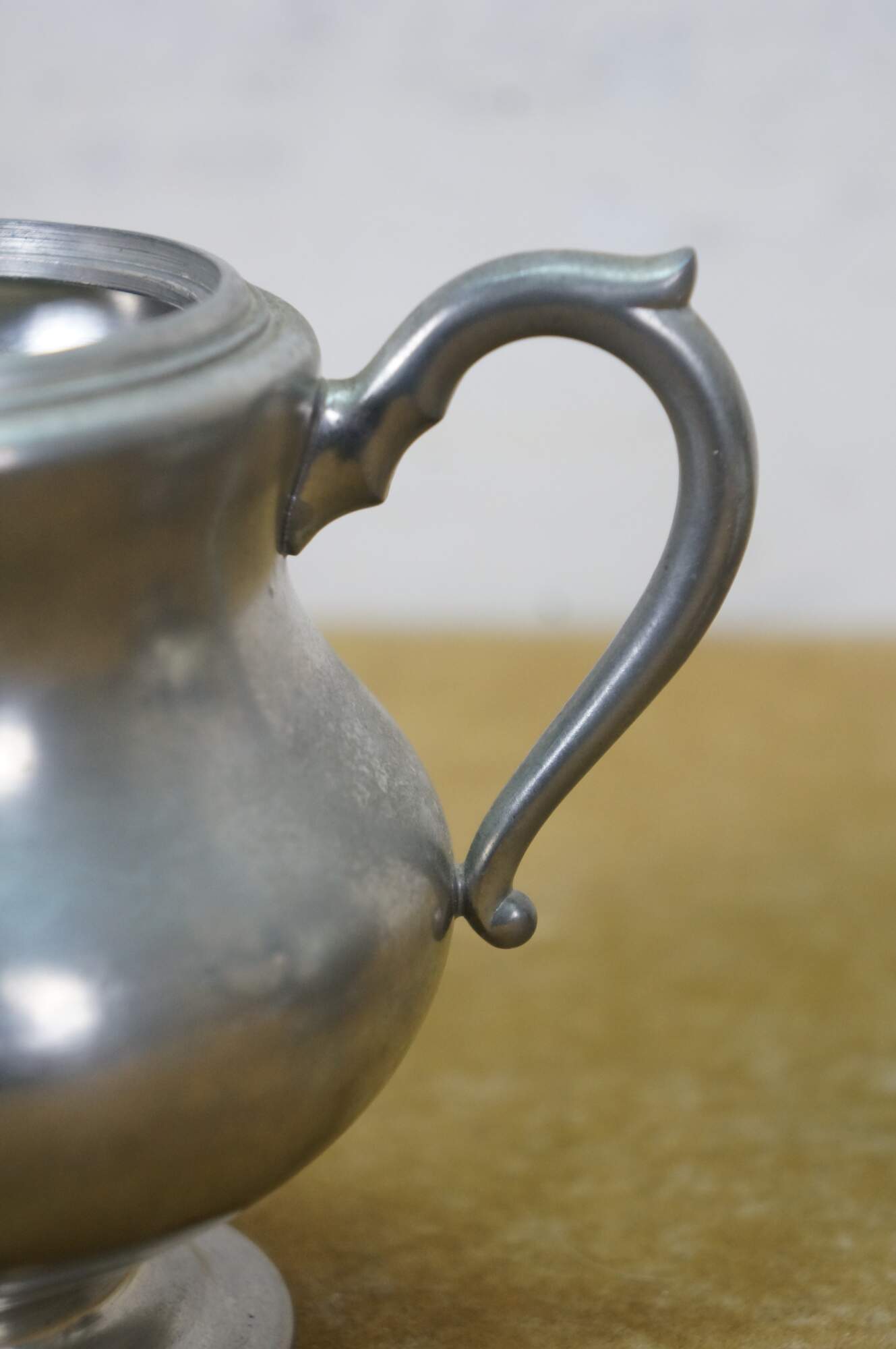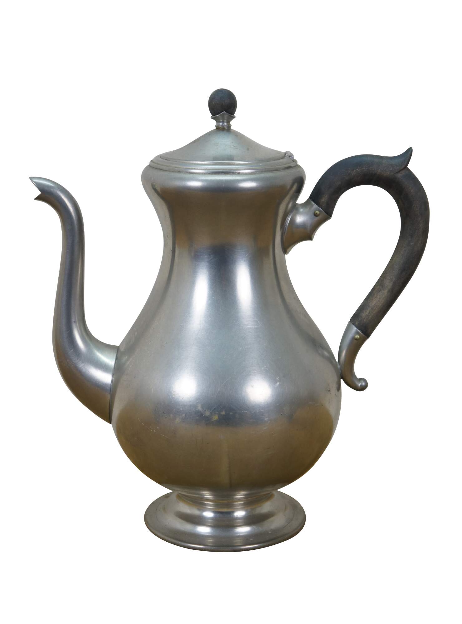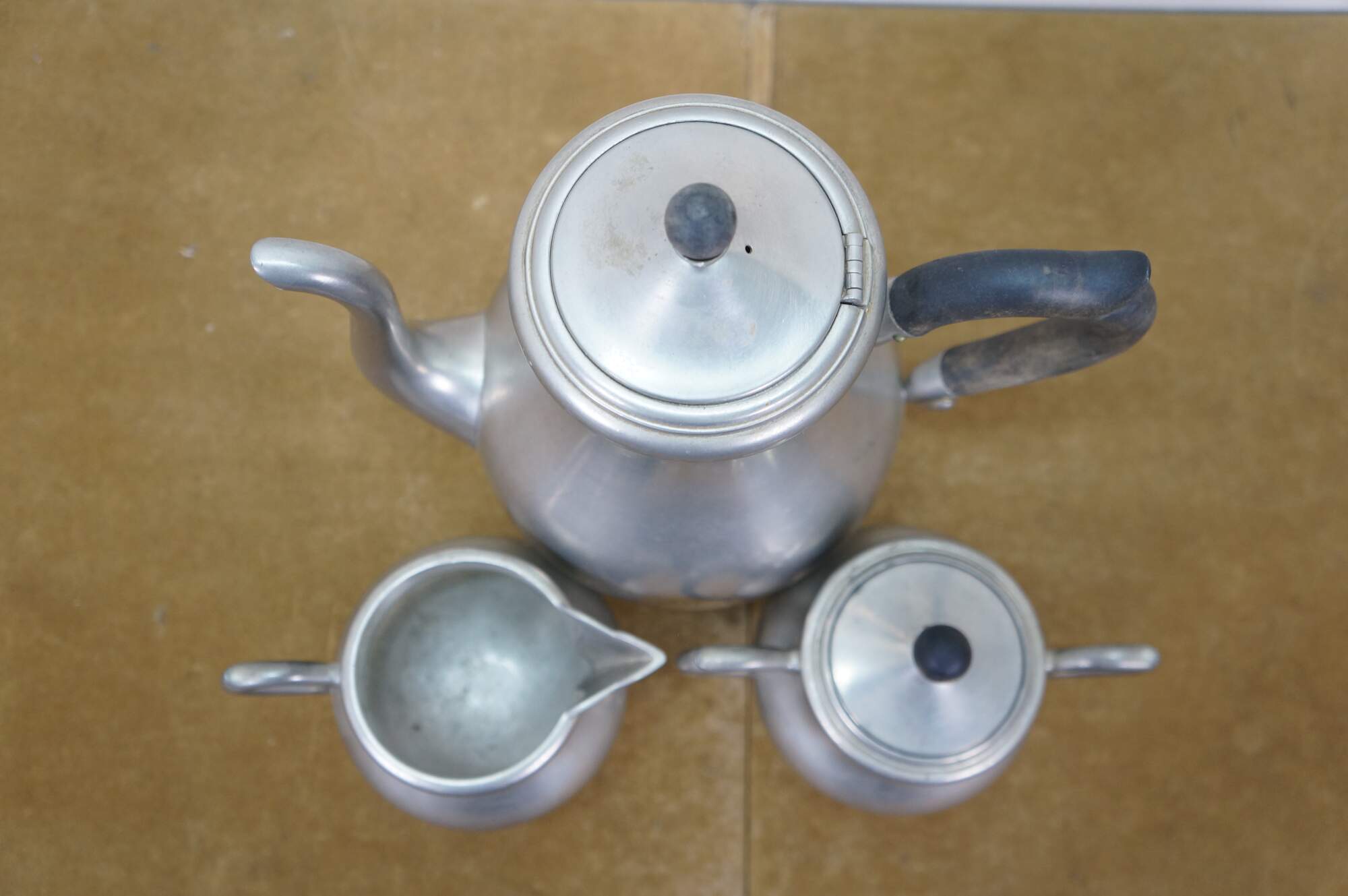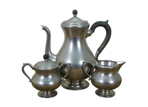 Vintage 20th century KMD Royal Holland Pewter tea set including tea / coffee pot with lid, sugar bowl with lid, and creamer / cream pitcher. Traditional colonial / Victorian styling with wood ball finials and scrolled wood handle on the teapot.