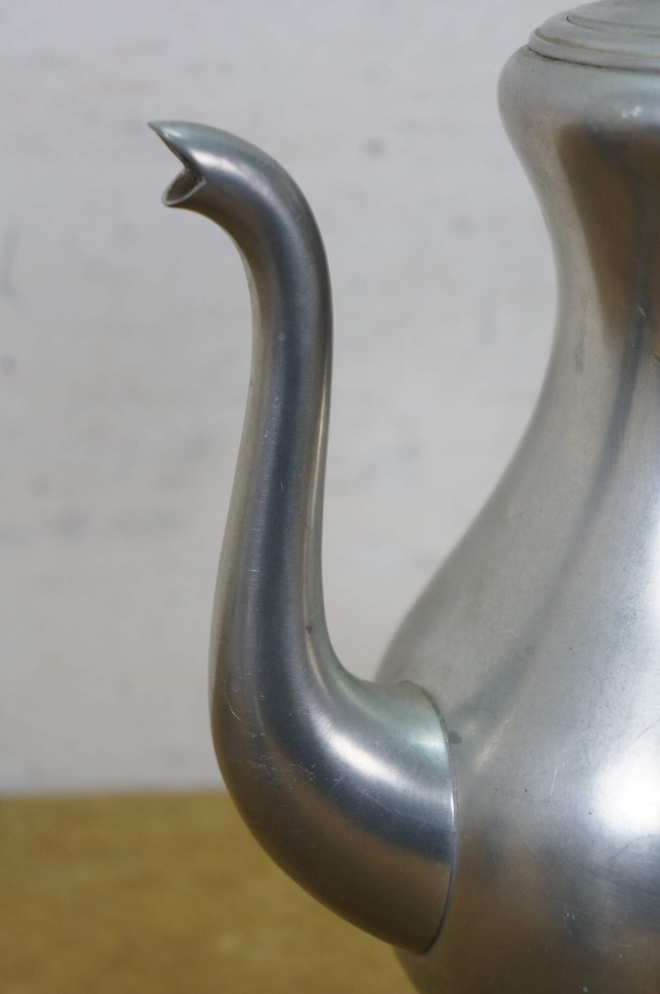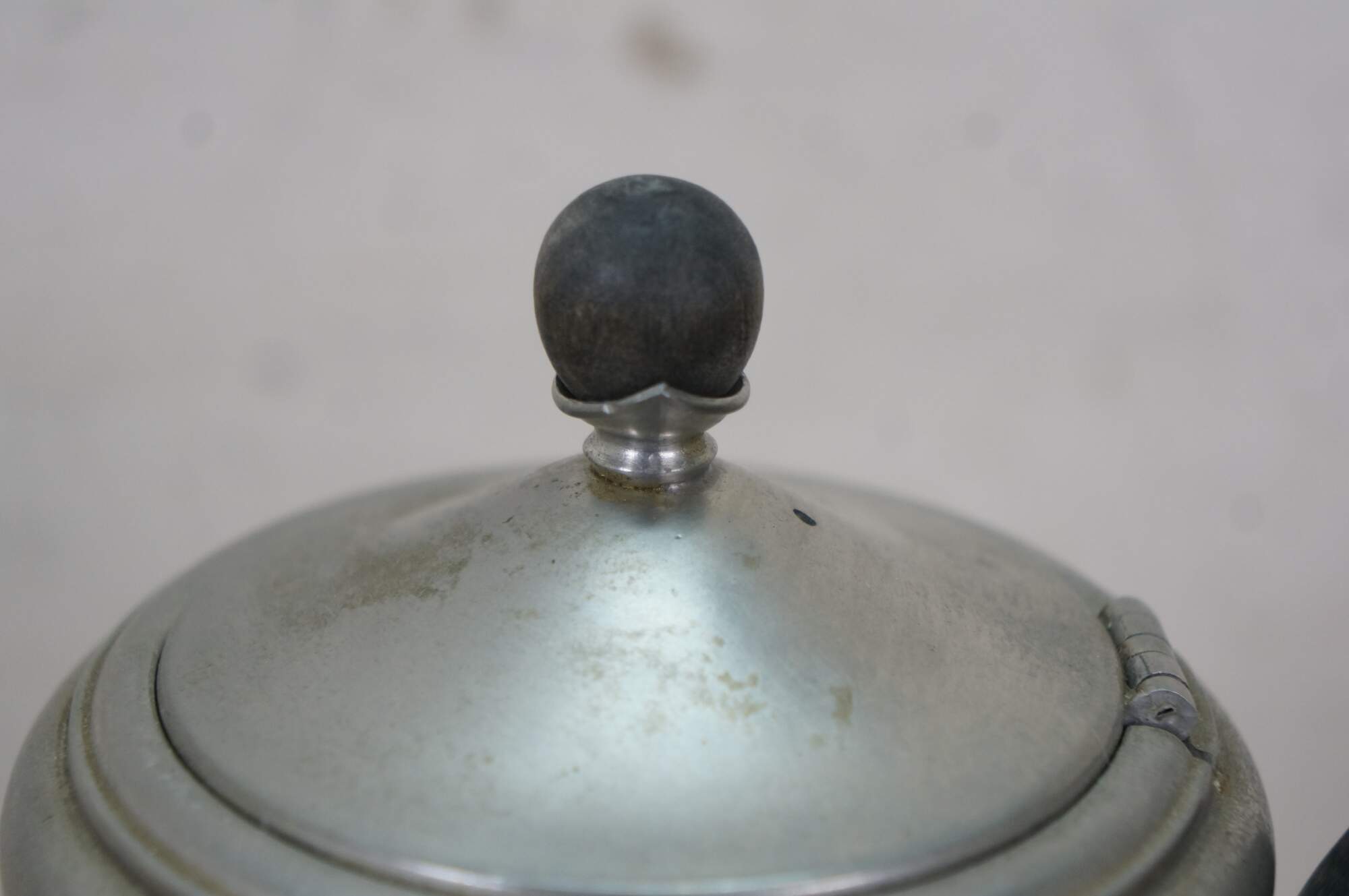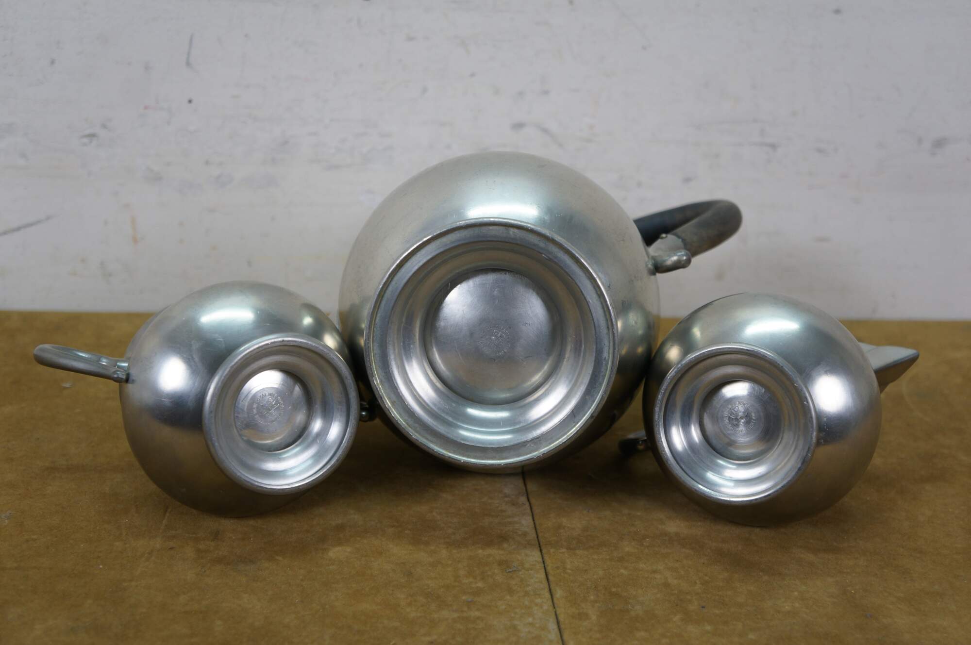 Vintage 20th century KMD Royal Holland Pewter tea set including tea / coffee pot with lid, sugar bowl with lid, and creamer / cream pitcher. Traditional colonial / Victorian styling with wood ball finials and scrolled wood handle on the teapot.