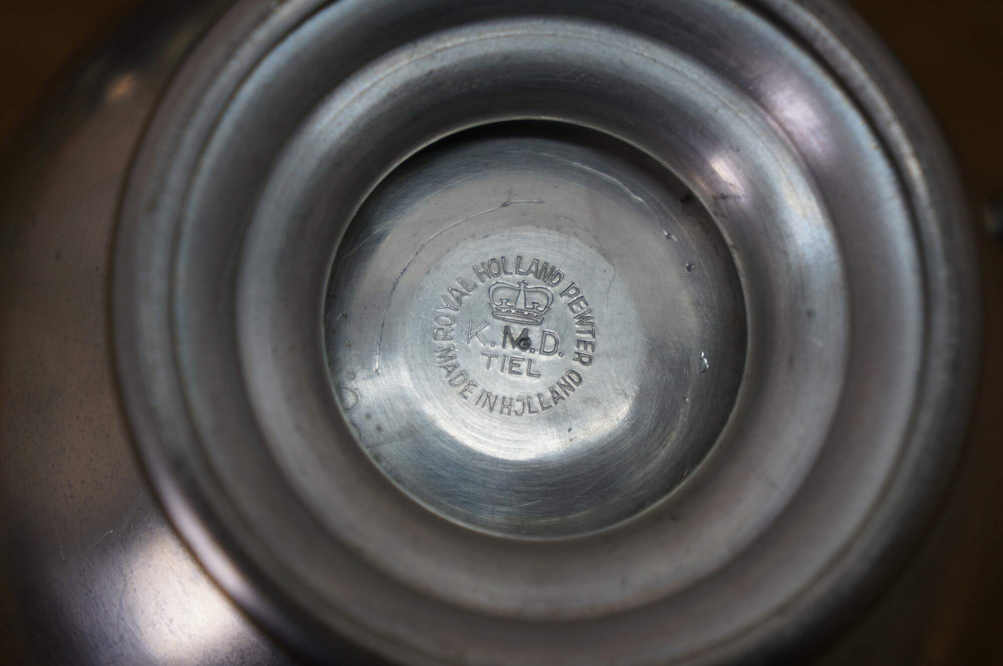 "KMD ROYAL HOLLAND PEWTER is a registered trademark owned by N.V. KONINKLIJKE METAALWARENFABRIEKEN VOORHEEN J.N. DAALDEROP & ZONEN. The company was founded in 1880 by J.N. Daalderop. Household items were manufactured in the style of the new art, a sleek variant of Art Nouveau. These were crockery, pots and dishes, kettles, and kerosene and gas lamps. In 1917, the company was converted into a public limited company, the Royal Metal Goods Factory formerly J.N. Daalderop and Sons. Around this time, household electrical appliances came into use and Daalderop added to the production range. This started with an electrically heated shaver tray, and soon boilers were also manufactured. The style of the products evolved to that of art deco and the Amsterdam School. The family business was under the undisputed leadership of Johan Daalderop (1883-1961). The Second World War meant a temporary setback: looting of inventory by the German occupying forces and destruction of the company building by Allied fire. But after the war the company revived and covered almost all facets of light metal working, with its own stamping and tool shop, stamping shop, forcing shop, sheet metal shop, metal turning shop, copper and tin foundry, polishing and grinding shop, electroplating shop and paint shop and finally the assembly department. Copper and pewter articles and gas cylinders, jerry cans, lighting items, electric heating devices and hot water reservoirs were produced. A specialty of the company remained the manufacture of pewter products. The Royal Holland Pewter trademark was filed on 26 Mar 1964 and registered on 21 June 1966. In 1969, the family business merged with another family business in a partly related sector, Etna. The merged company was then taken over by Internatio-Müller. In the 1970s, short-time work and mass layoffs followed. In particular, tin production, half of which was exported to the US, was under pressure. Like that of household objects, it was discontinued in the 1980s. The company focused on heating equipment, especially boilers. As of 14 Jan 1989, the Royal Holland Pewter trademark was allowed to expire. Also, in 1989, Internatio-Müller sold Daalderop to the Irish company Unidare PLC. In 2011, Daalderop entered into a partnership with Itho, which is based in Etten-Leur and Schiedam, and has since been called Itho Daalderop. Since 2015, Itho Daalderop and Klimaatgarant have together formed the CFL Holding. In September 2023, Itho Daalderop and Klimaatgarant were sold to Swedish heating major industrialist NIBE Industrier for 640 million euros." (Wikipedia / Trademarkia)