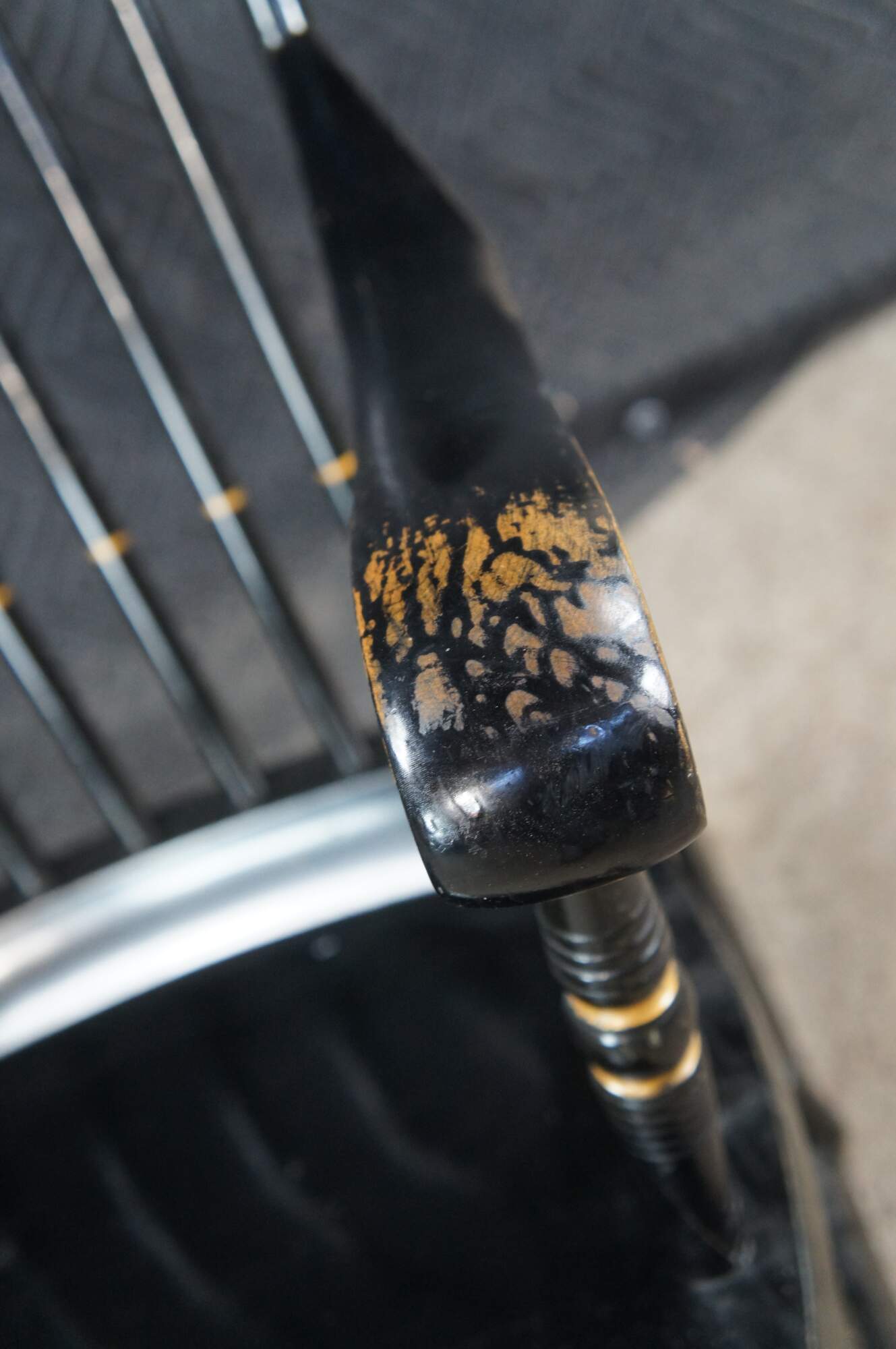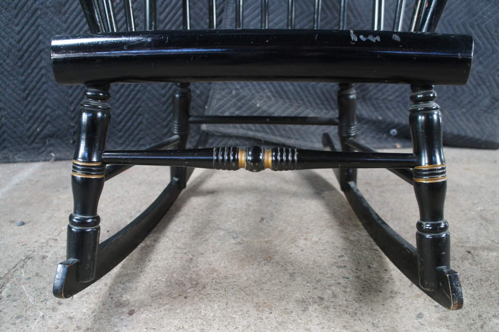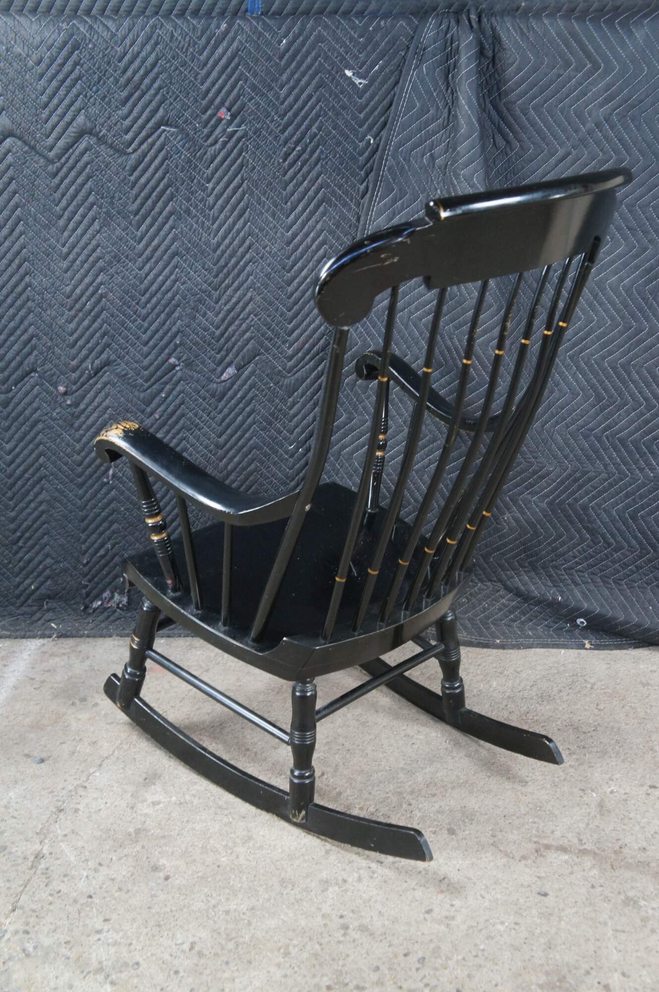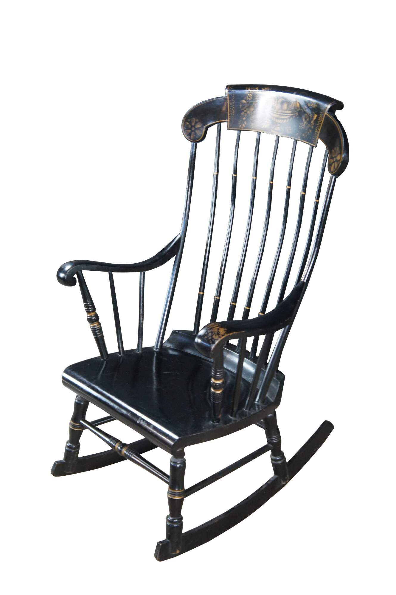 Antique black harvest Colonial Windsor Hitchcock style rocking armchair / rocker featuring an ebonized finish with gold accents and stenciled fruit.