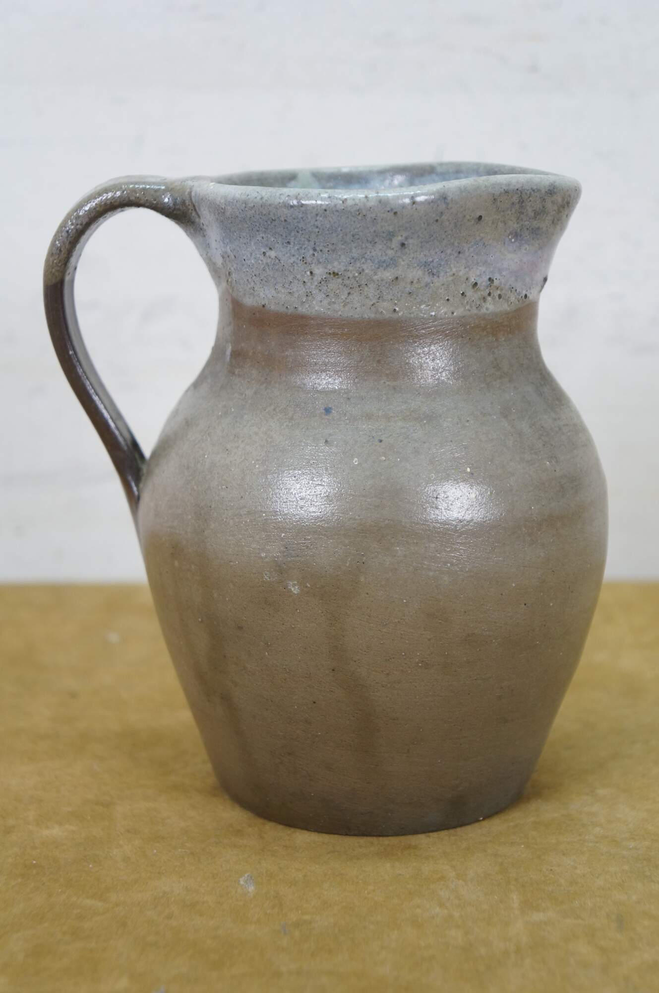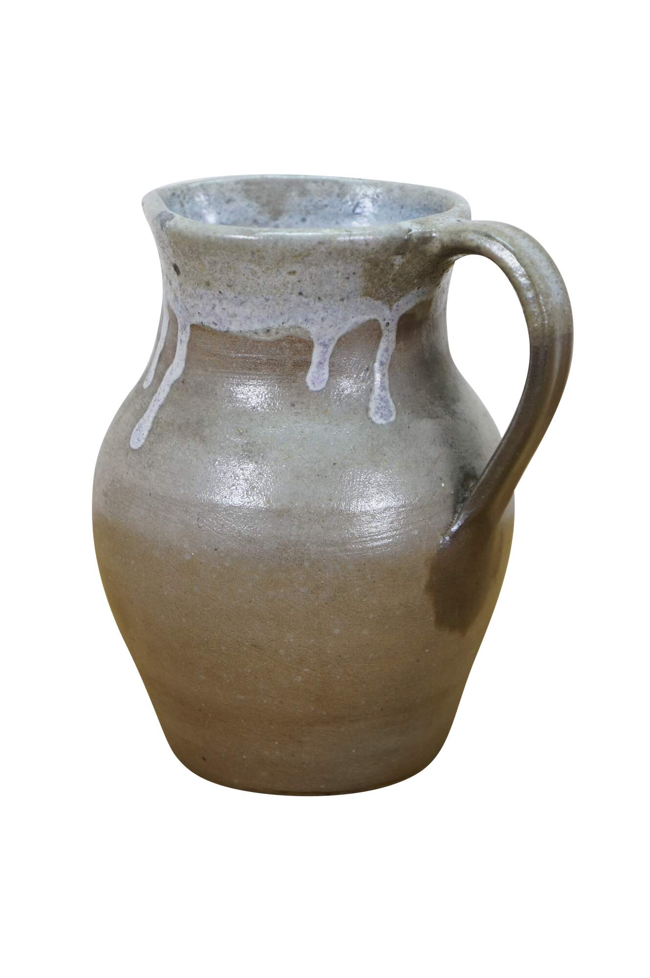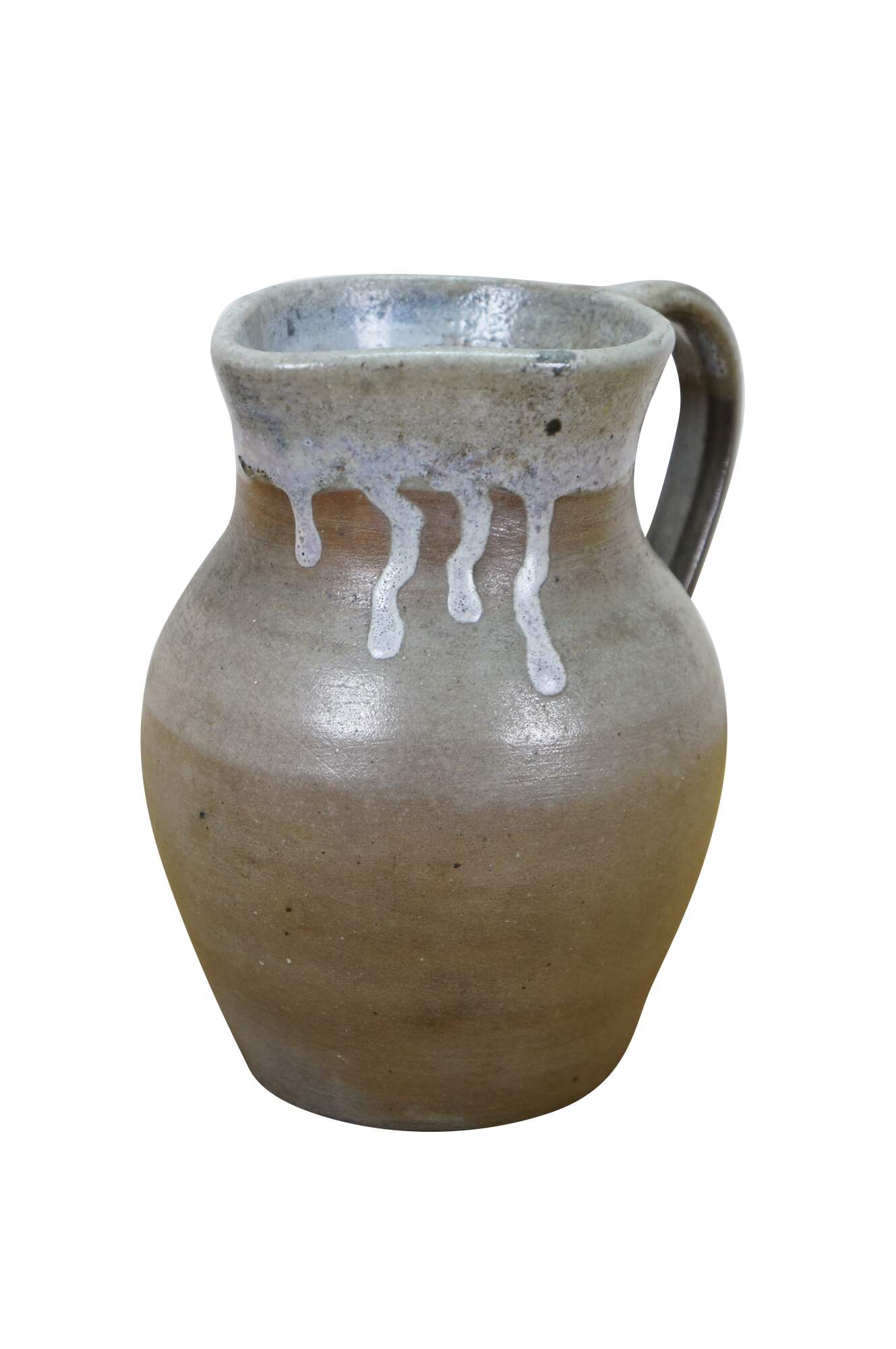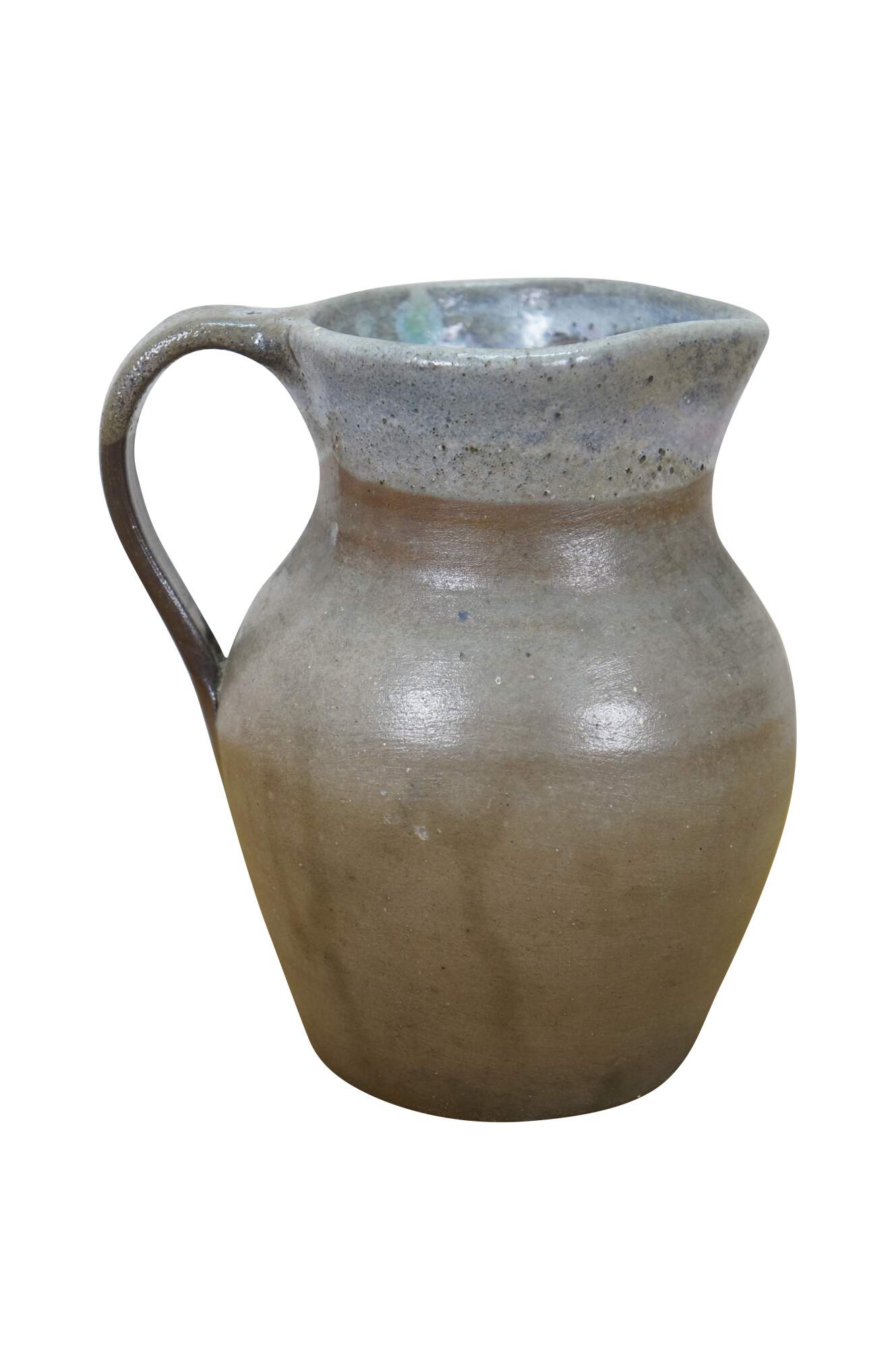 Early to mid 20th century earthenware pottery pitcher - gray salt glazed body with blue-white drip glazed rim. Crafted by North State Pottery of Sanford, NC circa 1924-1959.