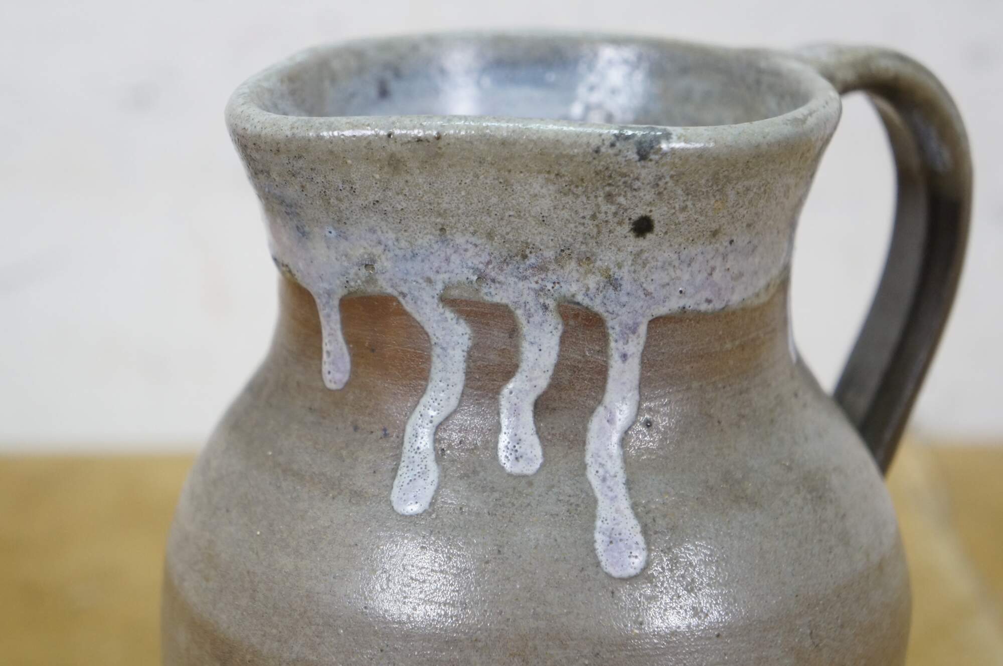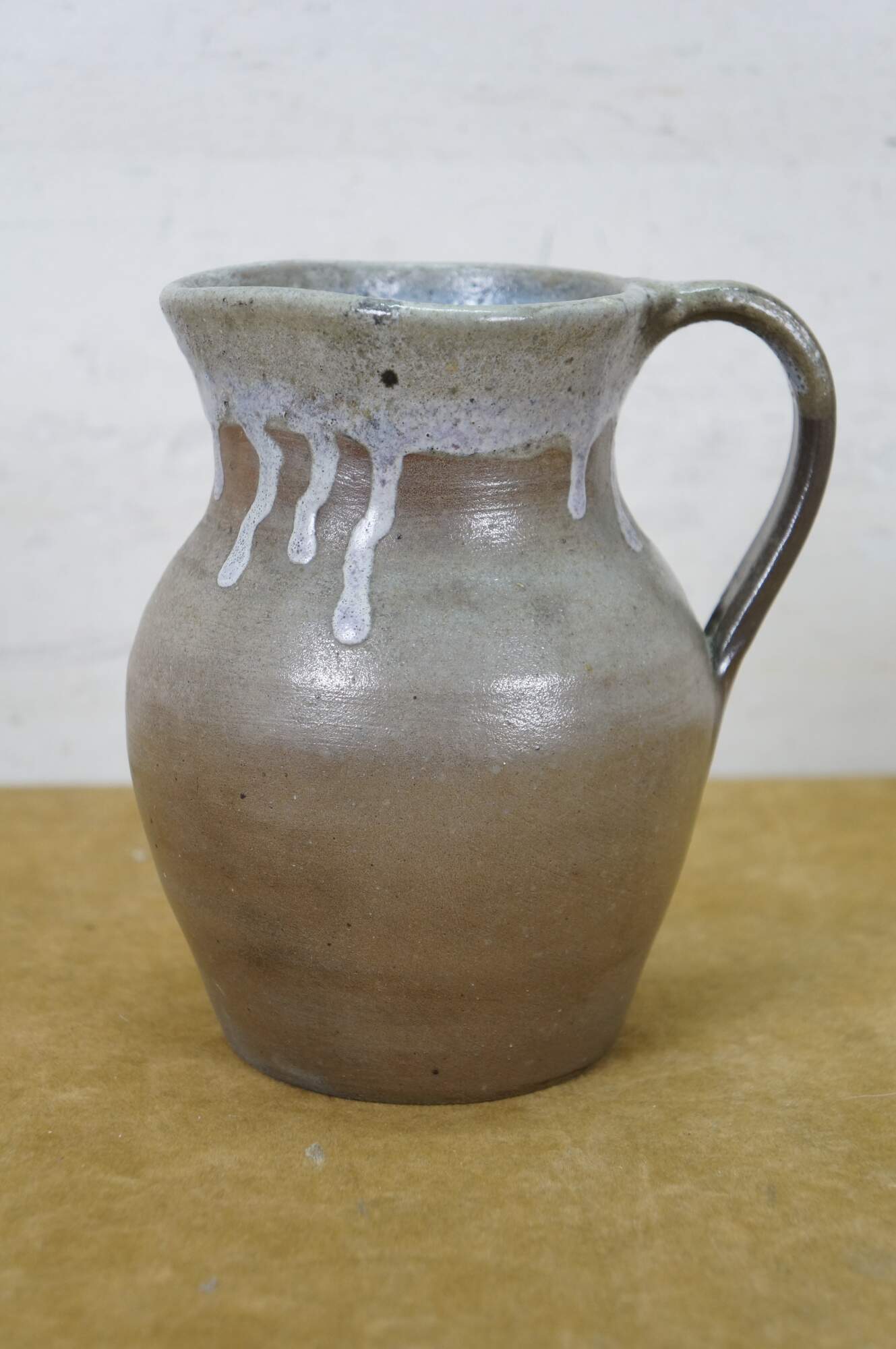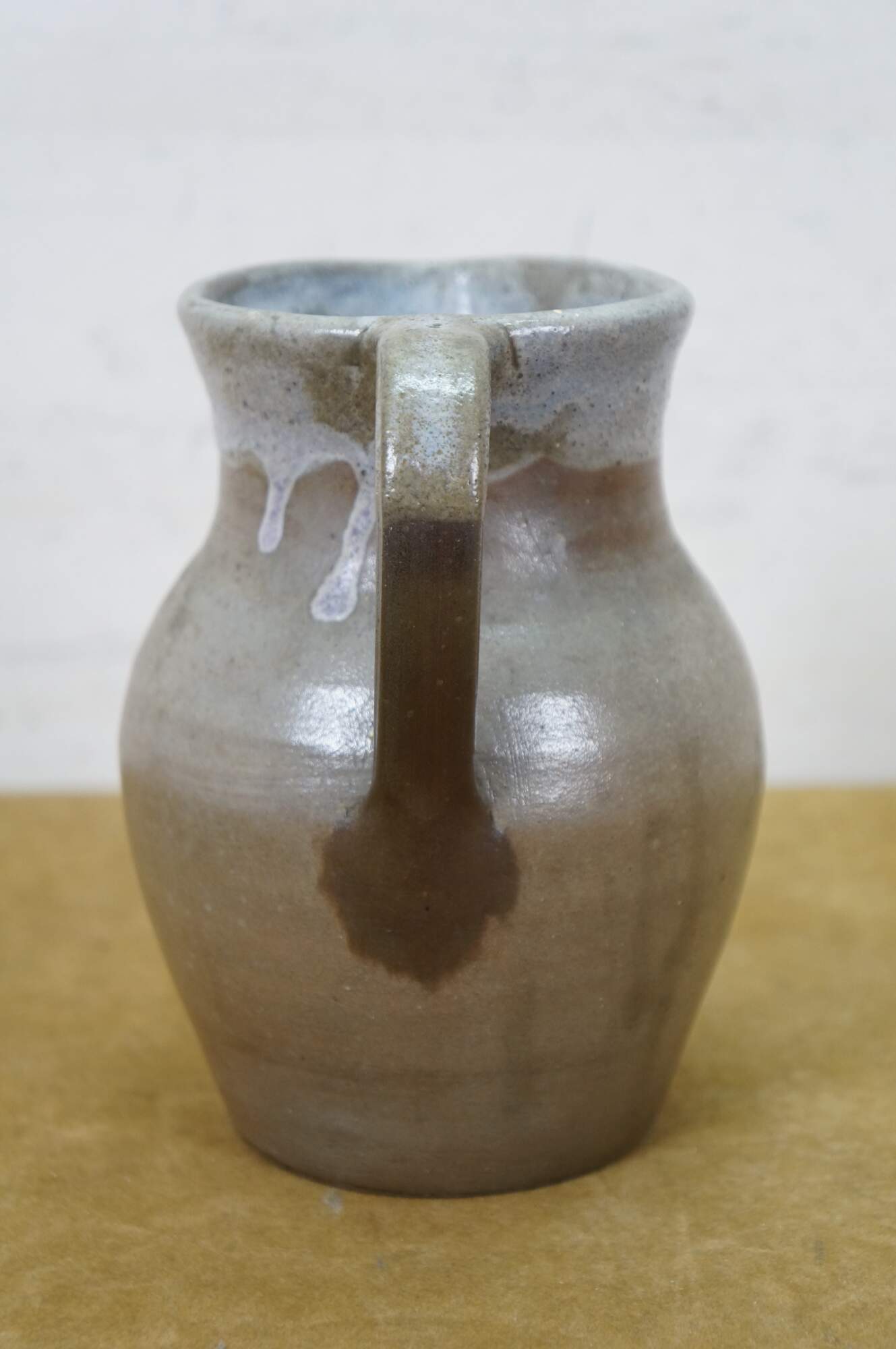 Early to mid 20th century earthenware pottery pitcher - gray salt glazed body with blue-white drip glazed rim. Crafted by North State Pottery of Sanford, NC circa 1924-1959.