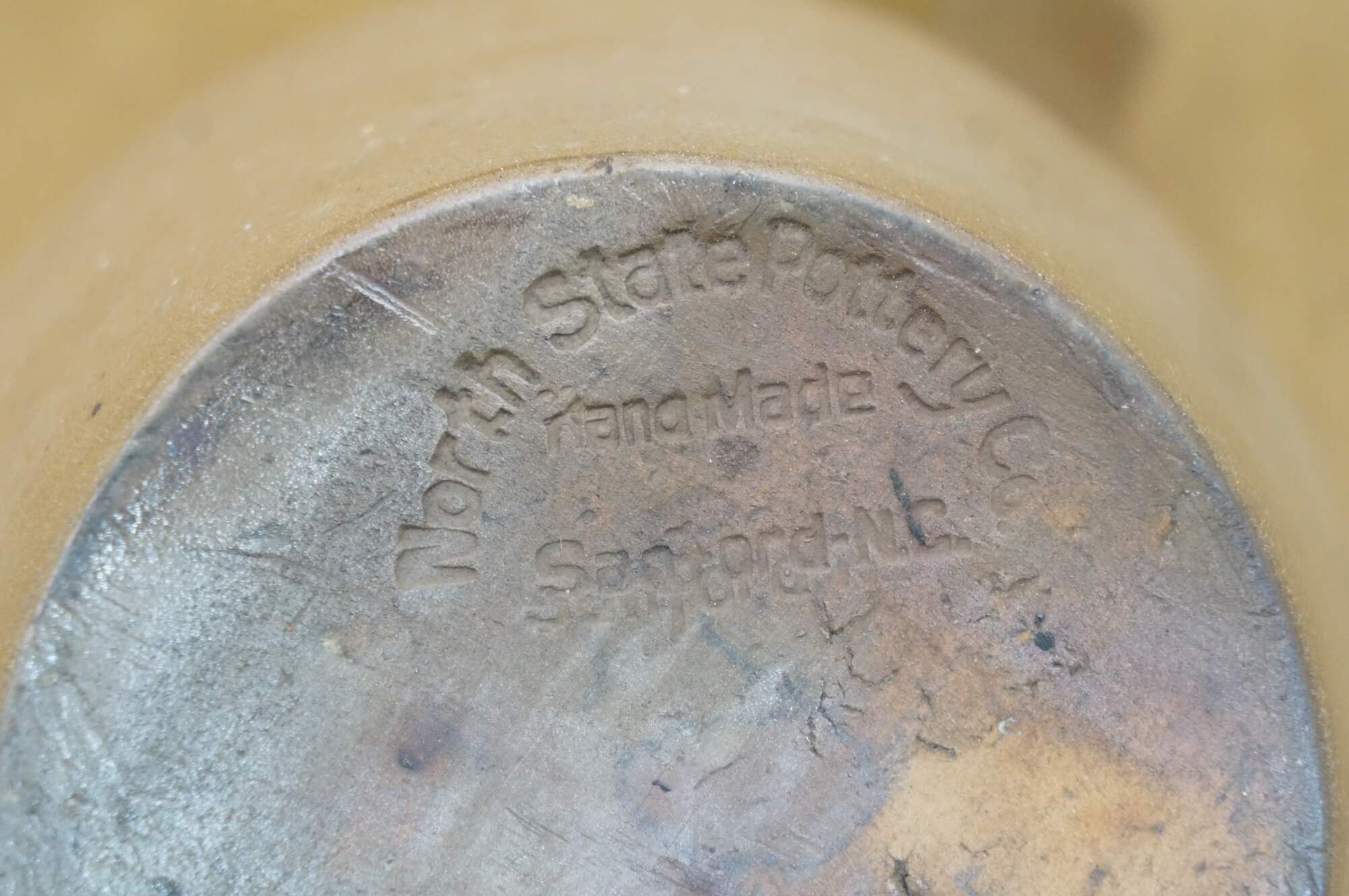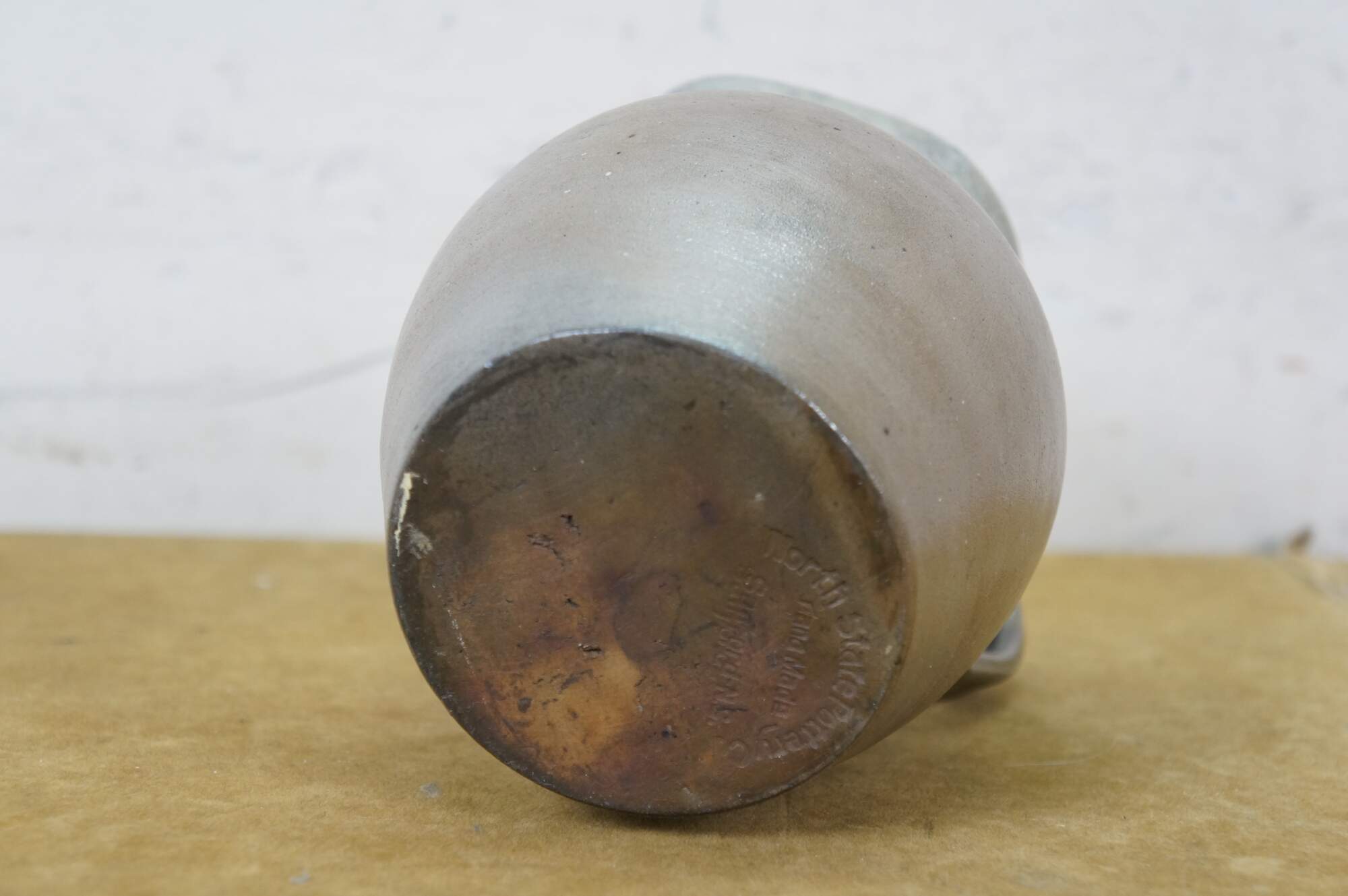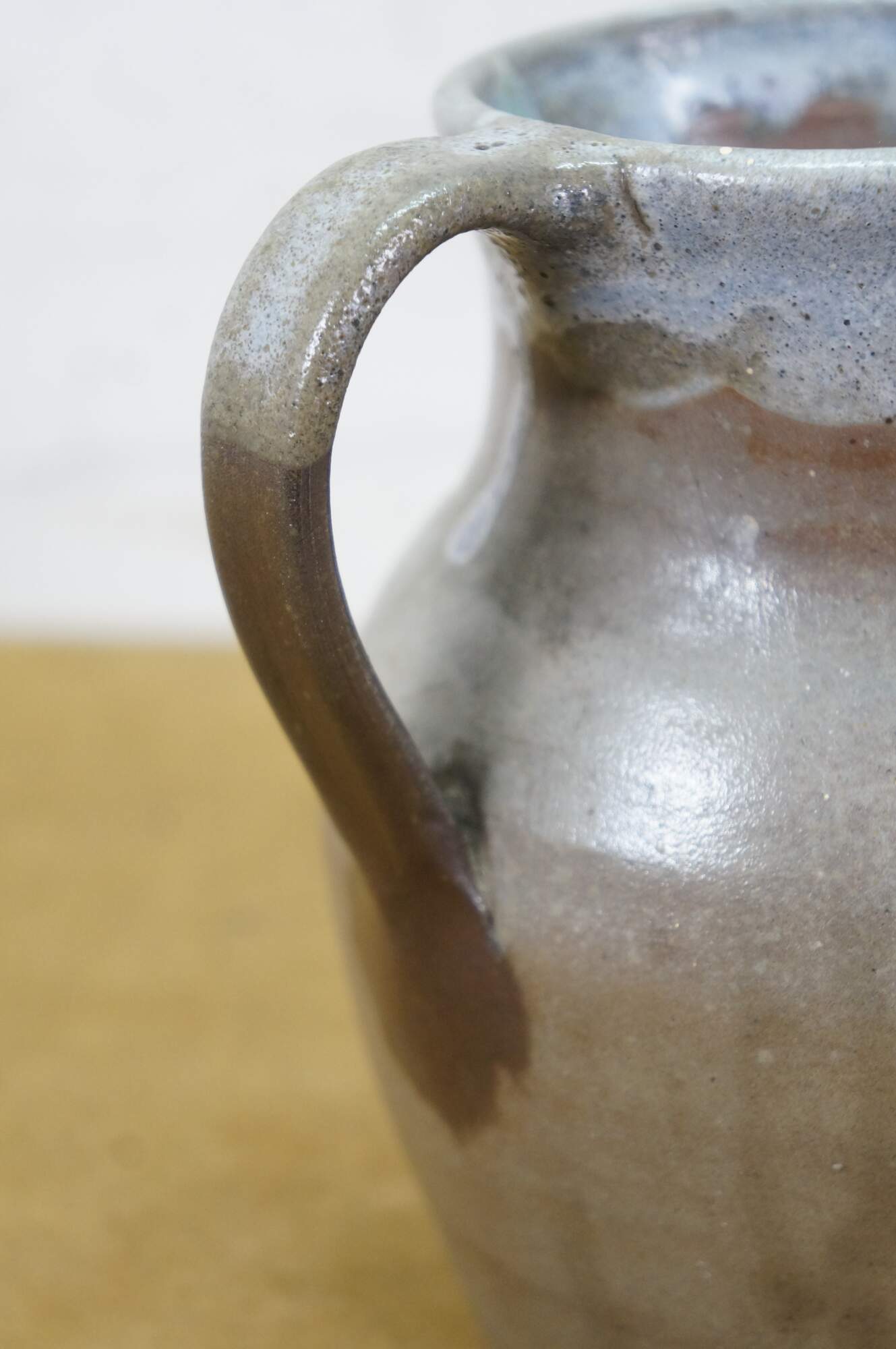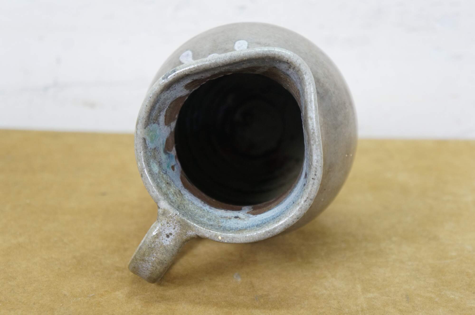 Early to mid 20th century earthenware pottery pitcher - gray salt glazed body with blue-white drip glazed rim. Crafted by North State Pottery of Sanford, NC circa 1924-1959.