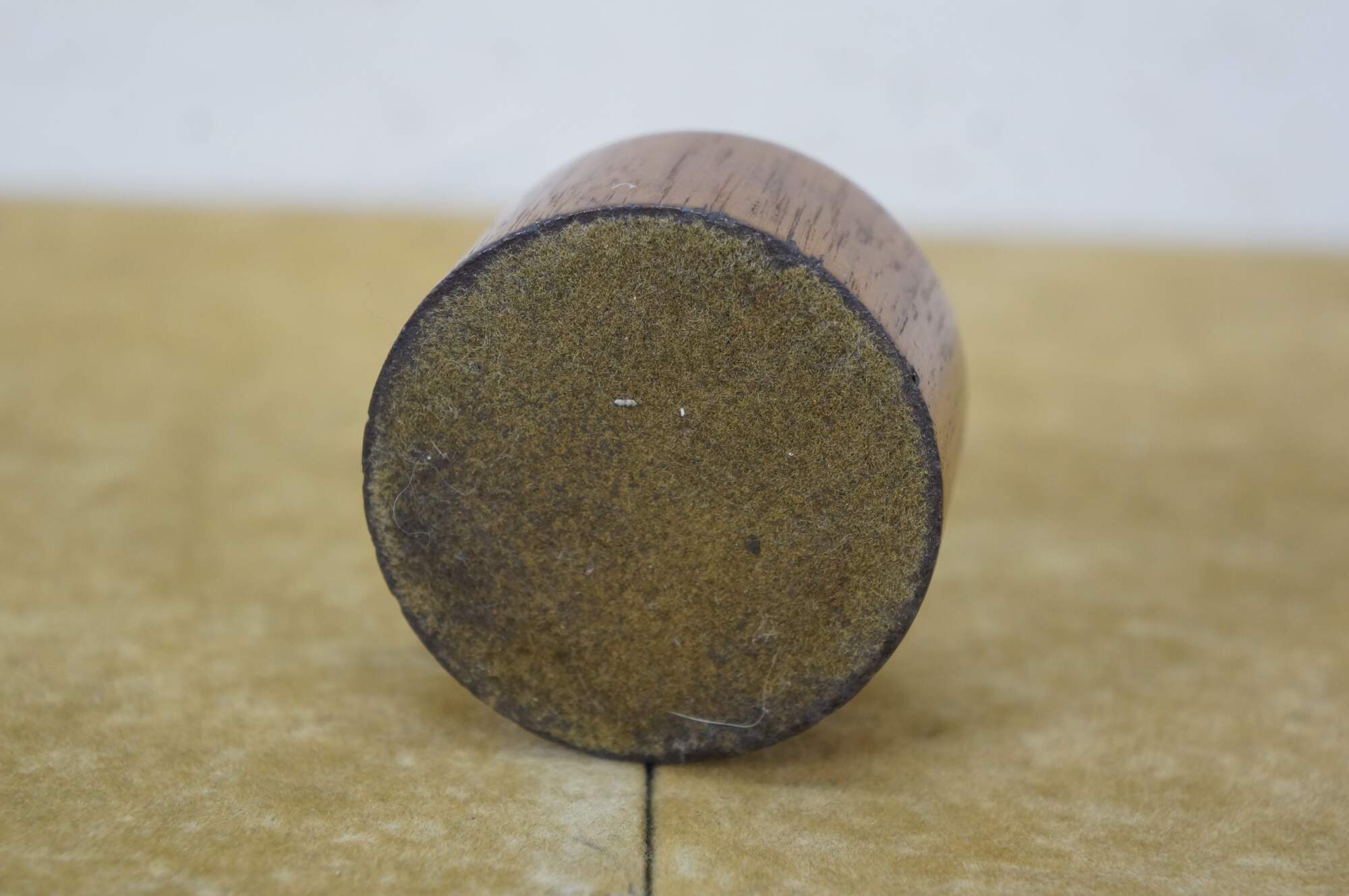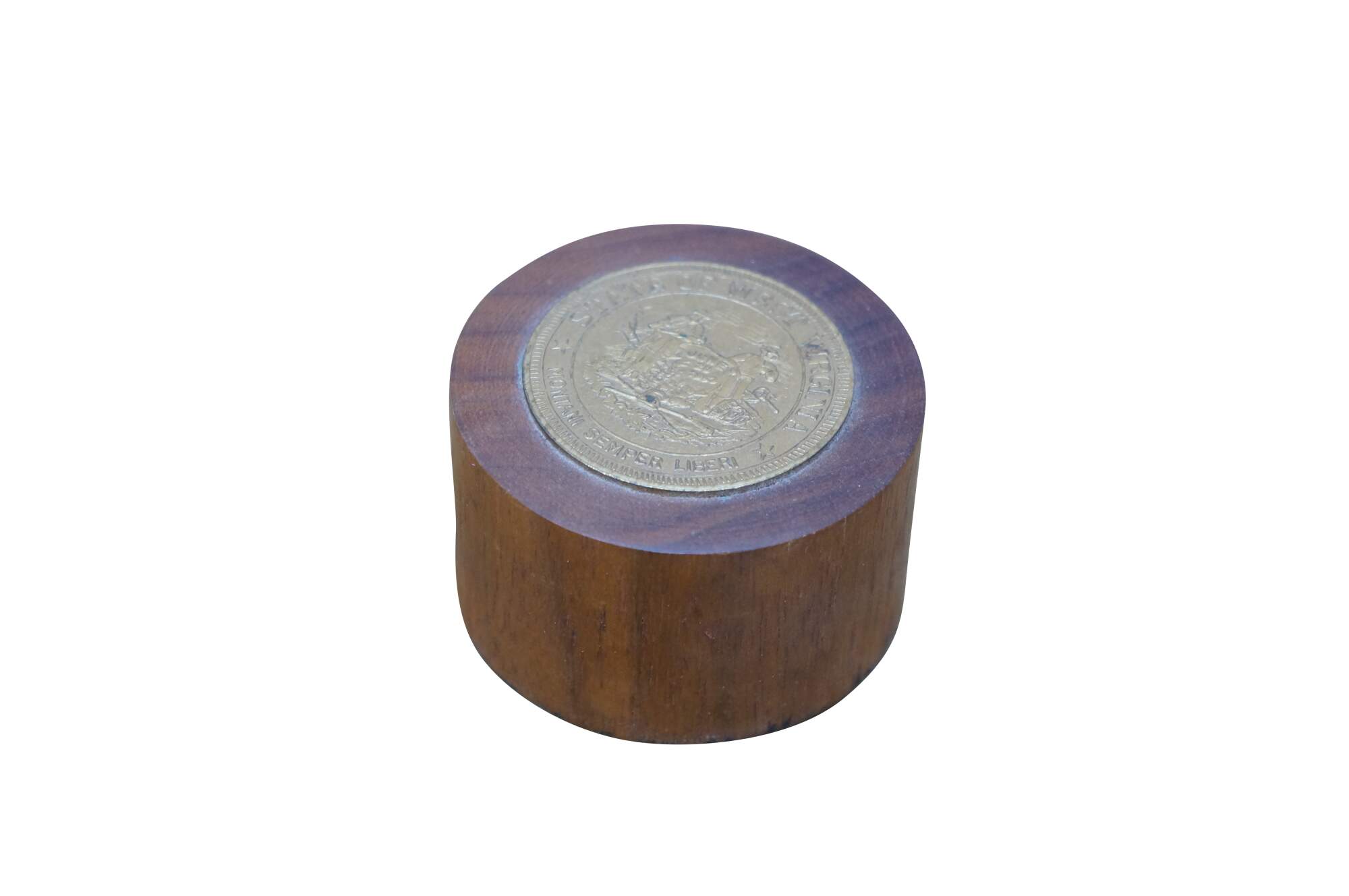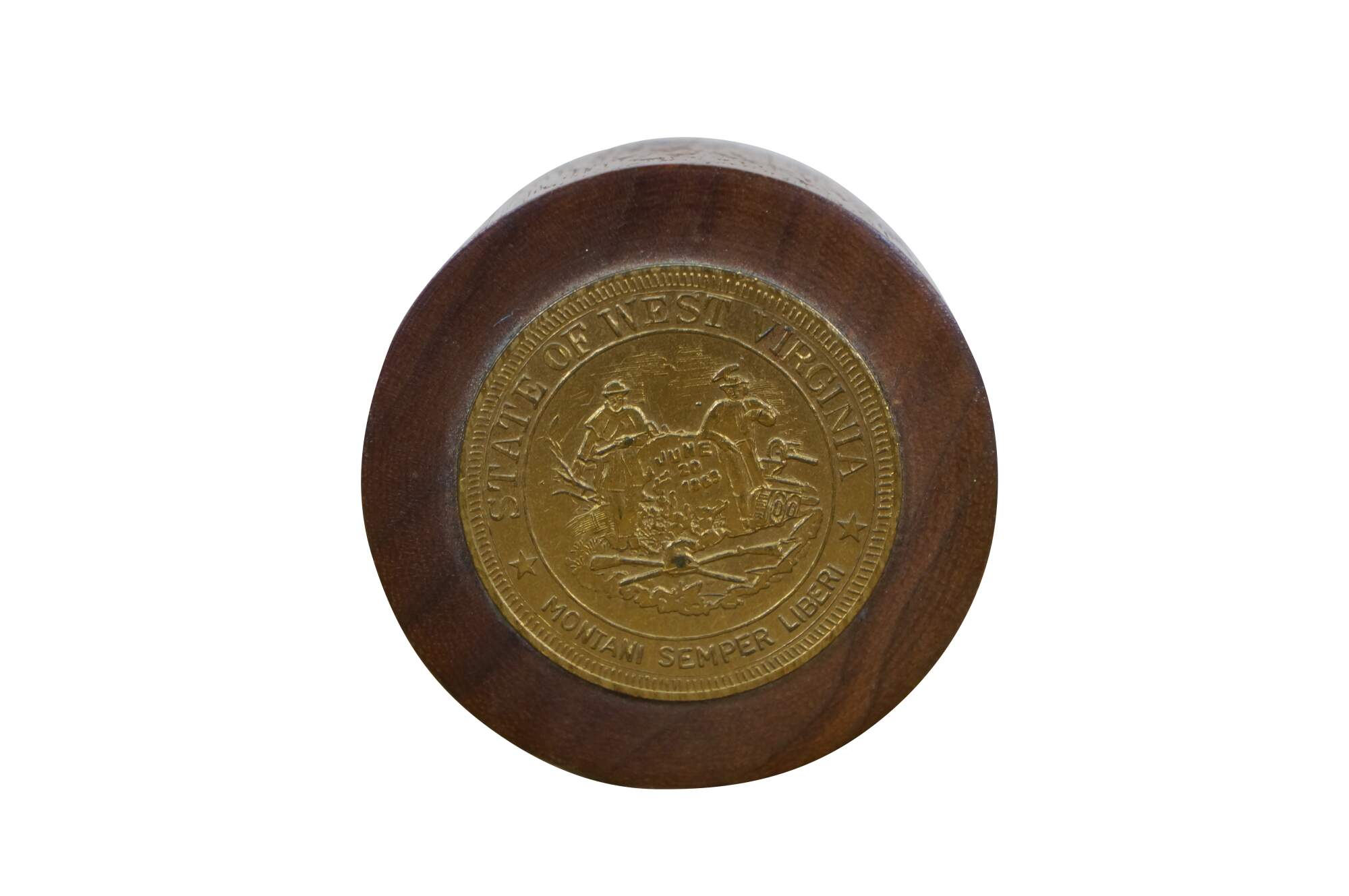 Vintage 20th century paperweight - round wooden cylinder with a State of West Virginia seal / coin / gold tone medallion inlaid in the top.