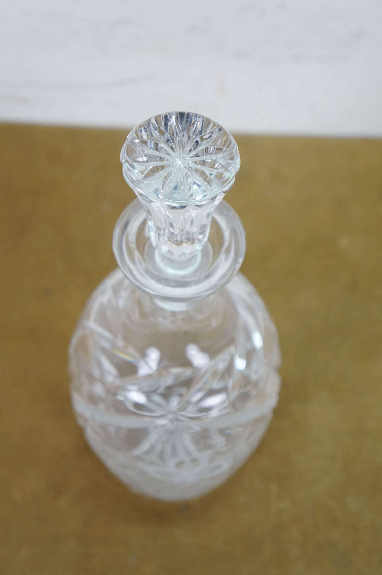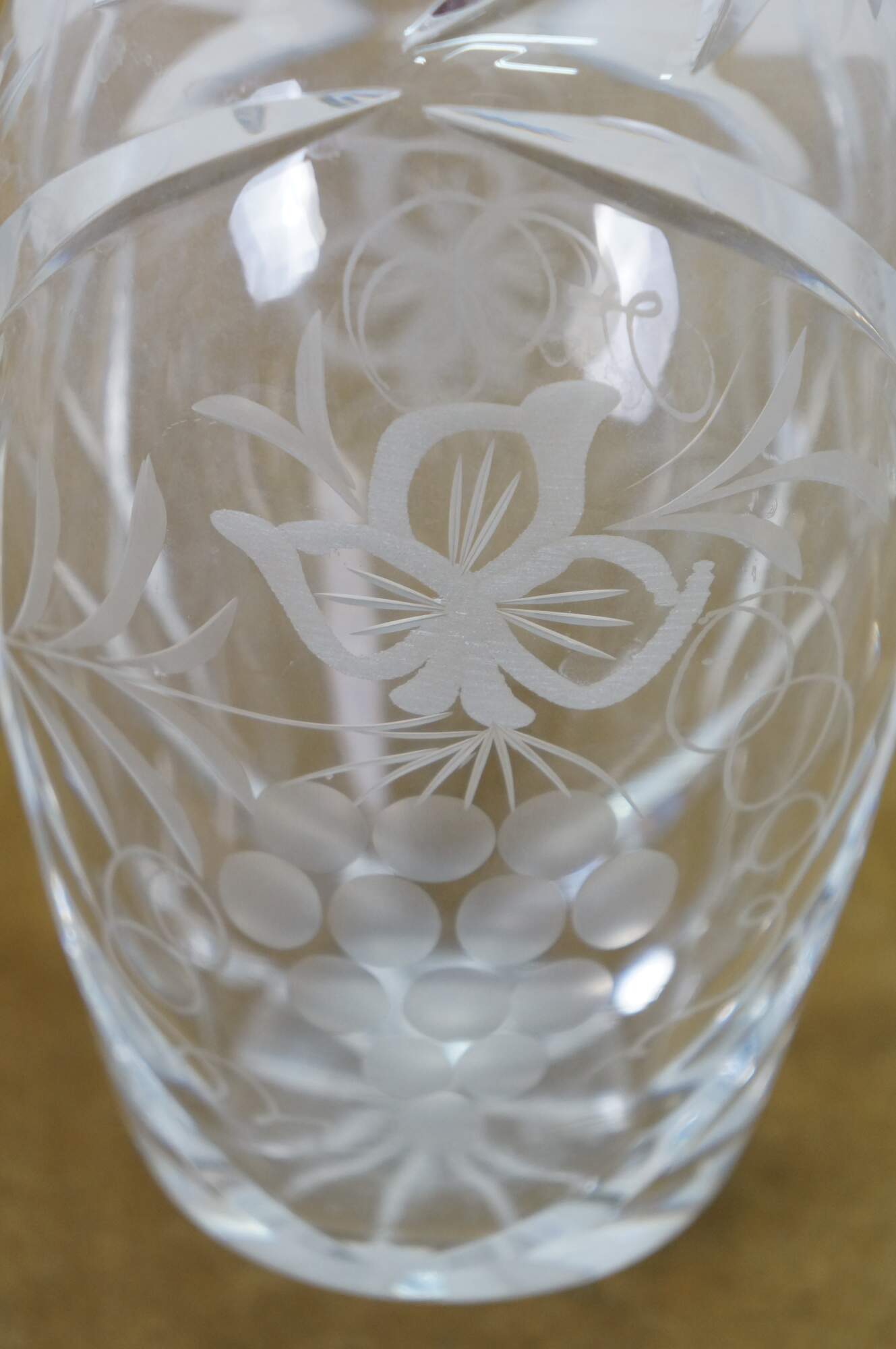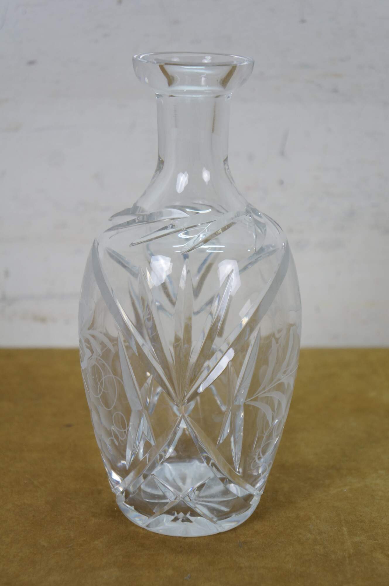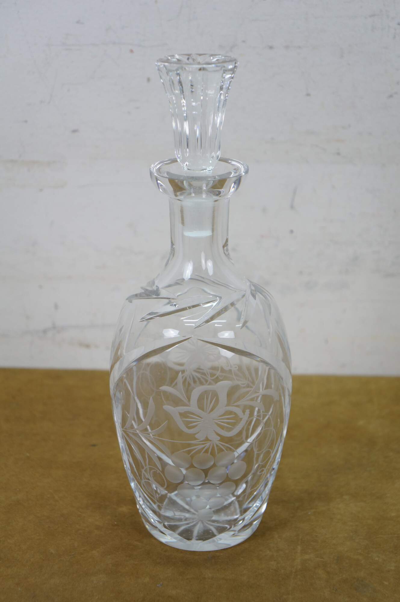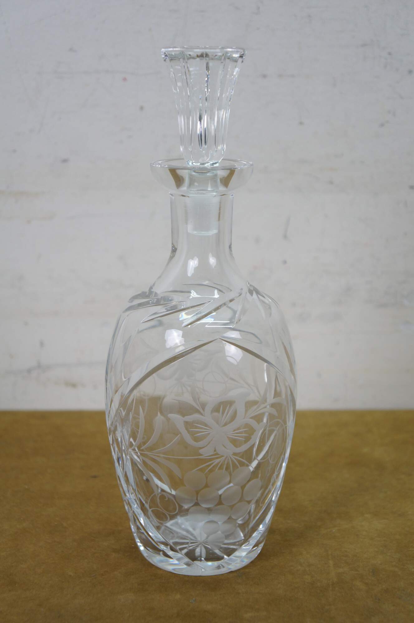 Mid to late 20th century crystal decanter / bottle with stopper, cut with criss crossed wheat sheaf shapes and etched / frosted grapevine patterns on the sides.