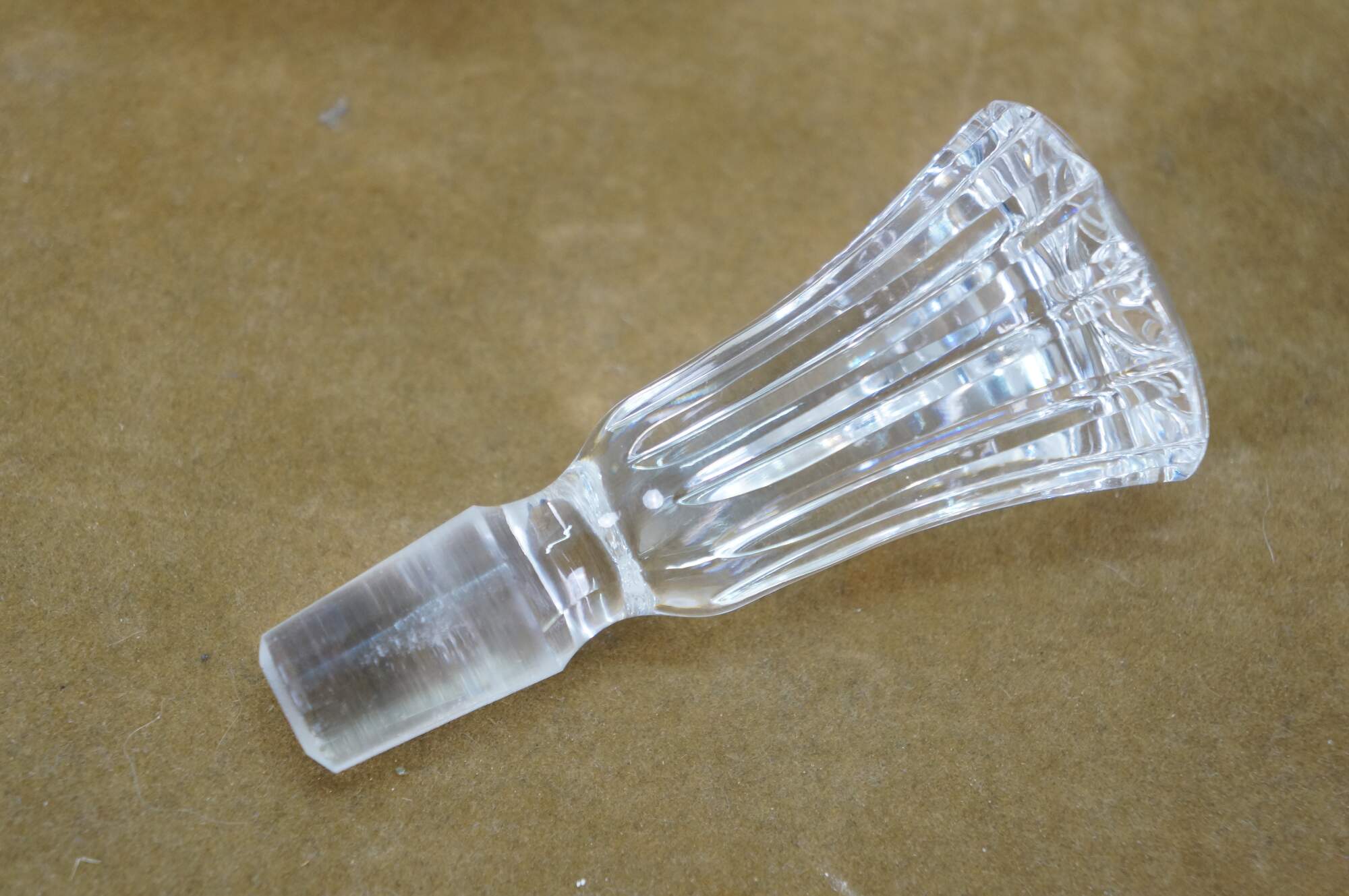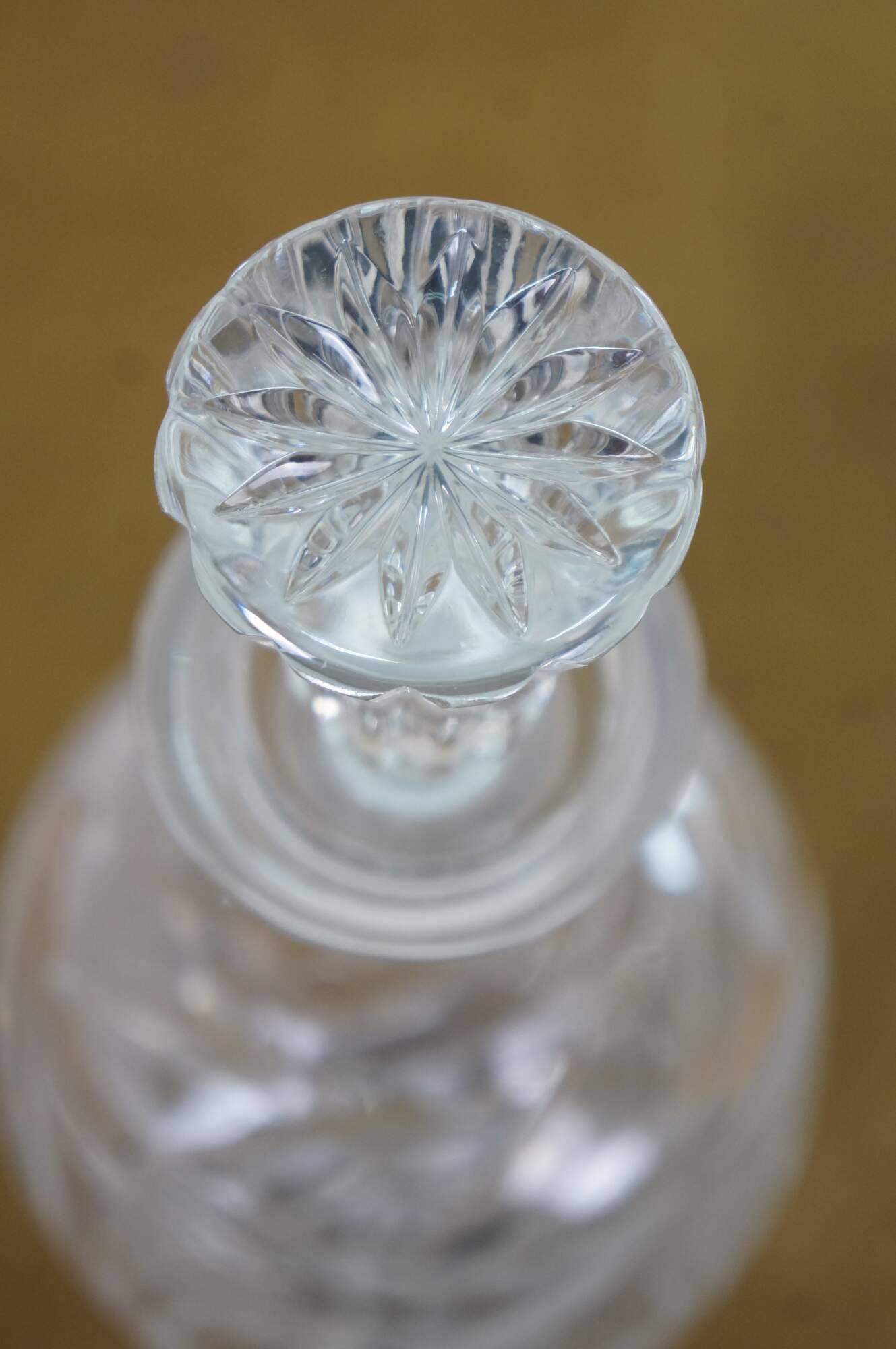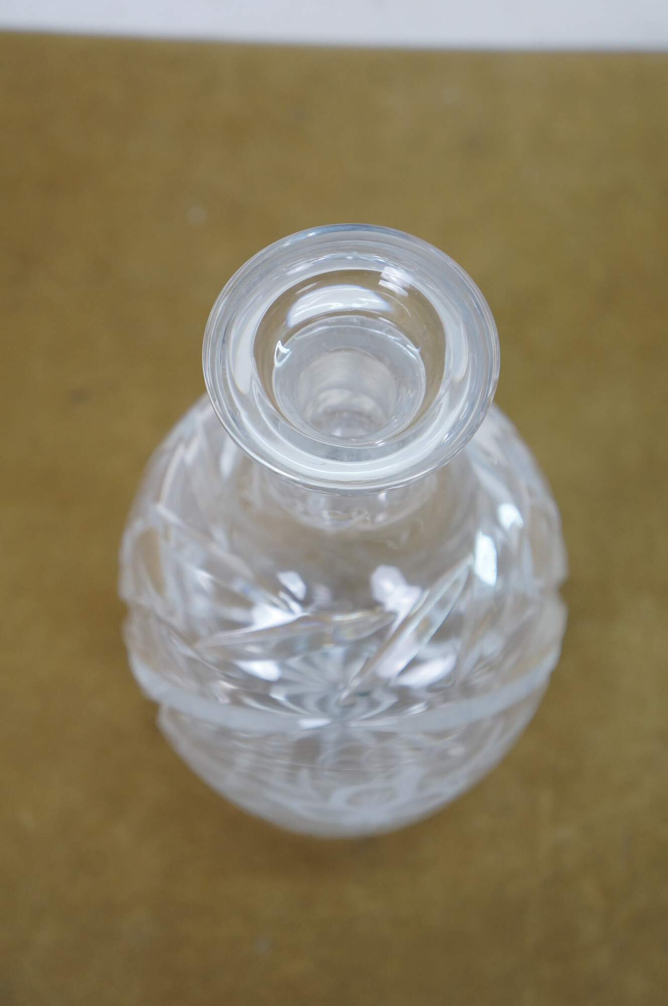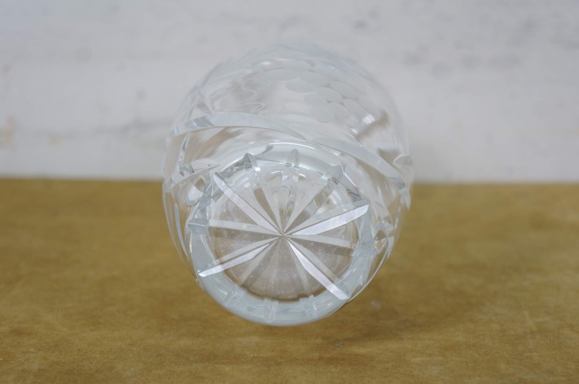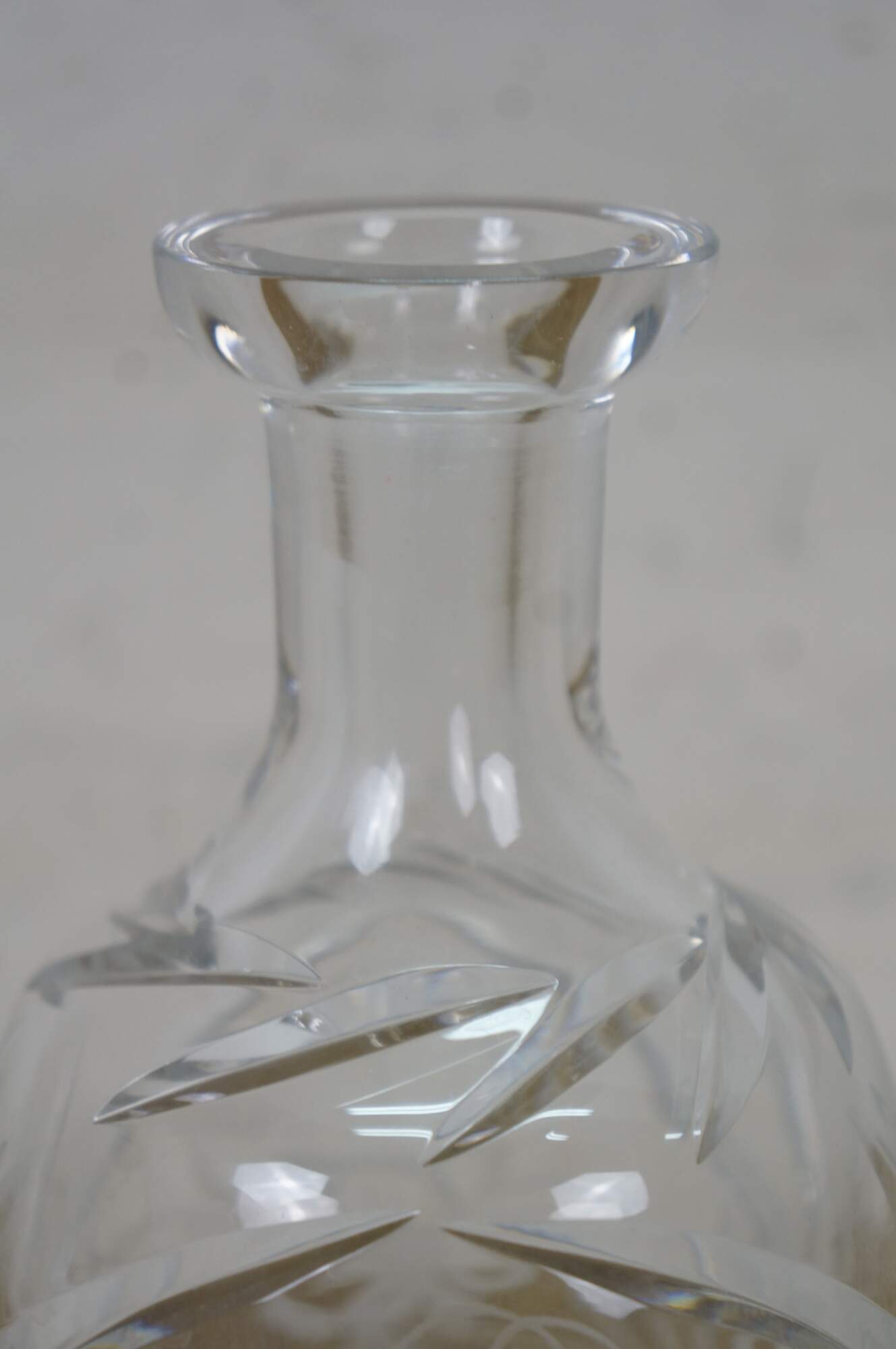 Mid to late 20th century crystal decanter / bottle with stopper, cut with criss crossed wheat sheaf shapes and etched / frosted grapevine patterns on the sides.