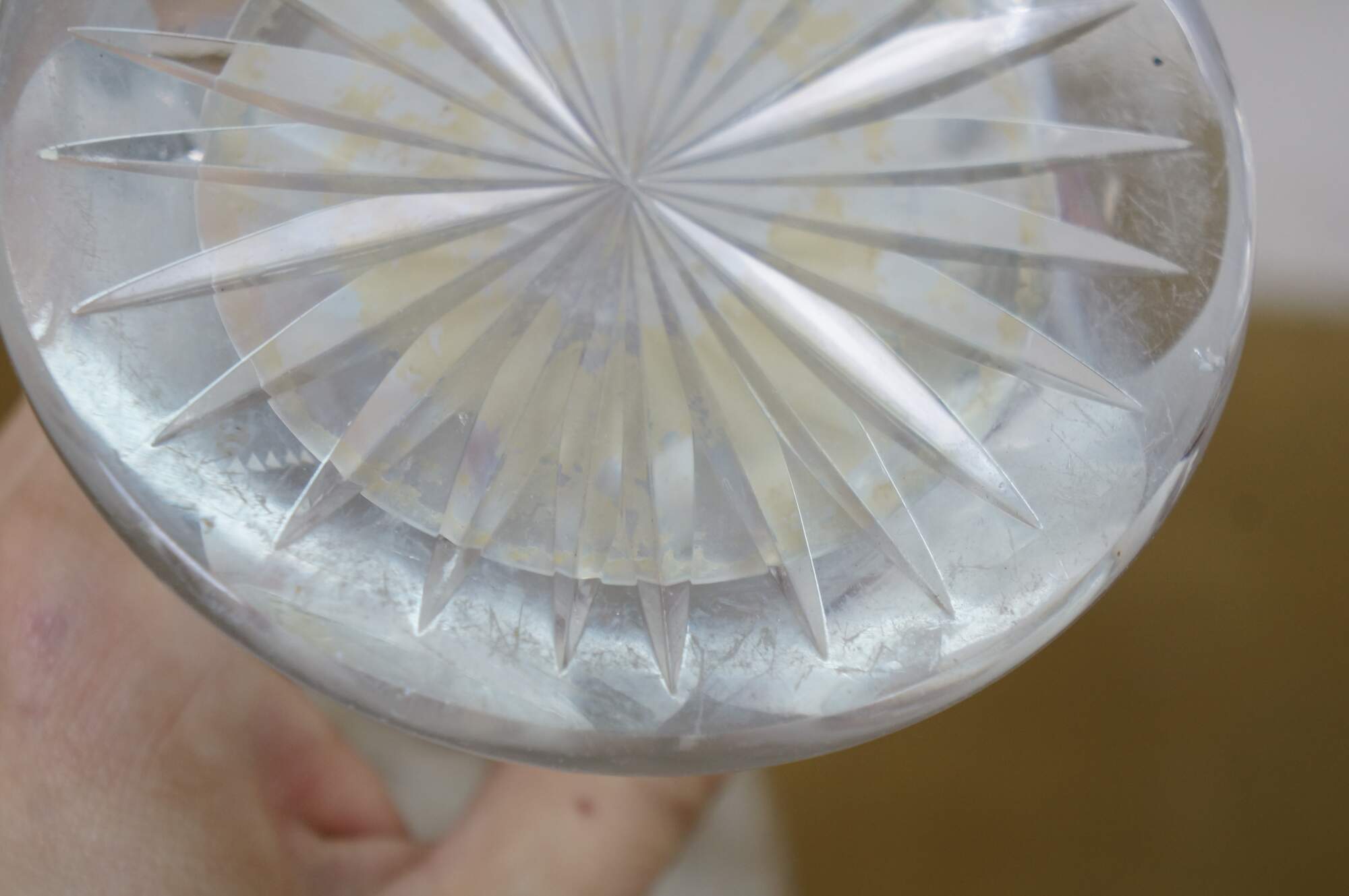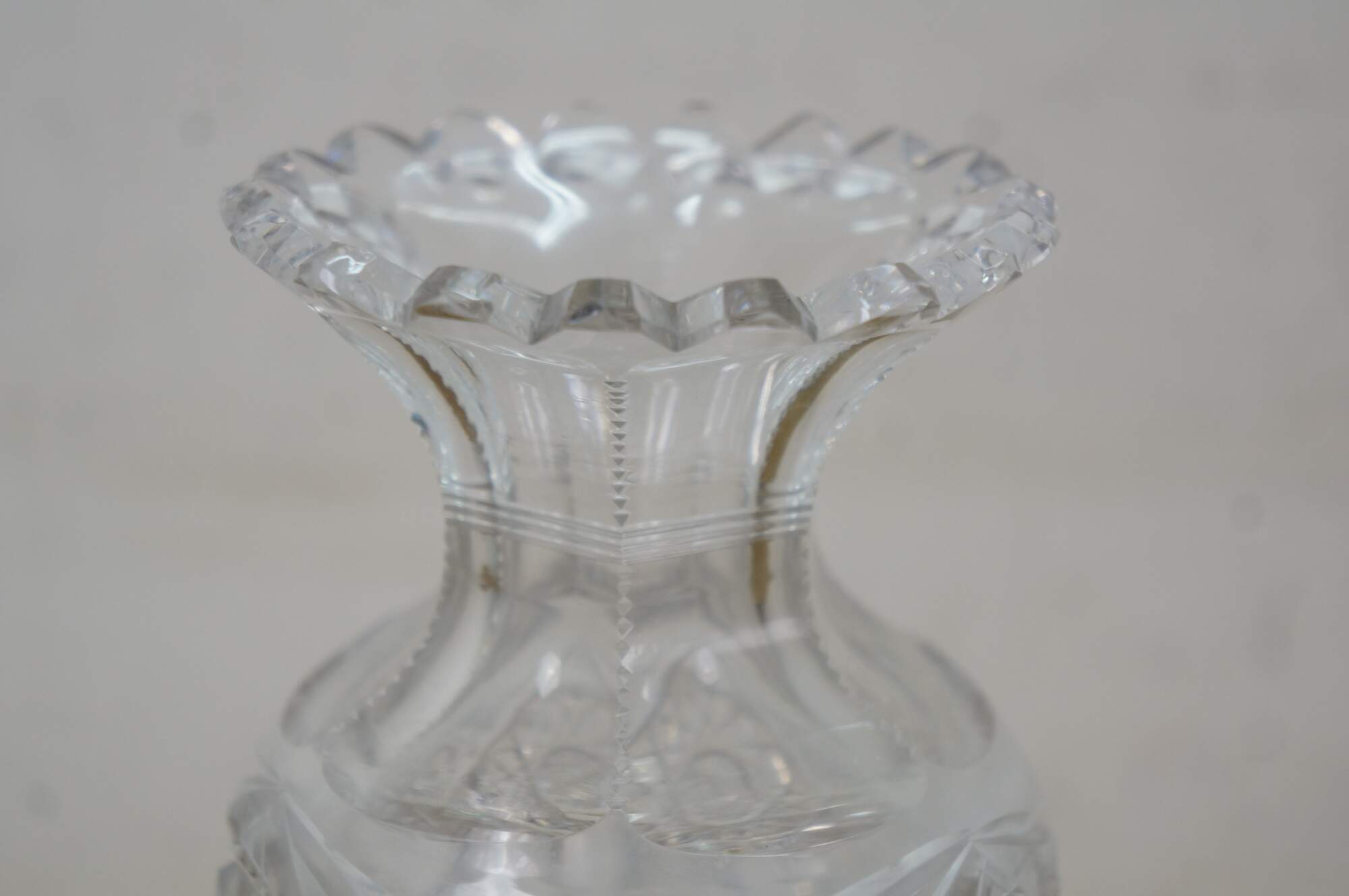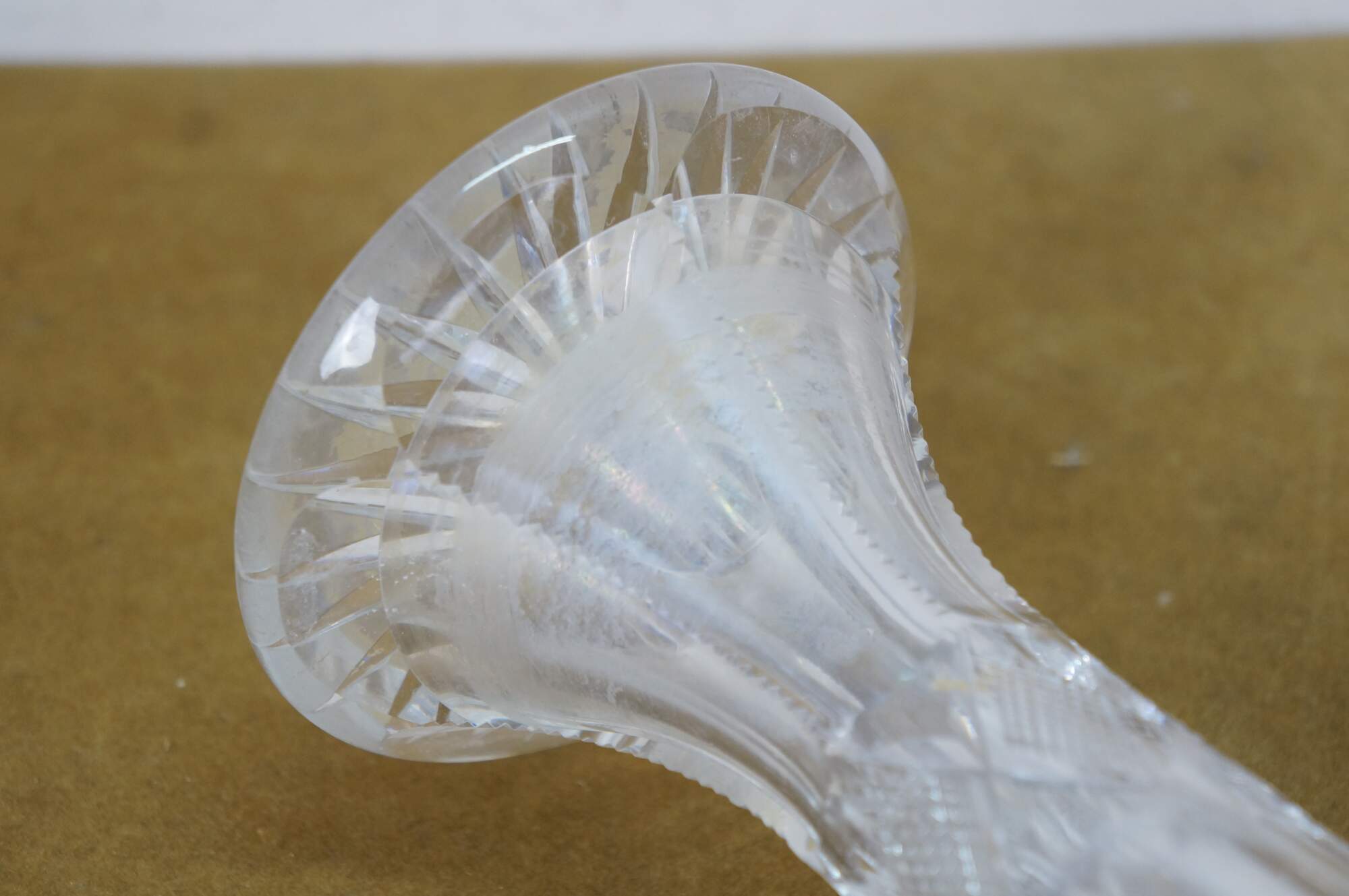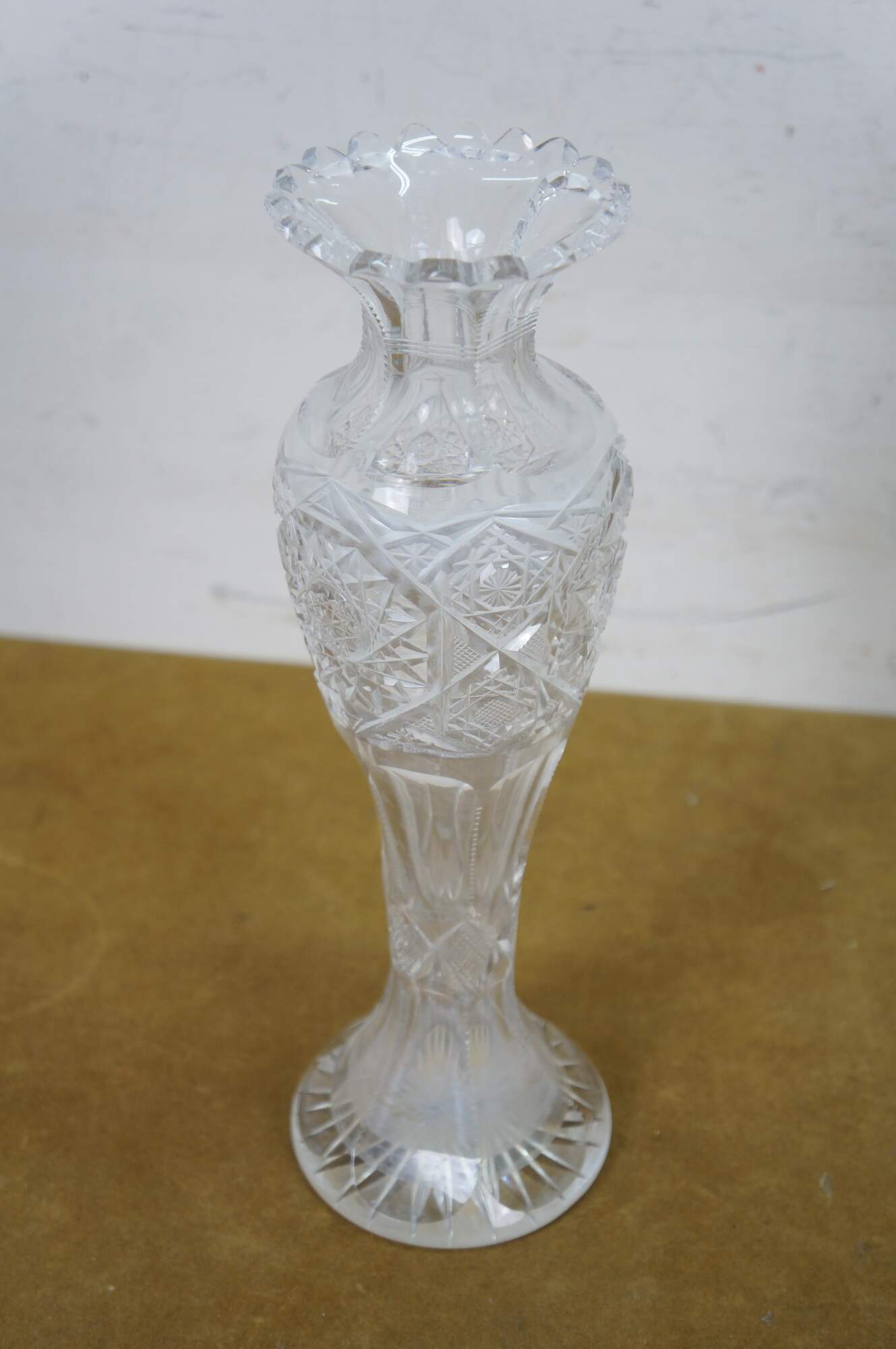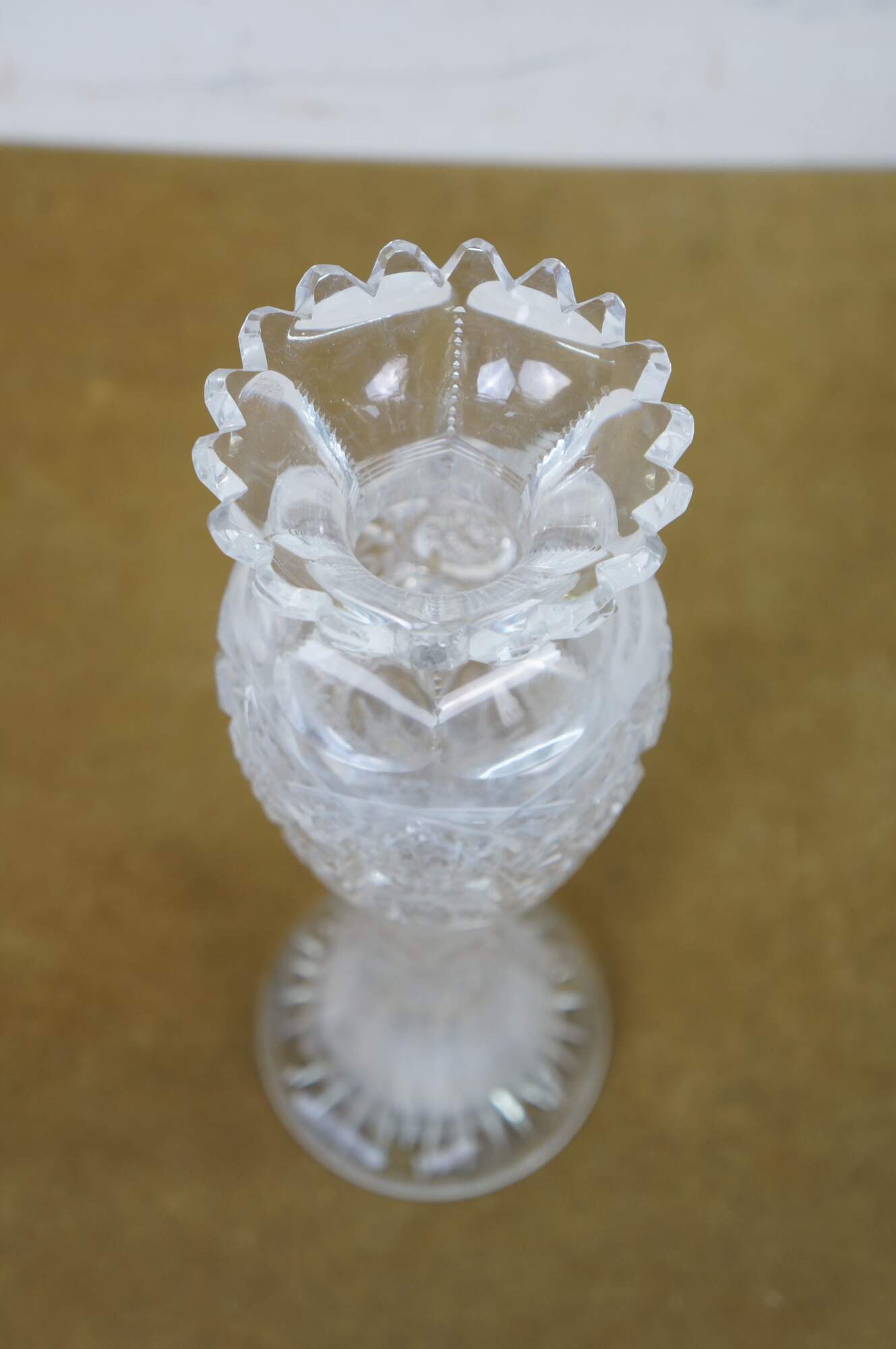 Early to mid 20th century American brilliant style cut glass / crystal flower vase. Elegantly shaped with sawtooth rim, cut with patterns of textured diamonds and hobstars.