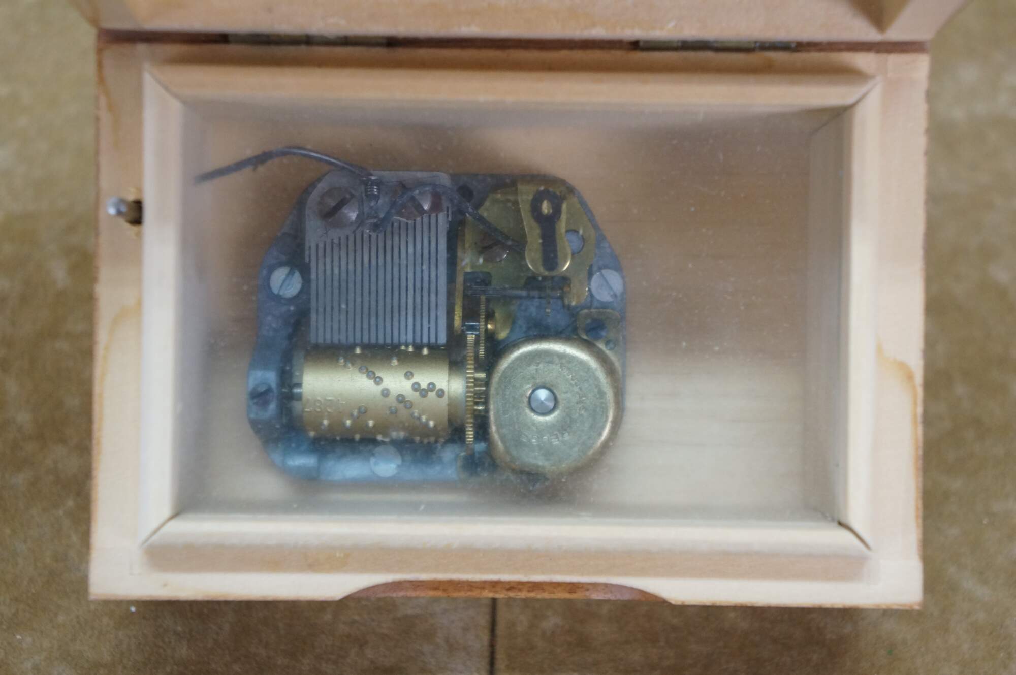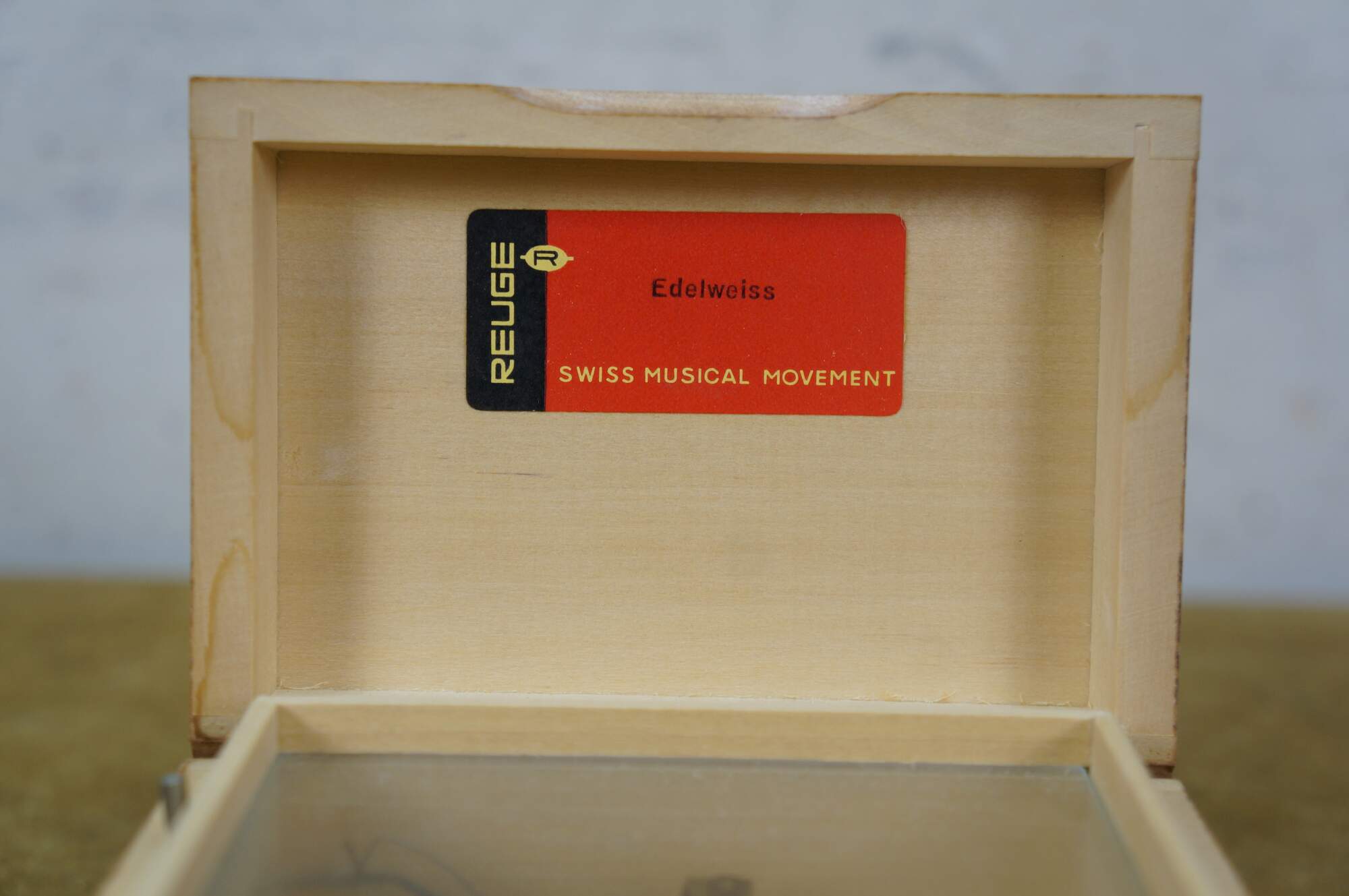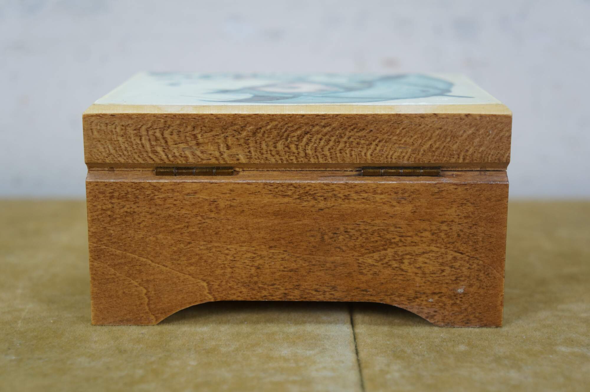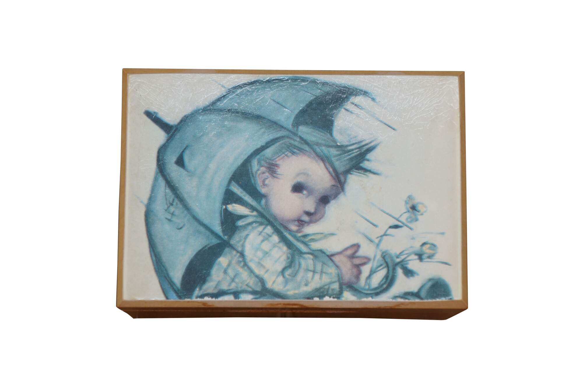 Mid to late 20th century Reuge Switzerland musical trinket box - rectangular wooden box, lid decorated with a printed image styled after "Umbrella Boy" originally designed by Sister Mary Innocentia Hummel. Plays "Edelweiss" from "The Sound of Music.