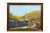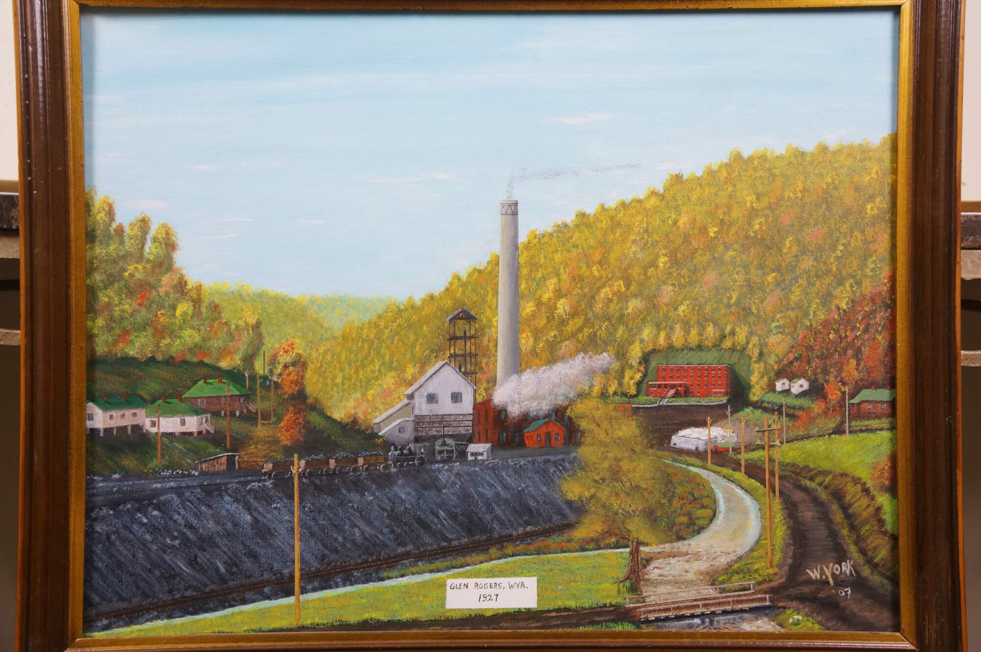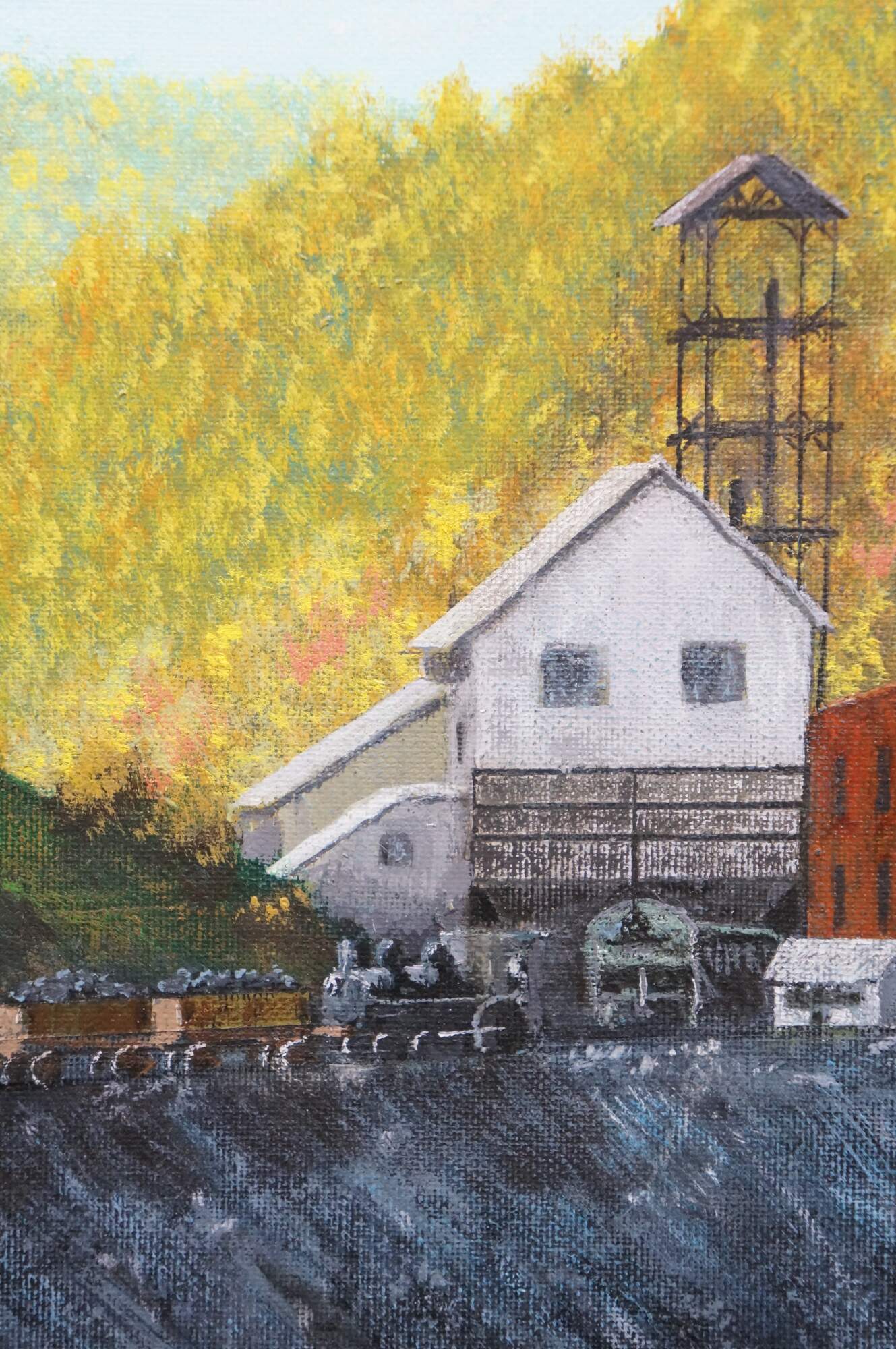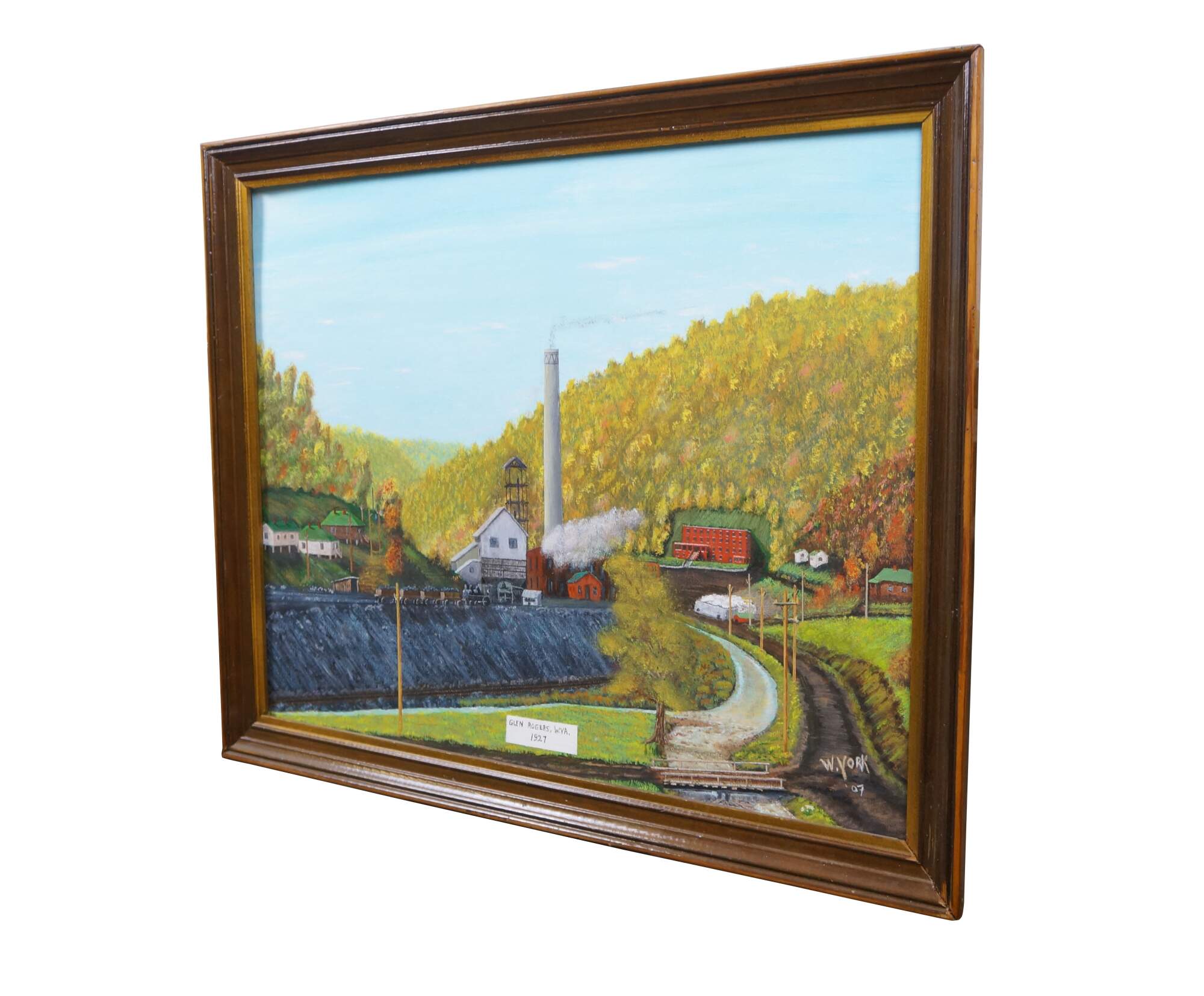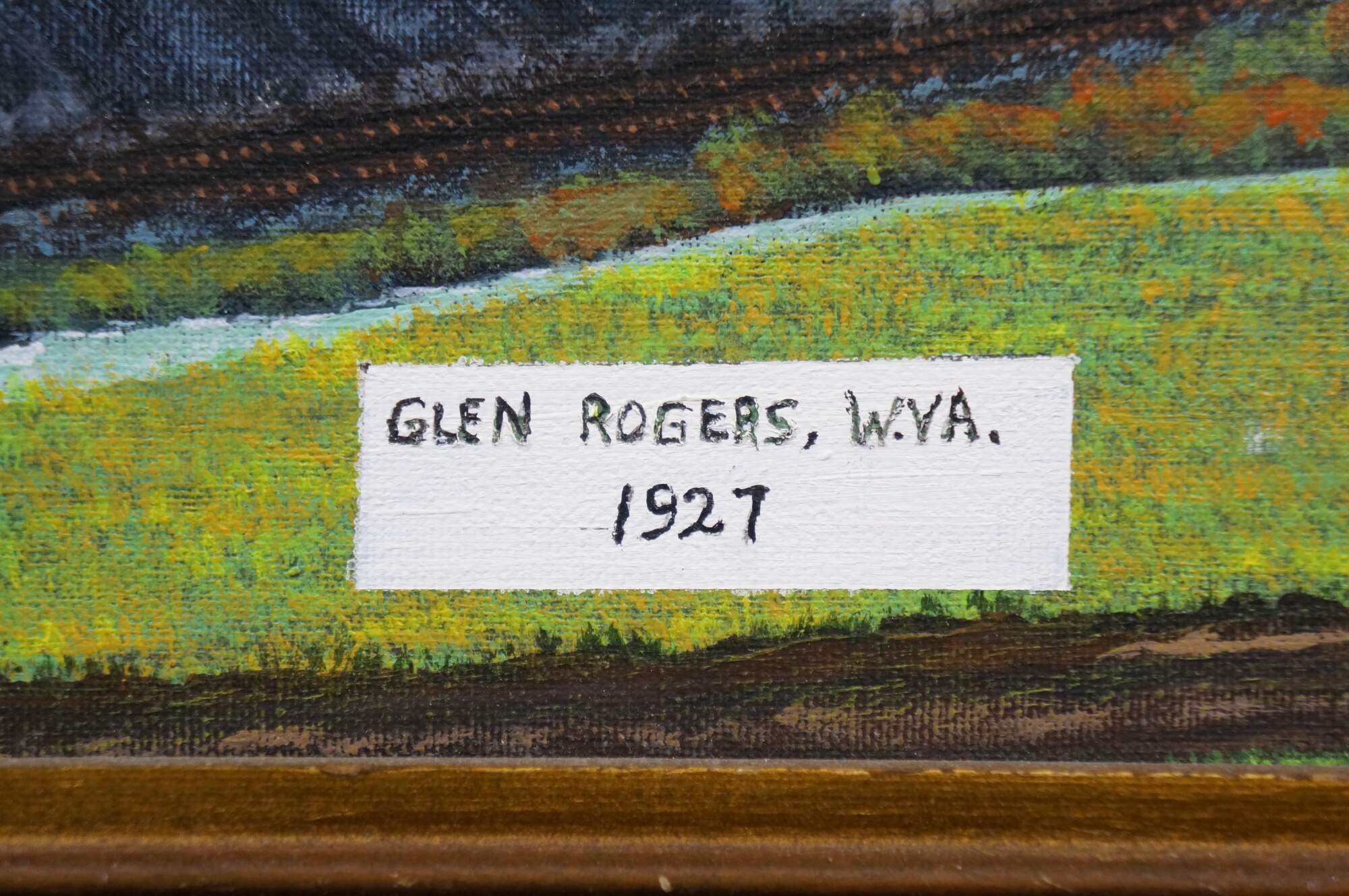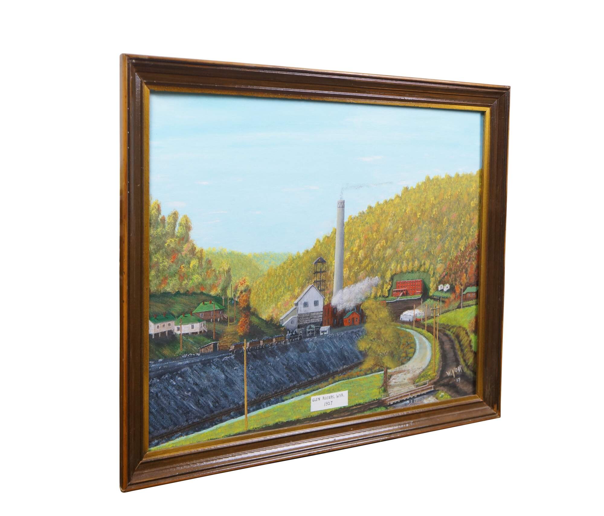 Vintage acrylic landscape oil painting on canvas board titled "Glen Rogers, West Virginia, 1927" by Rev. Wallace V. York. Depicts a landscape view of Glen Rogers with the large smokestack from the power generators. The red building is the hotel. This was the most productive coal mine in West Virginia. This piece was painted by Rev. Wallce York circa 2007 to be a door prize at Glen Rogers High School class renuion for the students that graduated 1950-1951. Signed, lower right. Beveled wood frame.