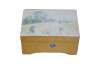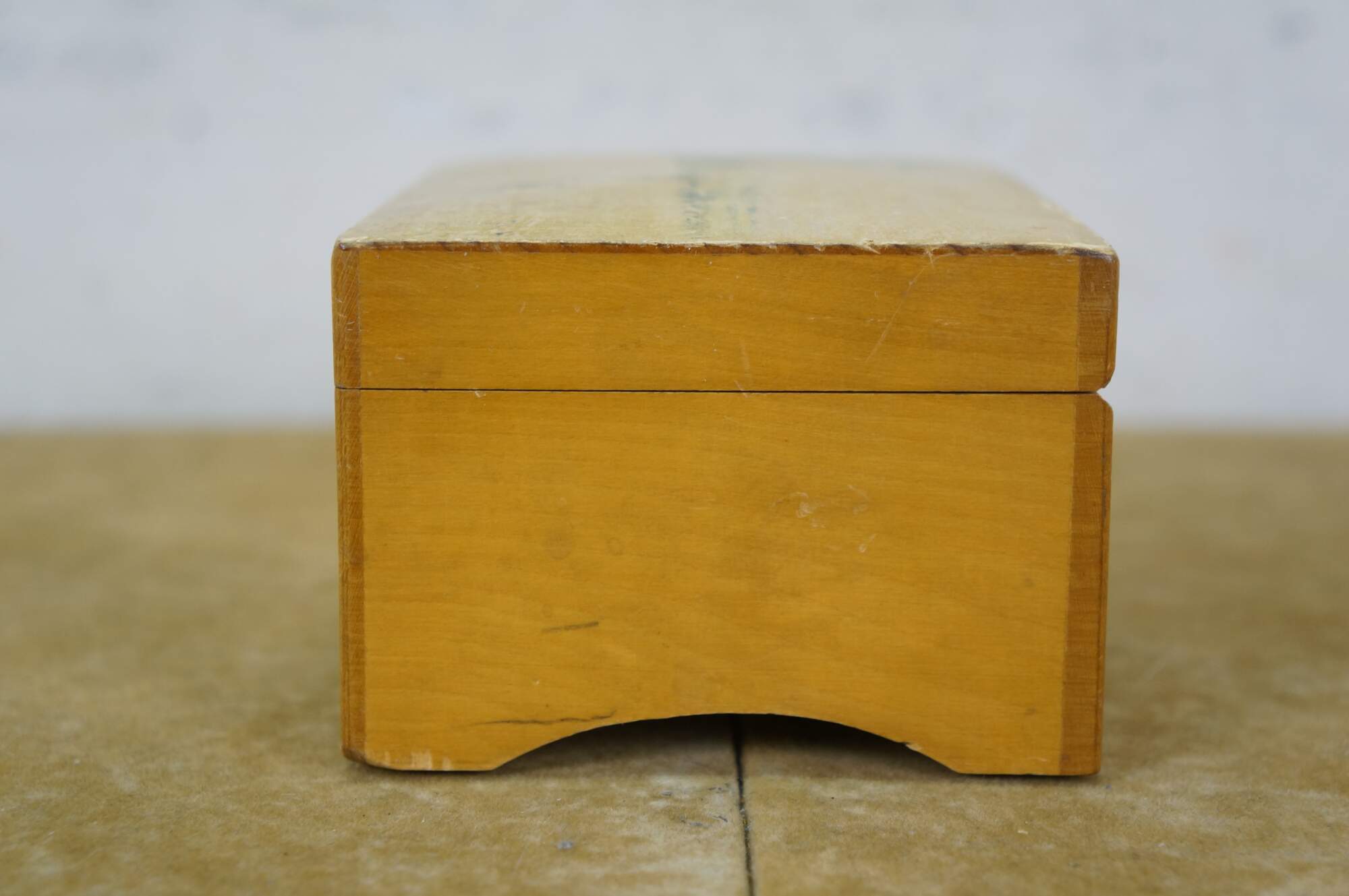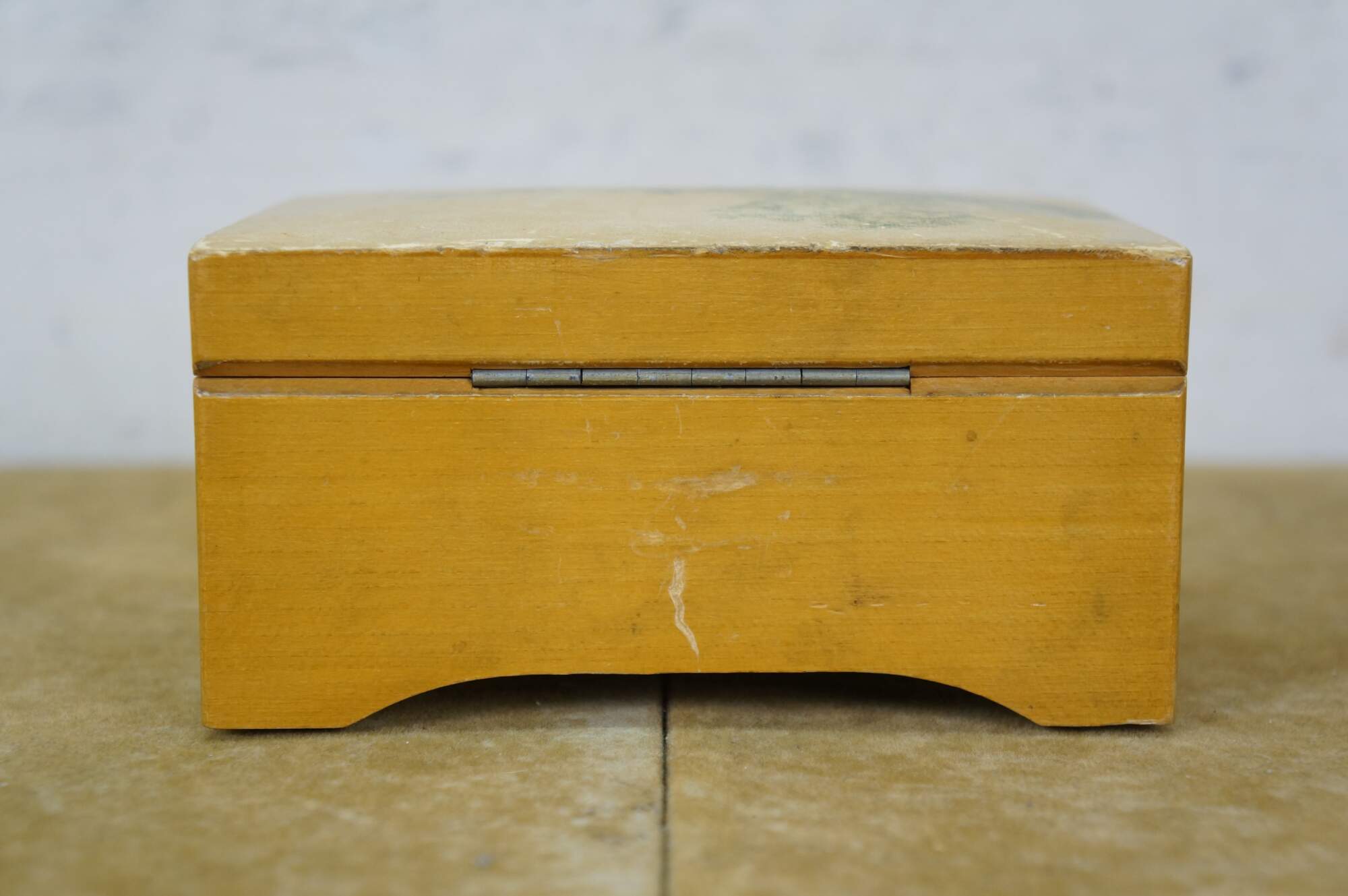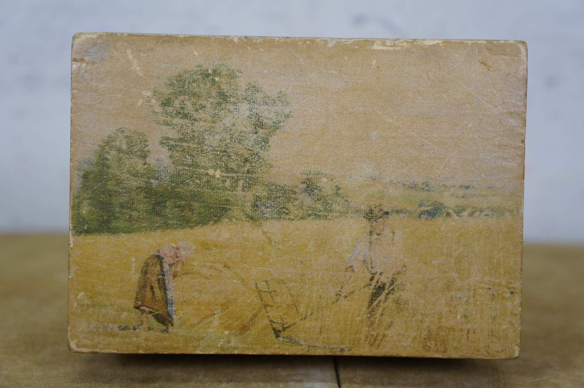Circa mid 20th century Thorens Co music box - wooden trinket box style with printed image of peasant farmers in a field on the lid. Works displayed under glass inside. Plays two tunes - Santa Lucia and O Sole Mio. Made in Switzerland.