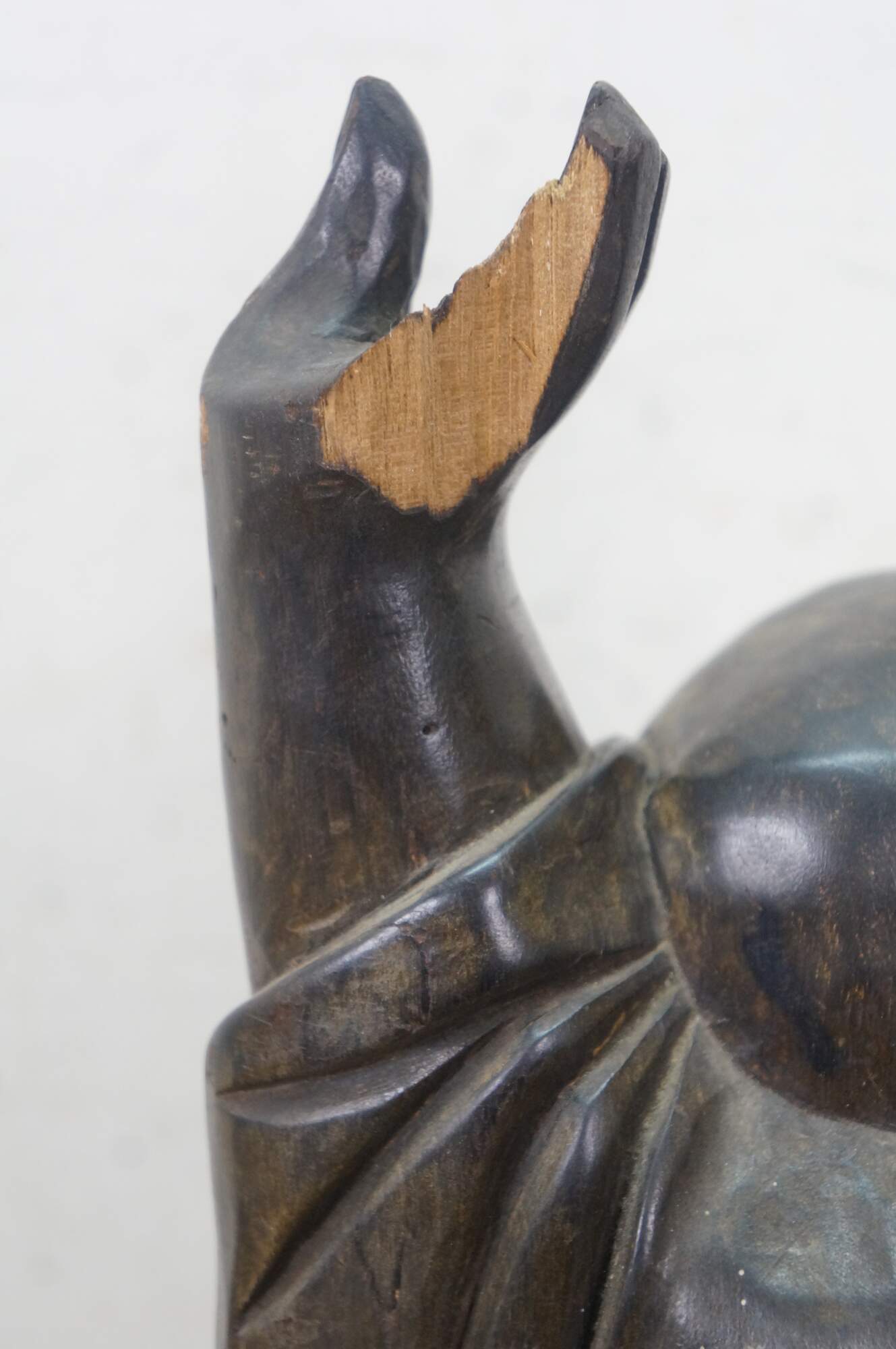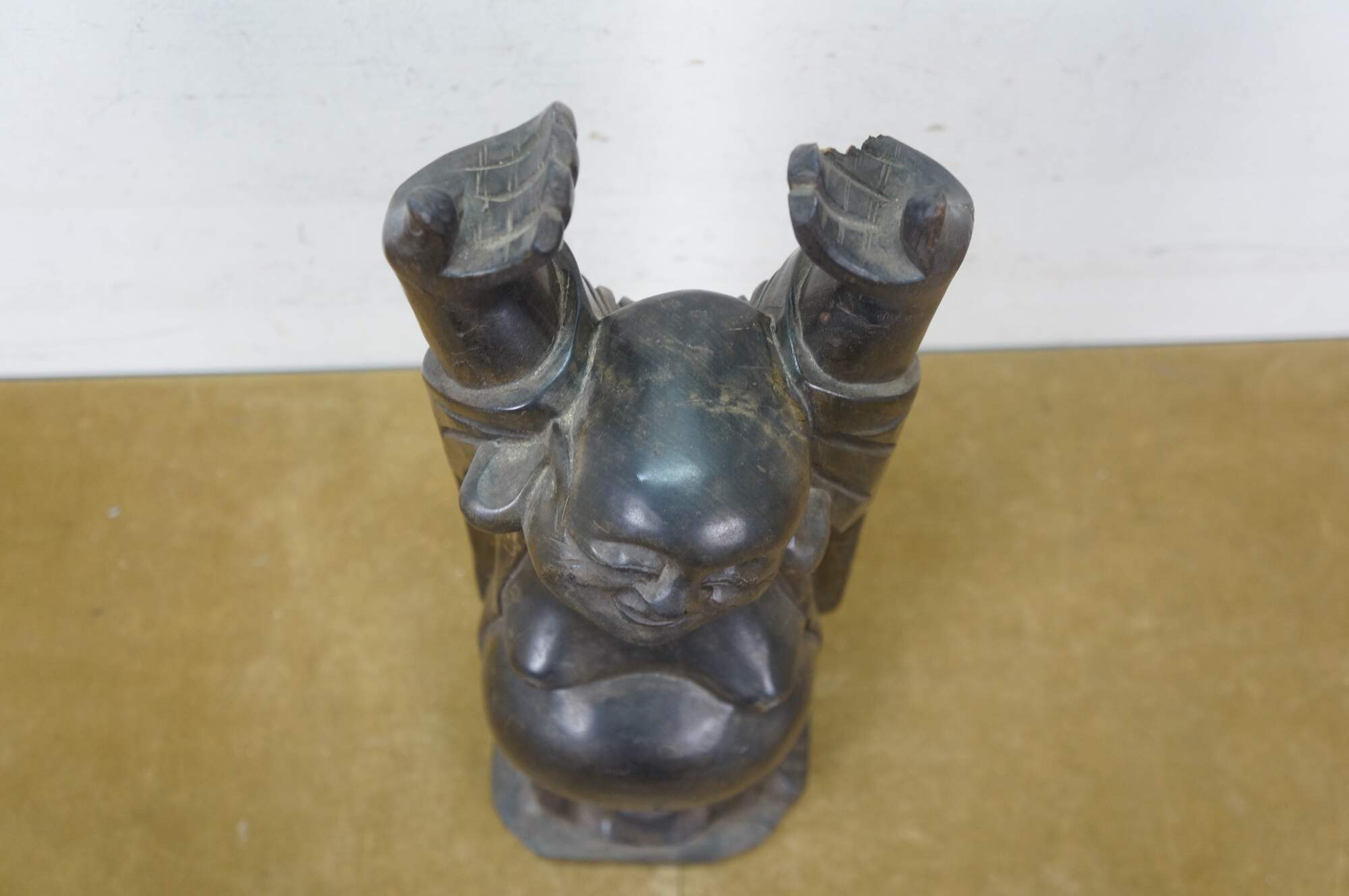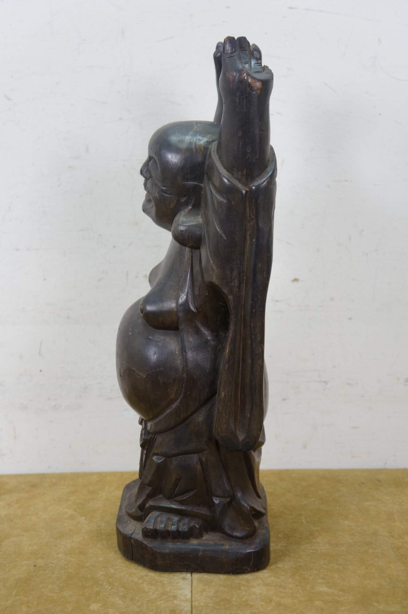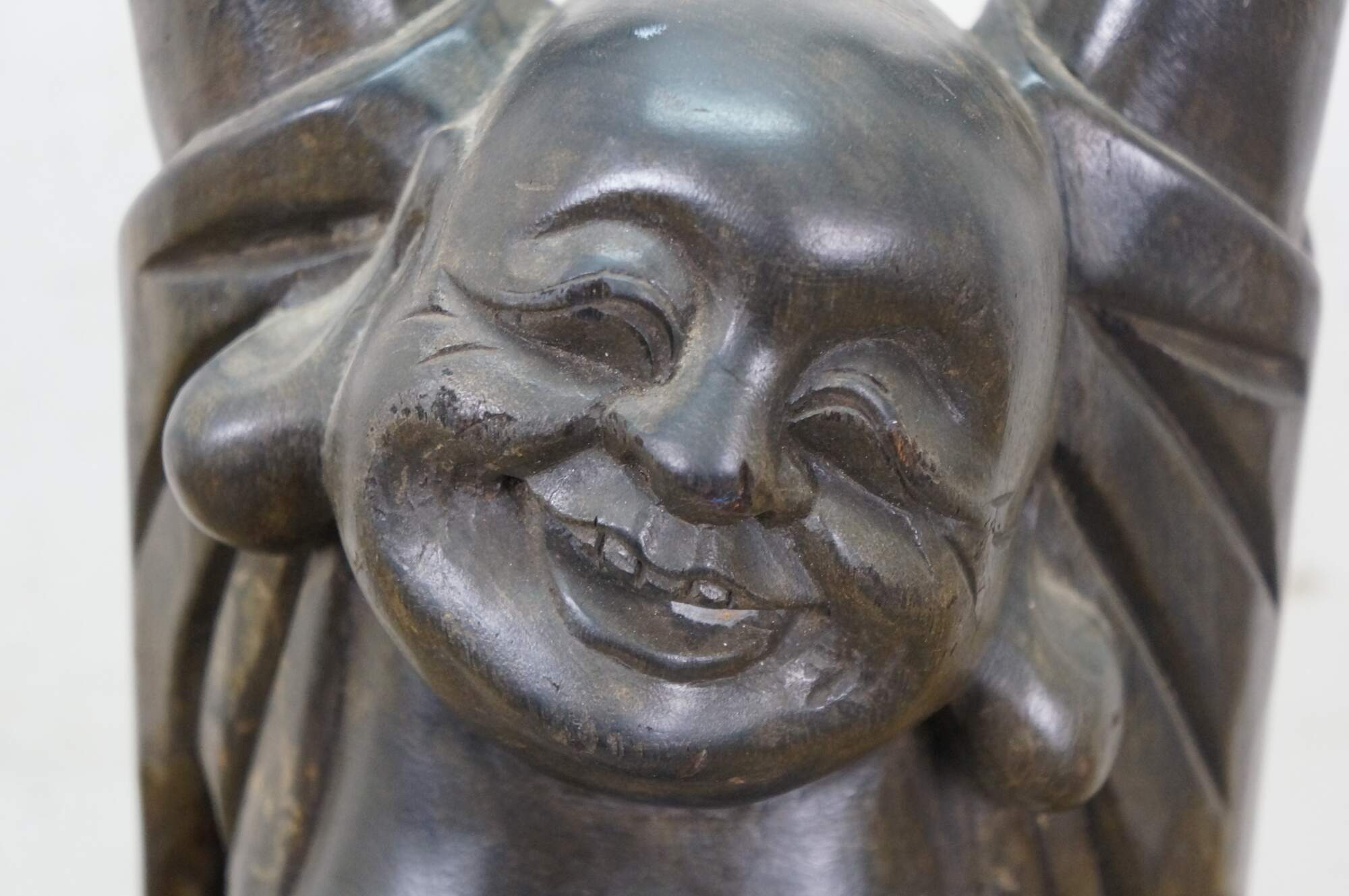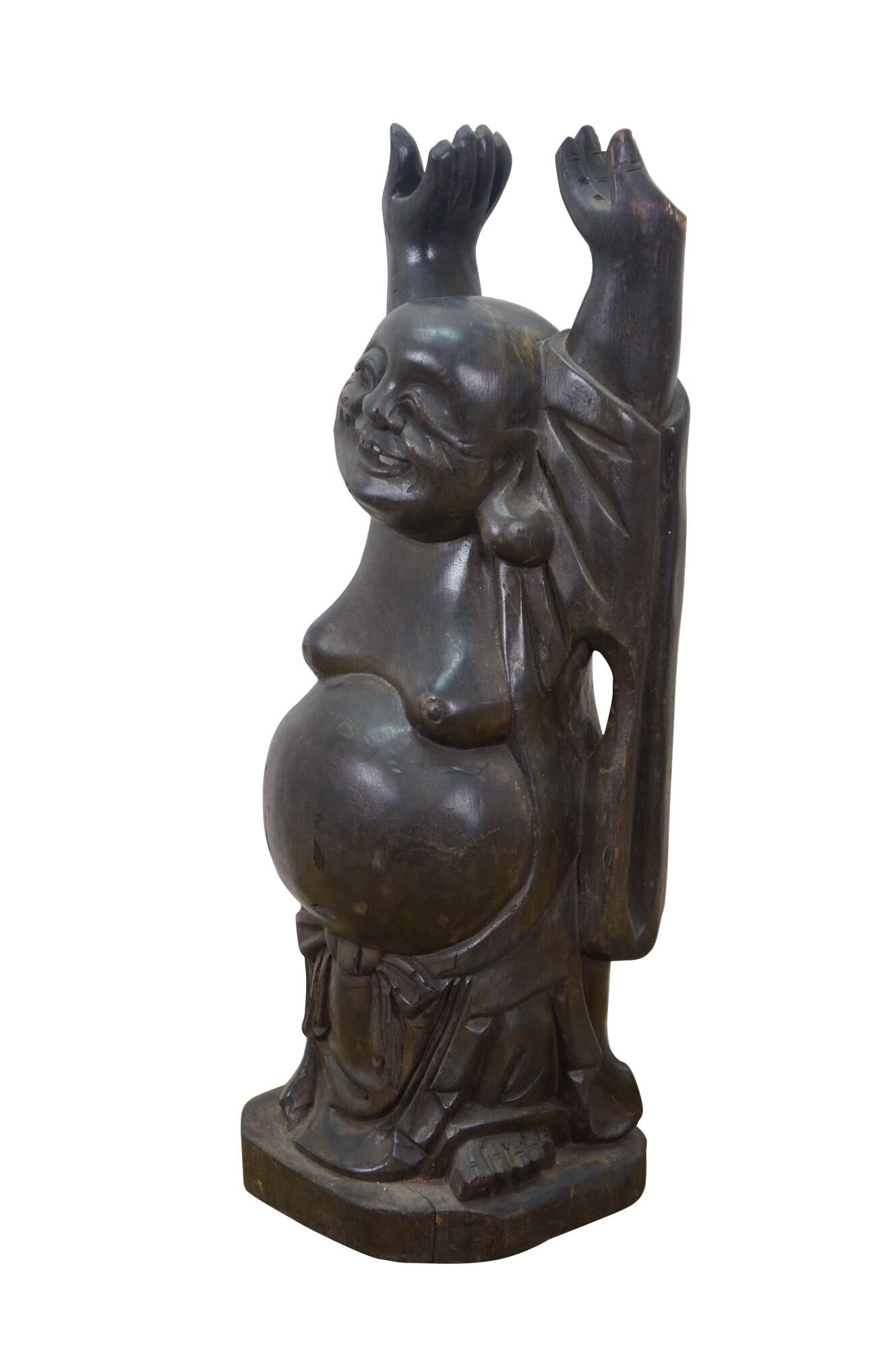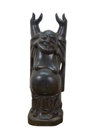 Vintage 20th century Japanese Hotei / Laughing Buddha statue. Standing with arms joyfully raised, this figure is a symbol of happiness, luck, and prosperity. Carved wood with a black finish.