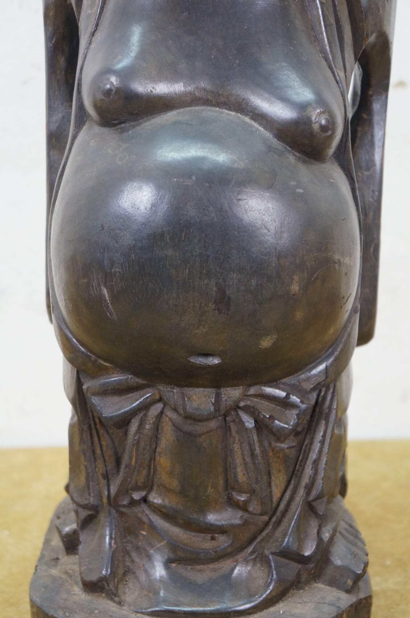 "In Japanese mythology, one of the Shichi-fuku-jin (“Seven Gods of Luck”). This popular figure is depicted frequently in contemporary crafts as a cheerful, contented Buddhist monk with a large exposed belly, often accompanied by children. Tradition relates him to a Chinese monk called Pu-tai, who because of his benevolent nature came to be regarded as an incarnation of the bodhisattva (the future Buddha) Maitreya (Miroku in Japanese) but whose large protruding stomach led to his being caricatured as the “Laughing Buddha.” (Britannica)