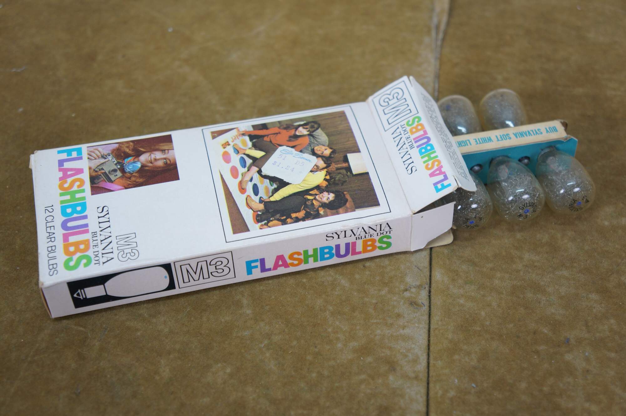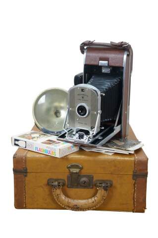 1950's Polaroid Speedliner Land Camera Model 95A instant picture film camera. Model introduced in 1954. Folding metal and brown bonded leather design. Includes a variety of old inserts, one pack of 12 Sylvania Blue Dot M3 Clear Flashbulbs, Polaroid Model 202 BC Flash, Exposure Meter, and hard sided storage /carrying case (lockable - no key).