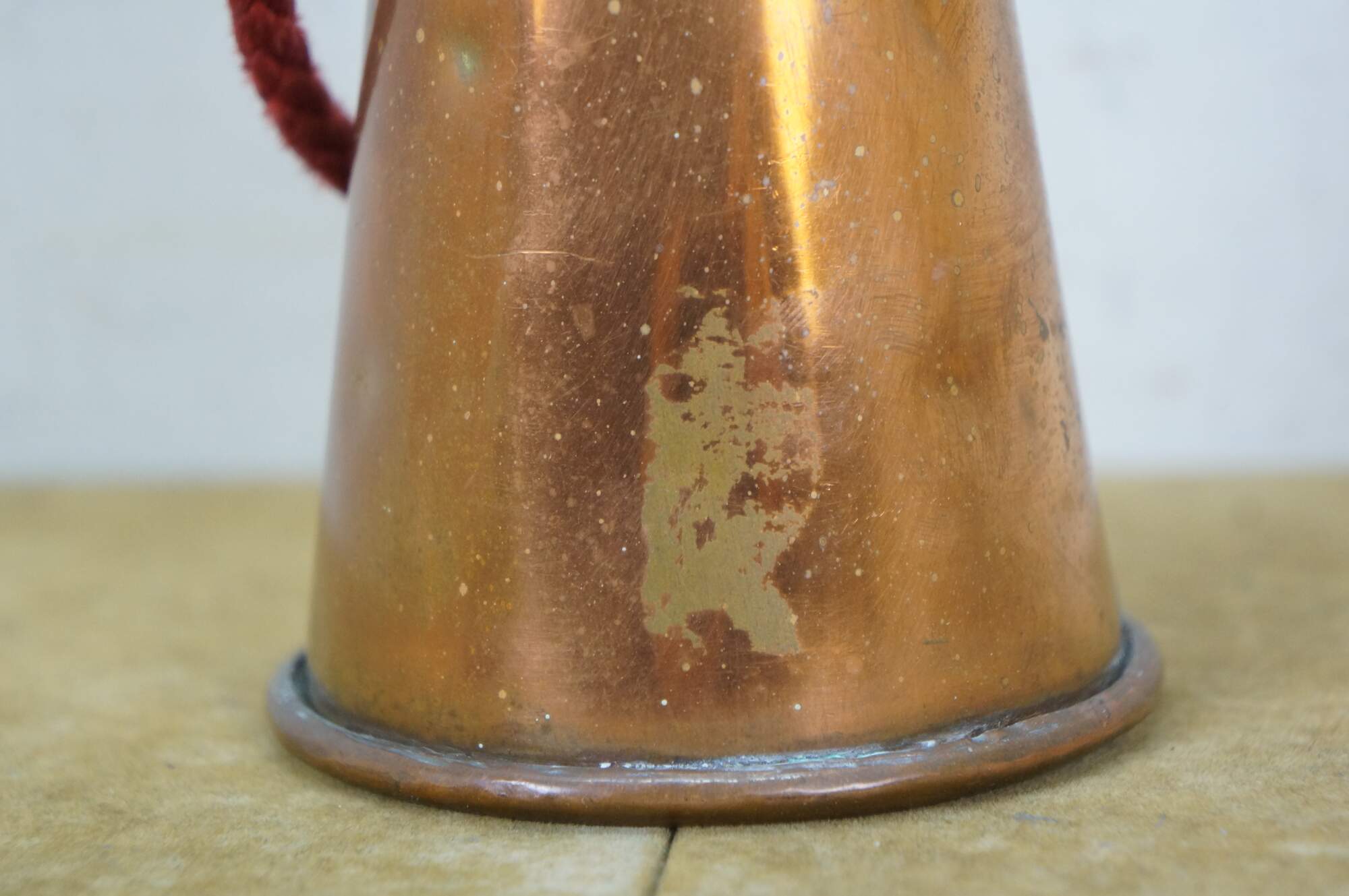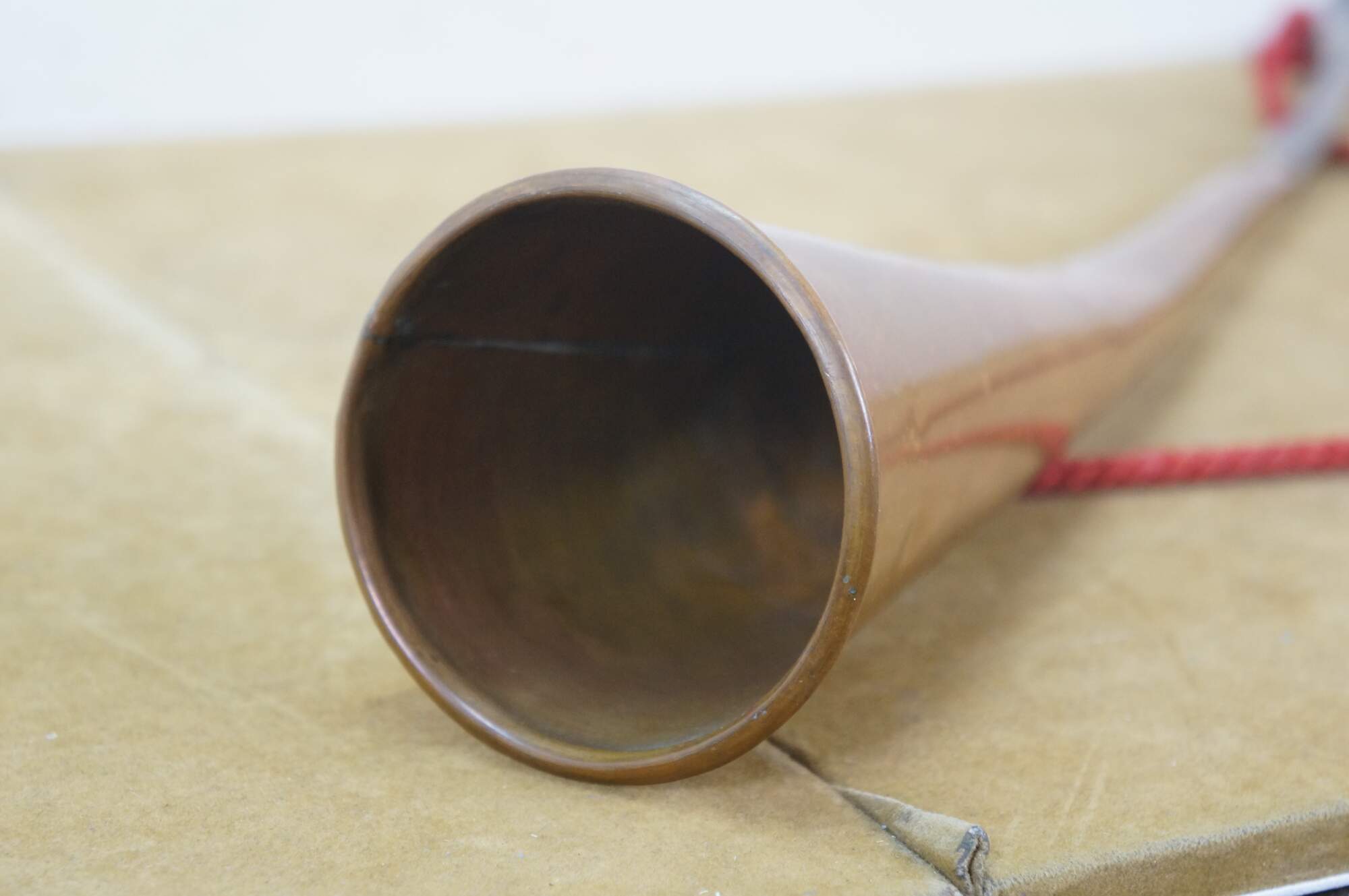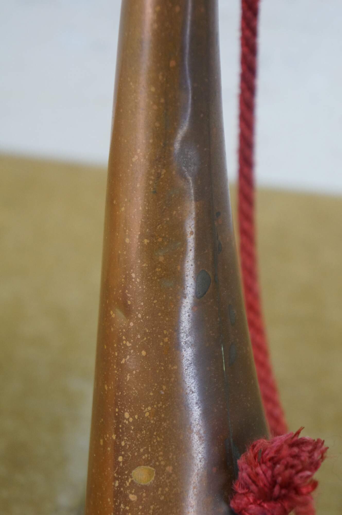 Mid to early 20th century copper coach horn / hunting horn with brass mouthpiece and red cord. Made in England.