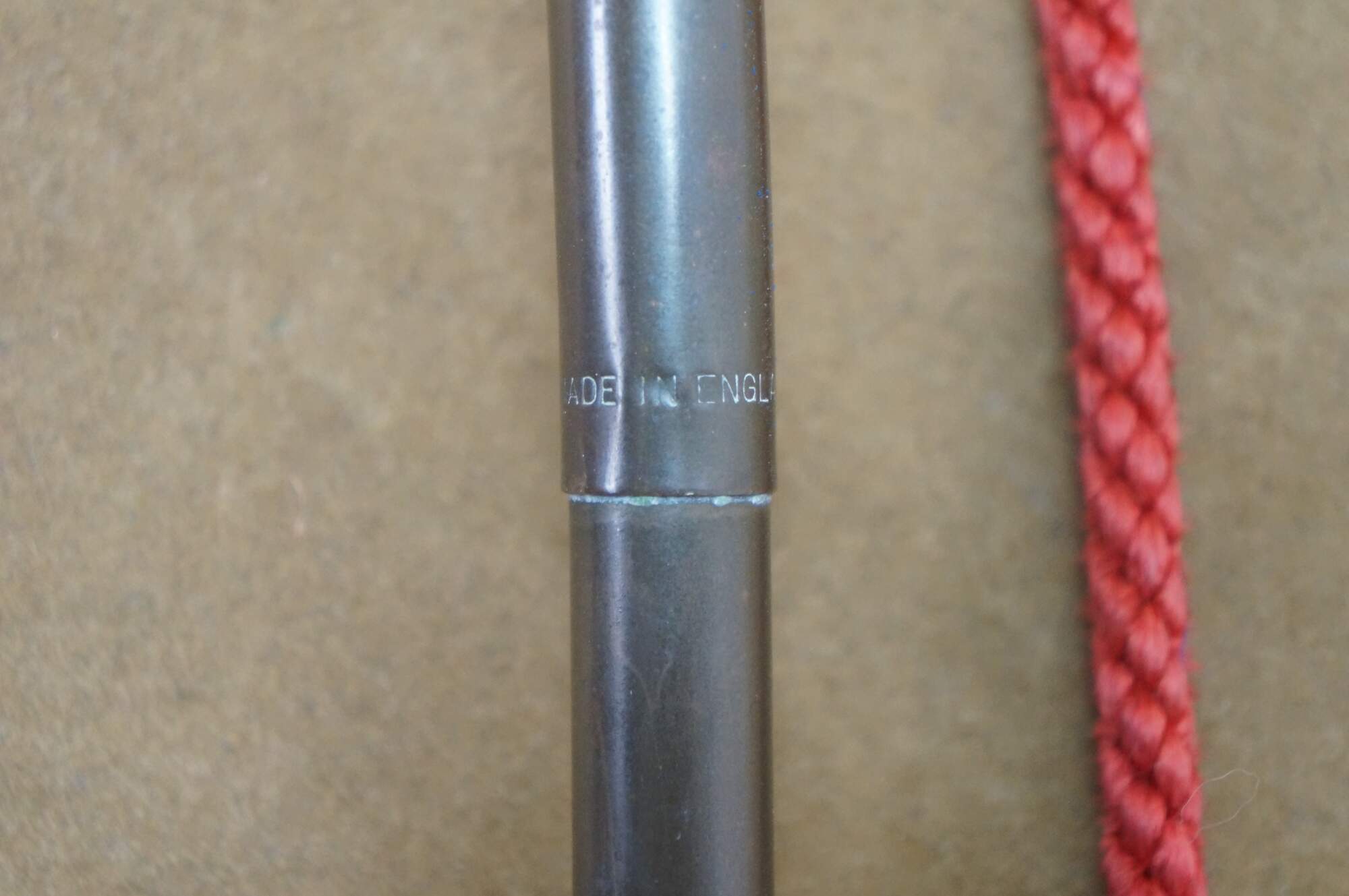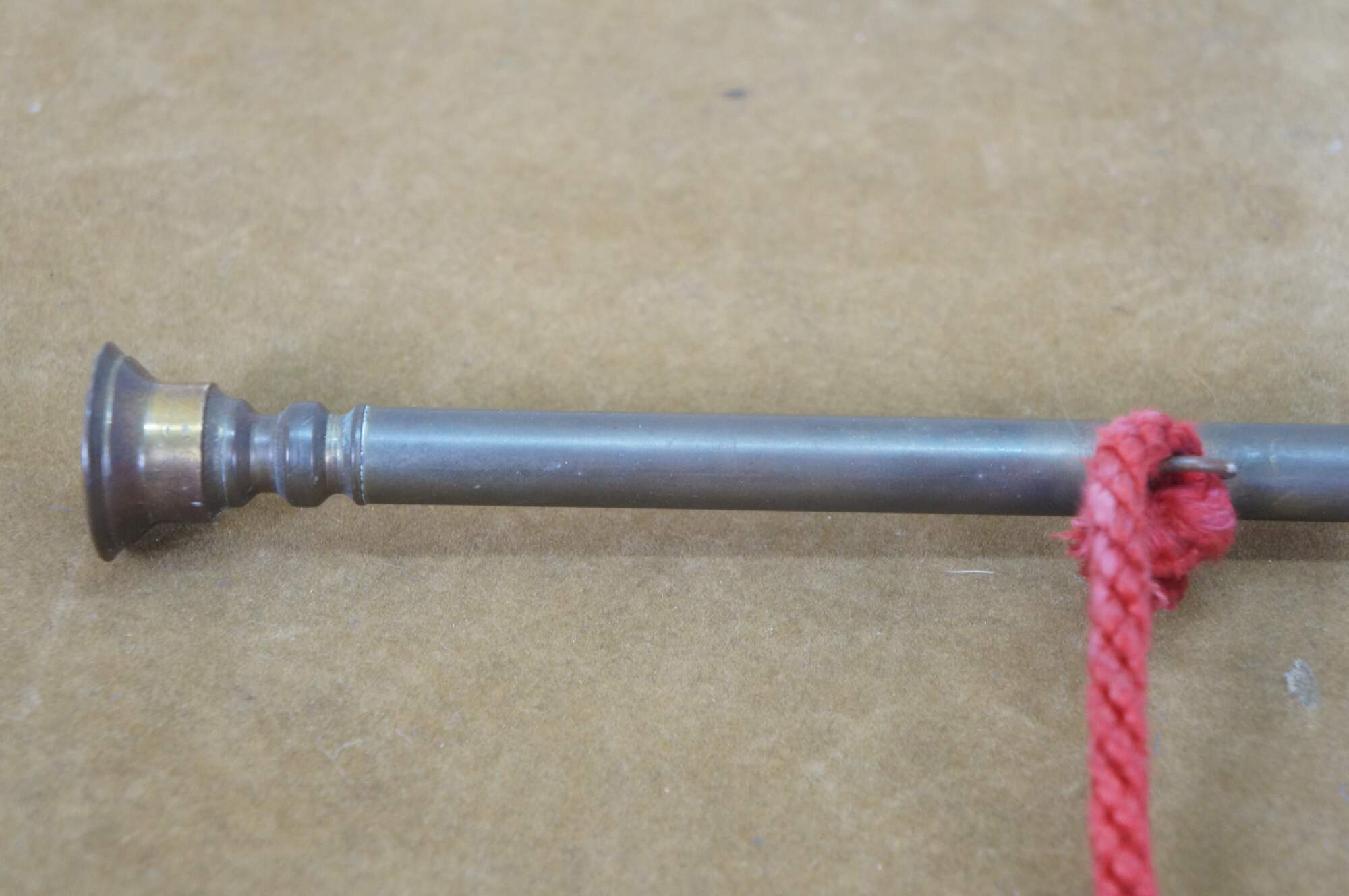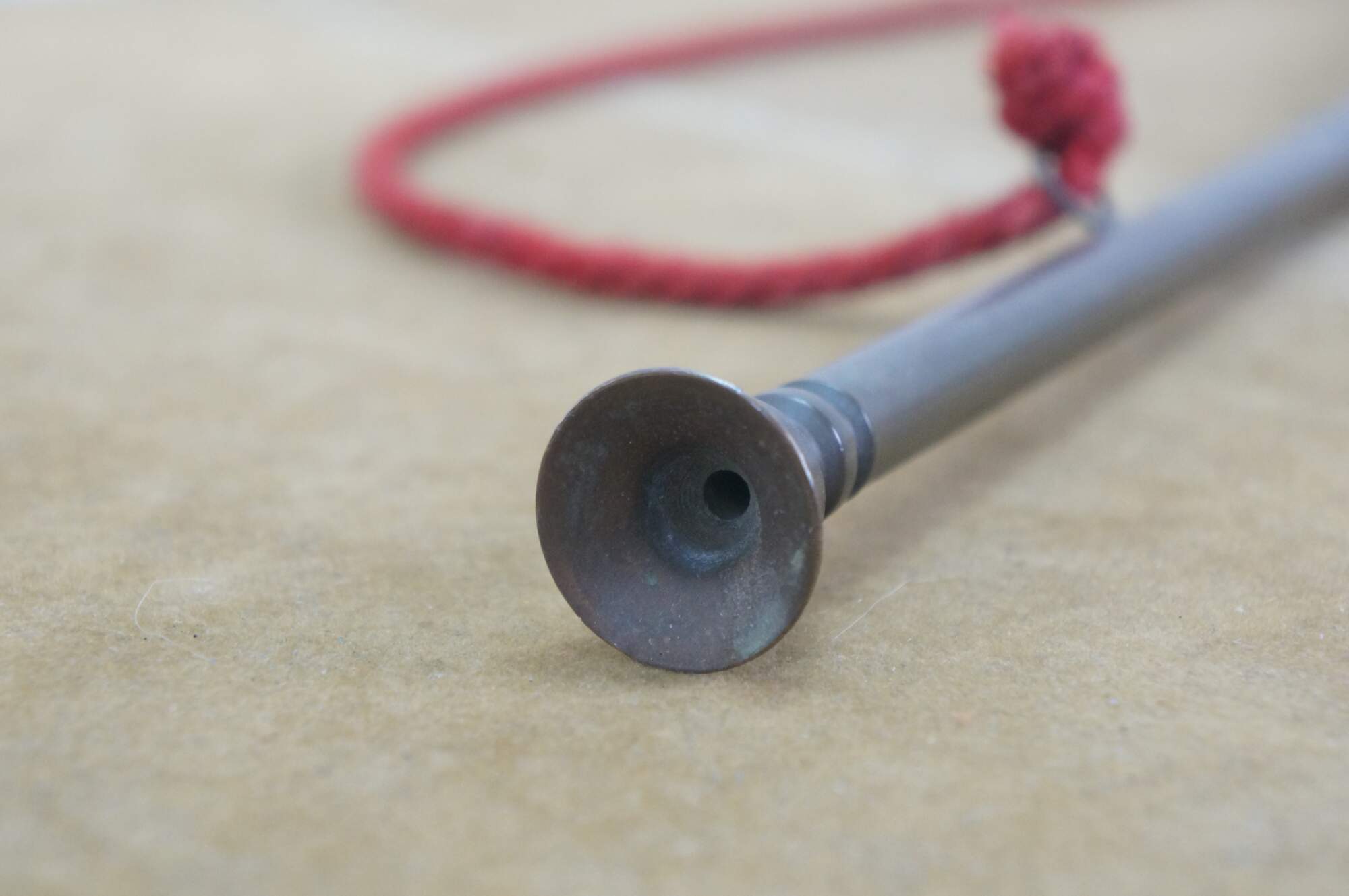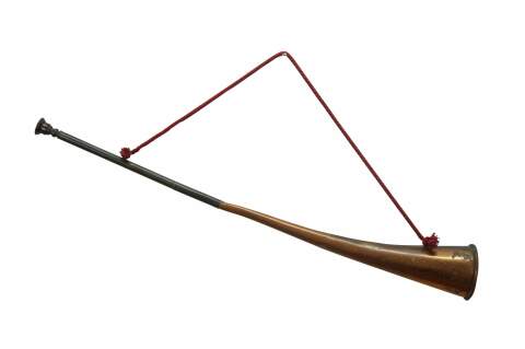 Mid to early 20th century copper coach horn / hunting horn with brass mouthpiece and red cord. Made in England.