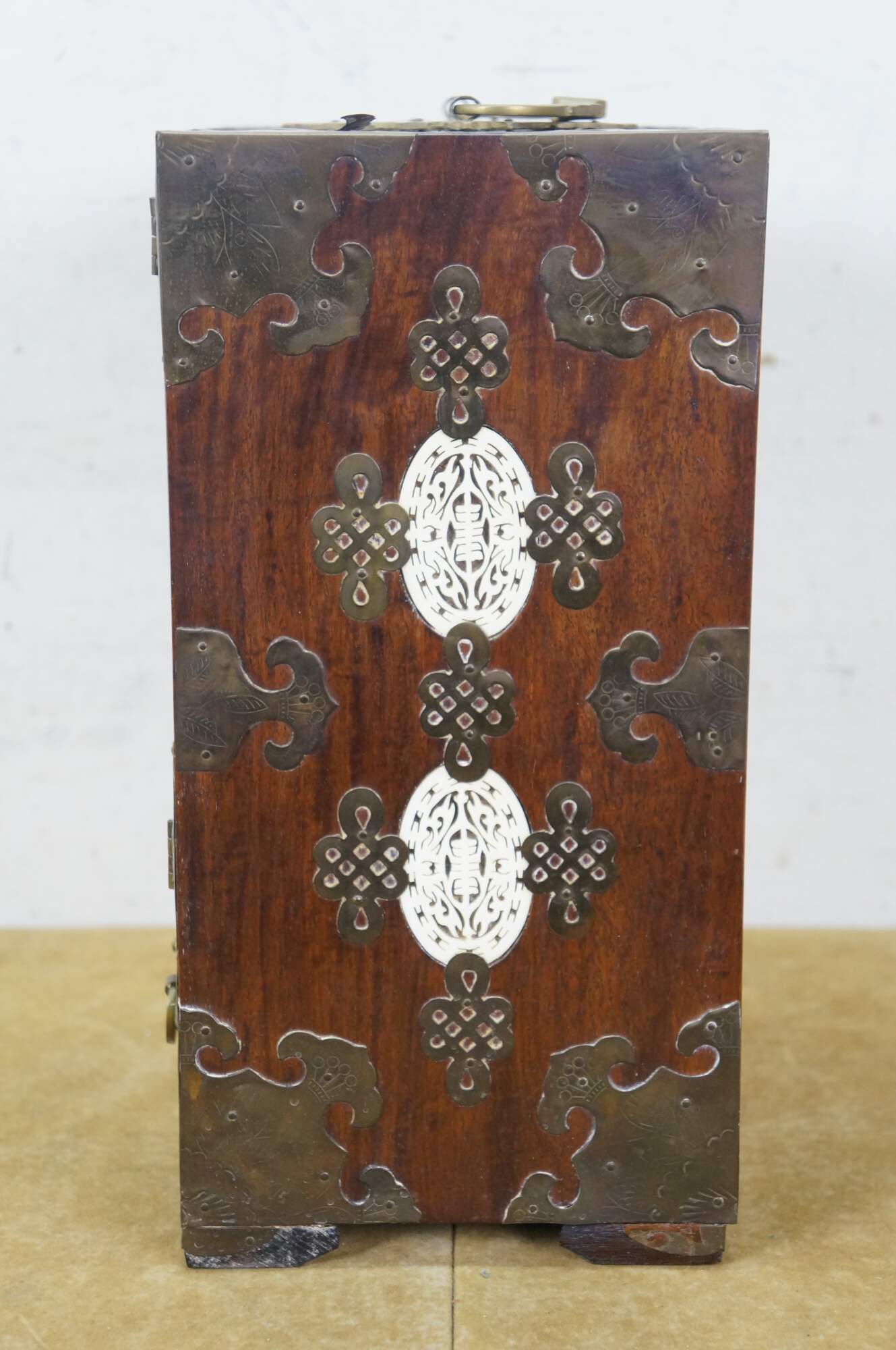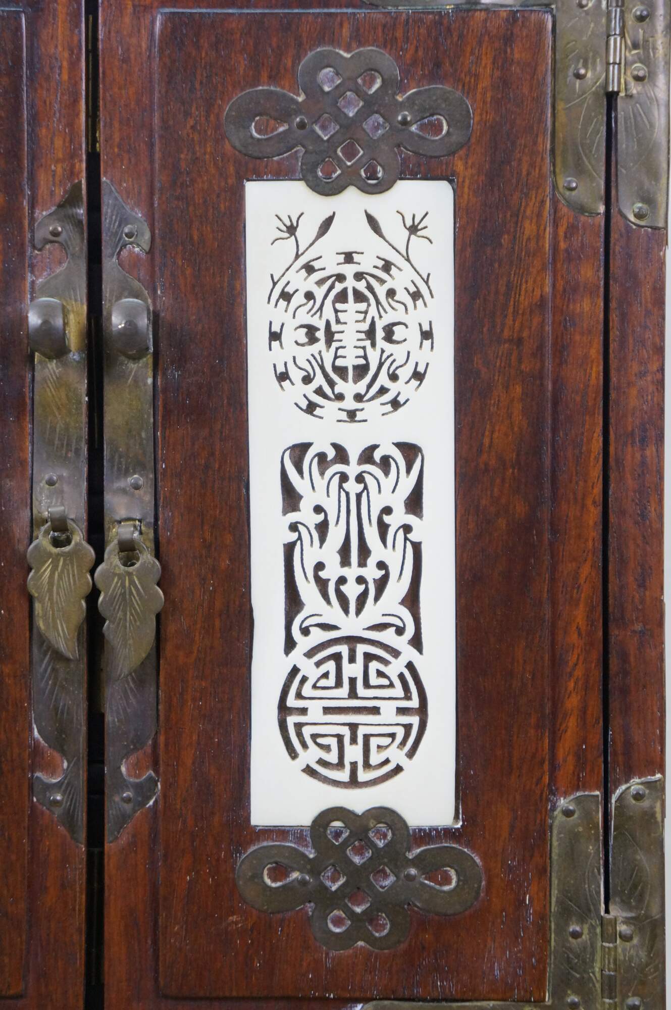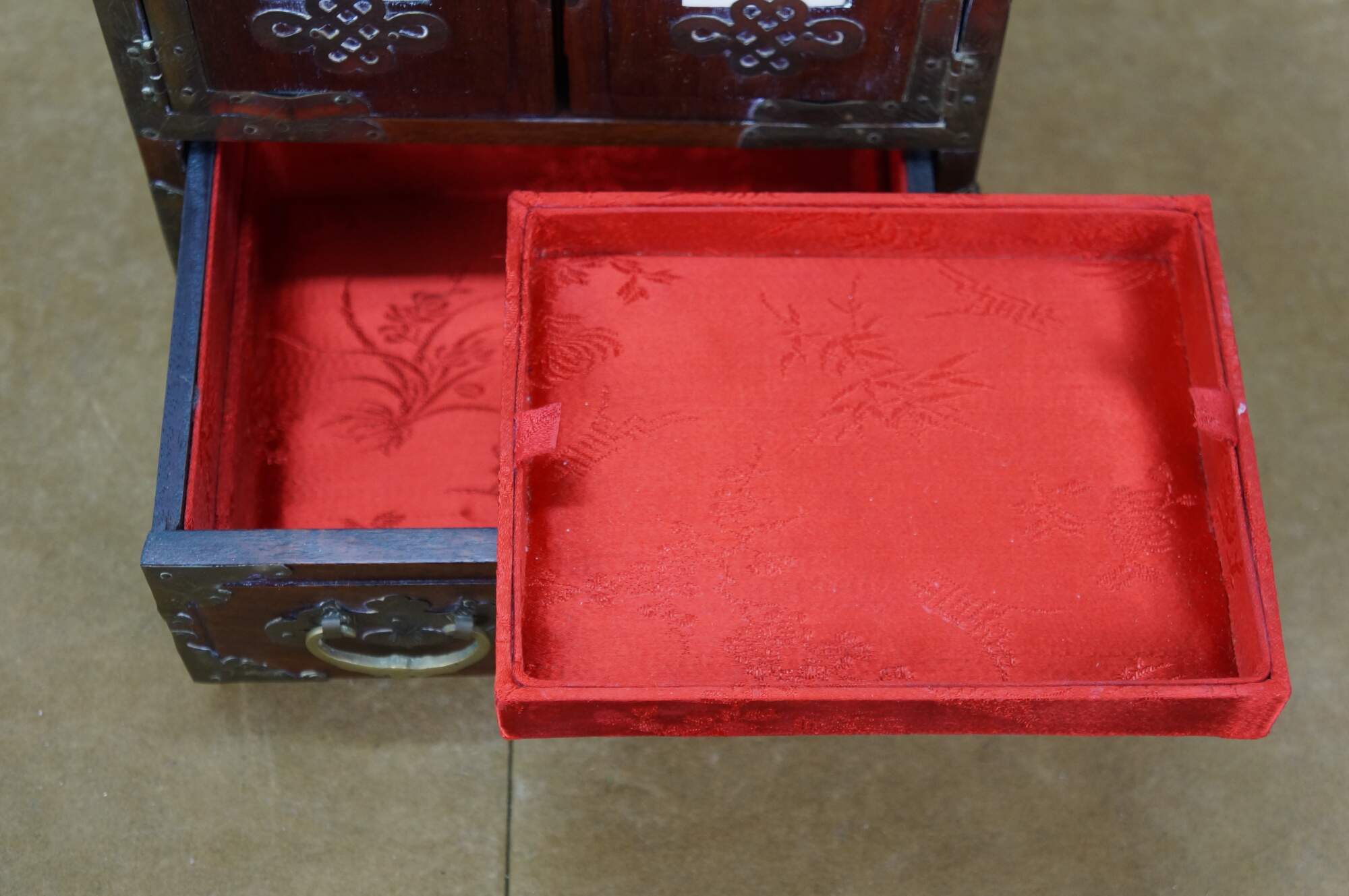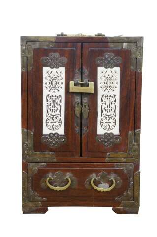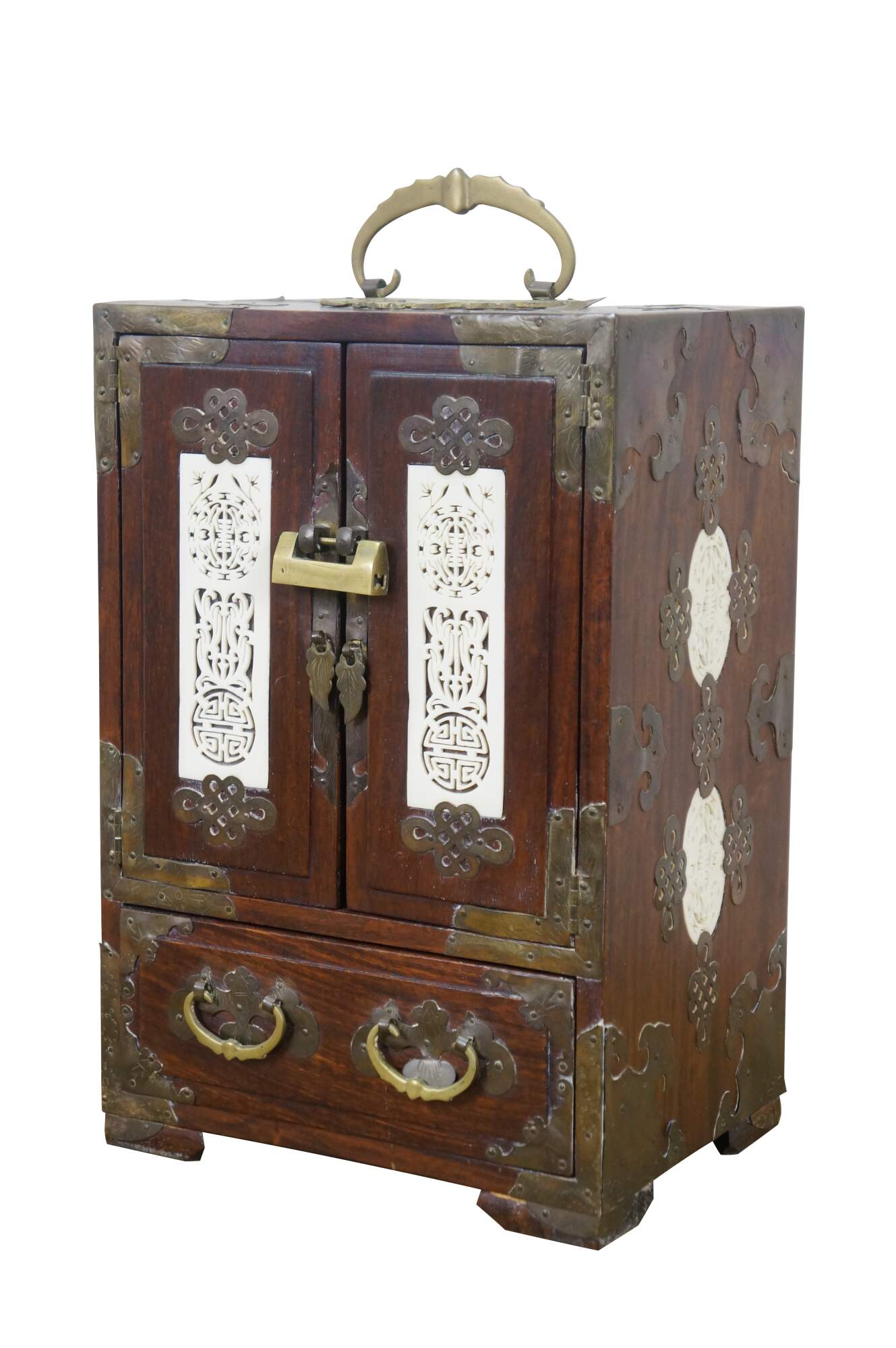 Vintage 20th century Chinese jewelry box / cabinet. Rosewood body with inlaid pierced panels of bright white stone and decorated with etched brass panels and hardware featuring designs of knotwork, bats, flowers and leaves. Includes brass padlock. Lower non-locking drawer with padded tray. Cabinet doors open to four additional drawers with hinged handles. Two fully open drawers and two drawers with an open section and divided ring slots. Red silk lining.