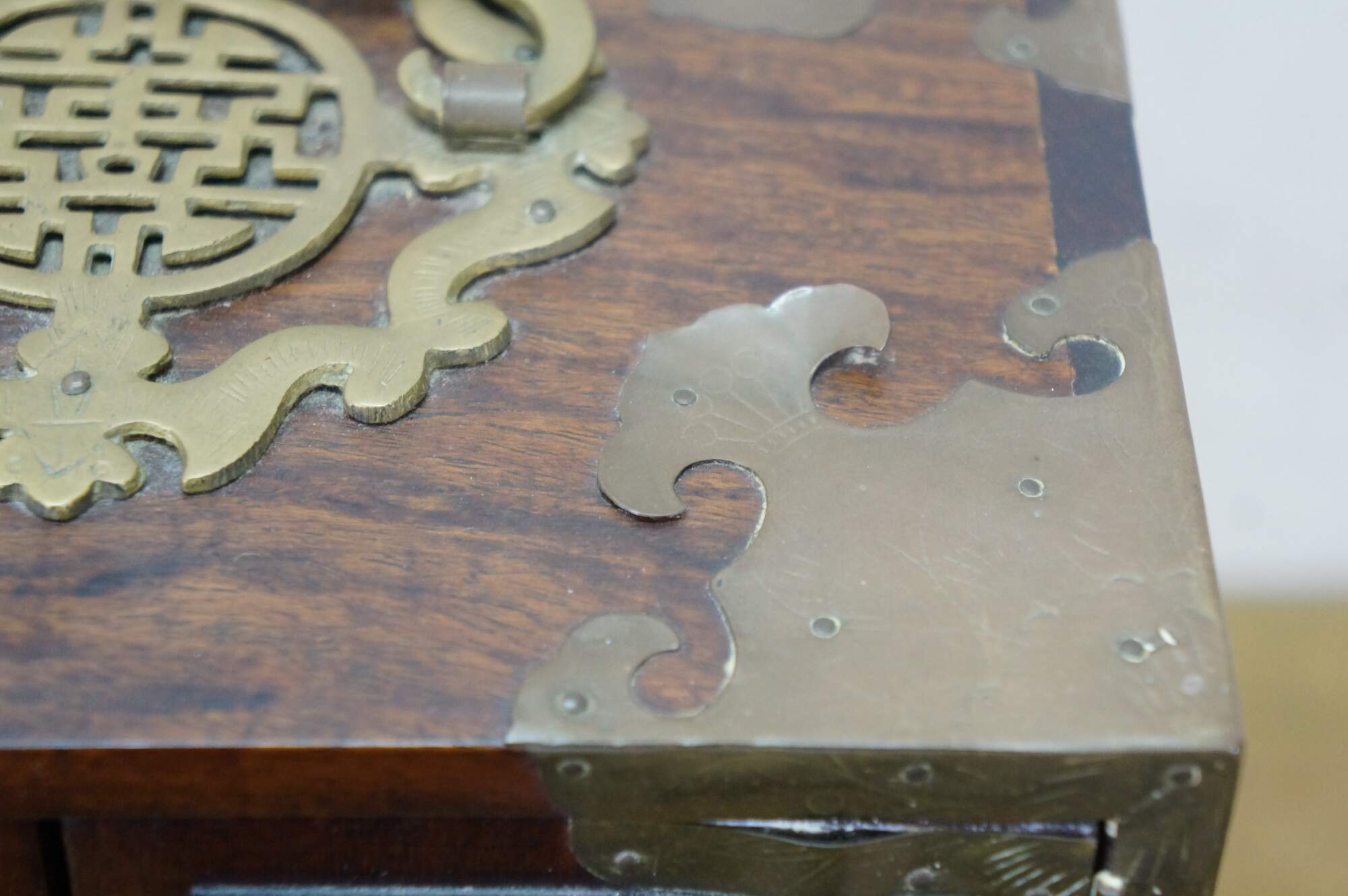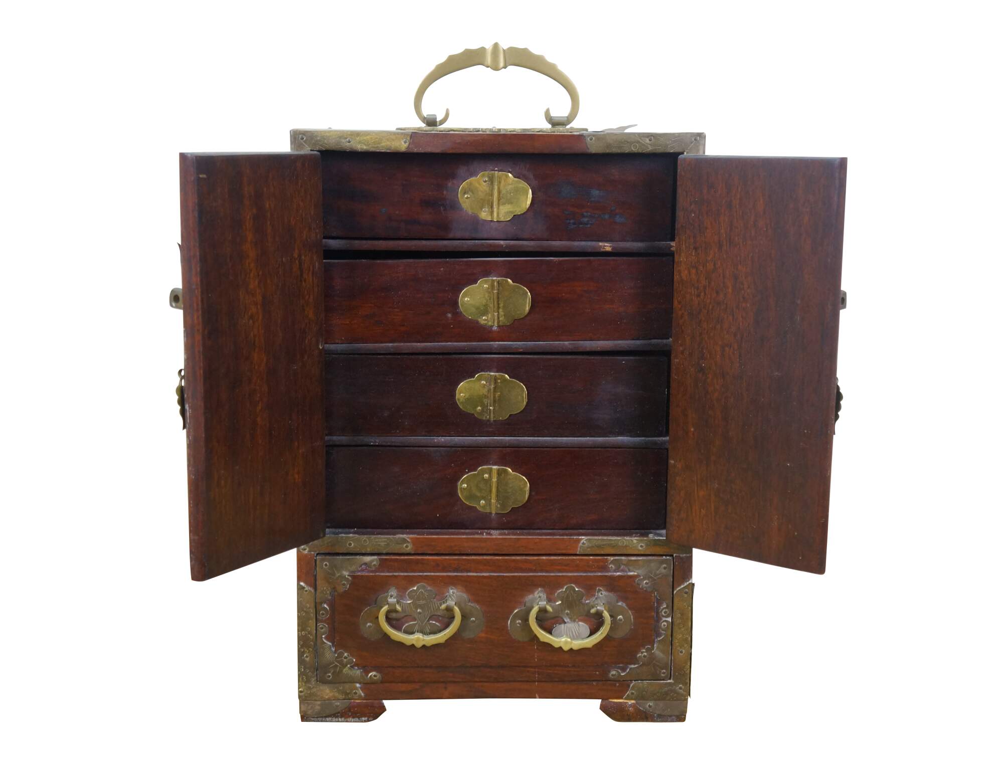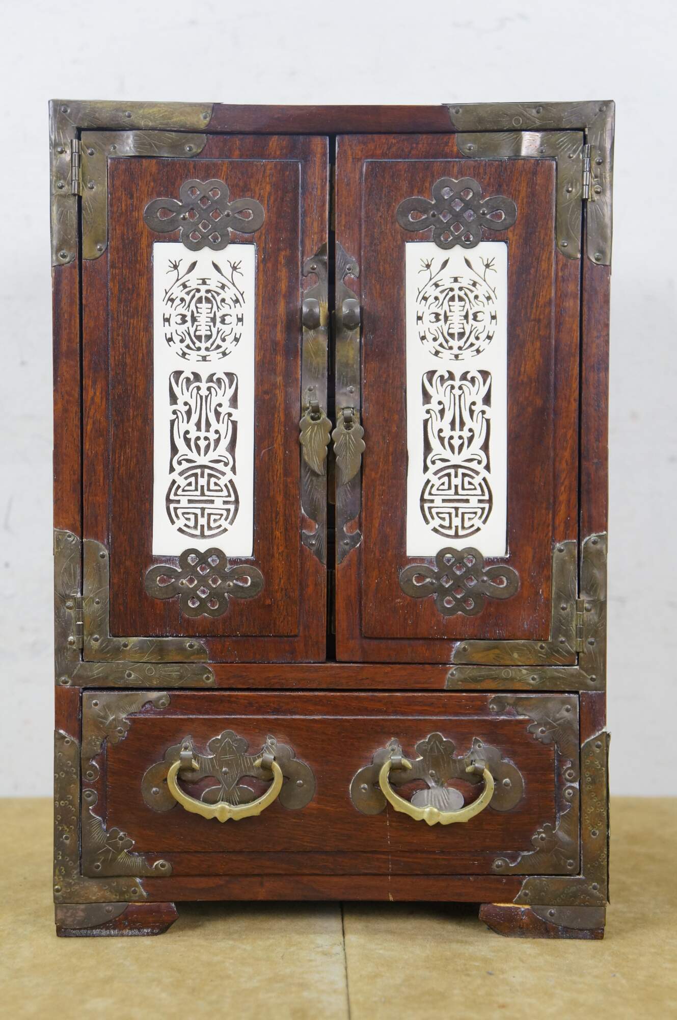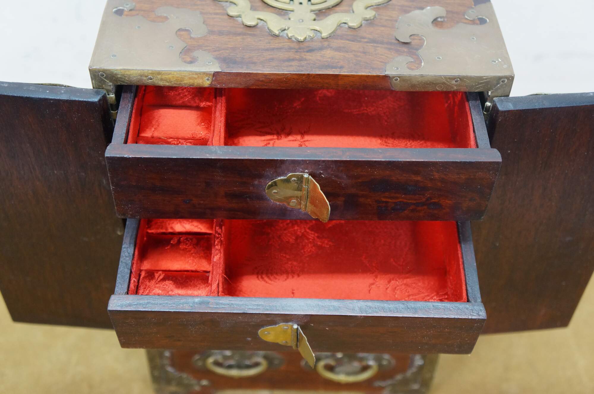 Vintage 20th century Chinese jewelry box / cabinet. Rosewood body with inlaid pierced panels of bright white stone and decorated with etched brass panels and hardware featuring designs of knotwork, bats, flowers and leaves. Includes brass padlock. Lower non-locking drawer with padded tray. Cabinet doors open to four additional drawers with hinged handles. Two fully open drawers and two drawers with an open section and divided ring slots. Red silk lining.