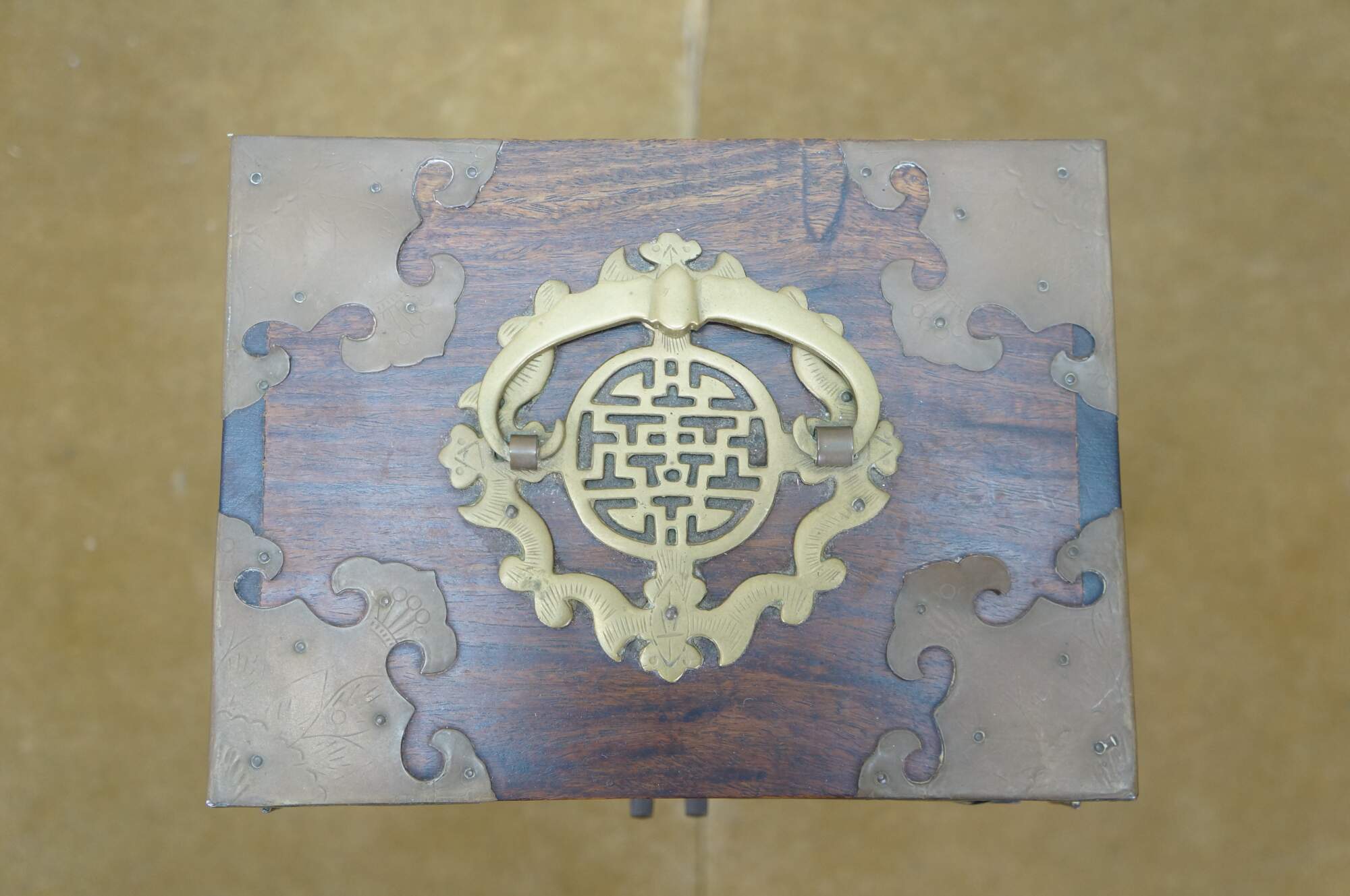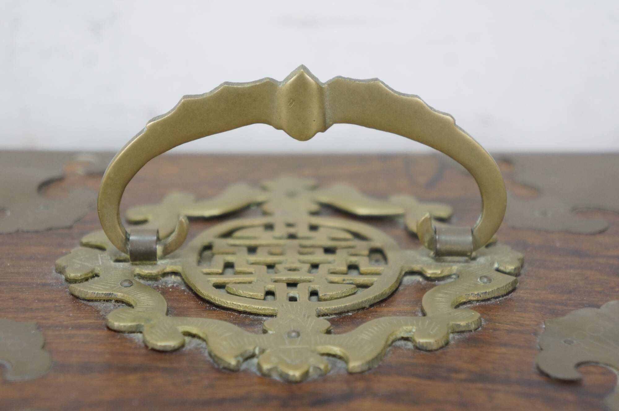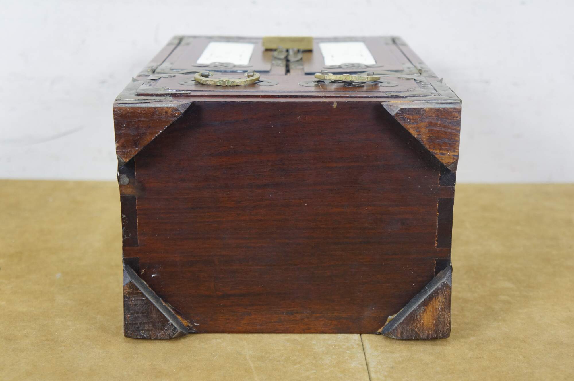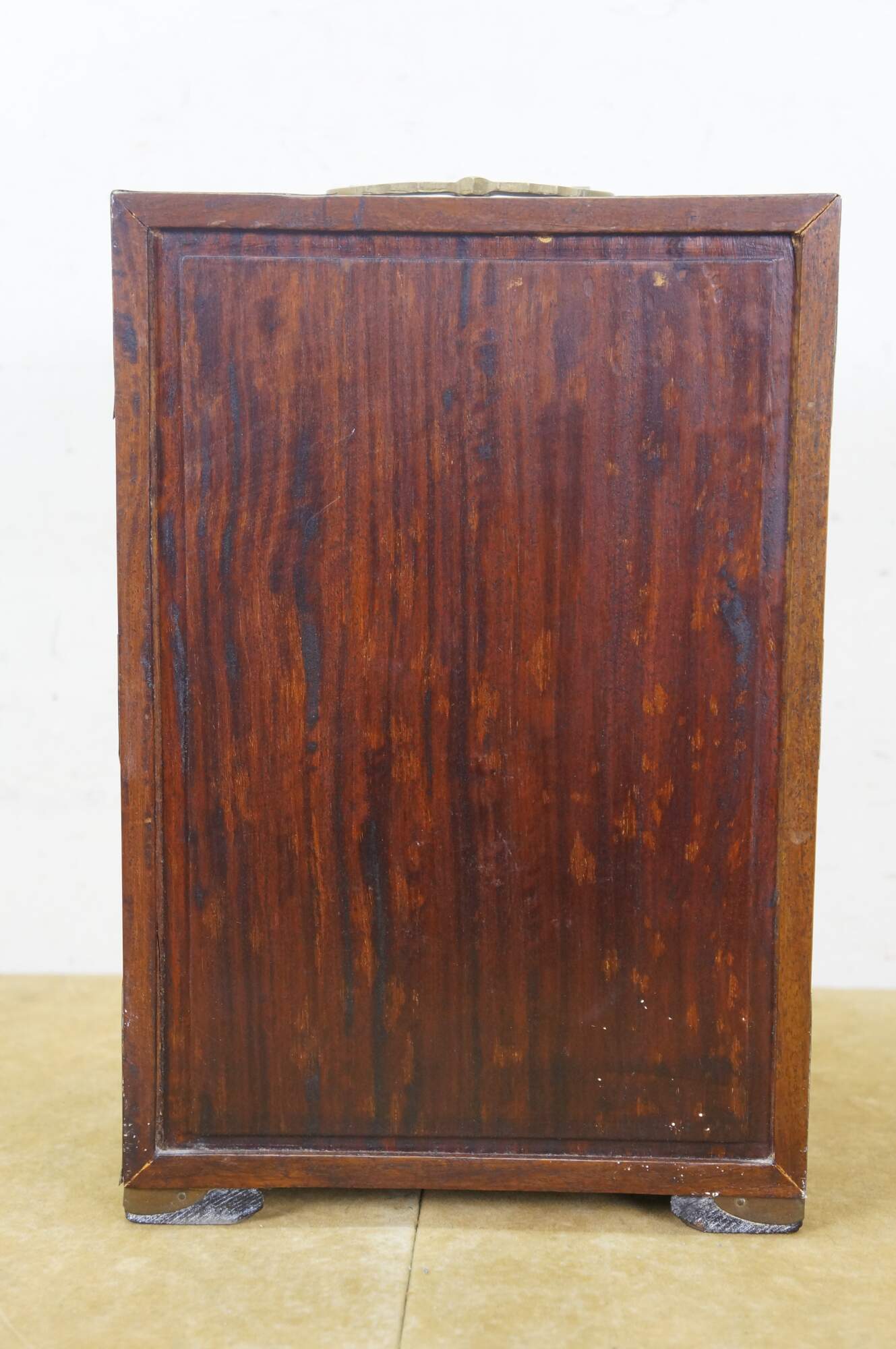 Vintage 20th century Chinese jewelry box / cabinet. Rosewood body with inlaid pierced panels of bright white stone and decorated with etched brass panels and hardware featuring designs of knotwork, bats, flowers and leaves. Includes brass padlock. Lower non-locking drawer with padded tray. Cabinet doors open to four additional drawers with hinged handles. Two fully open drawers and two drawers with an open section and divided ring slots. Red silk lining.