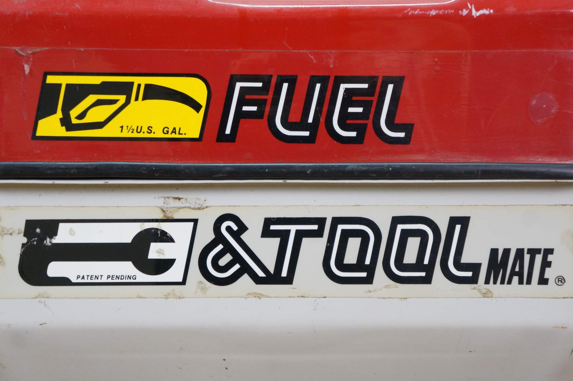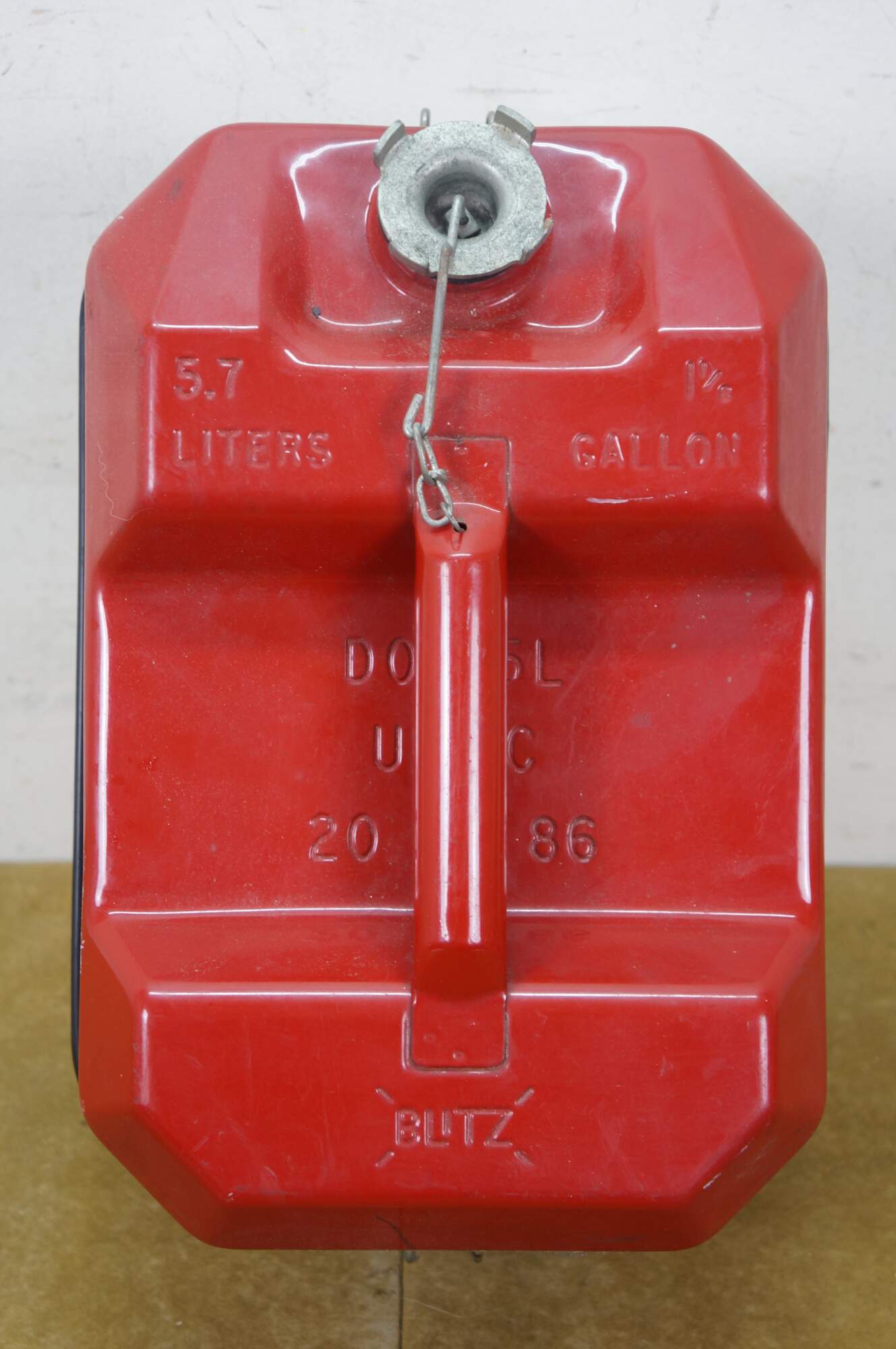 Vintage 1985 Blitz United States Marine Corps Fuel & Tool Mate two part combination gasoline can and tool box. Red upper section is a 1.5 Gallon / 5.7 Liters gasoline container with attached screw top and detachable spout. White tool chest base clamps to the top portion with two clasps. DOT-5L / USMC / 20 1 1/8 86 / Blitz / 1985.