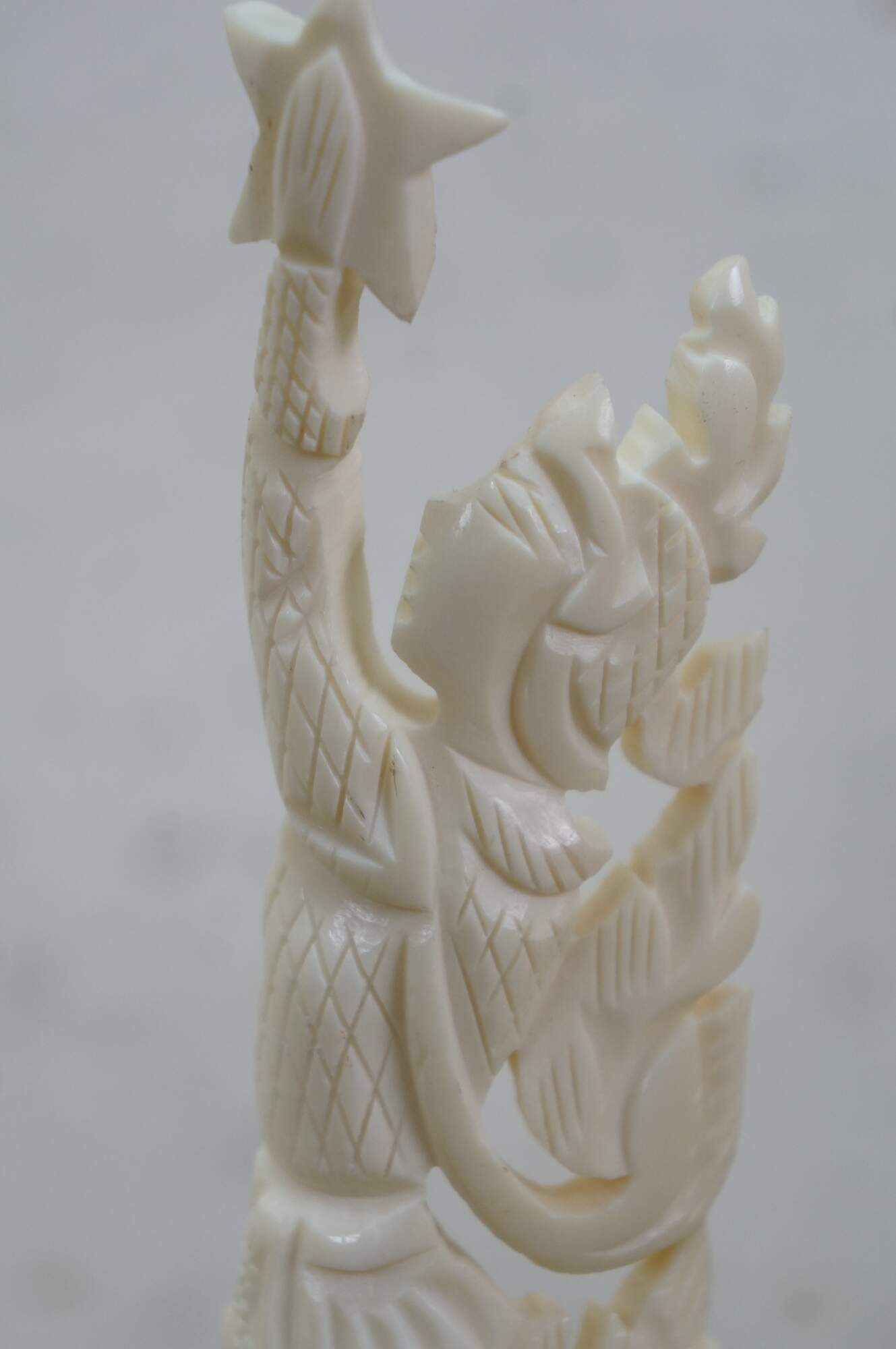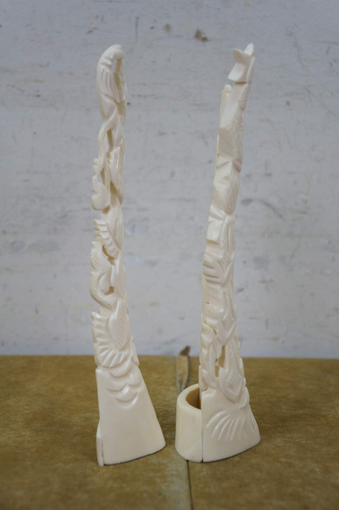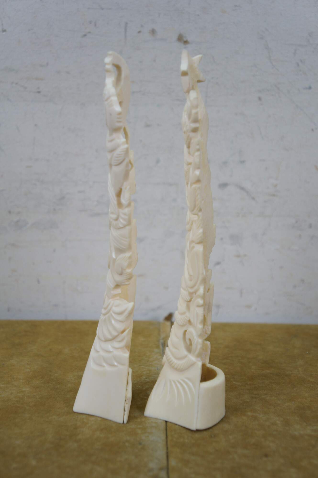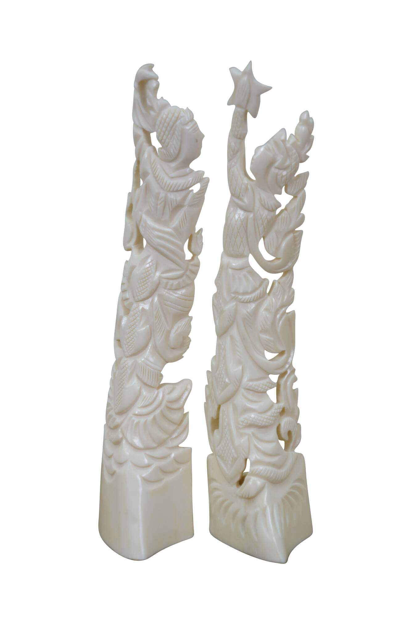 Mid to late 20th century pair of Indonesian dancing god / goddess "totem" sculptures / figurines / tree toppers. Hand carved from the bones of a cow.