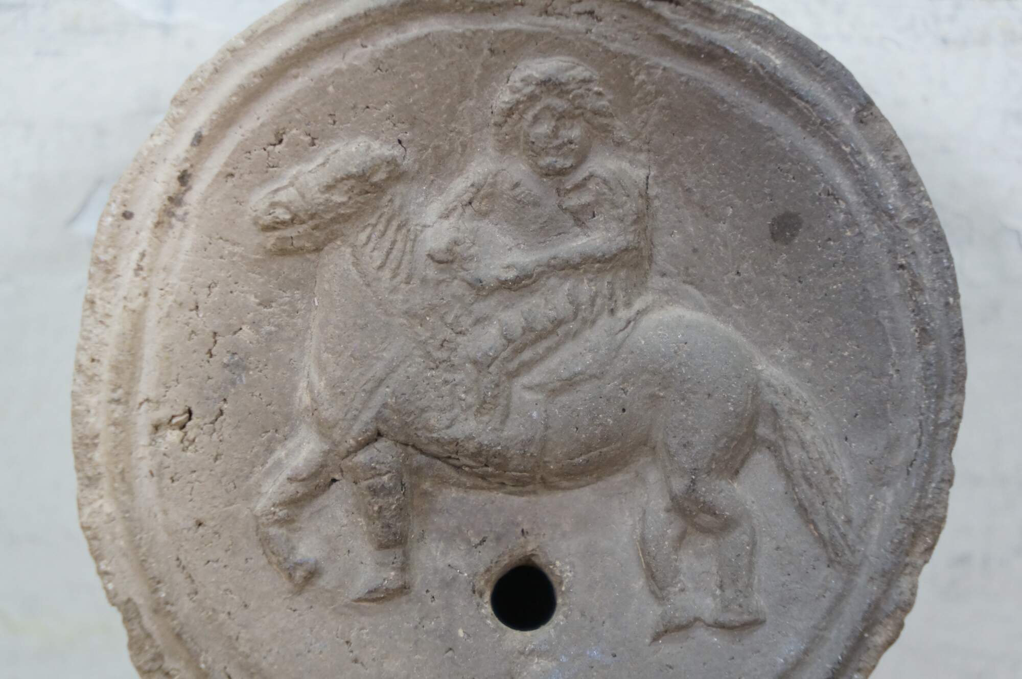 Antique Roman terracotta / clay pottery oil lamp - round main body pierced with an air hole and decorated with the image of an equestrian soldier figure on horseback, tapering to a lightly carved spout.