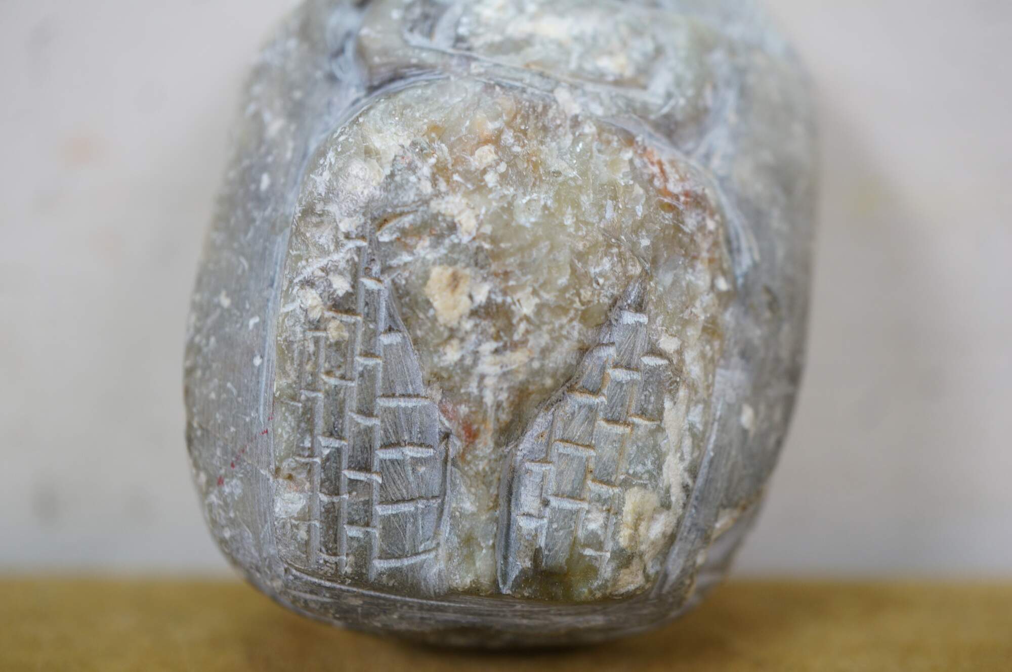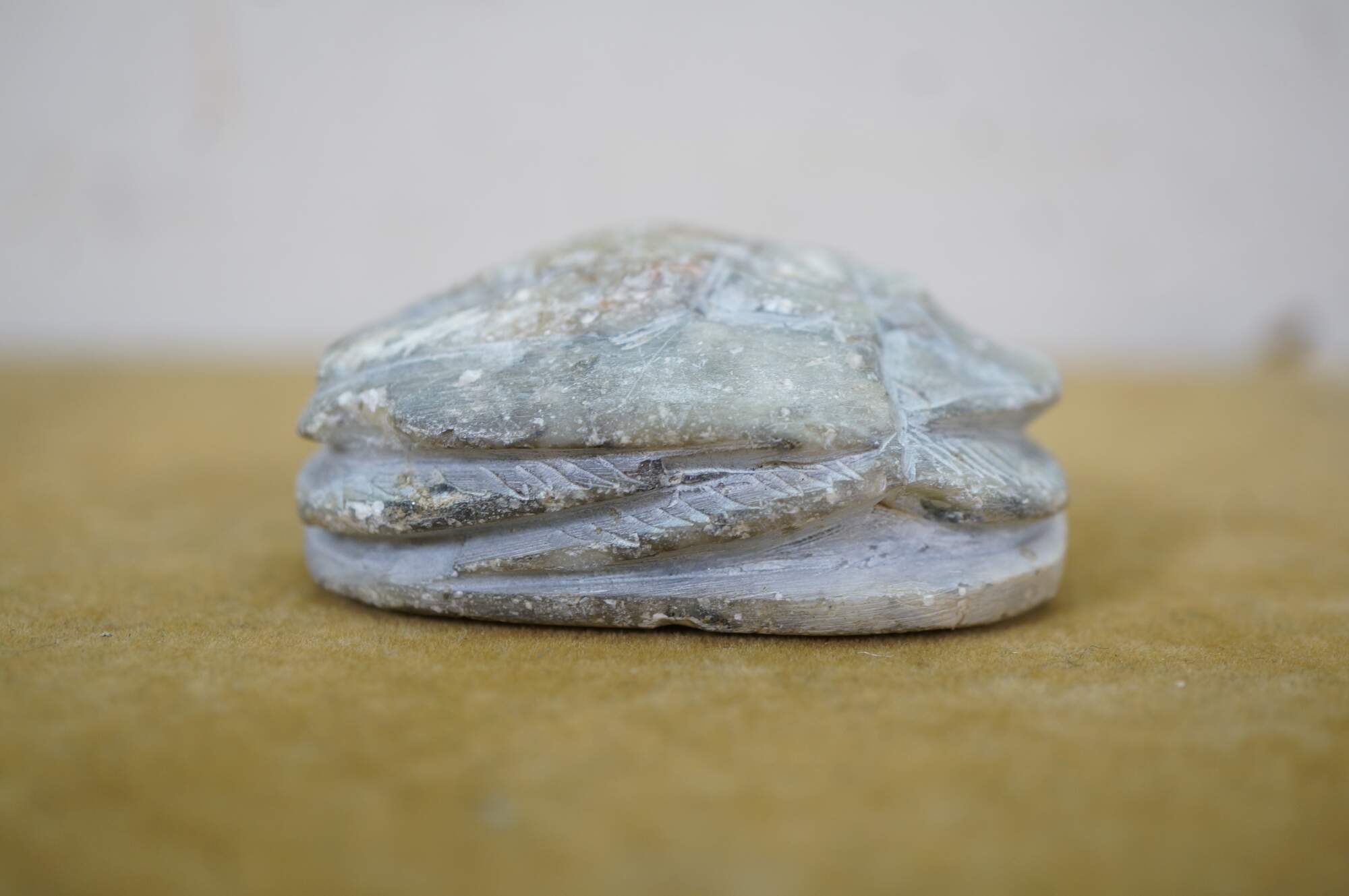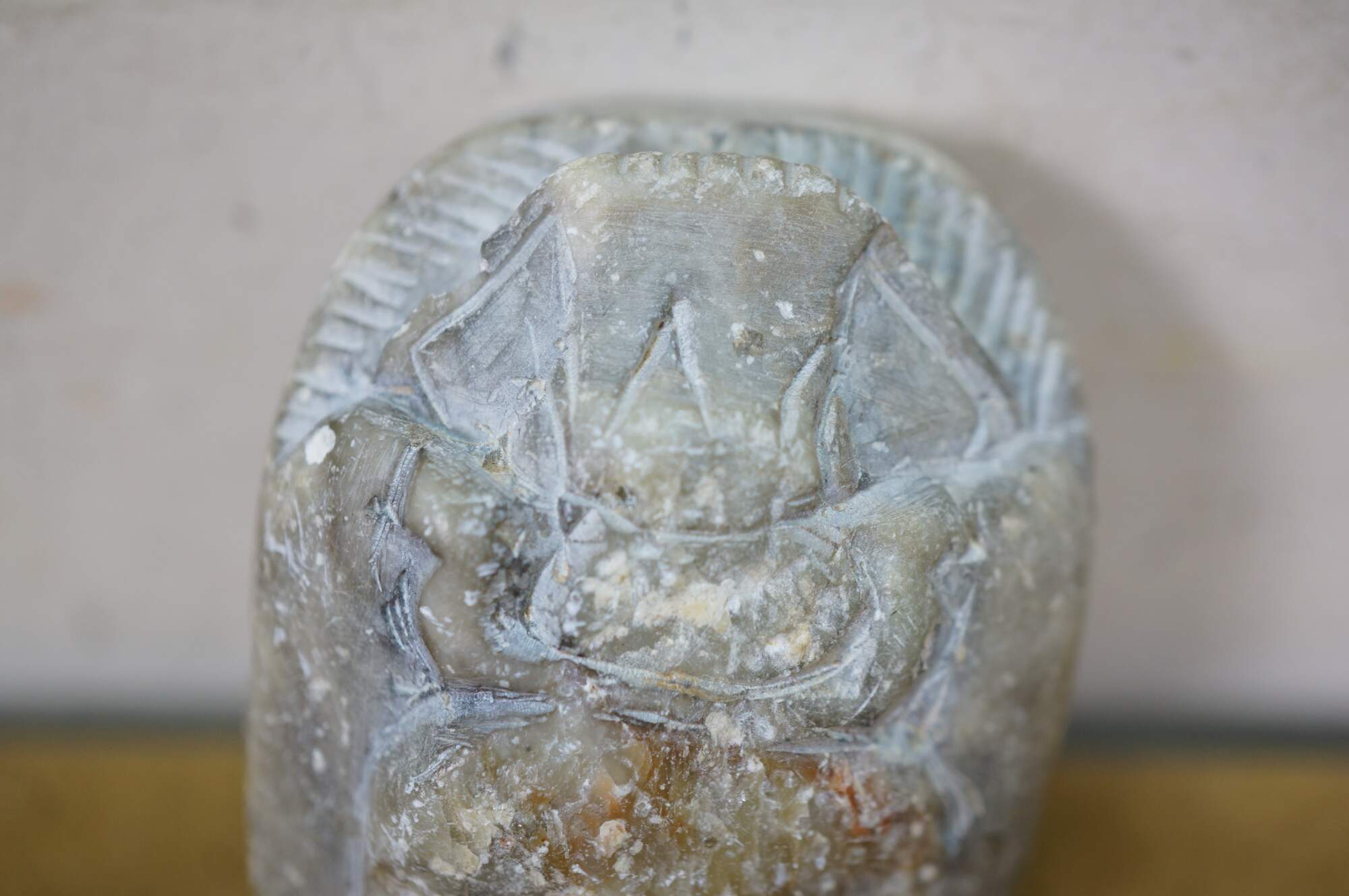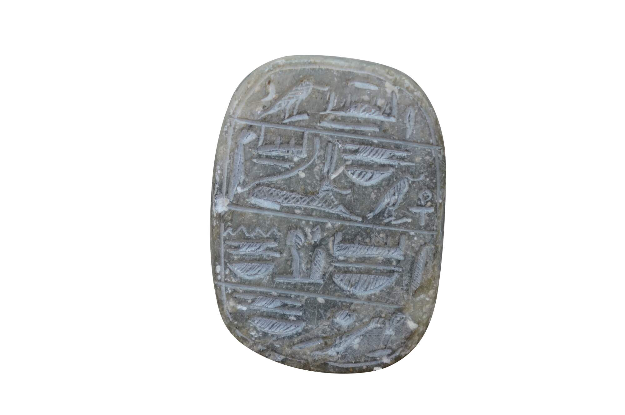Vintage carved quartz stone Egyptian amulet in the shape of a scarab beetle with a flat back inscribed with hieroglyphs.