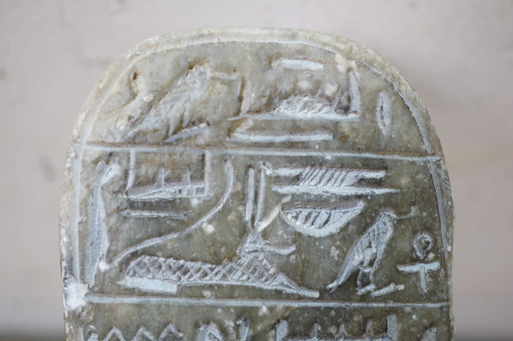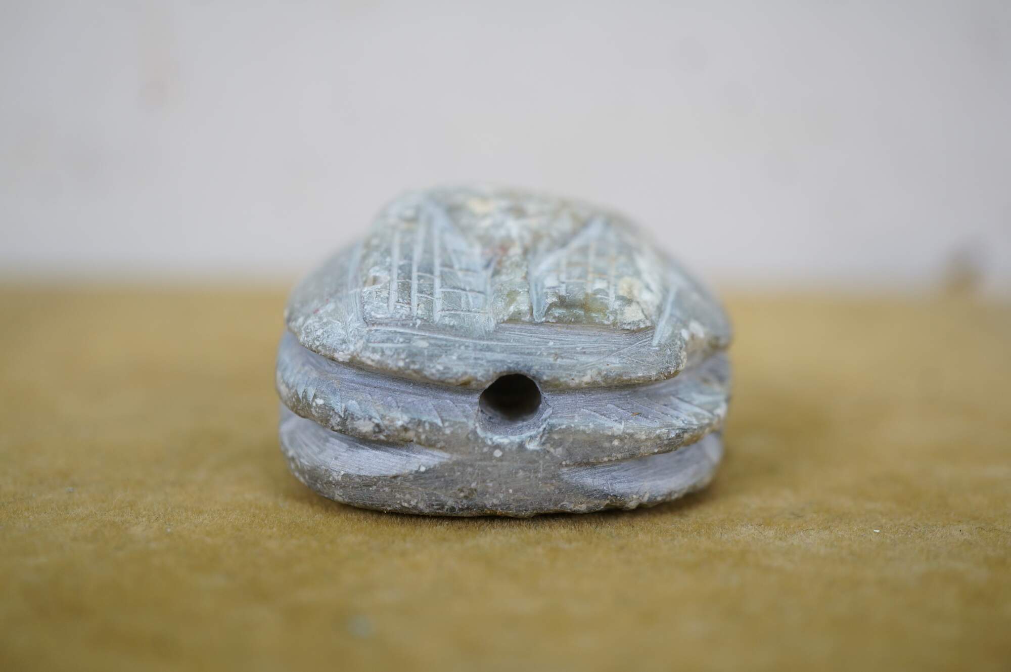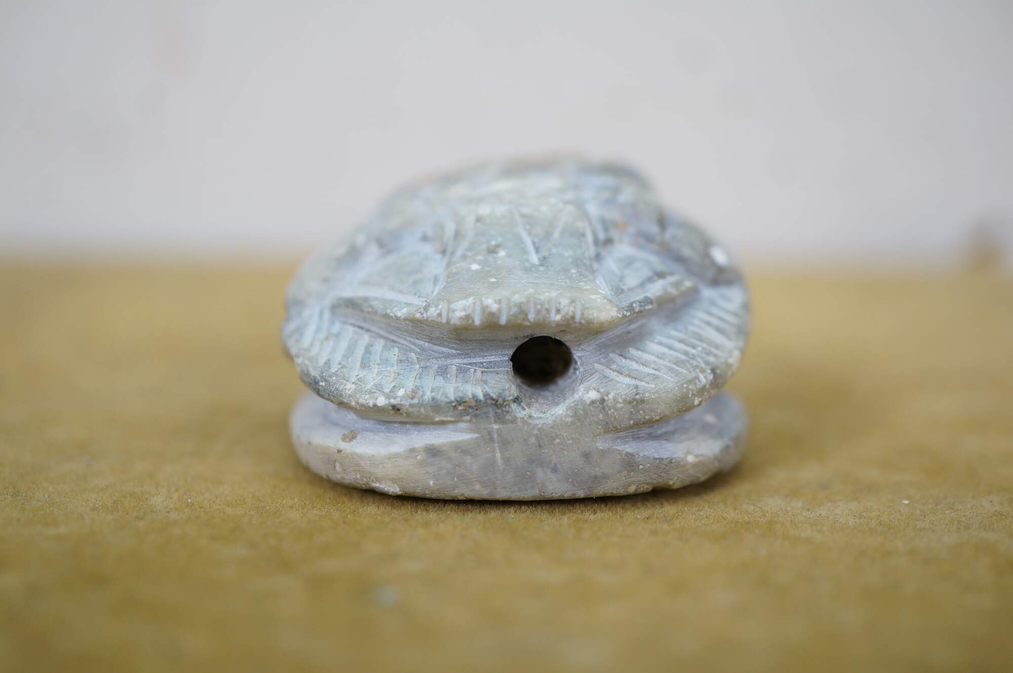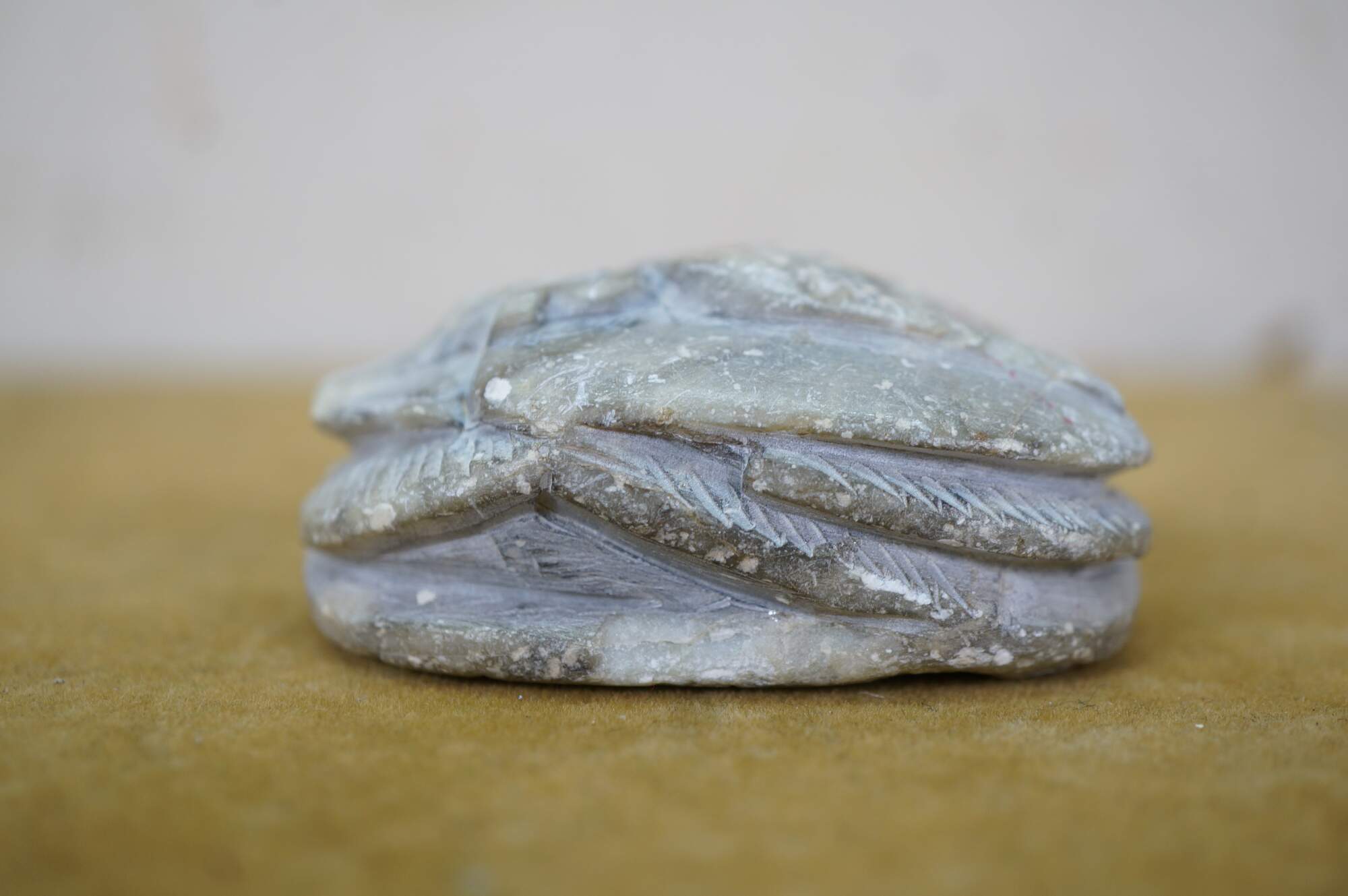 Vintage carved quartz stone Egyptian amulet in the shape of a scarab beetle with a flat back inscribed with hieroglyphs.